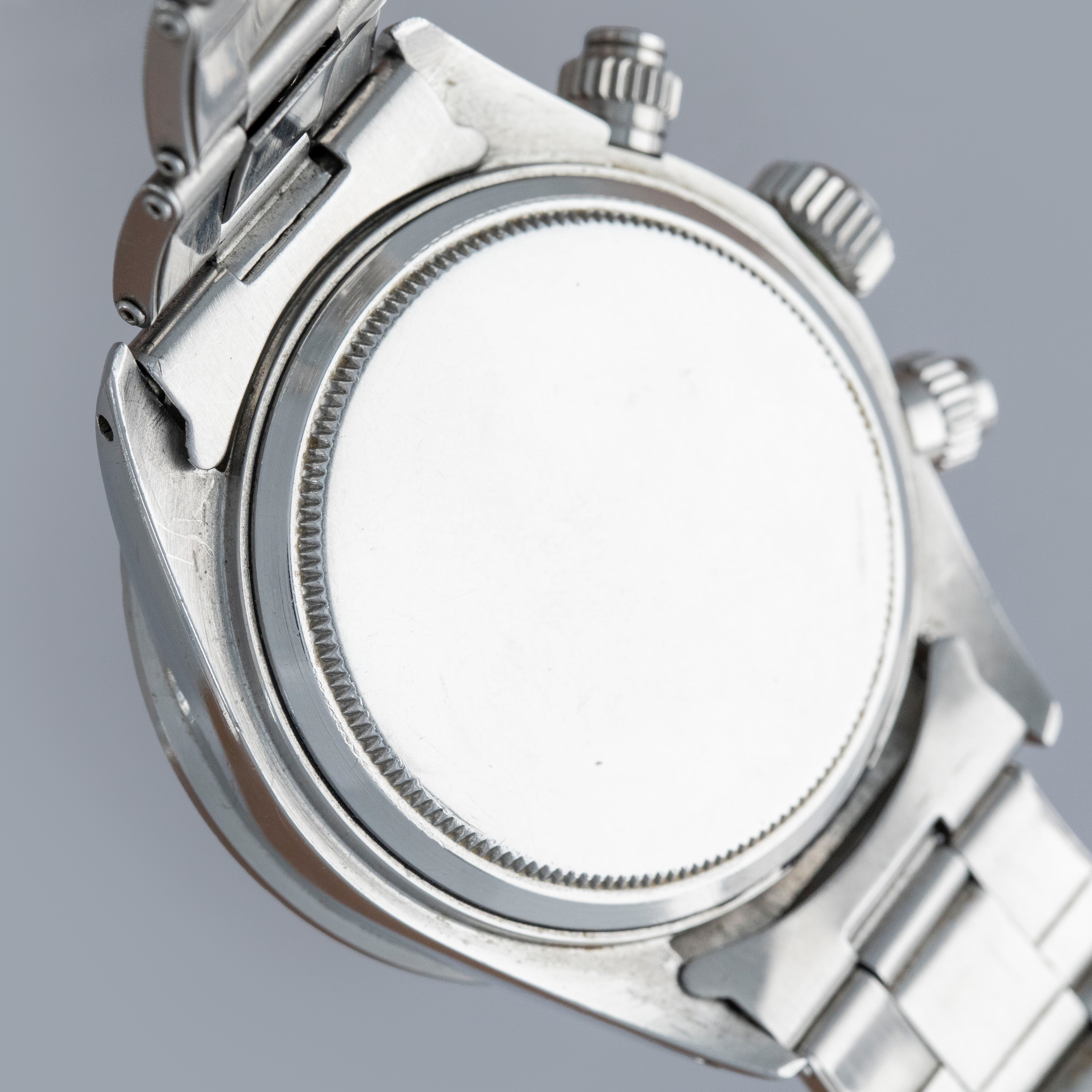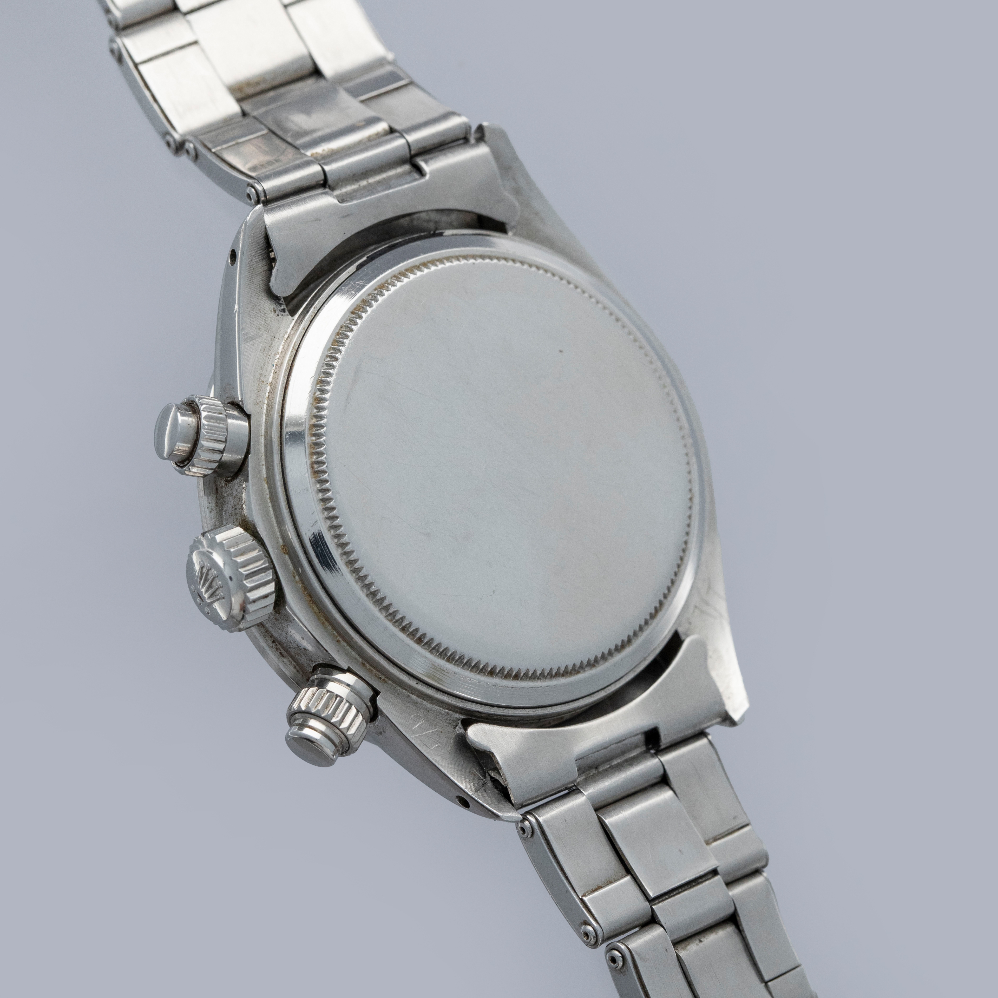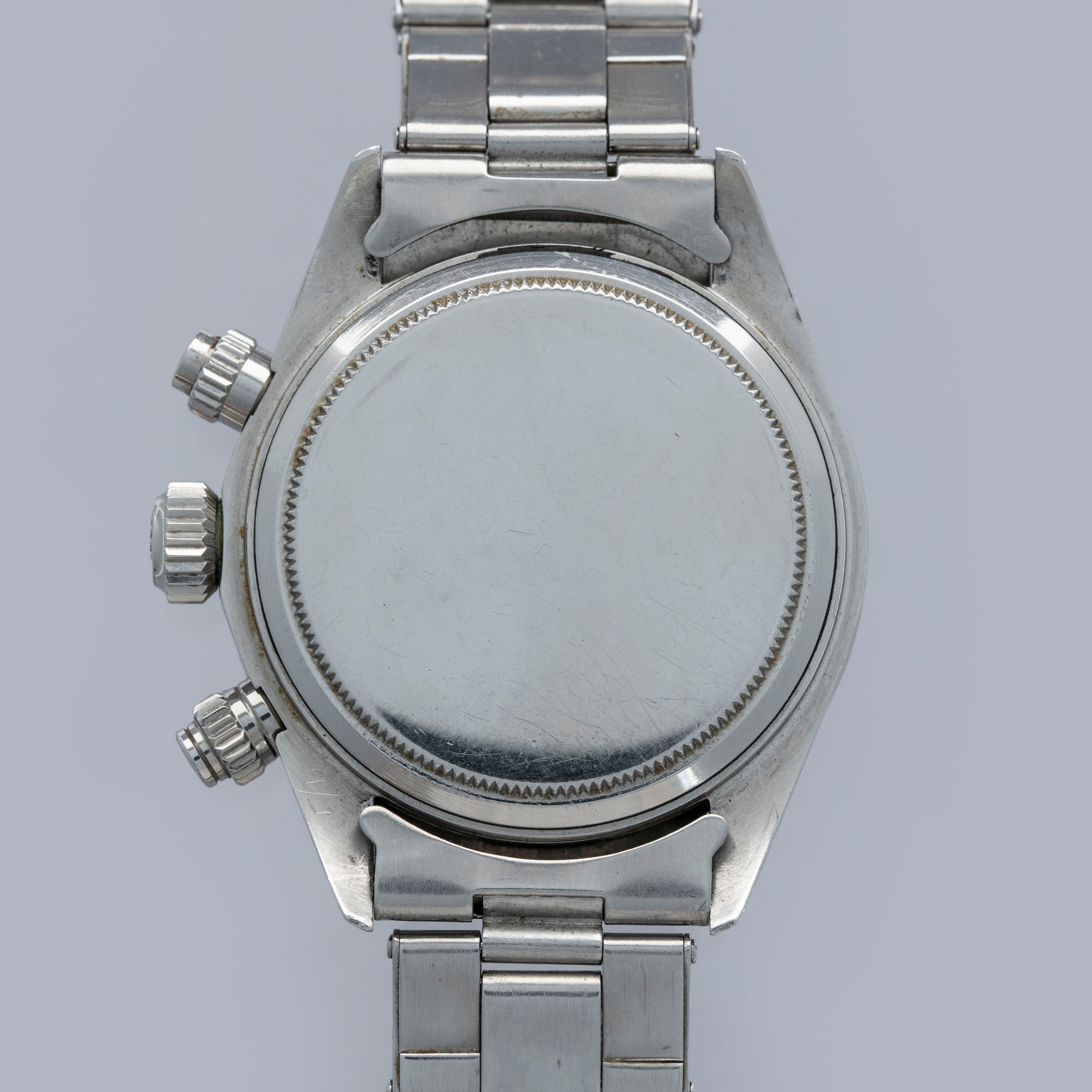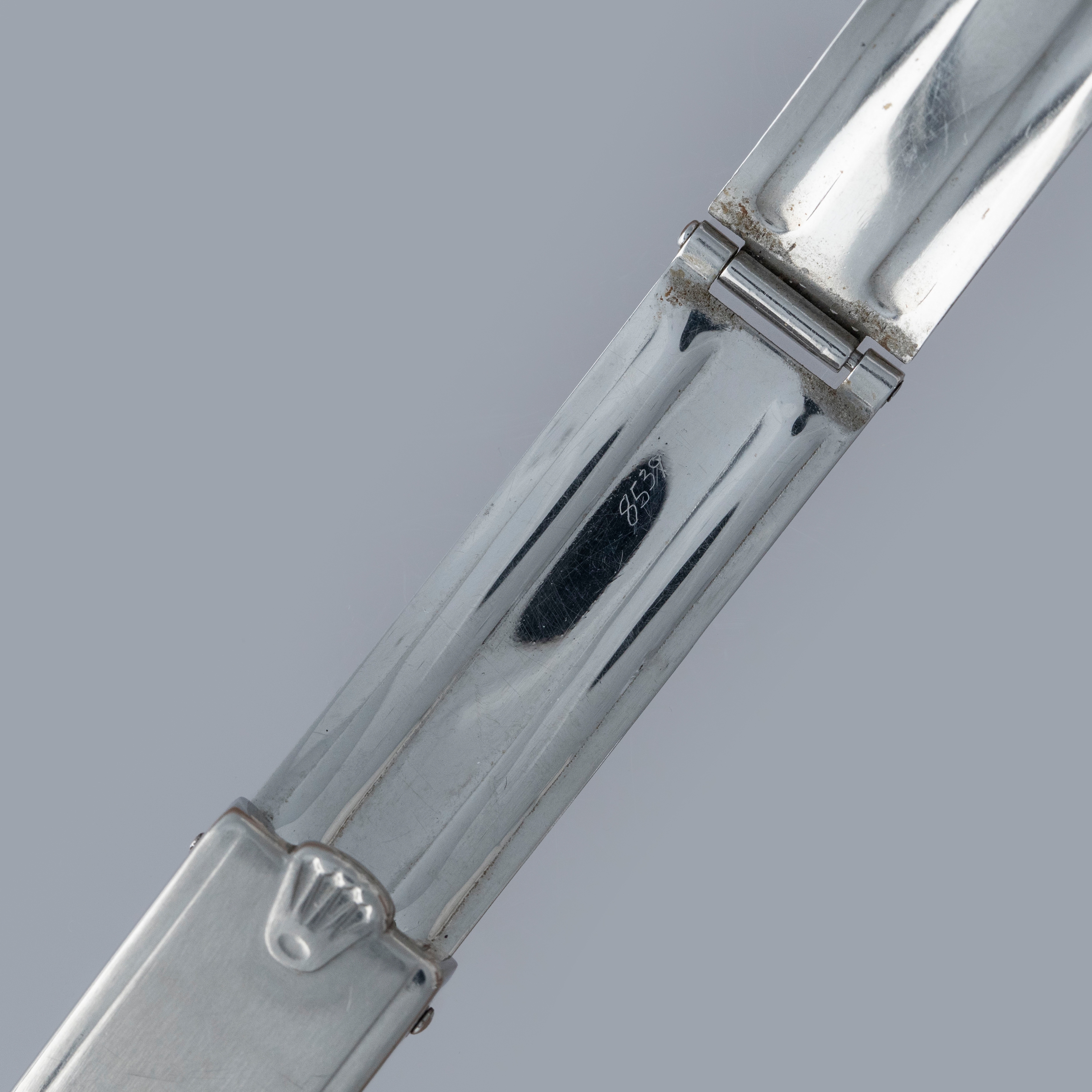 The watch is in overall excellent condition. The steel case is well defined, with some light scratches across the surface, as expected of a watch of this vintage. There are three more noticeable nicks on the back edge of the upper left lug, and the case back has light scratches. The bezel is excellent, with some light marks and minor delamination in a couple of places. The lower (reset) pusher is a later service replacement. The black Sigma dial is near mint, with excellent lume plots that are fully intact. The hands are clean, with some discoloration in the lume. The watch is fitted with a steel rivet link Oyster bracelet with light surface marks and light play between the links. The bracelet currently fits a 7 1/2” wrist, and is fitted with 12 links.