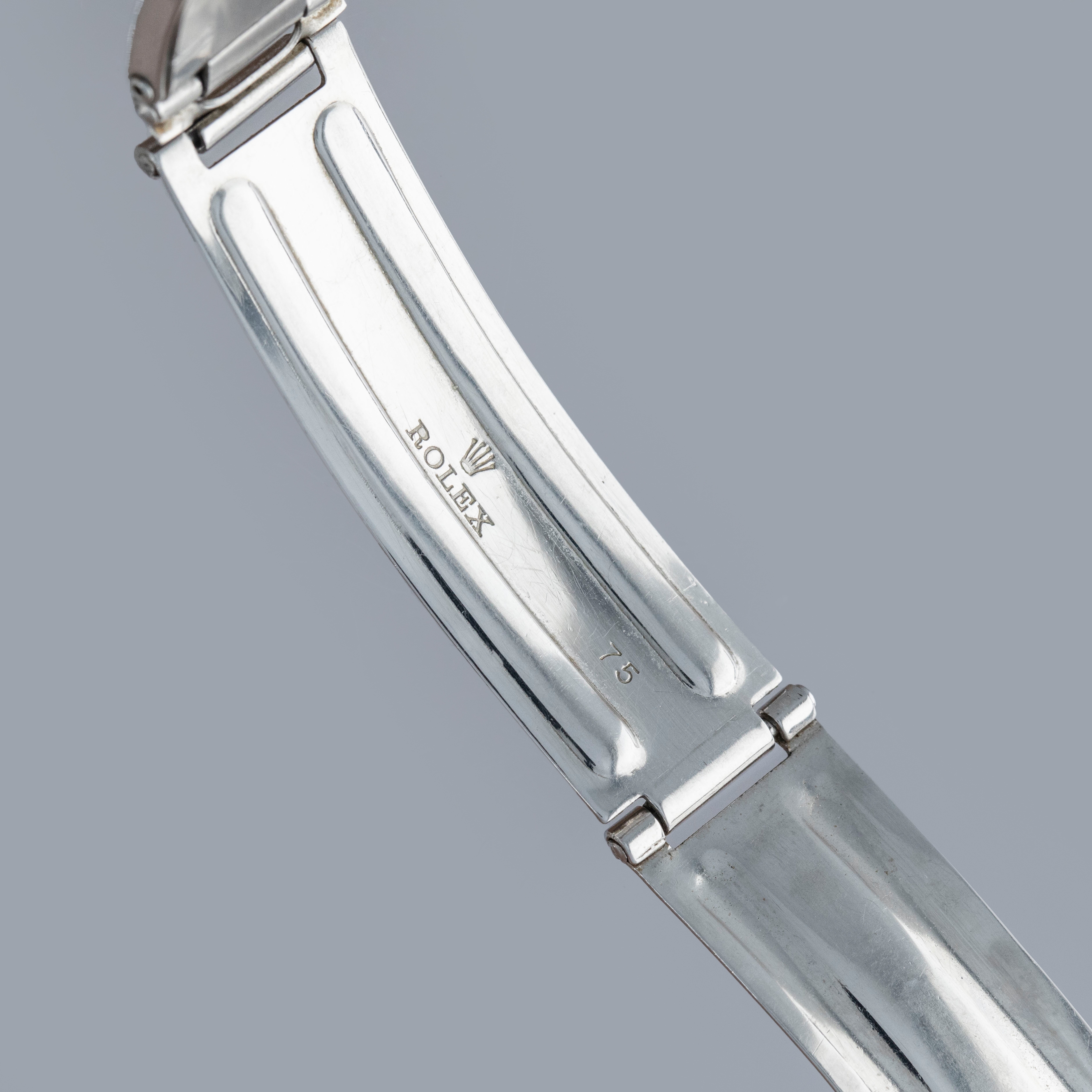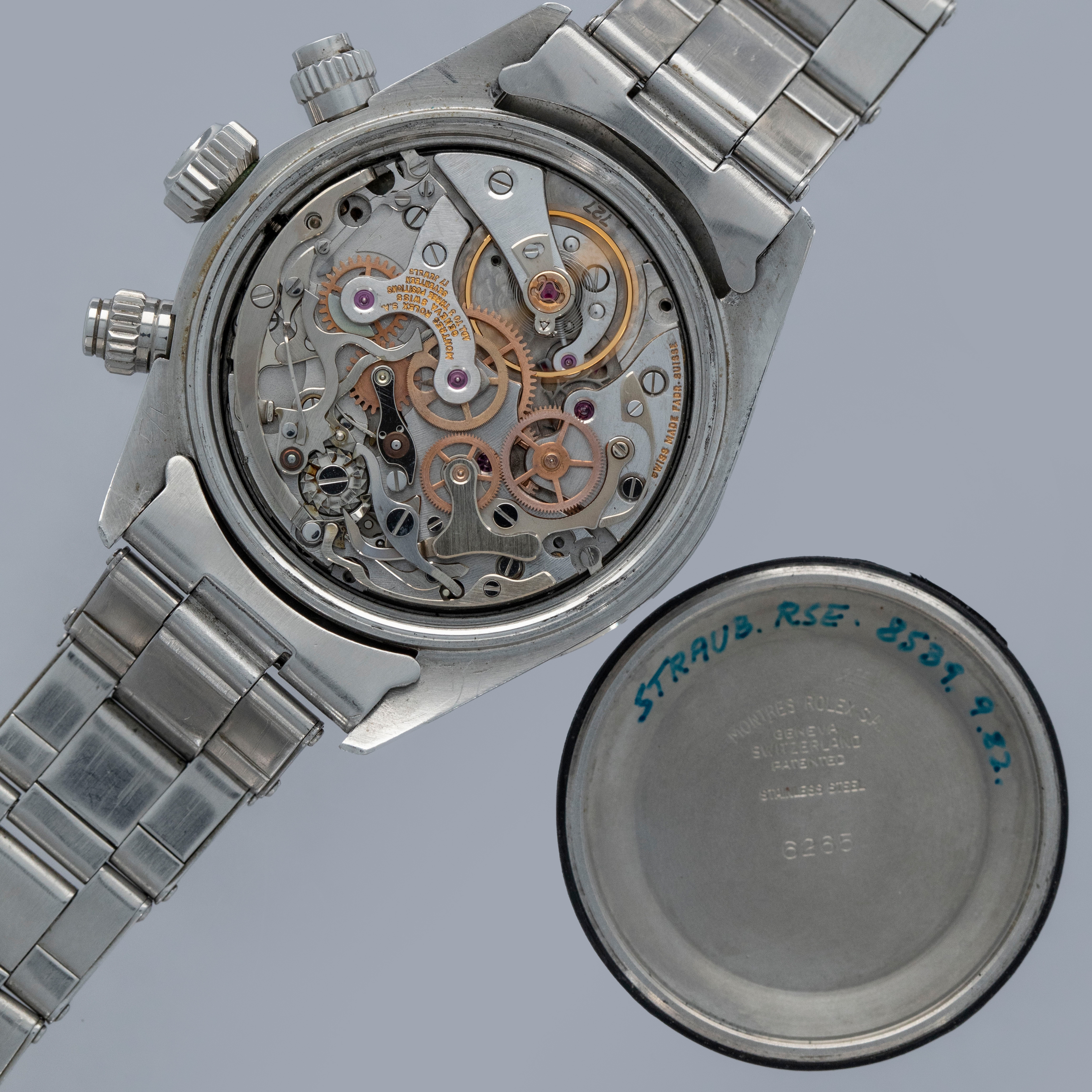 Known as the "Sigma" dial Daytona, this ref. 6263's black dial lacks any Daytona inscription above its 12-hour chronograph register and features the Greek letter Sigma on either side of its "T SWISS T" inscription at 6 o'clock, which signal the use of 18kt white gold for its hands and applied indices. The decisition to do this was led by a Swiss watch industry trade association, called l’Association pour la Promotion Industrielle de l'Or (APRIOR) to highlight the value of Swiss watches that used gold in their construction.