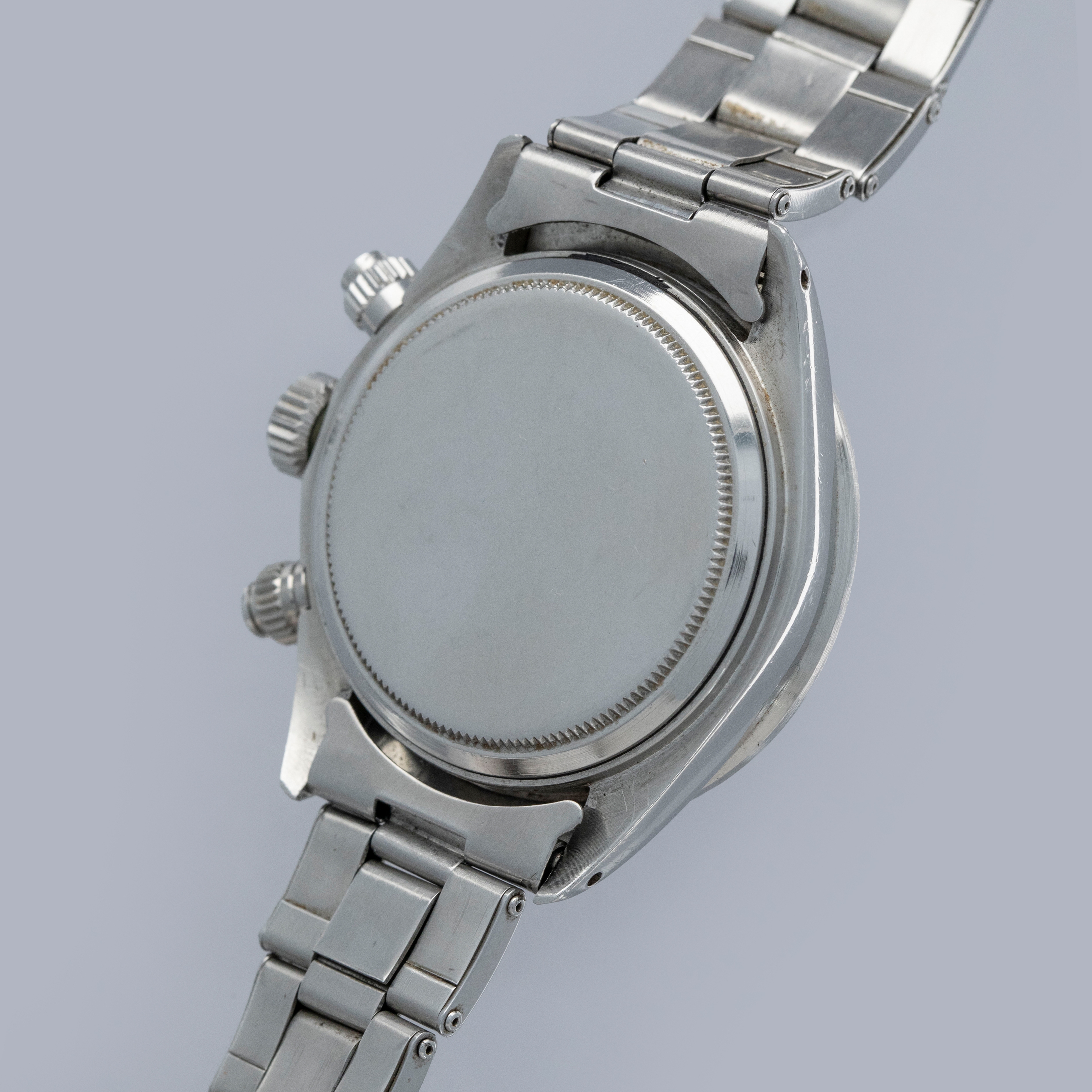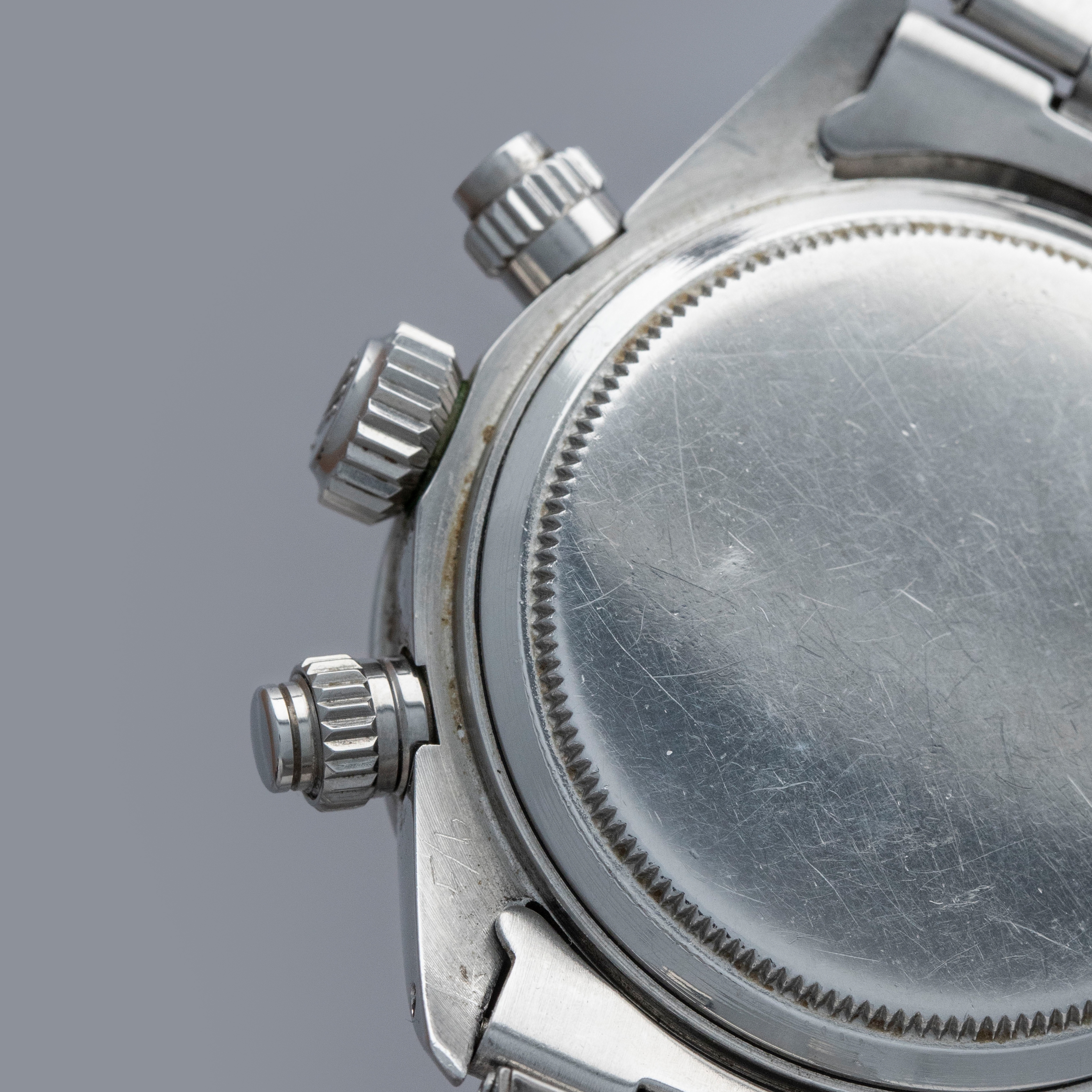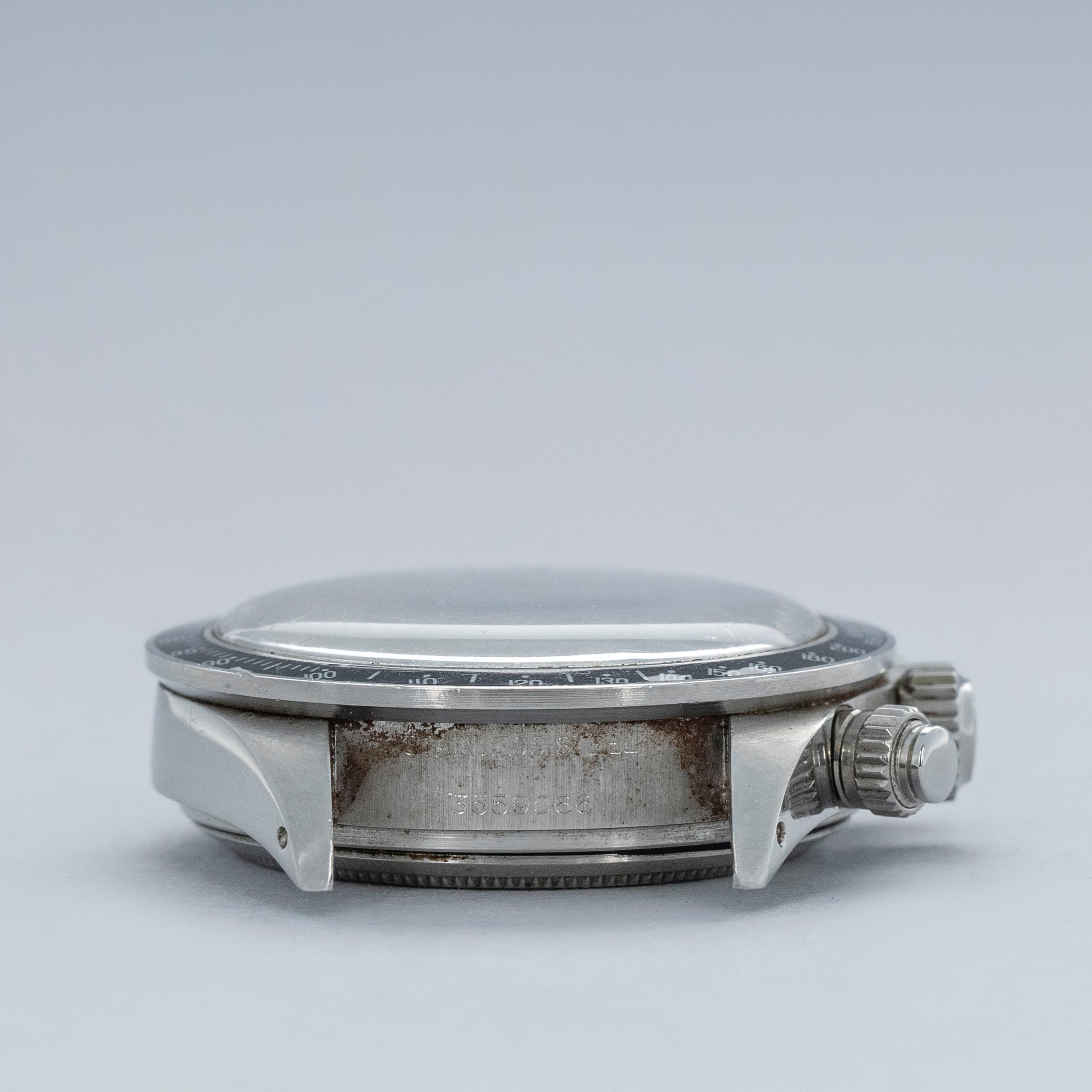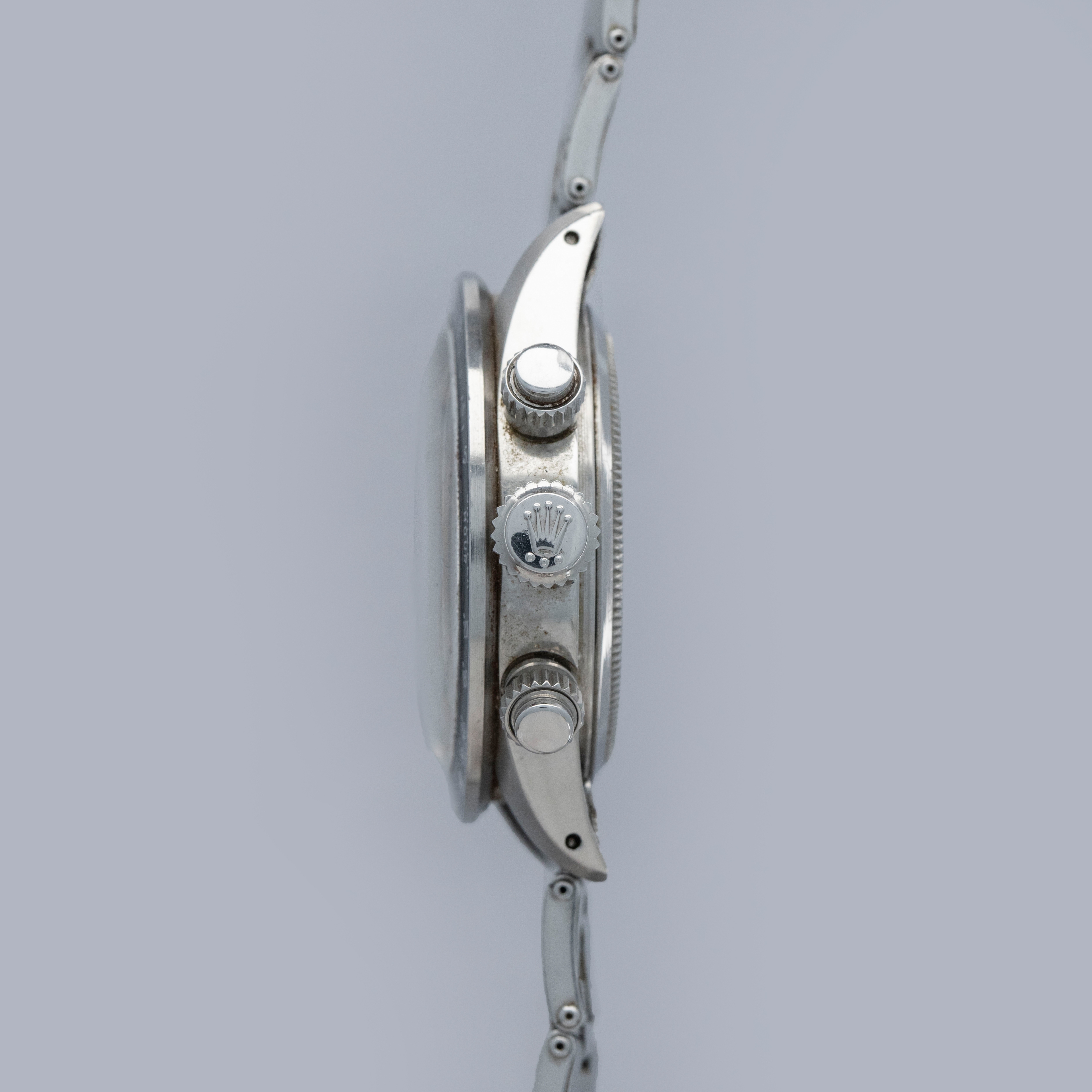 Forming the foundation of its sporty looks, the Daytona ref. 6263 features a black acrylic bezel insert and screw-down chronograph pushers that significantly modernizes its aesthetic. Considering its black bezel, it is not hard to see how Rolex's modern design department was inspired to release the current generation of Cerachrom-clad Daytona that debuted in 2016 and was iterated upon in 2023.