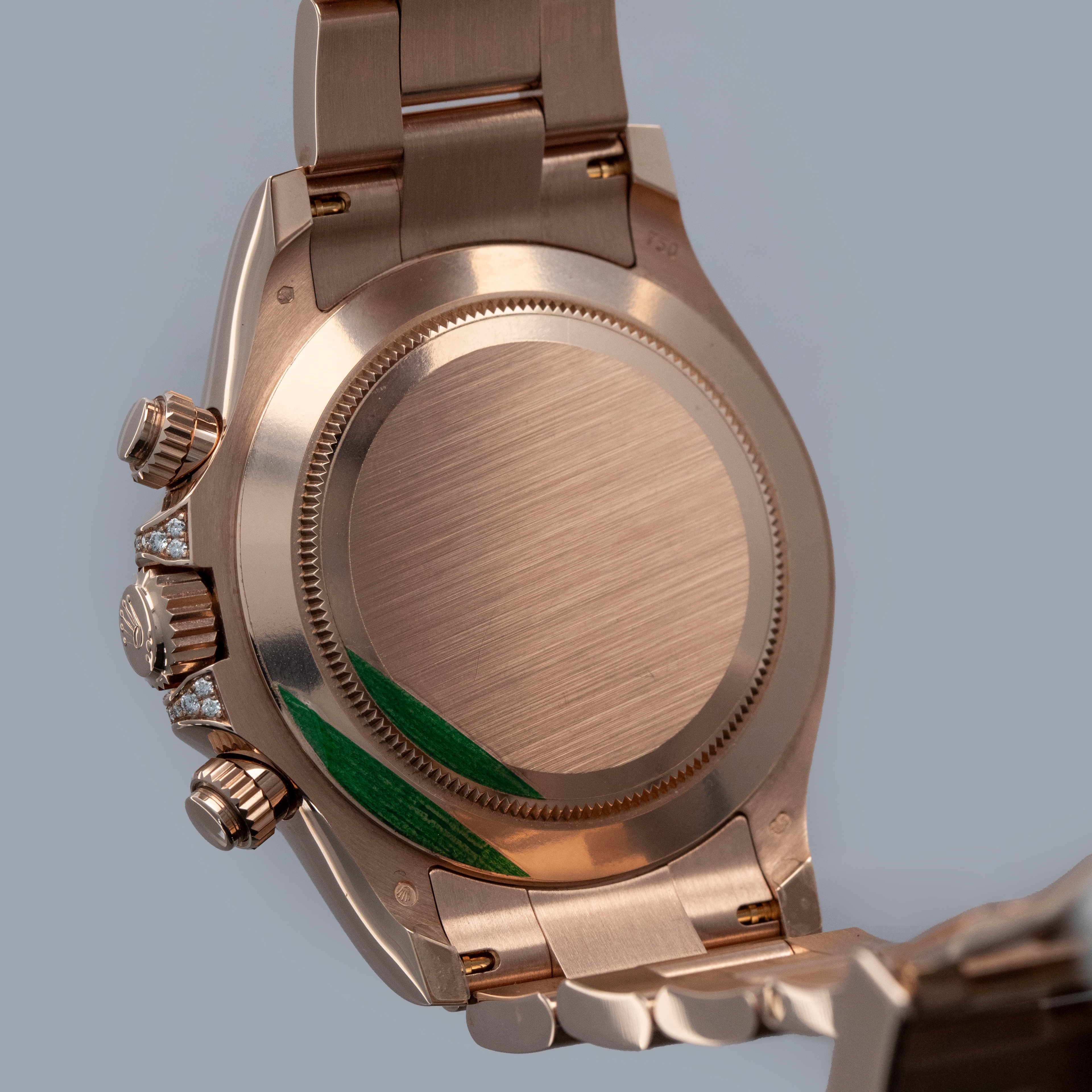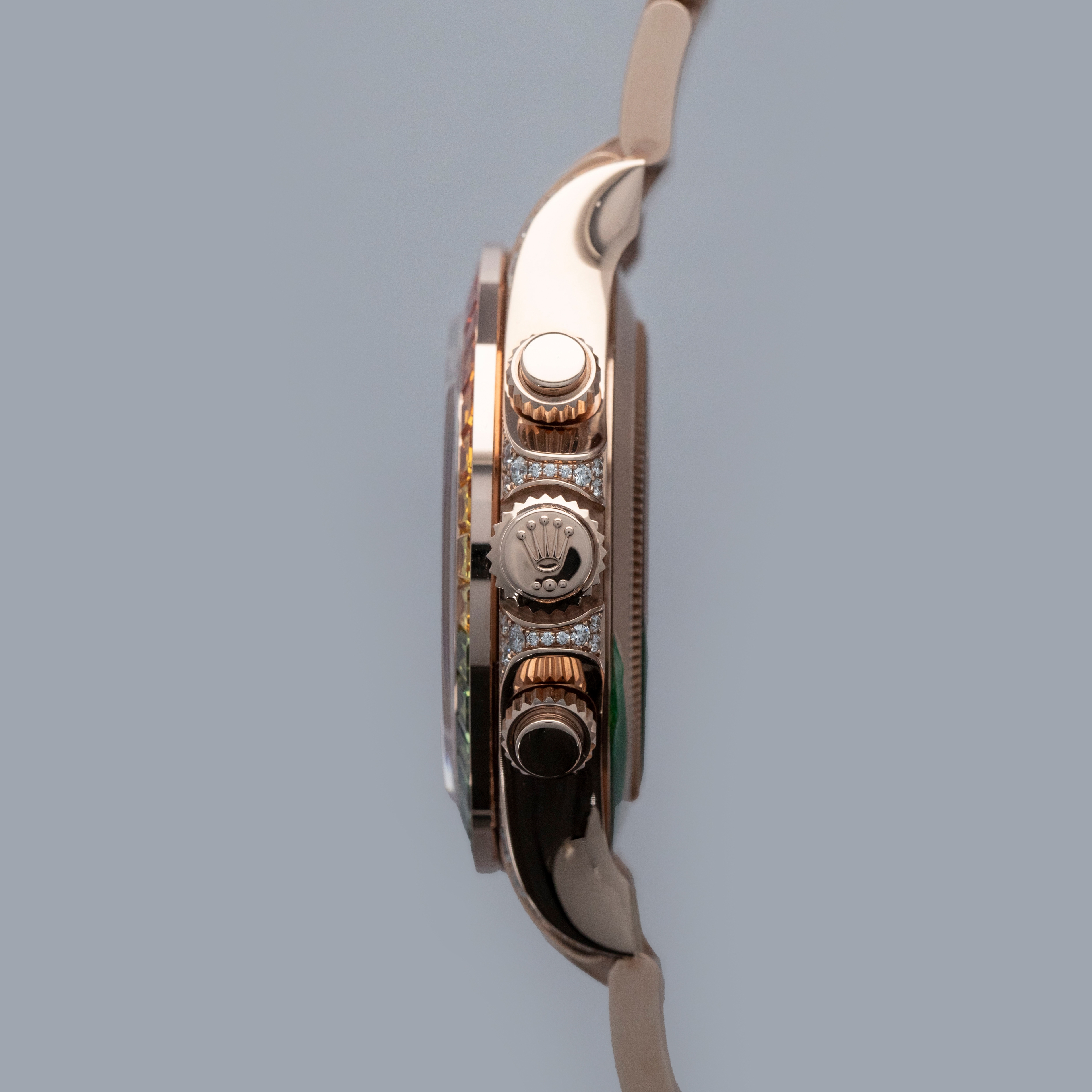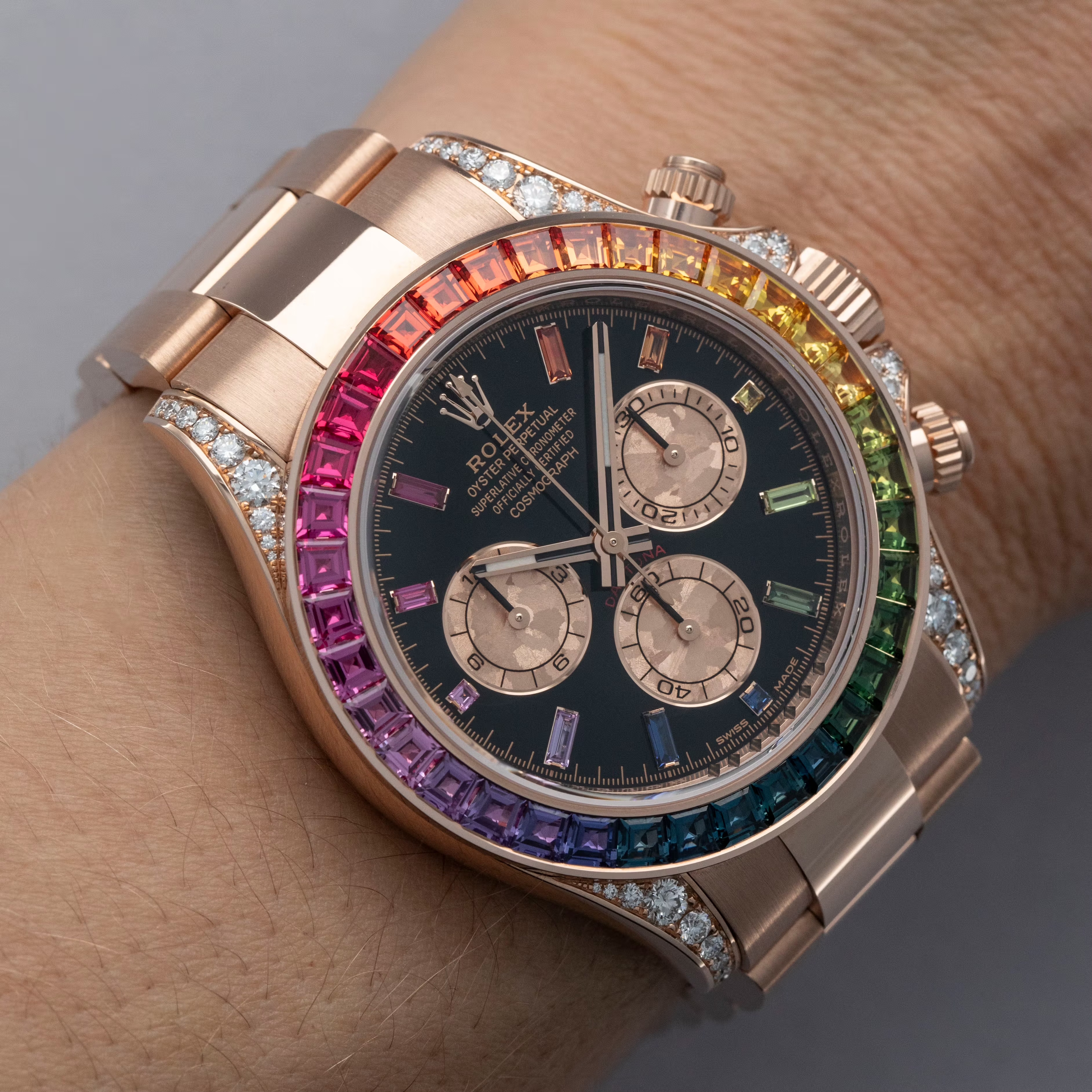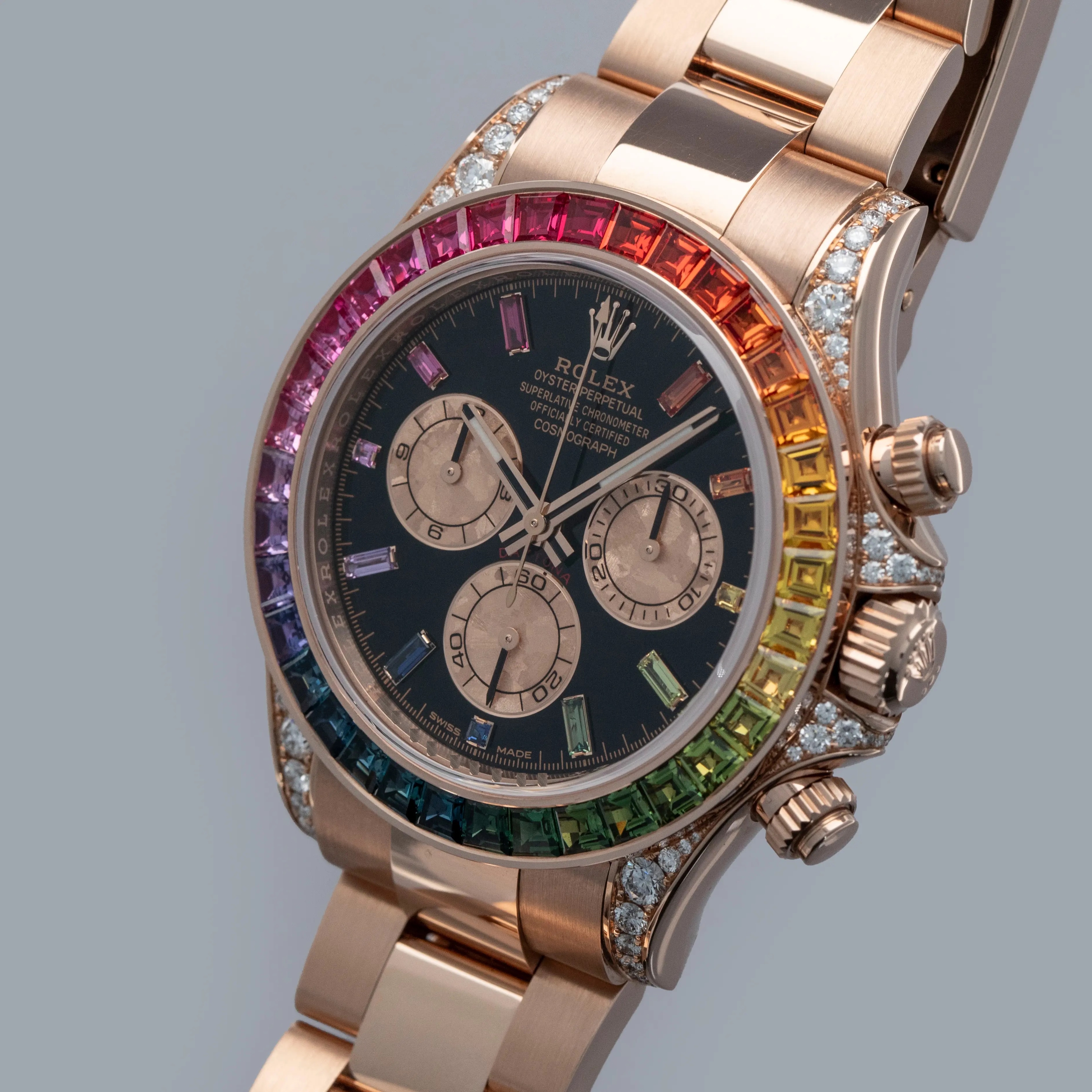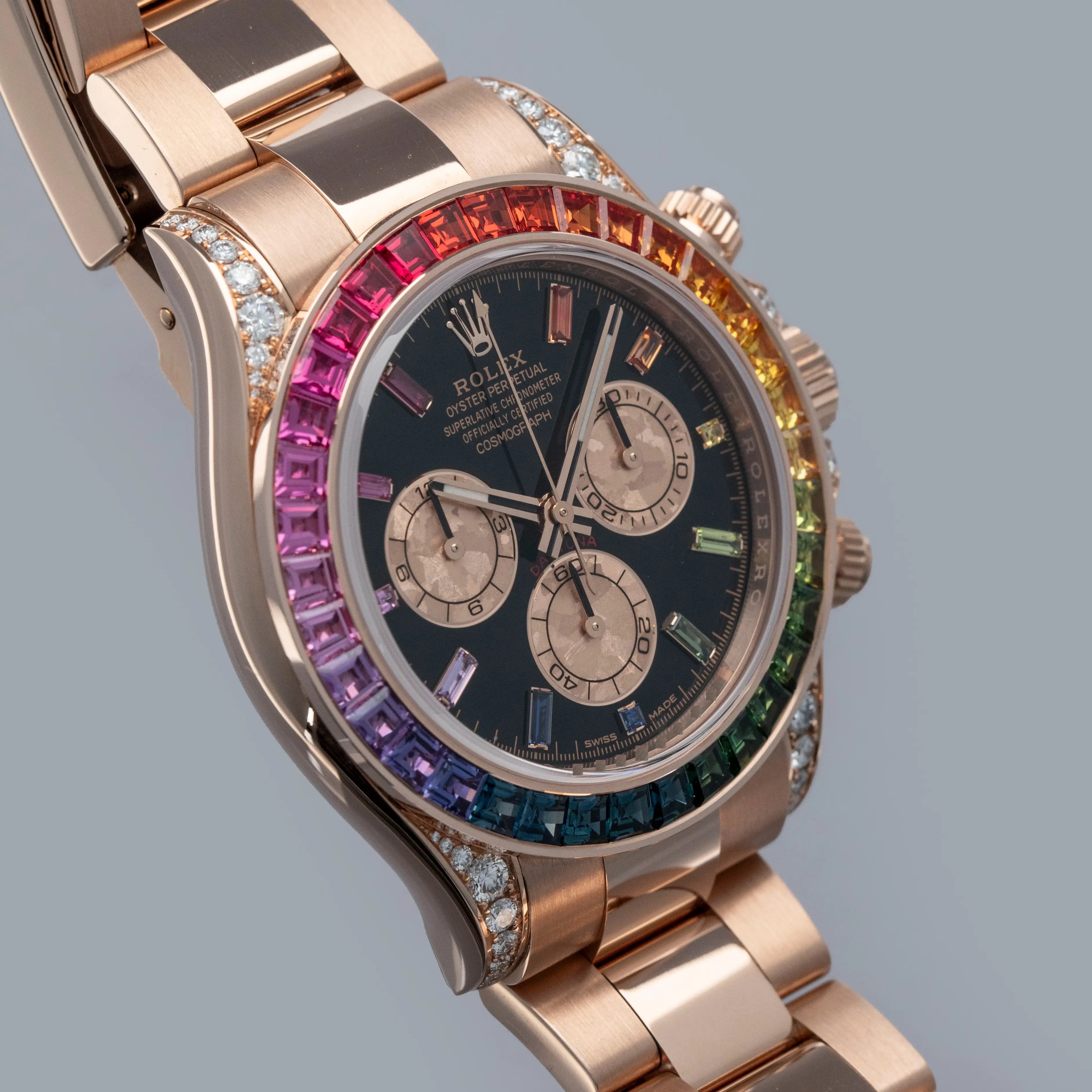 Fitted with a glossy black dial with sunken golden subdials to match its construction in color, but with a mottled texture that gives them a unique design, the ref. 116595RBOW's display is immediately special, with its 11 rainbow sapphire-set hour markers taking this Daytona's dial to a whole other level.