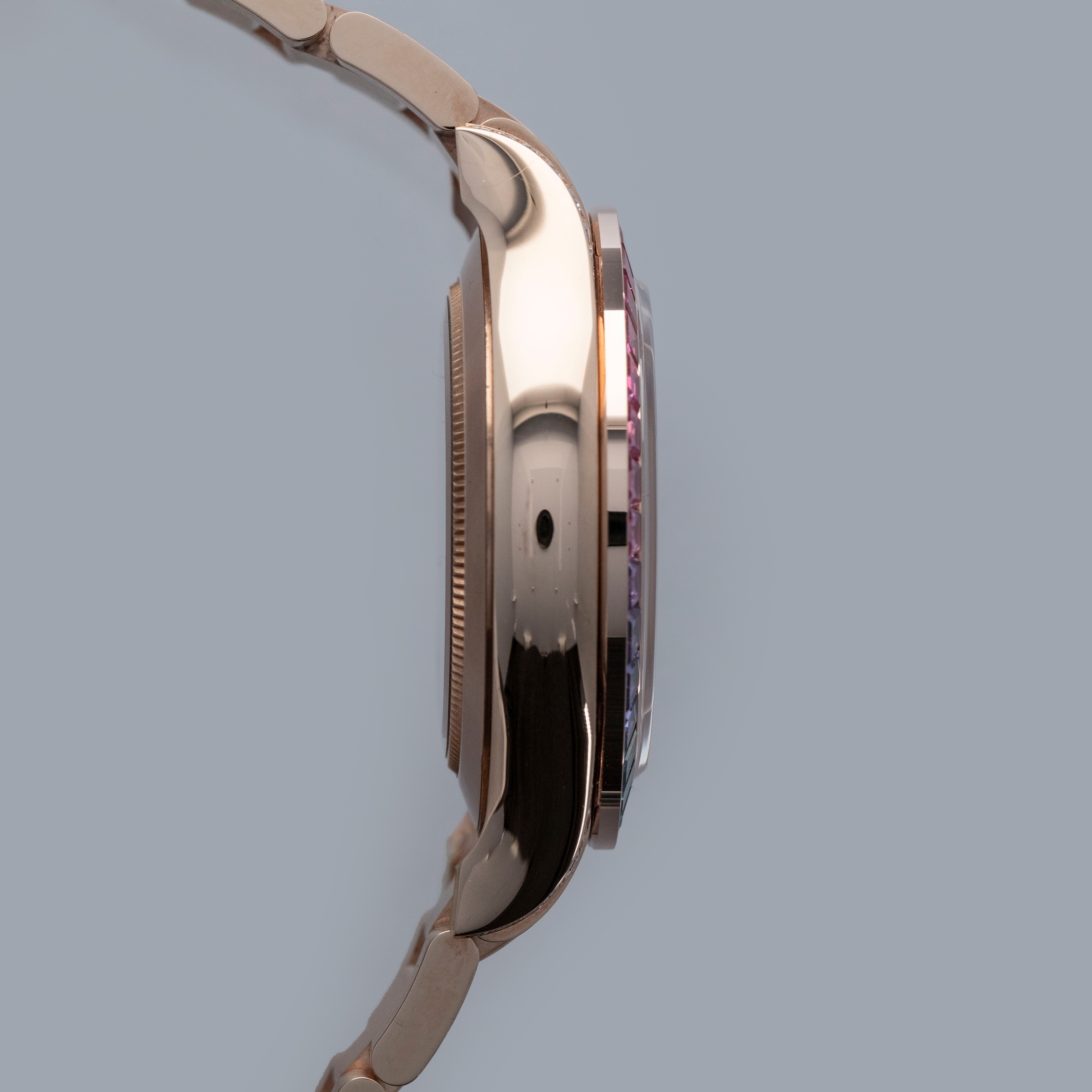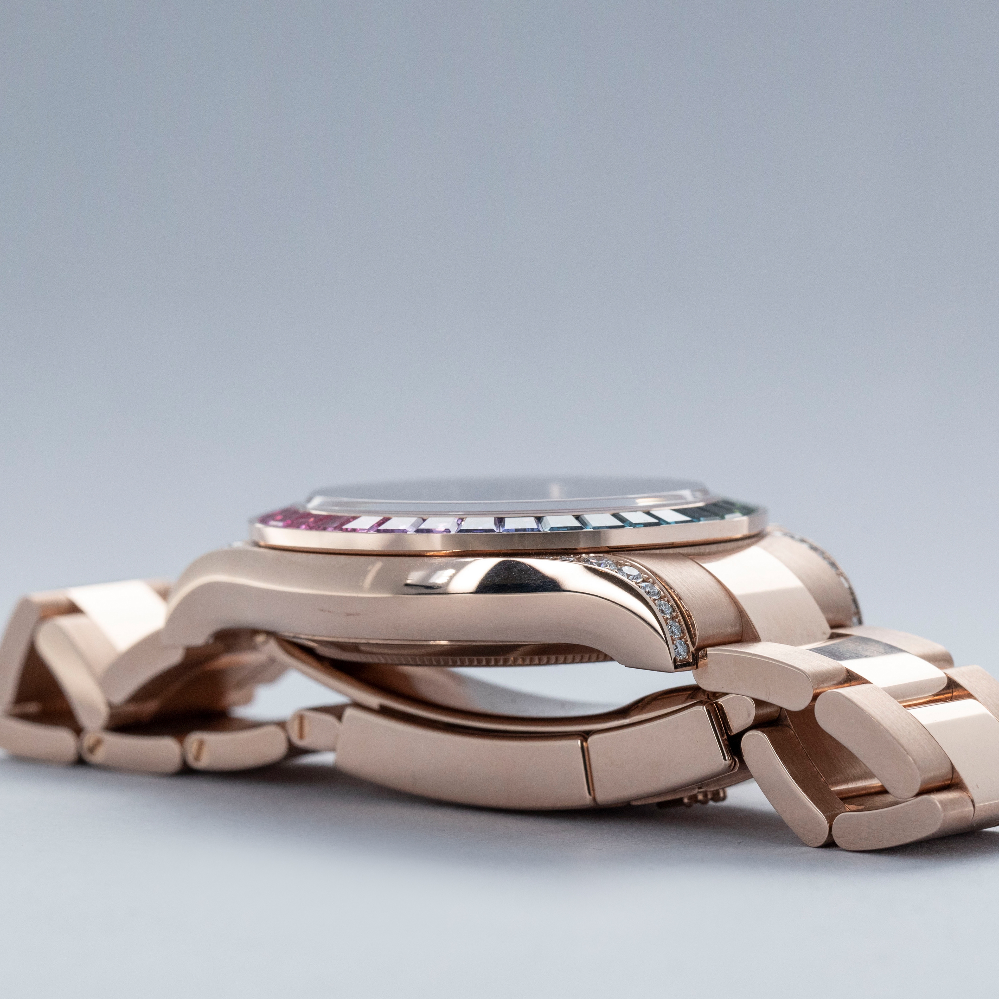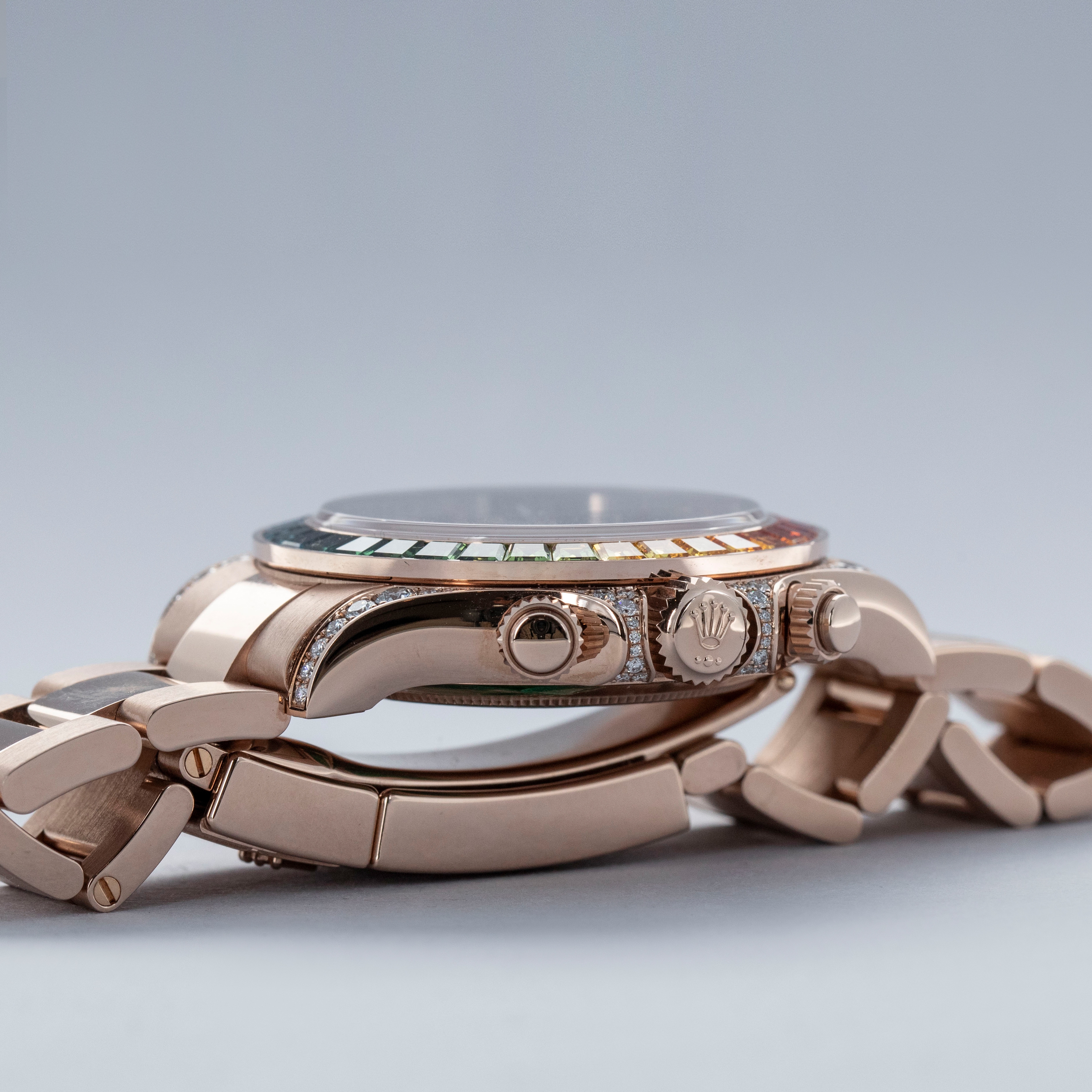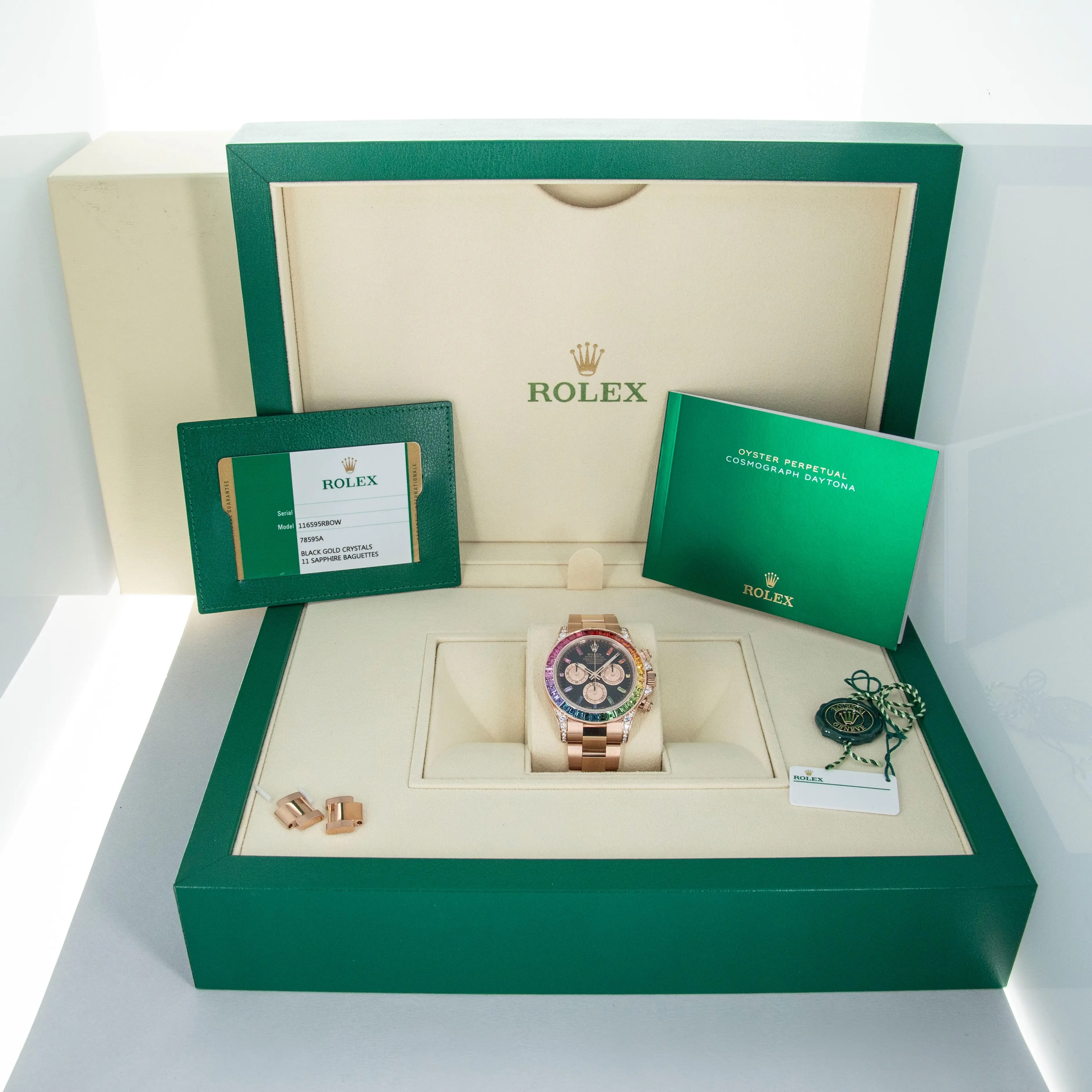 A precious metal Daytona is a special watch to begin with, but with 56 brilliant-cut diamonds set across its lug hoods and crown guards and 36 baguette-cut sapphires arranged in a rainbow-inspired setting whereby their colors seamlessly flow into one another's, the ref. 116595RBOW's construction is simply incredible, hence the model's intense popularity and desirability.