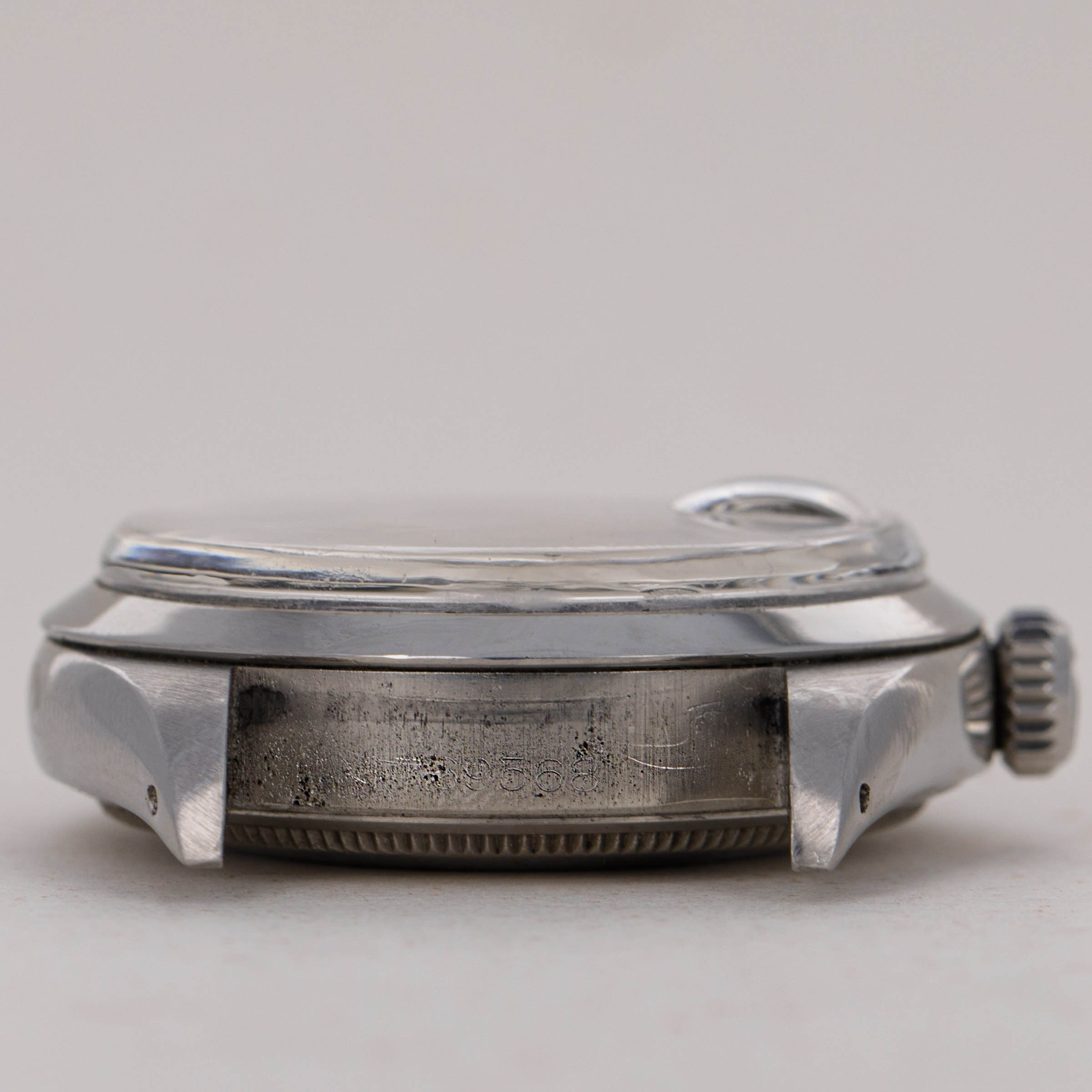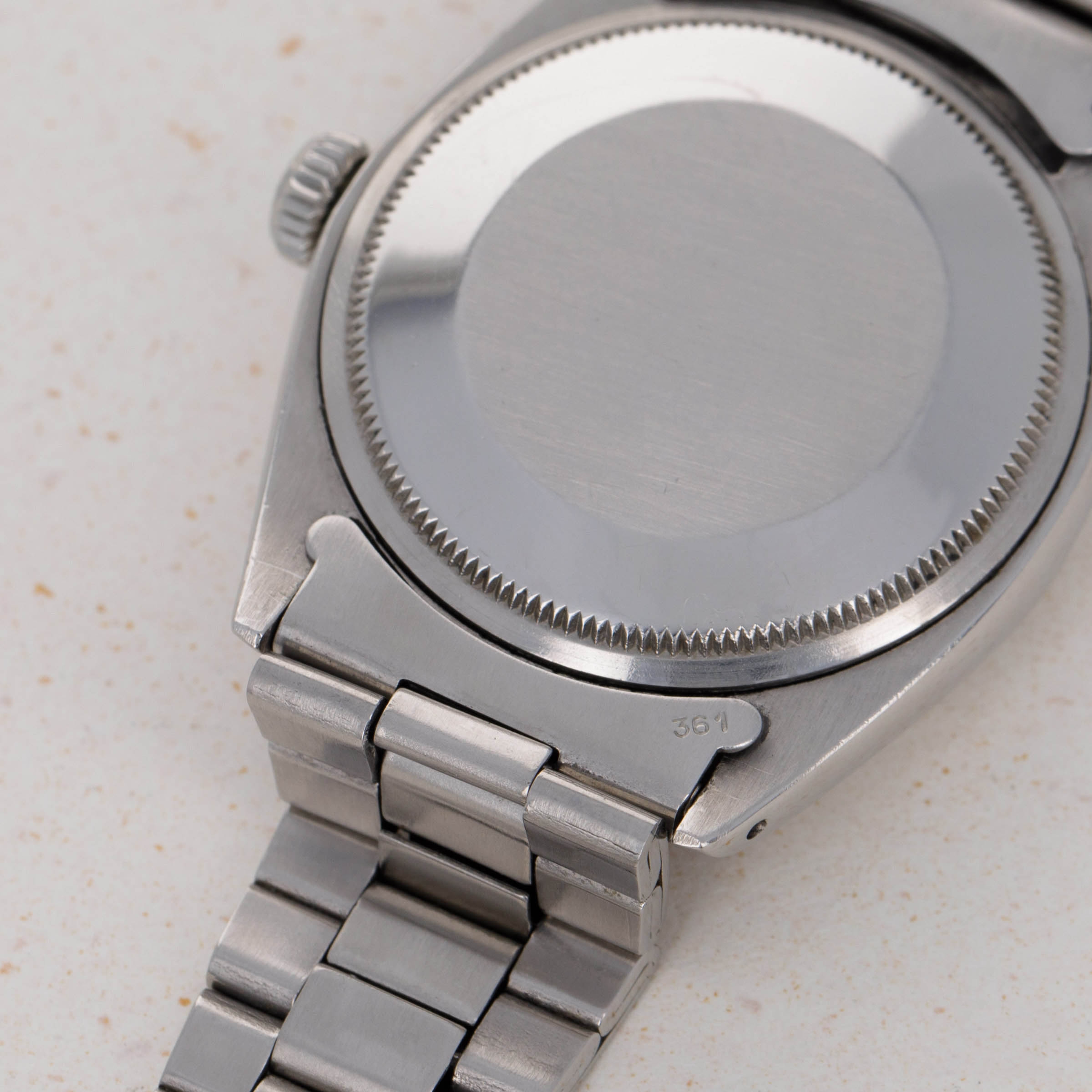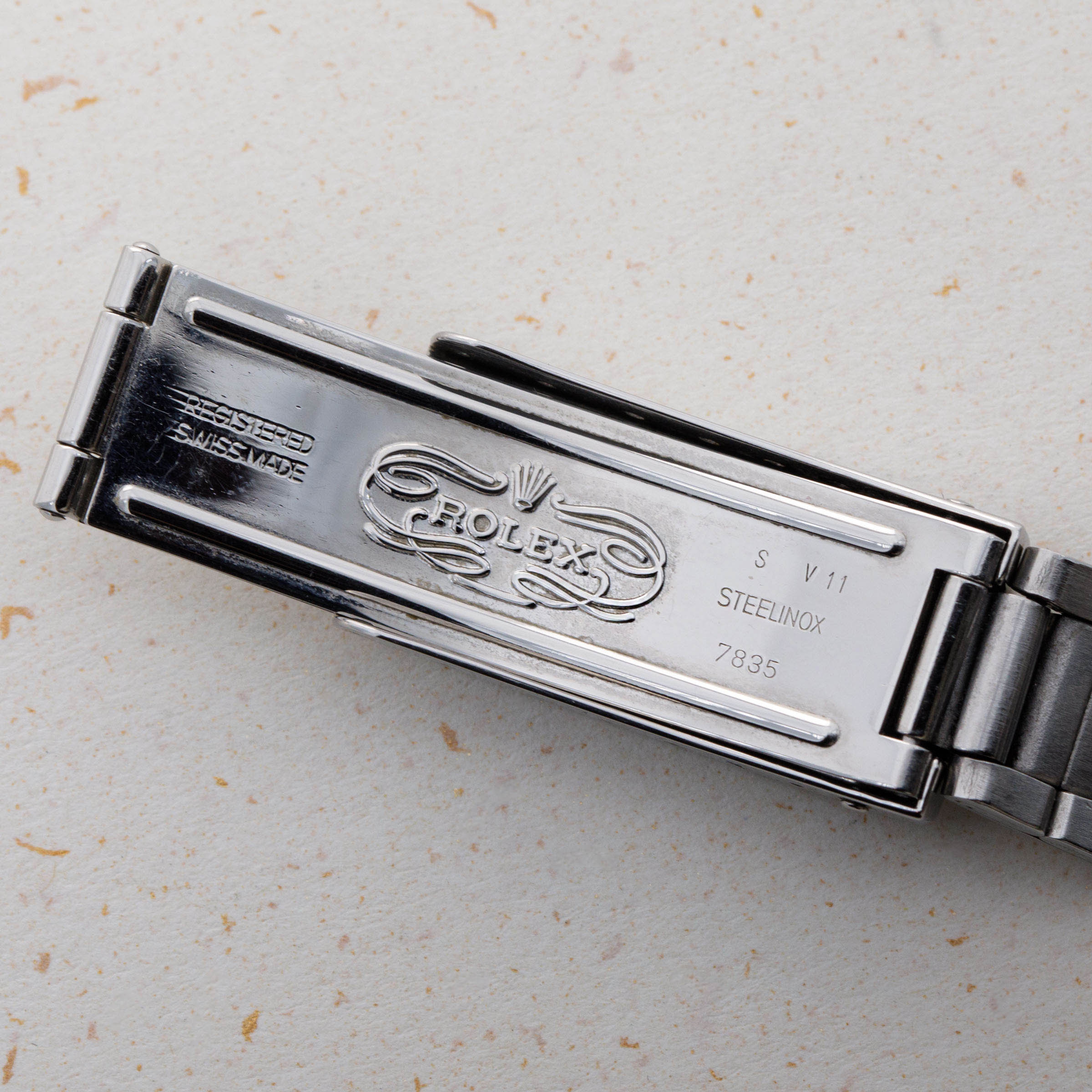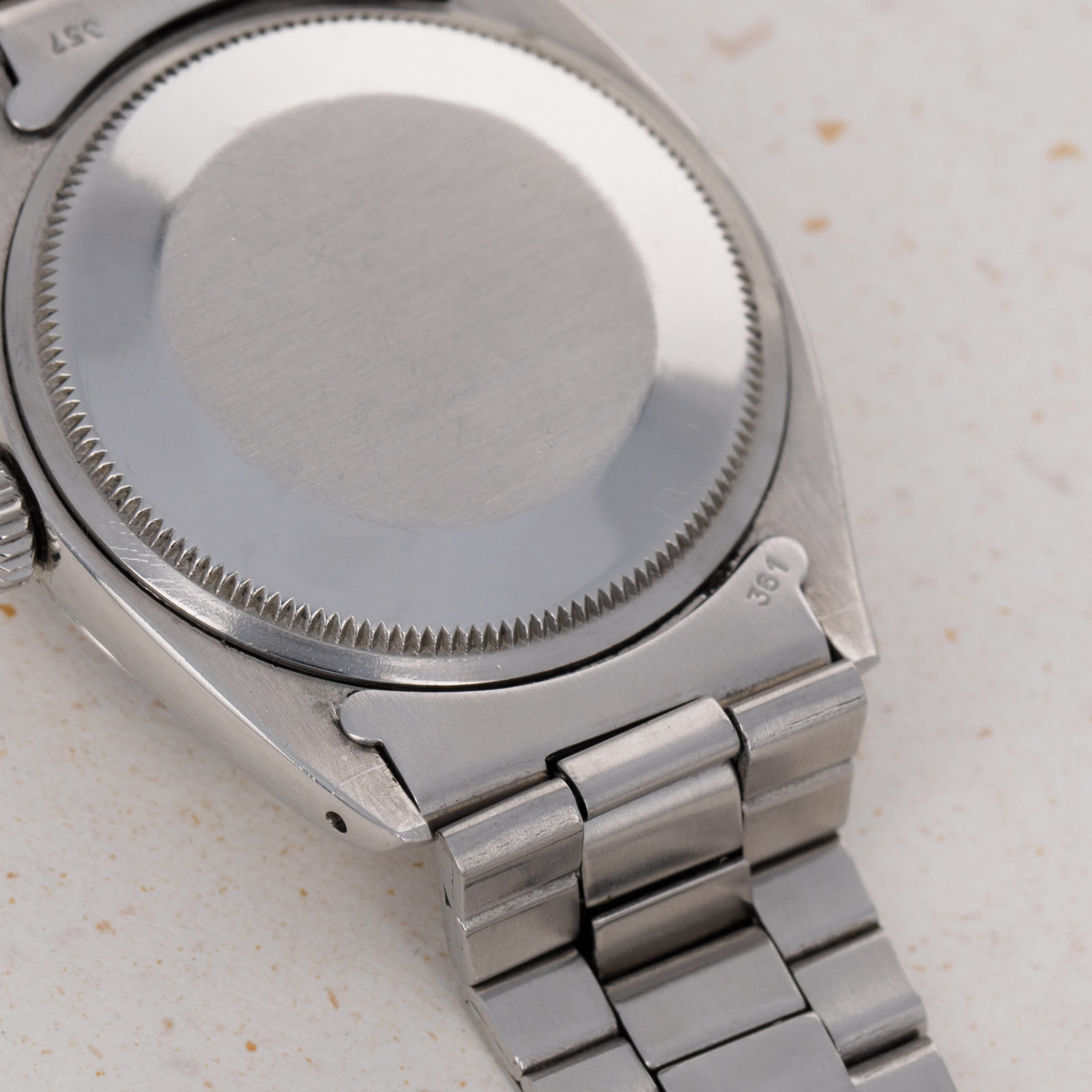 Watch is in excellent overall condition. Case has been previousy polished, and there is only minimal surface wear visible. Dial is in very good condition, with some oxidation visible around the date window and imperfect luminous plots. The watch comes on a bracelet with 13 links total, that fits an approx 7 1/2" wrist on its largest setting. Bracelet has some light stretch.