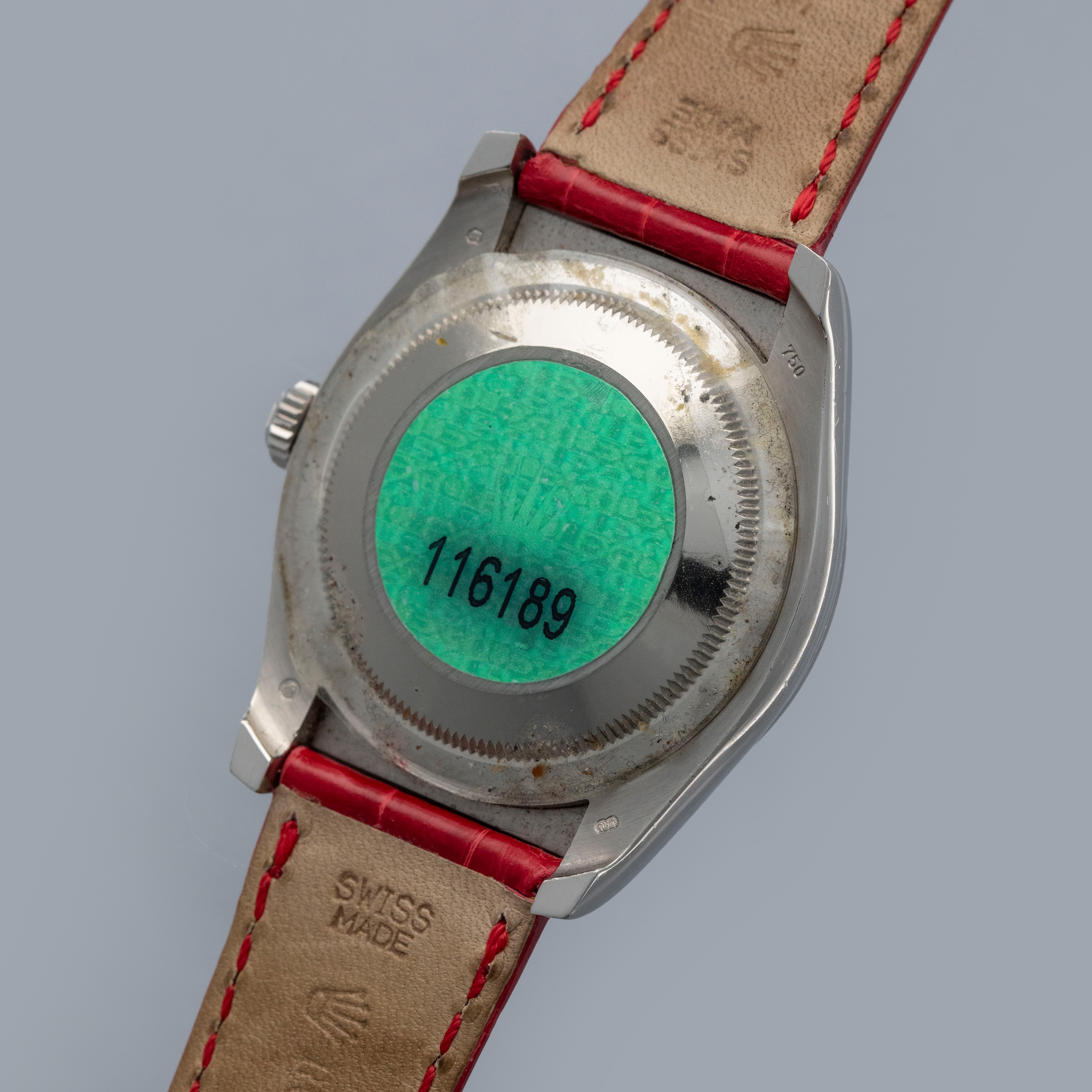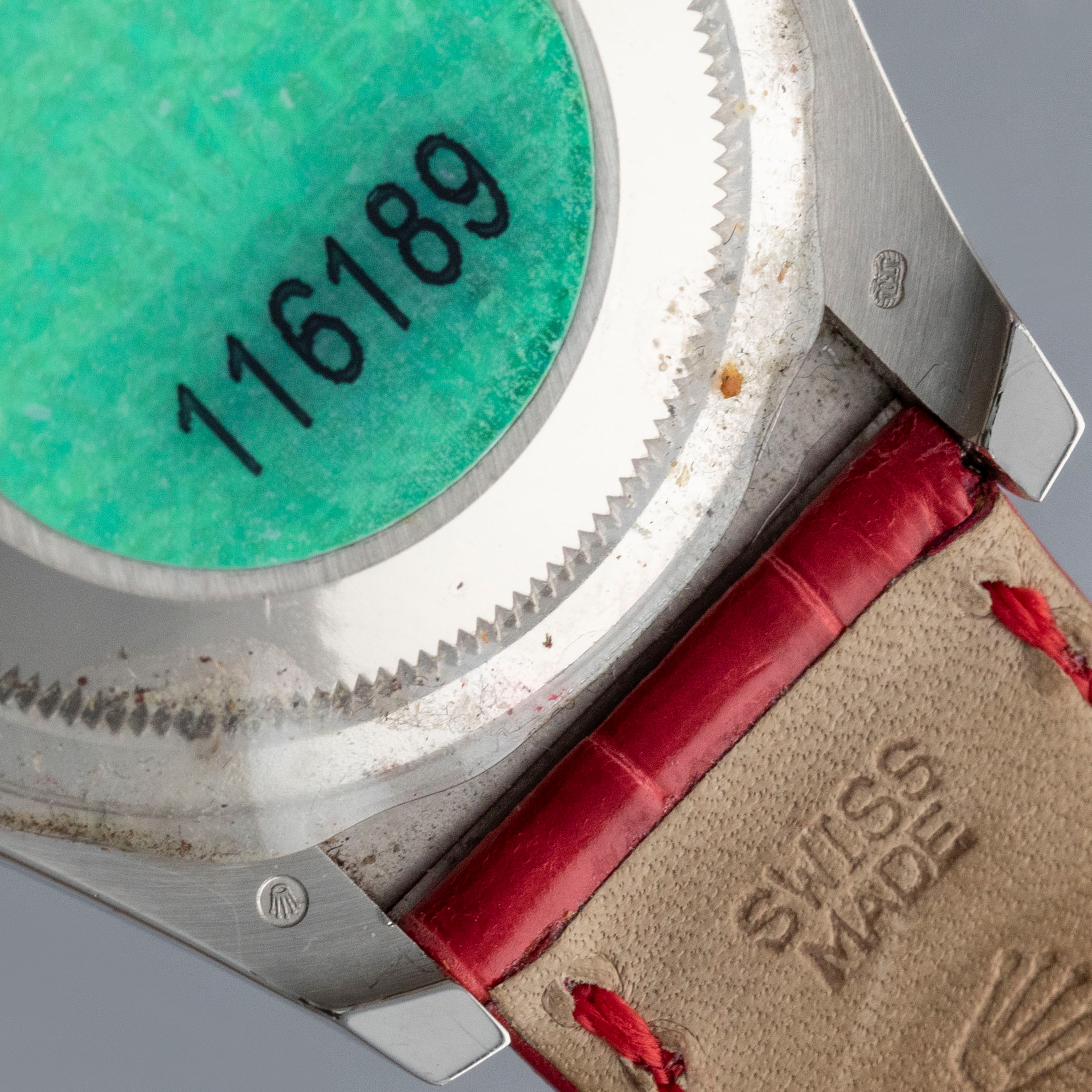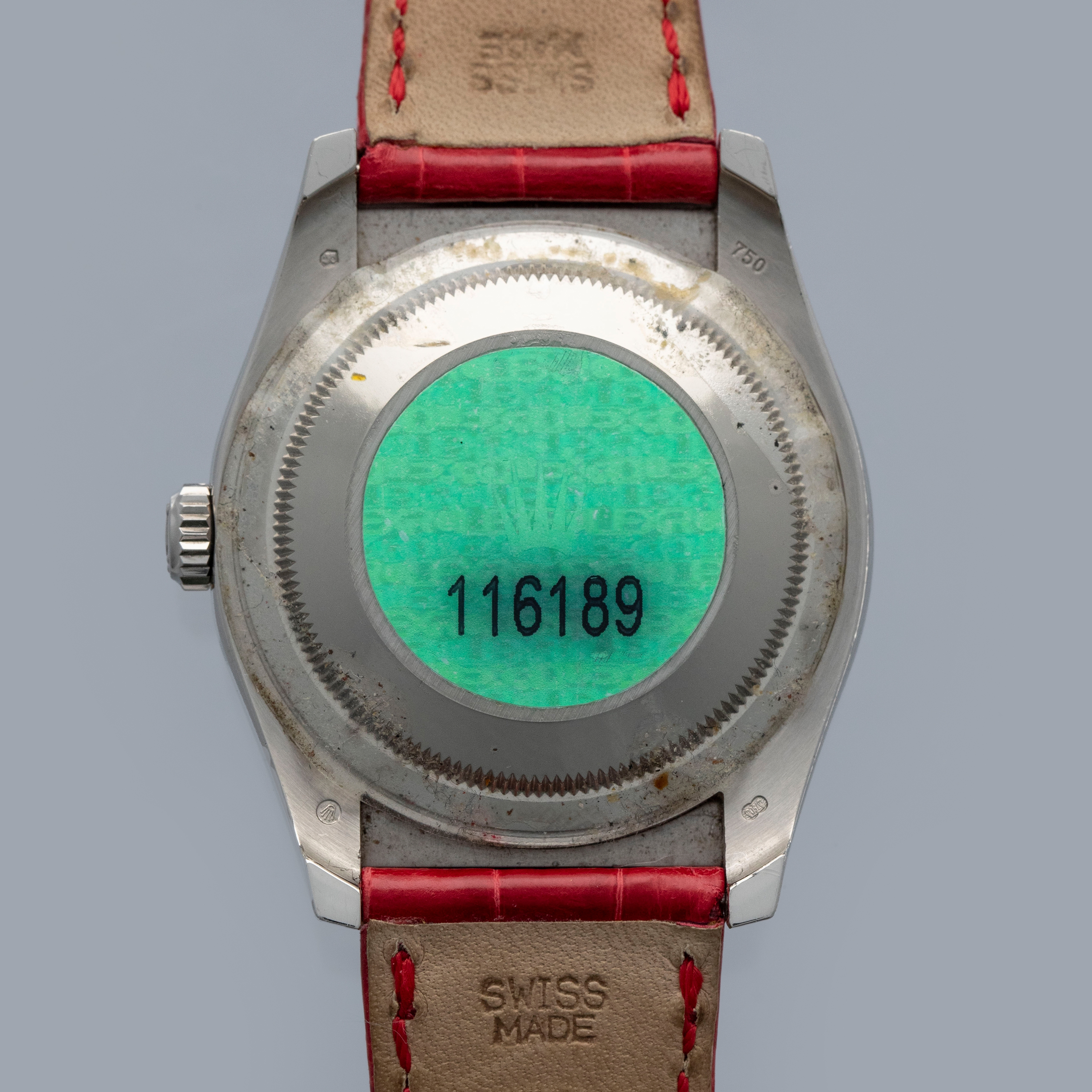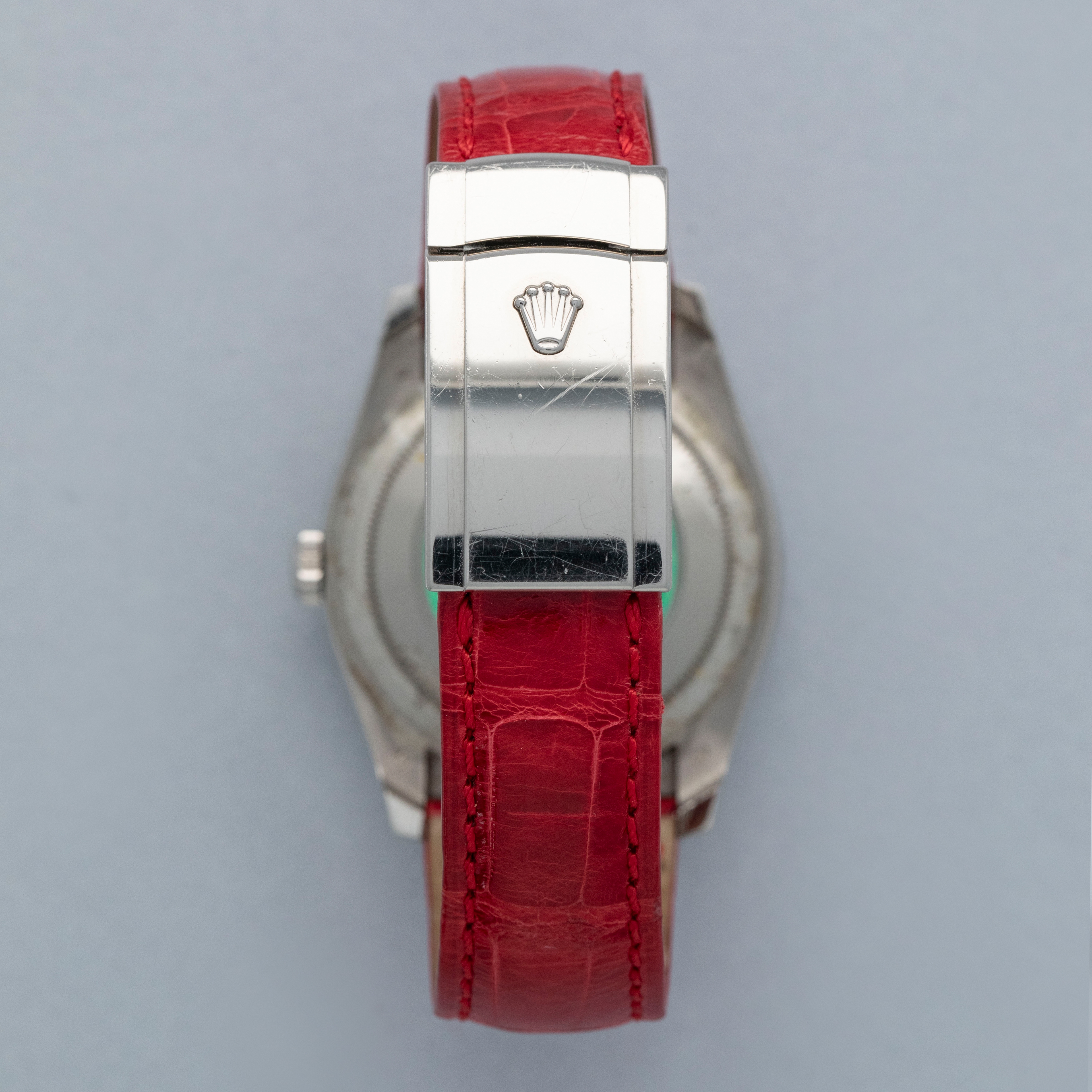 Made of 18kt white gold and offered only on a leather strap, this Datejust appears to be a rather humble stainless steel, as an onlooker might suspect, and thus only those in the know are able to identify this as the rare white gold Datejust that it is.