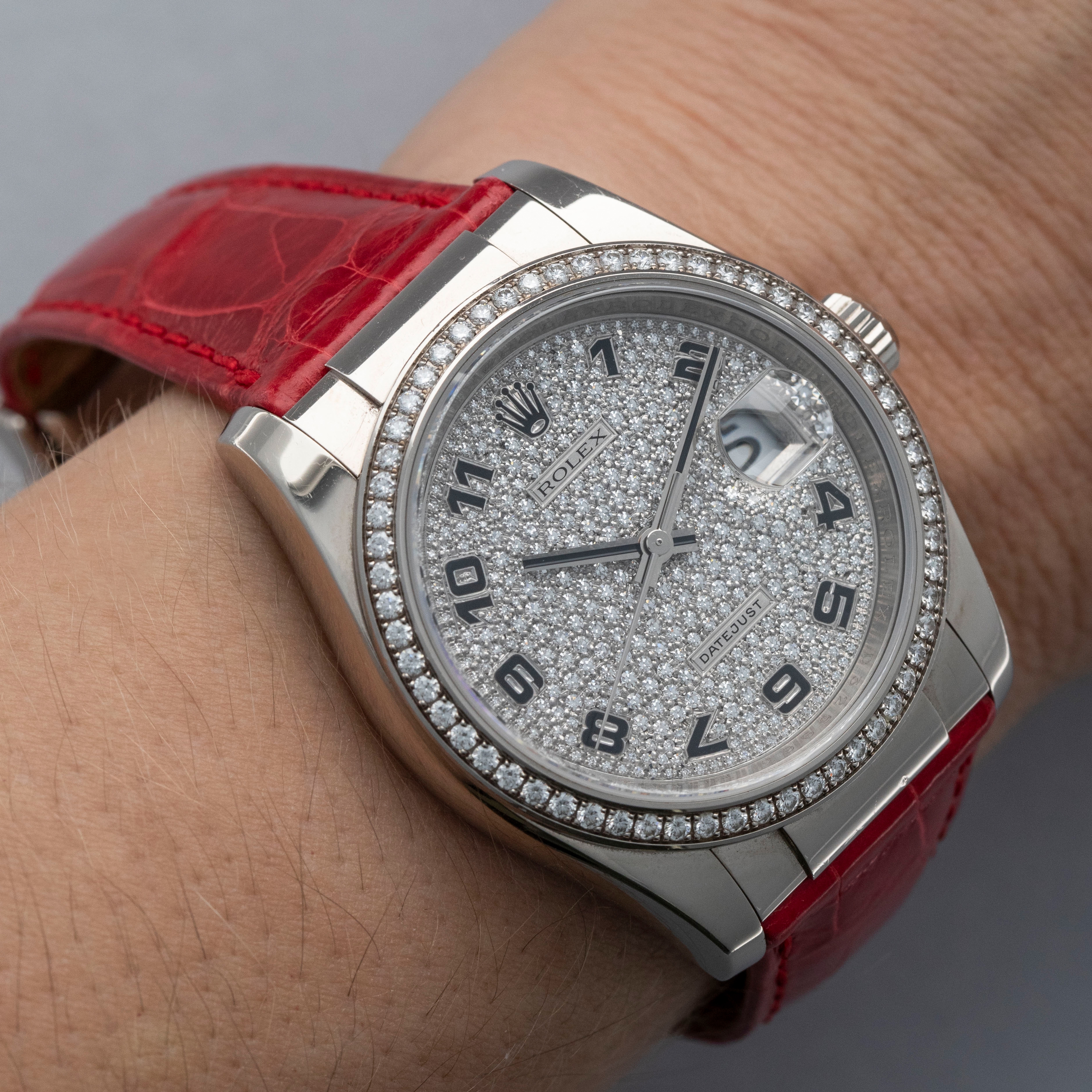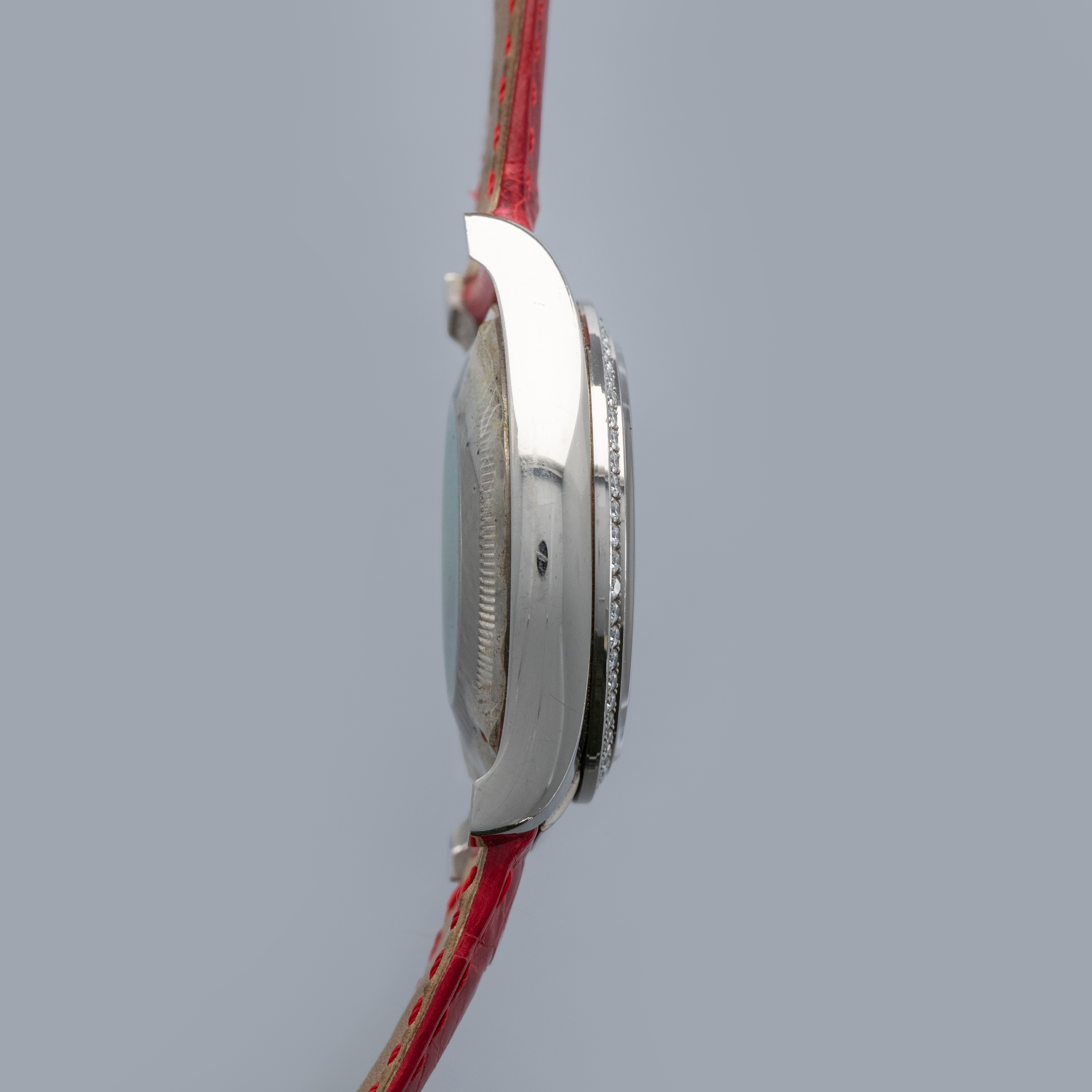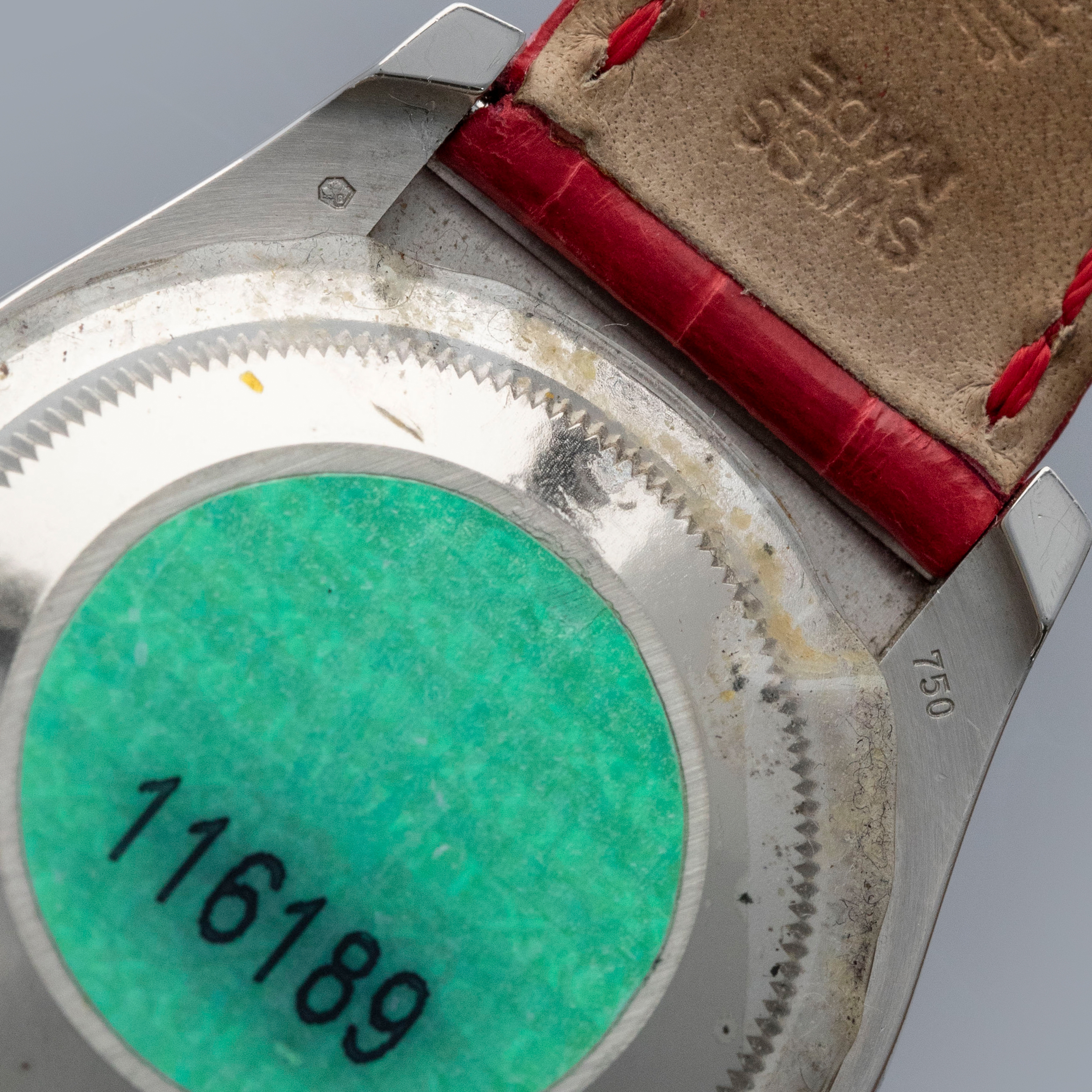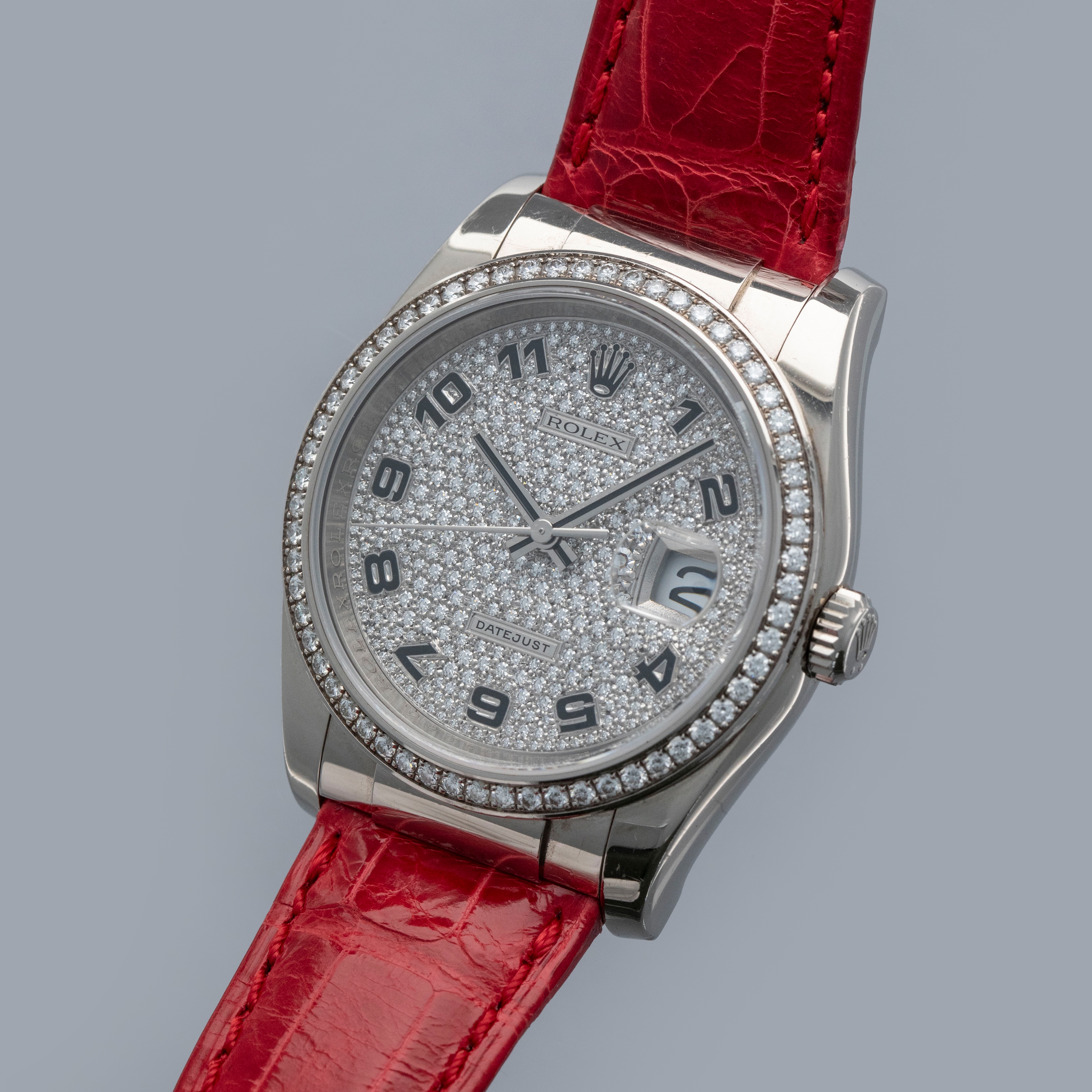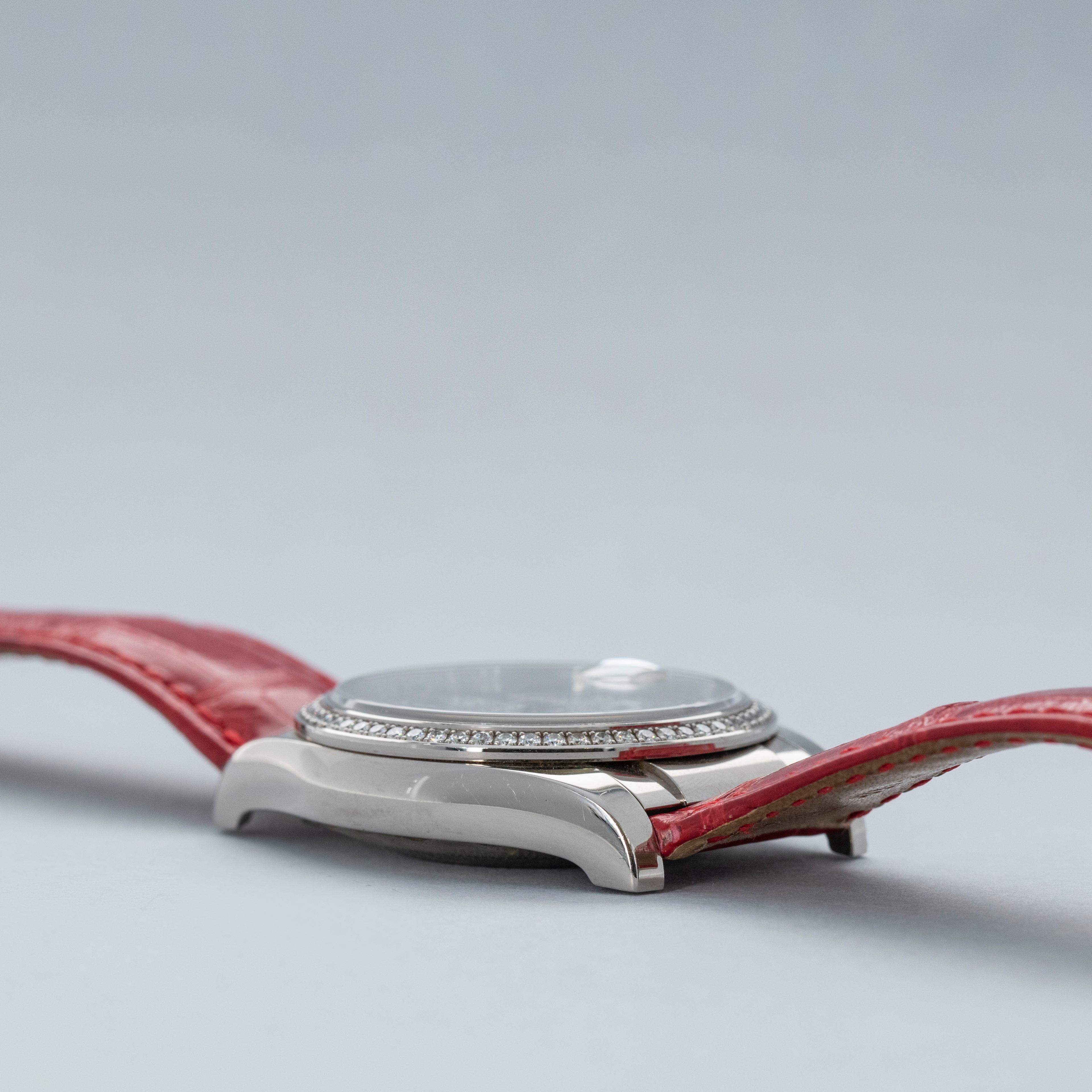 The watch is in overall excellent condition. The white gold case has some light scratches and signs of wear. The diamond-set bezel is excellent, with all stones and settings in very good condition. The hallmarks on the backs of the lugs are crisp, and the case back retains its original sticker with some signs of wear. The pavé diamond dial features radial enamel Arabic numerals and is like new, as are the hands. The watch is fitted with a red alligator strap in excellent condition and a white gold deployant clasp with light scratches.