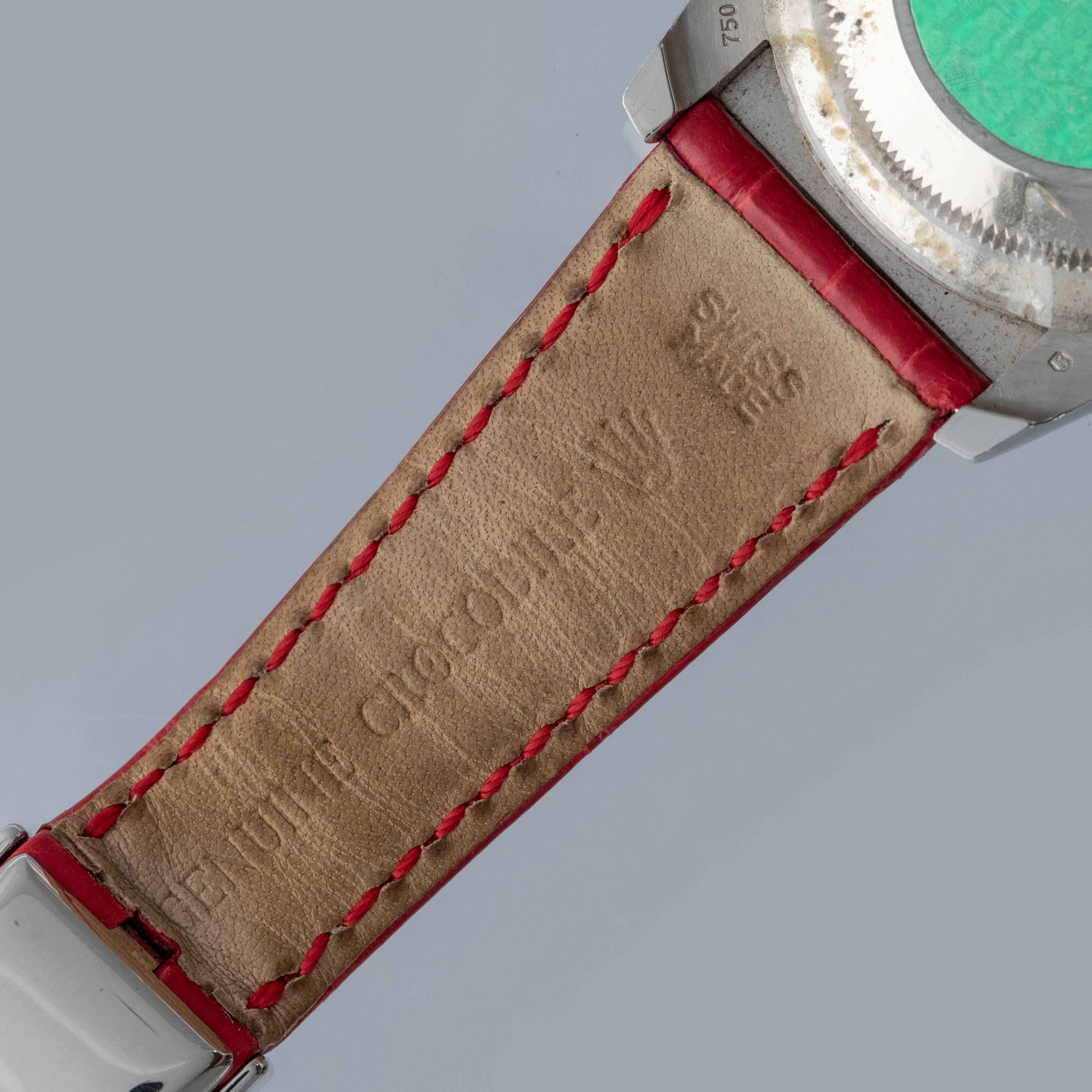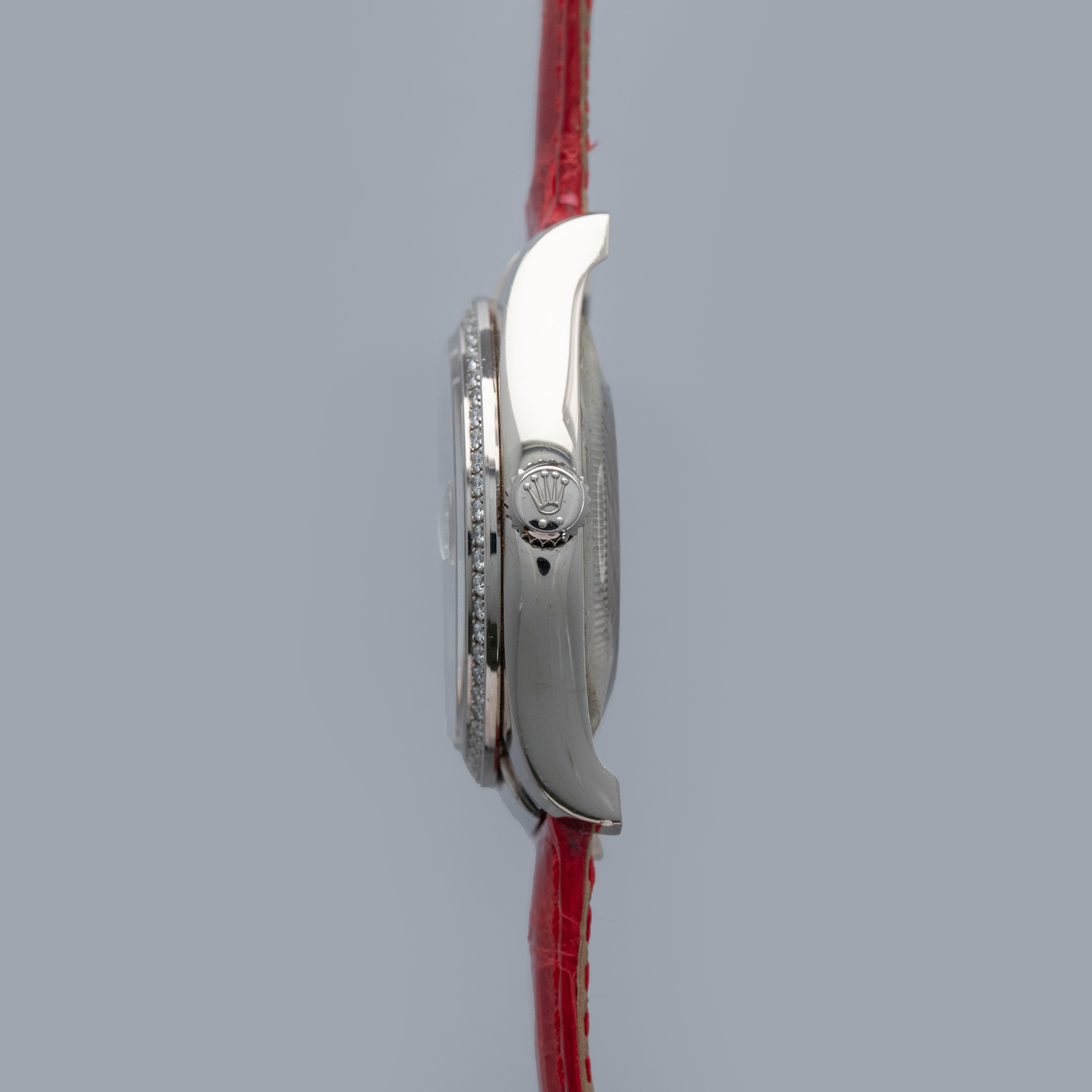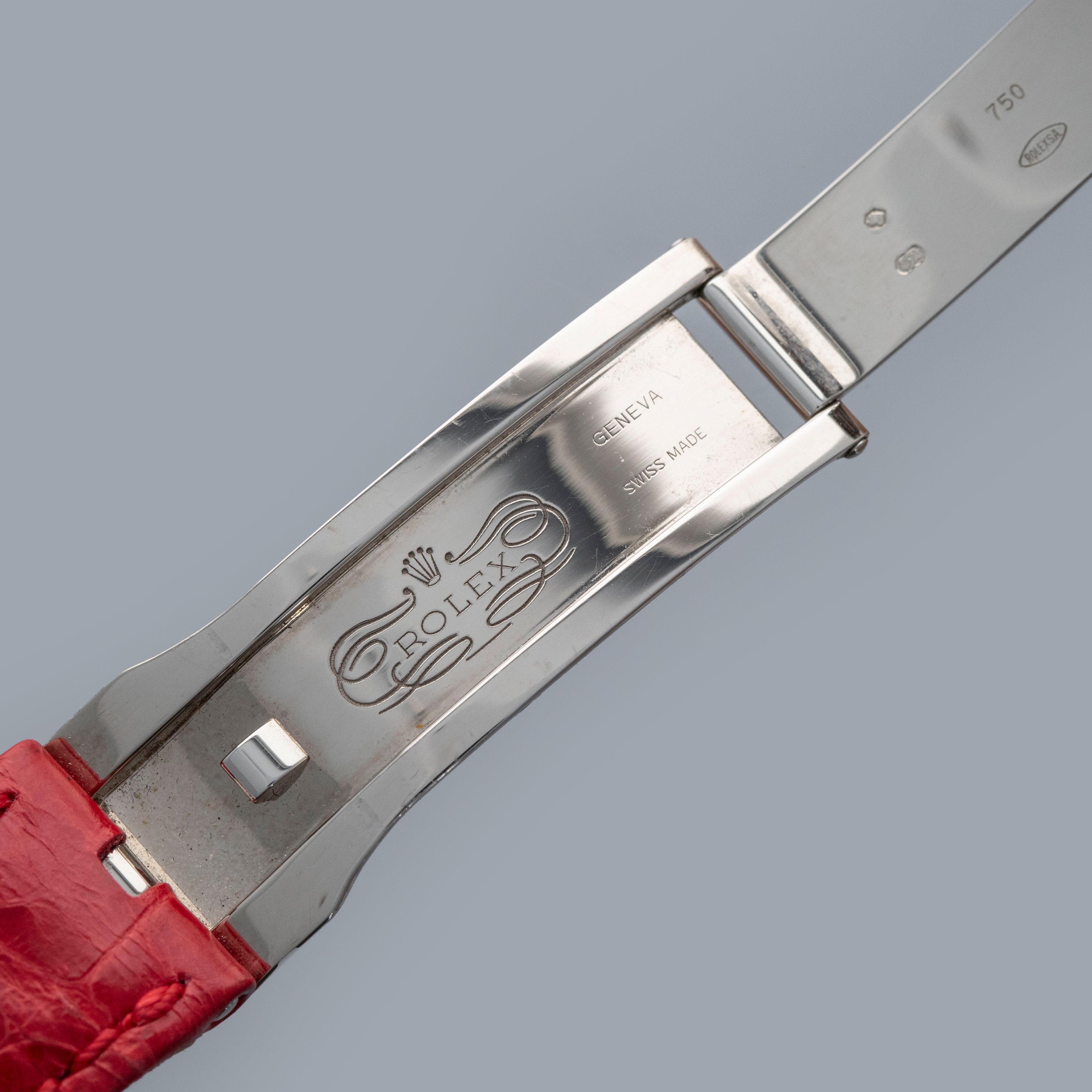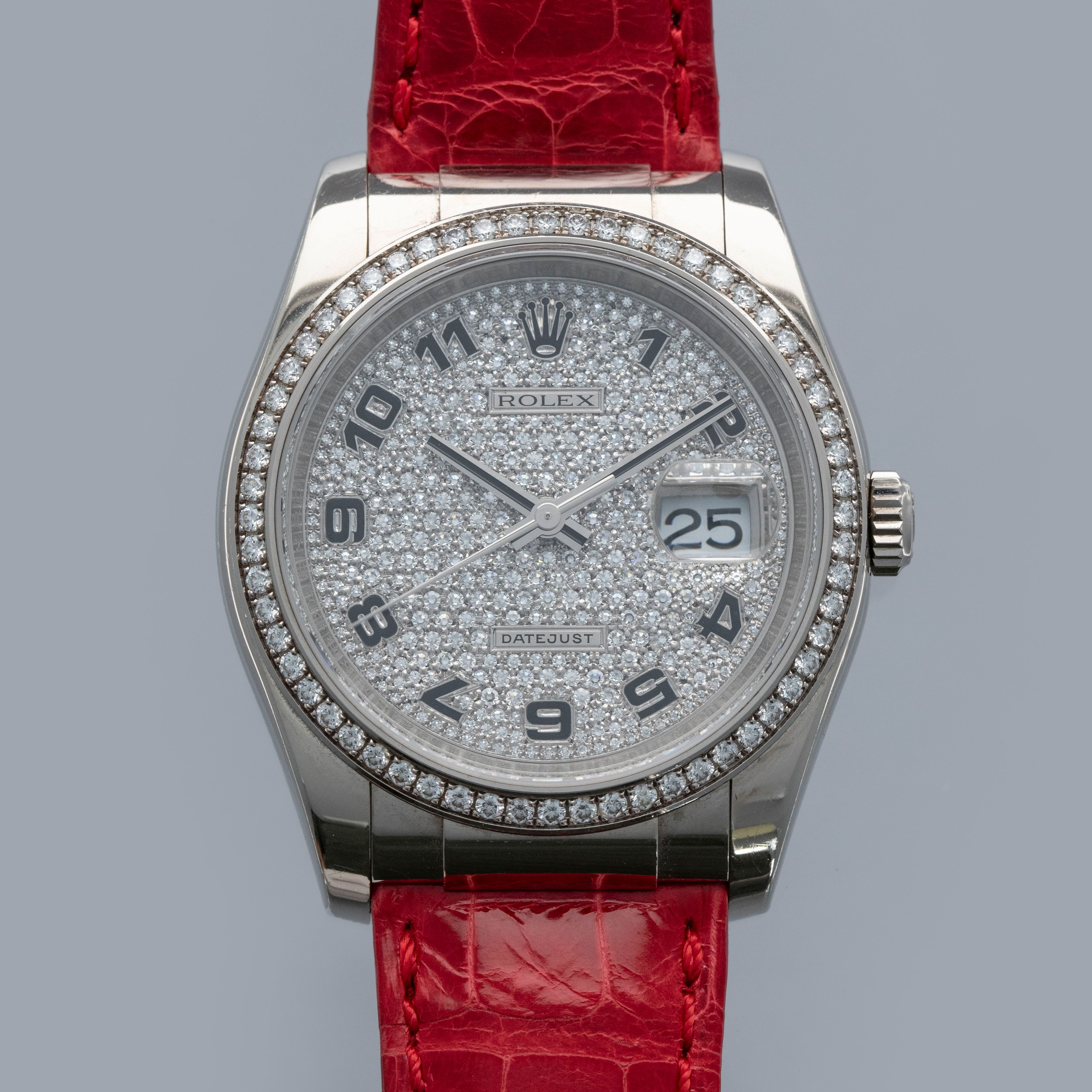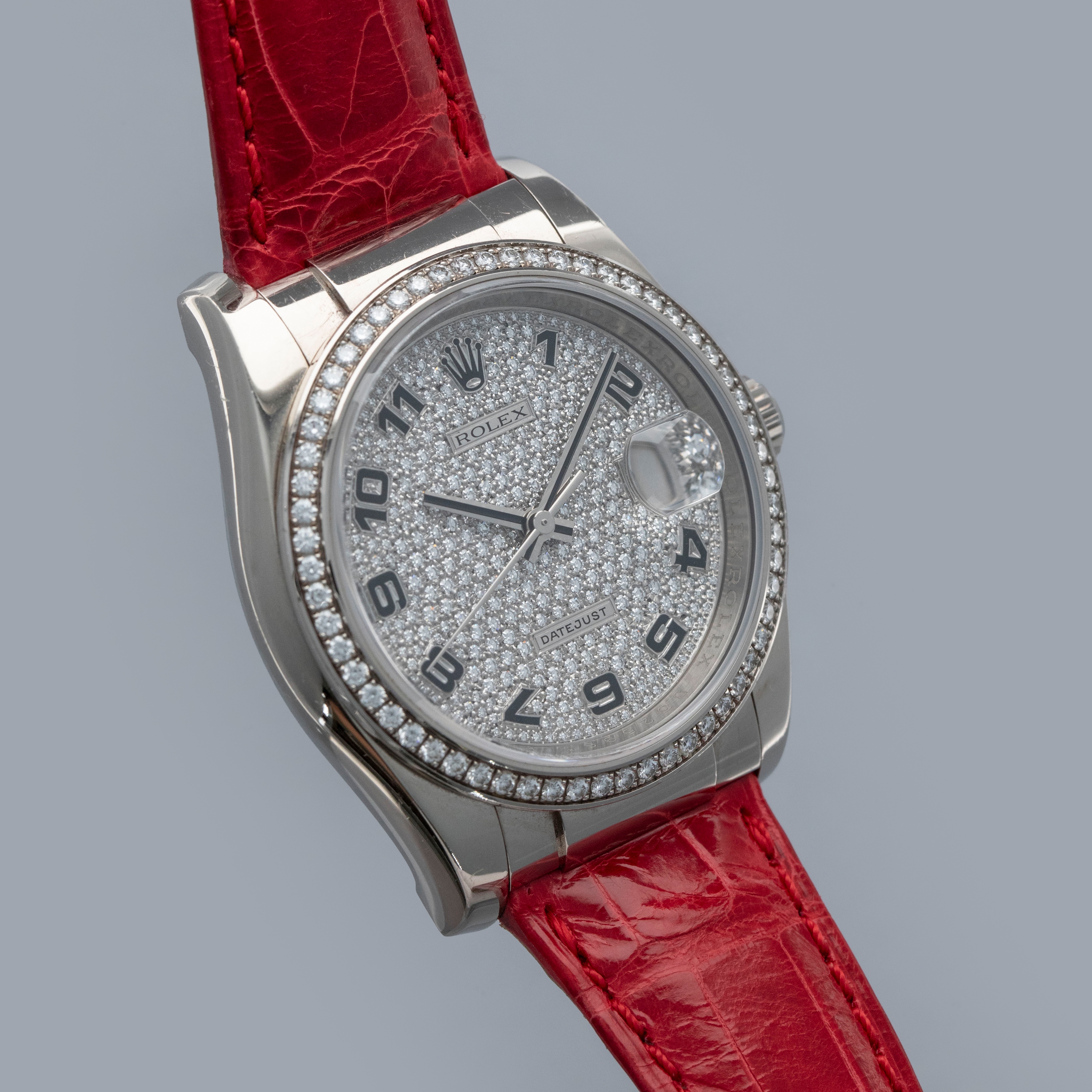 The watch is in overall excellent condition. The white gold case has some light scratches and signs of wear. The diamond-set bezel is excellent, with all stones and settings in very good condition. The hallmarks on the backs of the lugs are crisp, and the case back retains its original sticker with some signs of wear. The pavé diamond dial features radial enamel Arabic numerals and is like new, as are the hands. The watch is fitted with a red alligator strap in excellent condition and a white gold deployant clasp with light scratches.