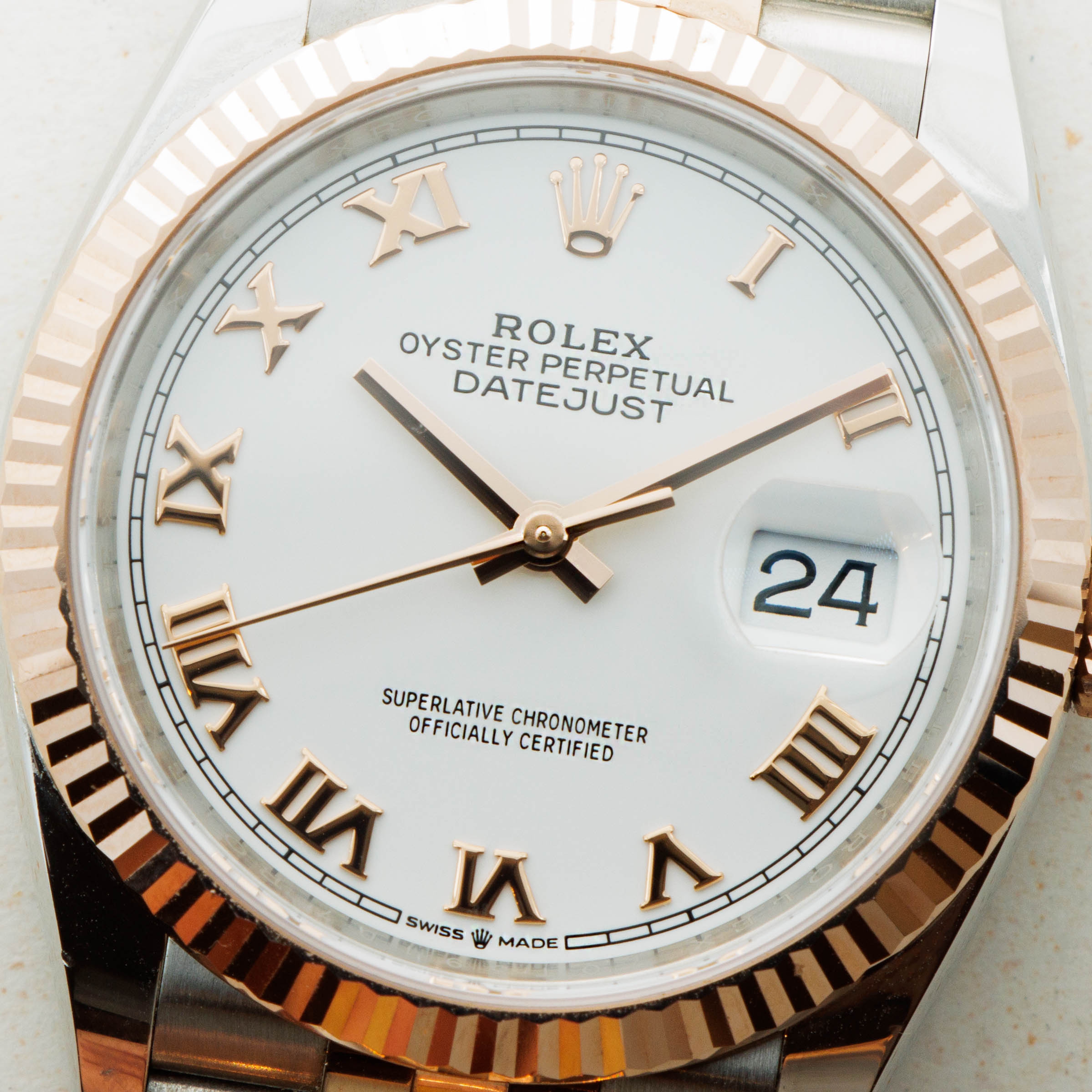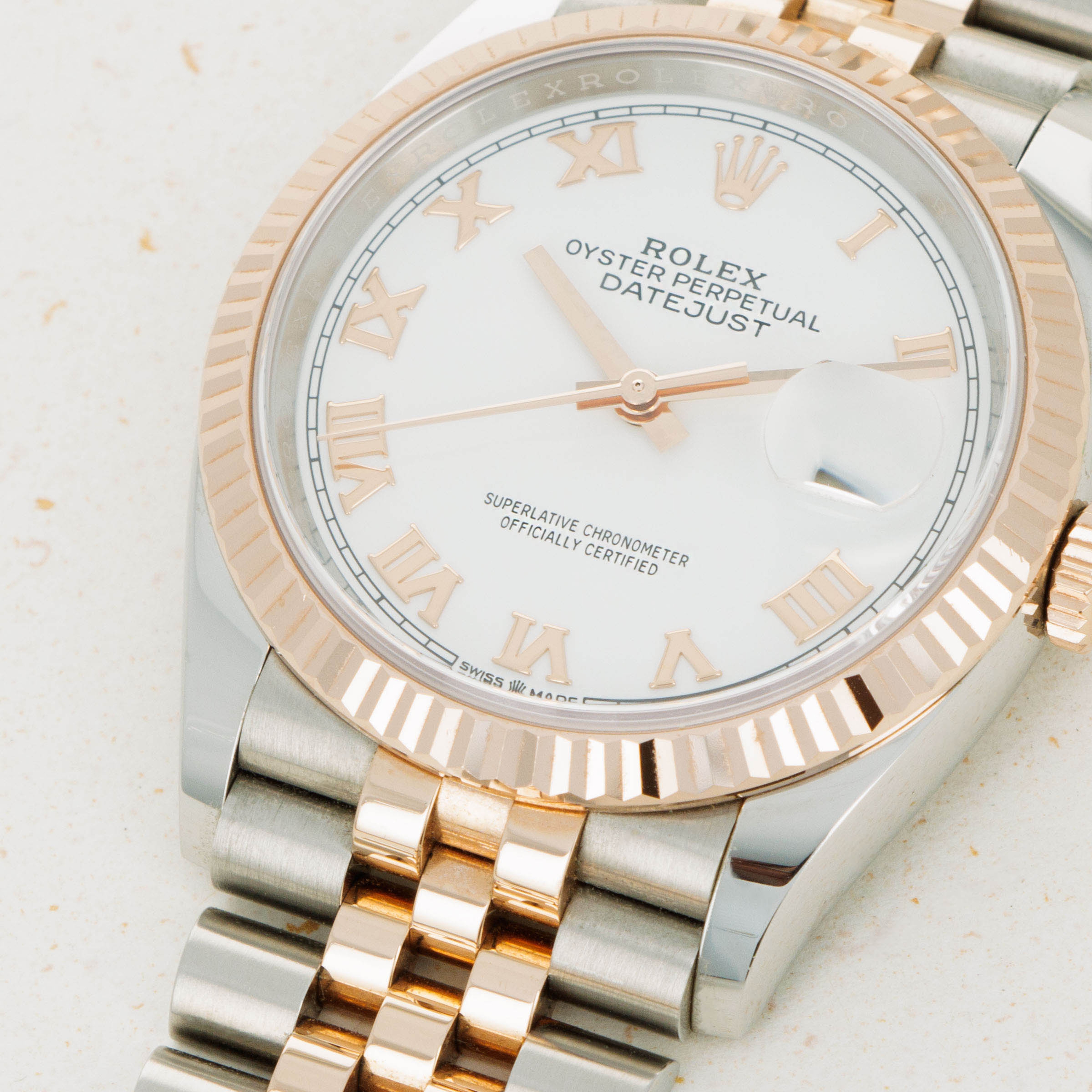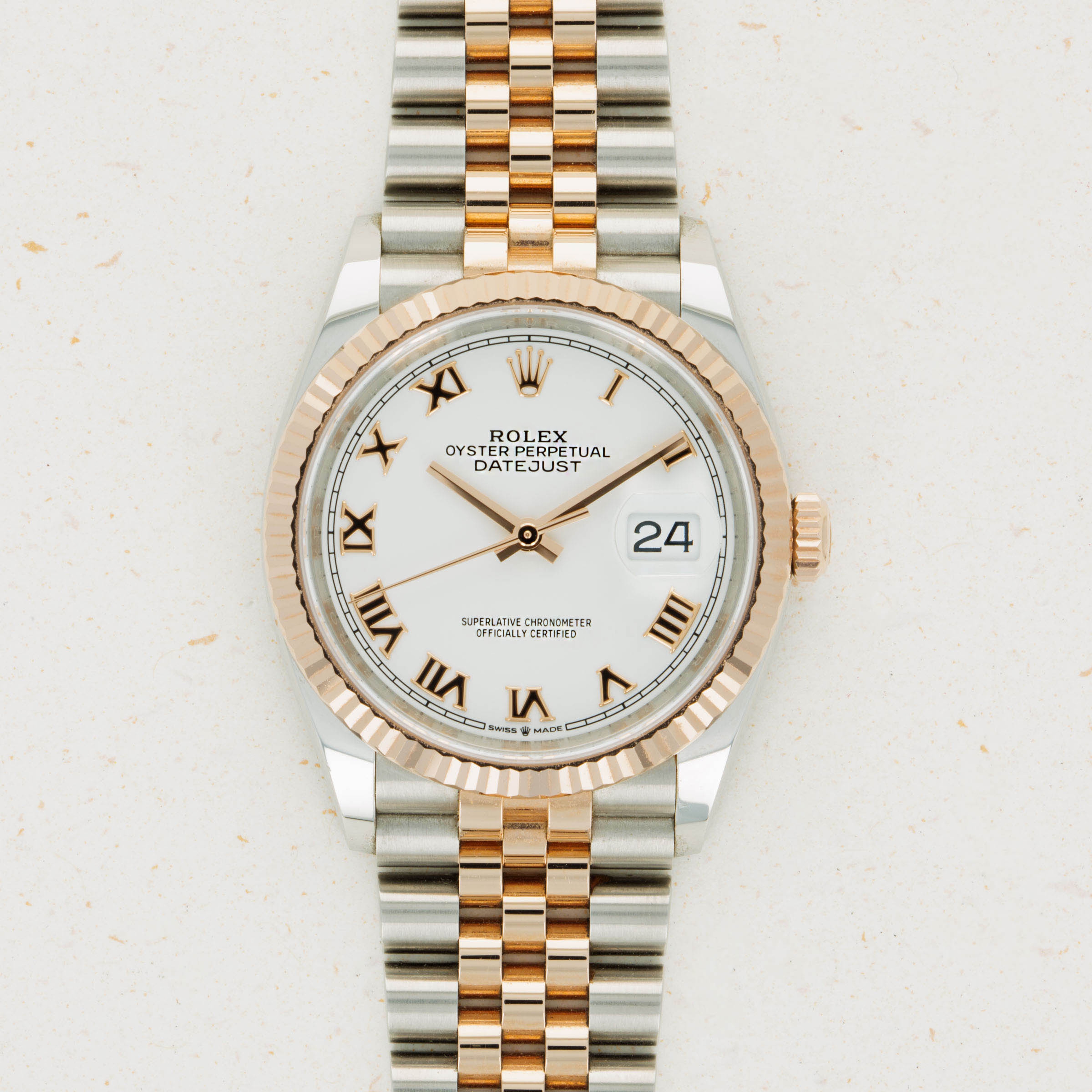 A design seemingly as old as horology itself, the Datejust is a watch we'll never grow tired of. With its stunning white dial and iconic 36mm two-tone construction sporting the Datejust's signature combination of a fluted 18kt gold bezel and Jubilee bracelet, there's nothing to not like with this stunning watch.