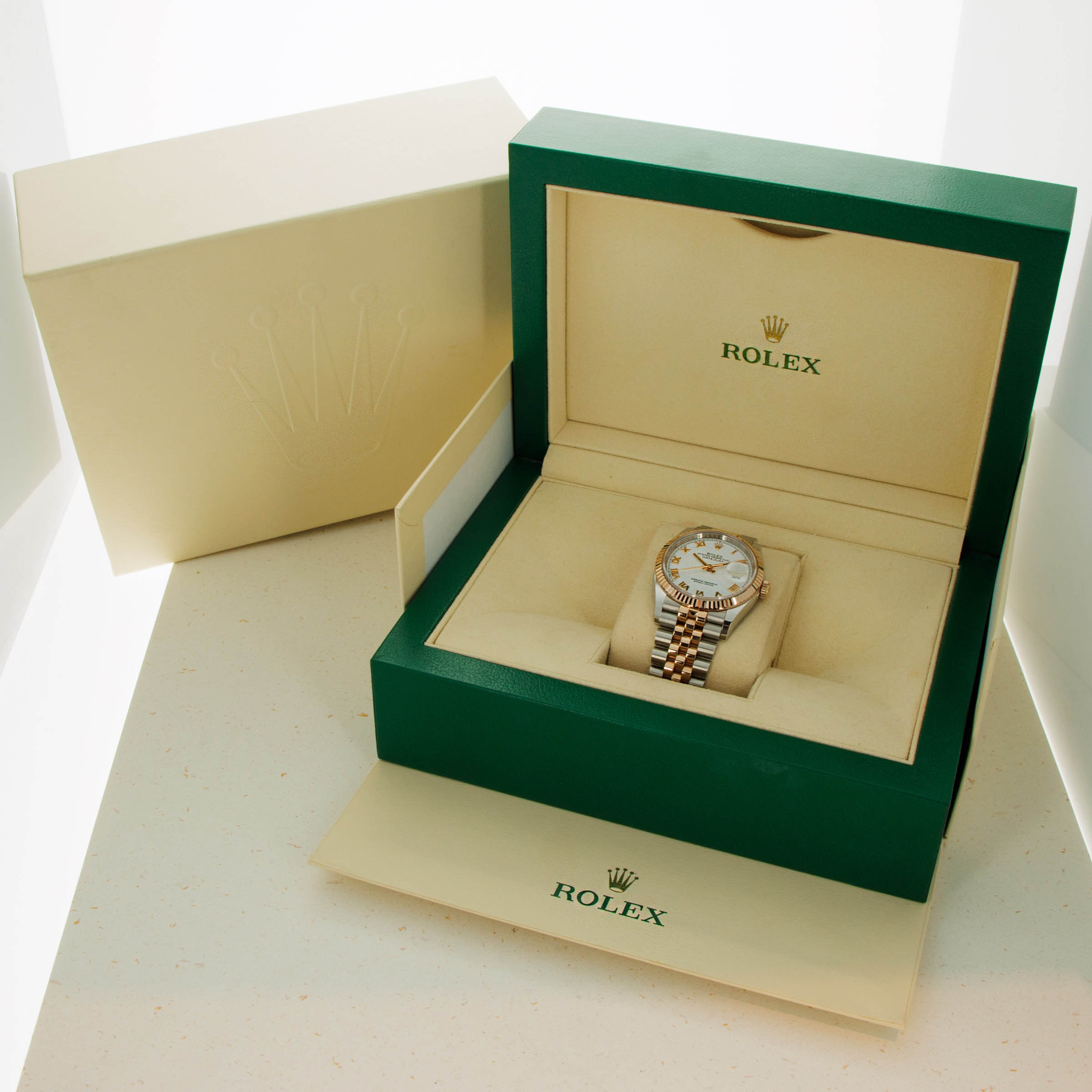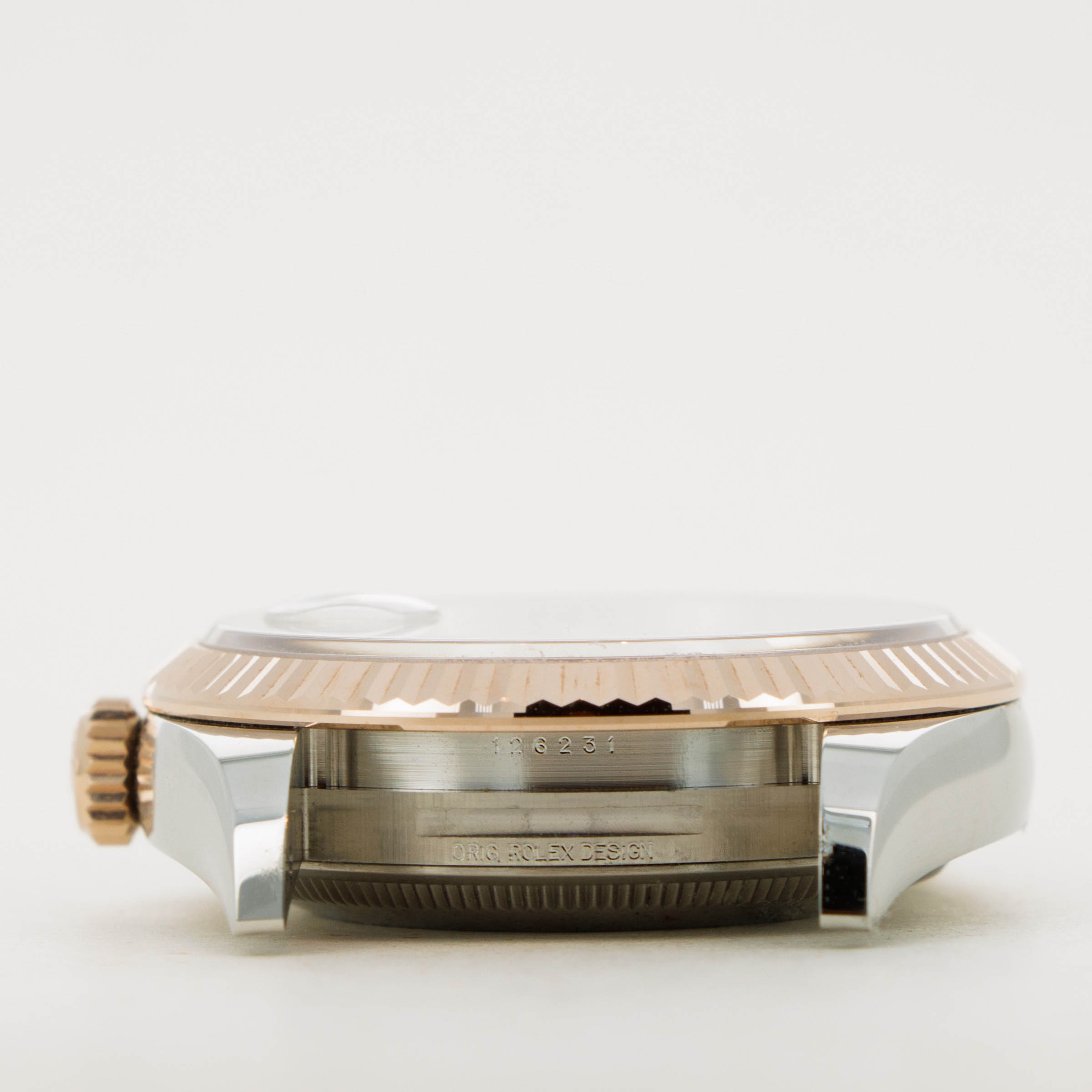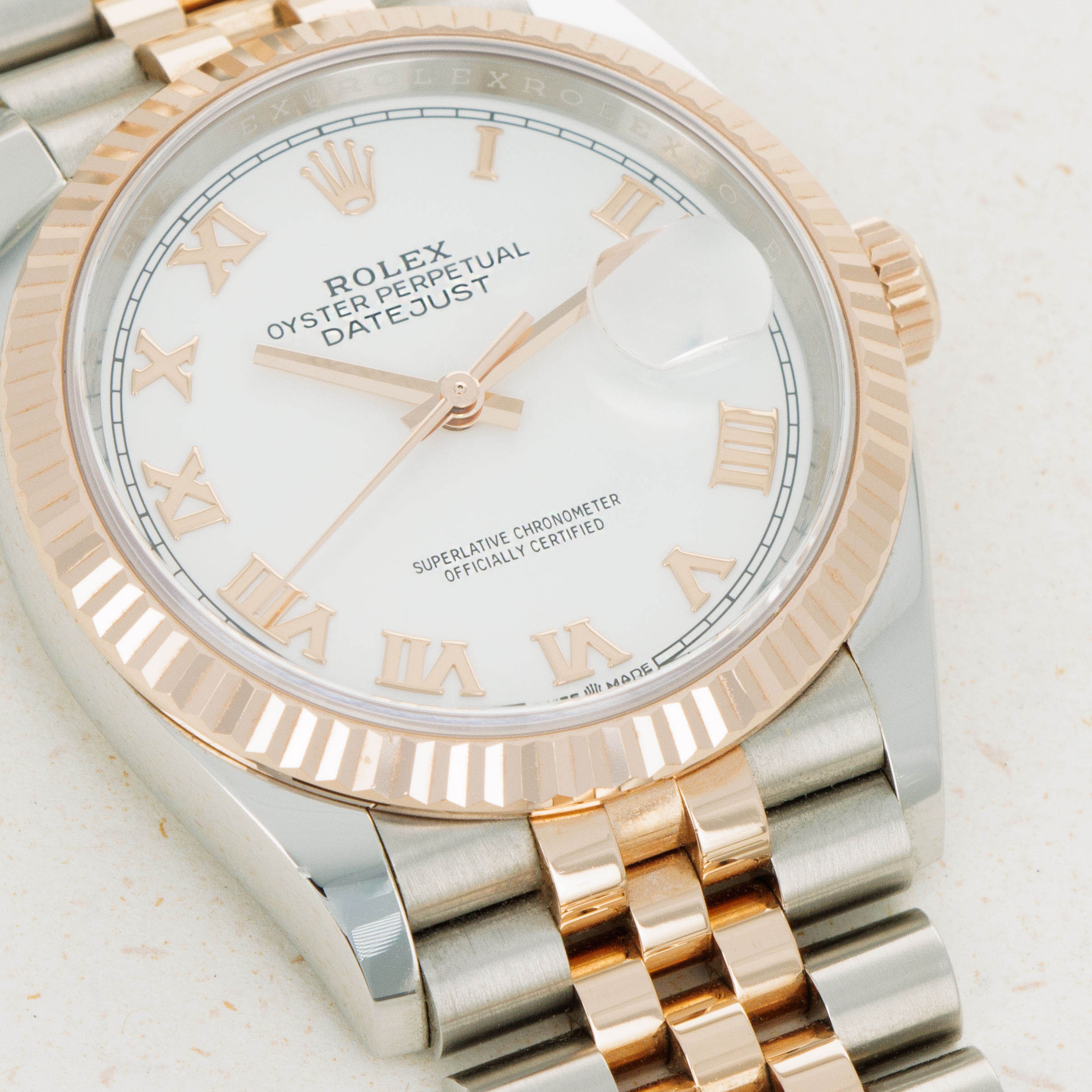 Featuring a type of dial that Rolex has perfected over years, this ref. 126231 boasts a white dial with 18kt rose gold applied Roman numerals that add another touch of luxury to this stunning timepiece.
