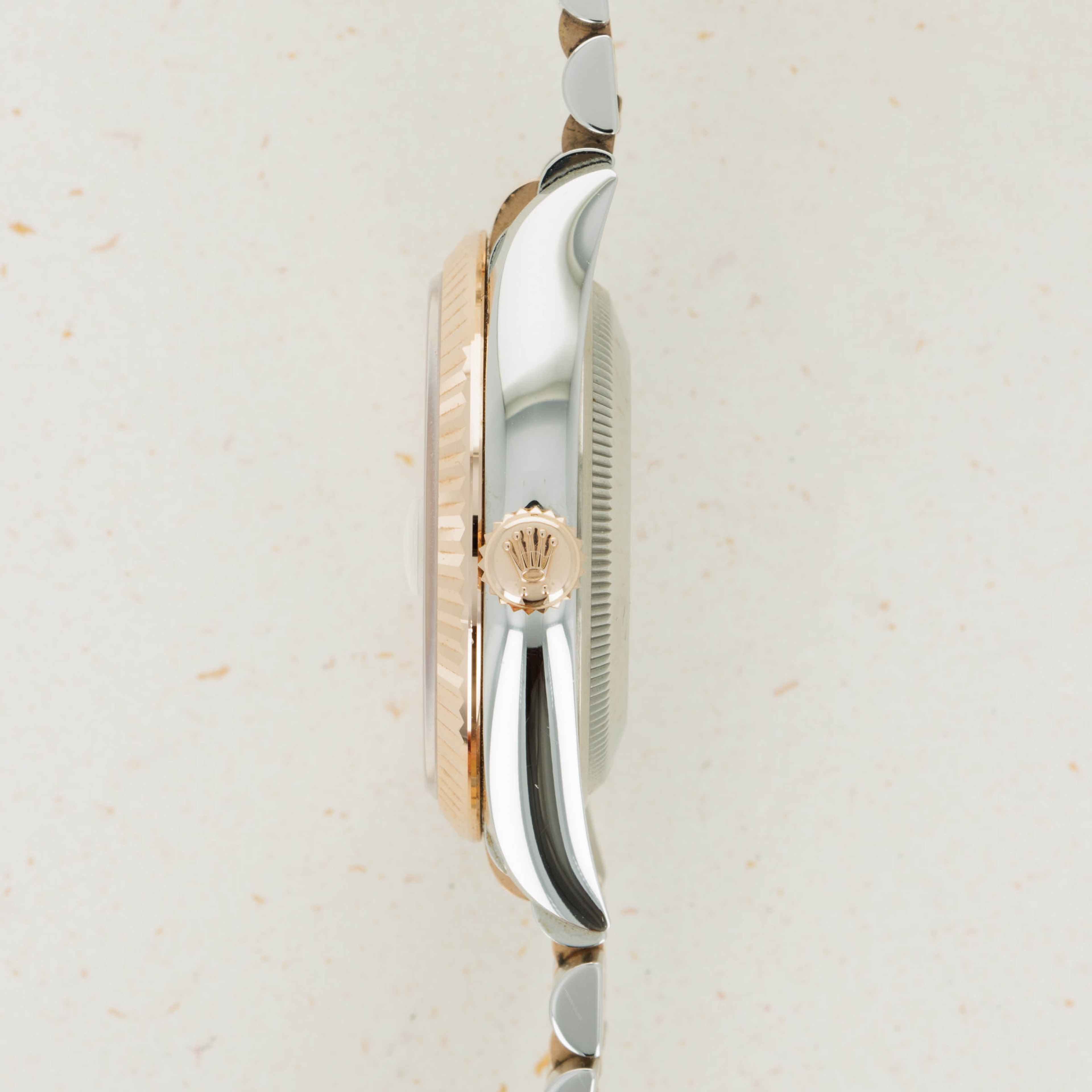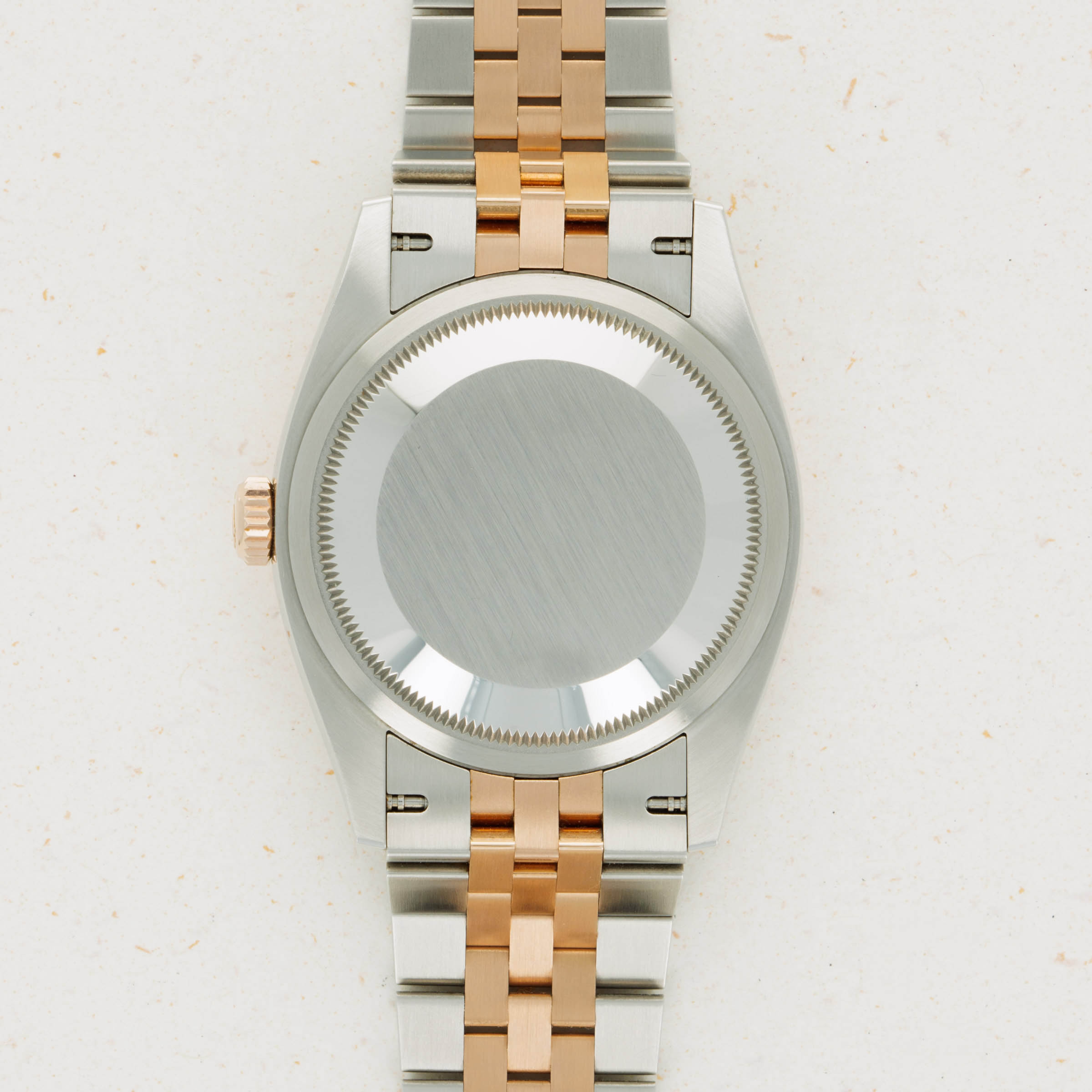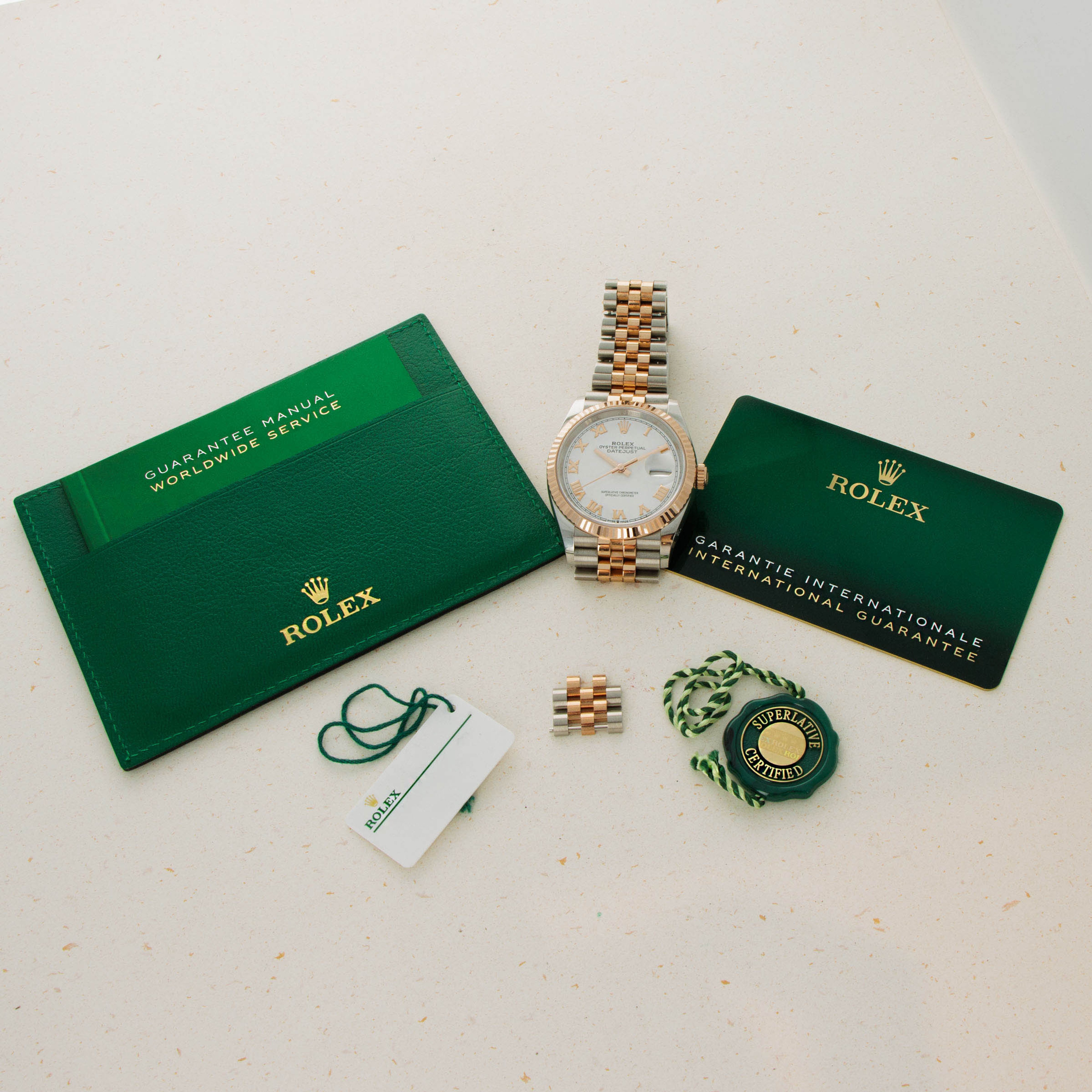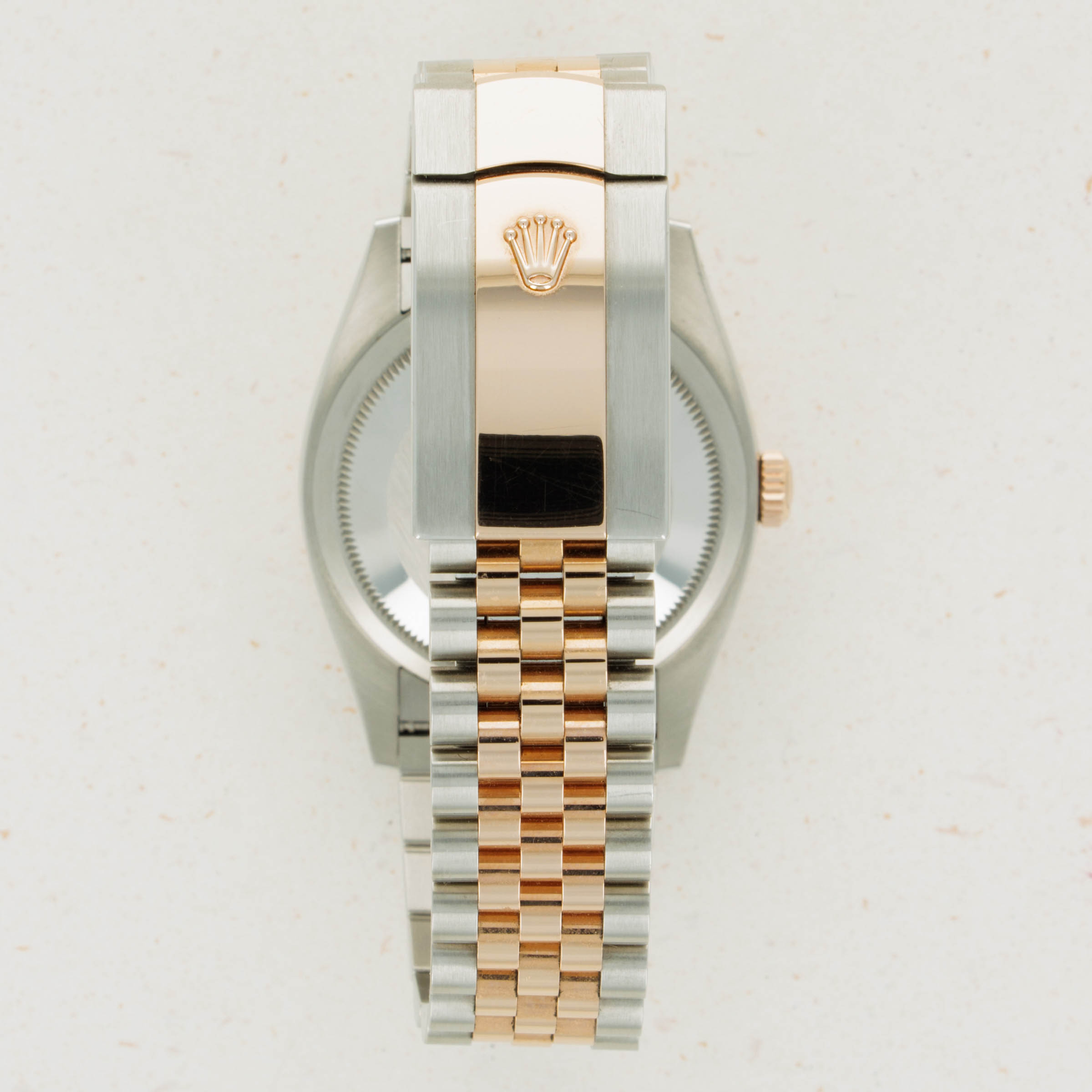 Featuring a type of dial that Rolex has perfected over years, this ref. 126231 boasts a white dial with 18kt rose gold applied Roman numerals that add another touch of luxury to this stunning timepiece.