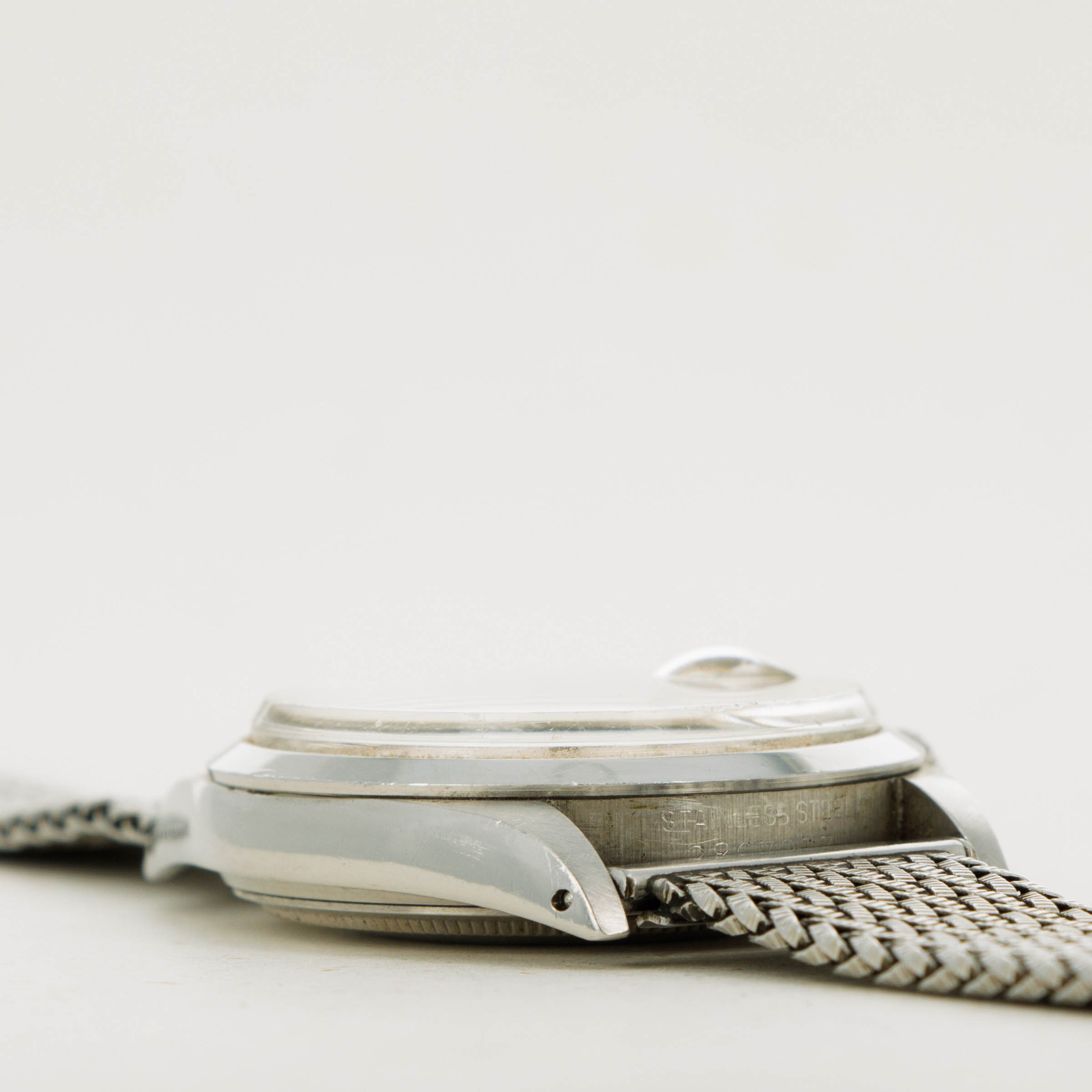 Featuring a beautiful silver pie-pan dial that is free from ageing except for its bright orange luminous pips at each hour marker, this example's dial is the perfect accompaniment to its entirely stainless steel construction.