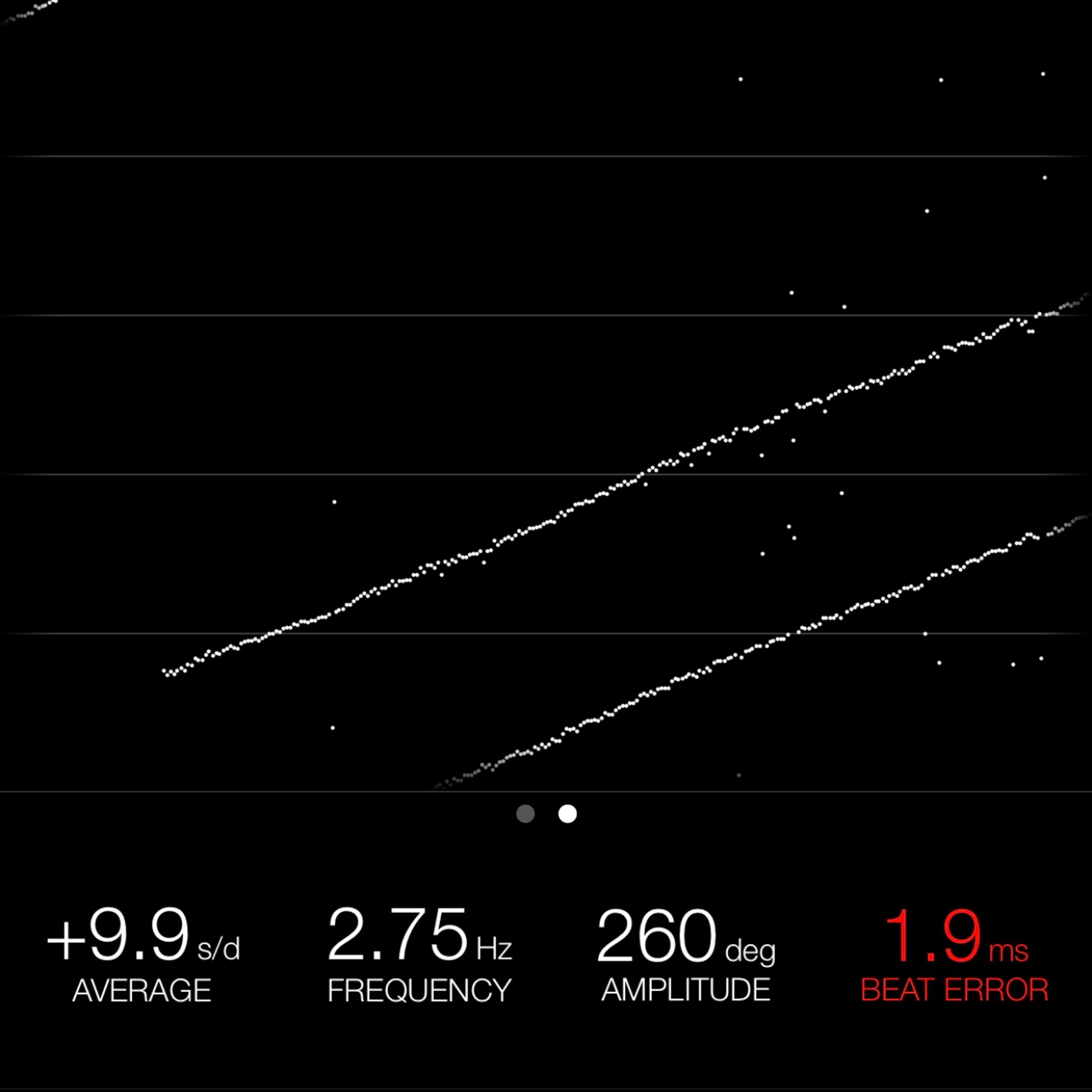 This reading was taken (crown down) with a ONEOF Accuracy Boutique Edition timing machine at time of cataloging. It is provided as a courtesy only, and shall not be construed as a warranty or guarantee of any kind. Please refer to our terms and conditions of sale for more information.