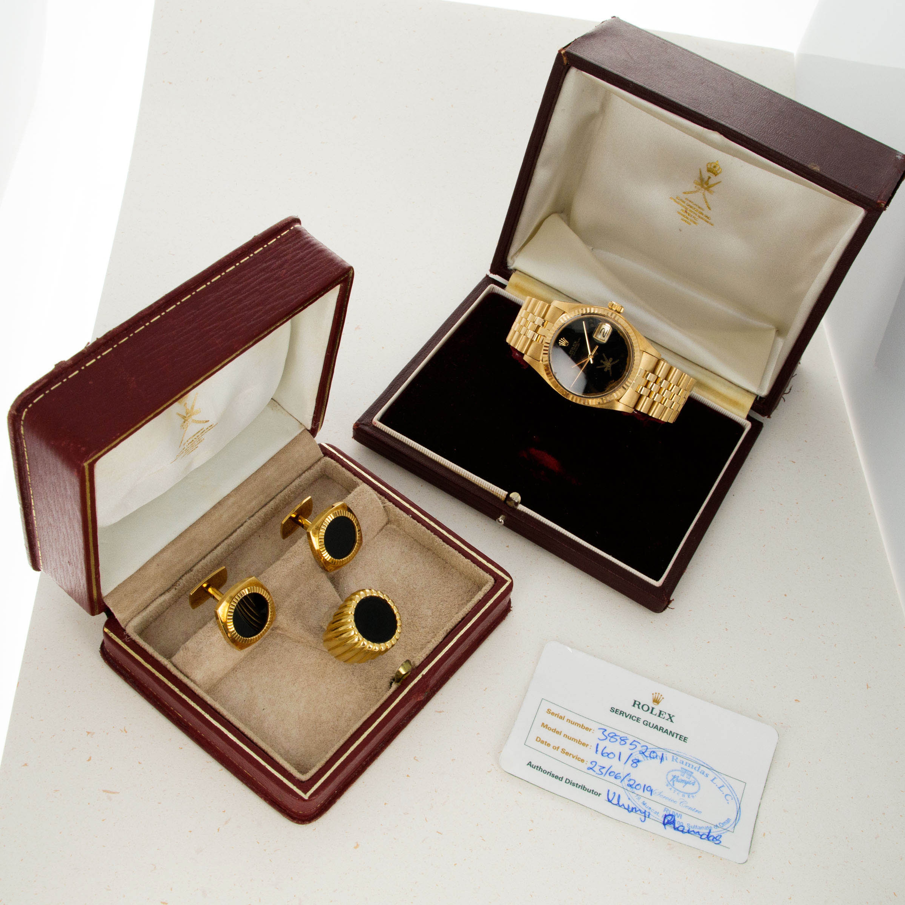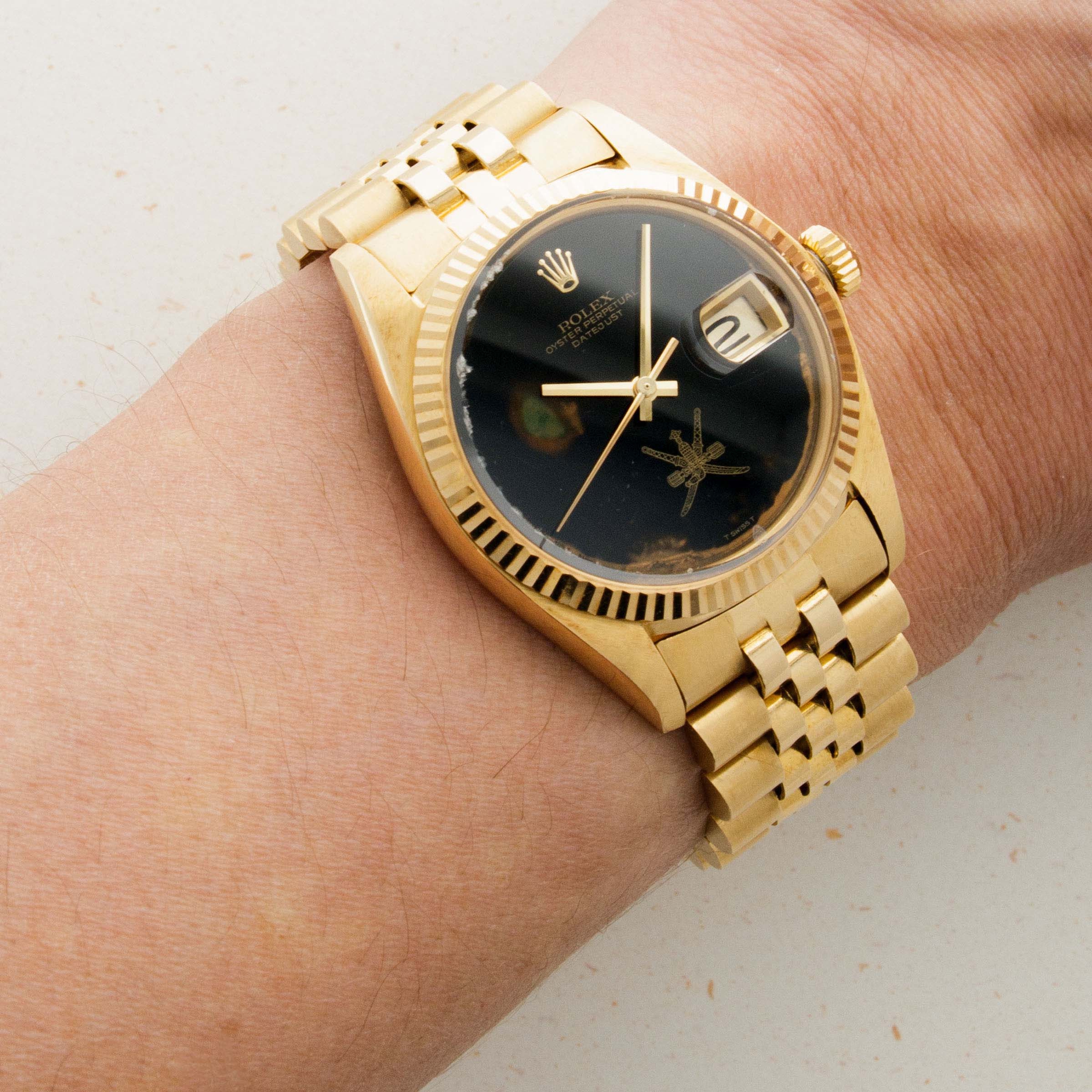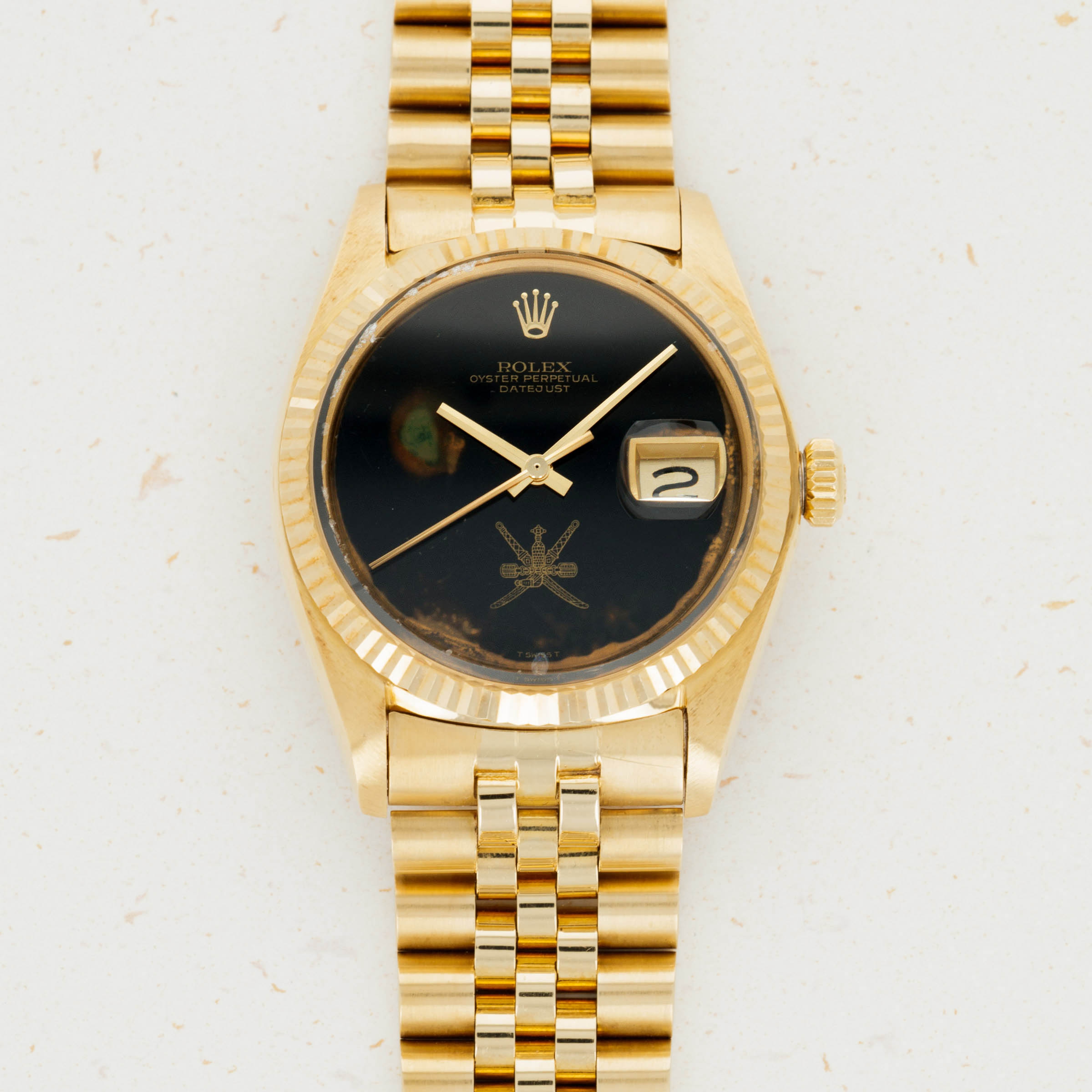 Released to celebrate Rolex's 40th anniversary in 1945, the Rolex Datejust has become one of the Genevan Giant's most iconic watches. The world's first wristwatch to display the date via an aperture on the dial, the Datejust revolutionized wristwatch design for decades to follow. With its emblematic Cyclops lens, jubilee bracelet (designed specifically for the model in 1945), and classy fluted precious metal bezel, the Datejust's aesthetic has always been that of pure elegance and class. Perhaps one of Rolex's most recognizable designs, the Datejust has evolved from its dressier roots into a perfectly capable timepiece rivaling the robustness of most brand's sports watches. Featuring an 18k gold case with a screw-down crown and caseback, the Datejust packs an impressive 100m of water resistance alongside its consistently capable movements and construction that have enabled it to become one of the best-equipped watches for daily wear and tear. Available with several different dial options, in a multitude of materials, and across many styles, the Datejust is an inescapable reflection of its owner, with a model out there to suit pretty much everybody's tastes and preferences. In the same vein, these co-signed special order Royal Family dials are splendid examples of the tastes, preferences and impressive status that those who originally ordered these watches enjoyed. This particular example comes with an interesting set of cufflinks and matching ring, made by the jeweler to royalty, Asprey. The accessories, like the watch come with a fitted Asprey box that also bears the roal Oman Khanjar logo.