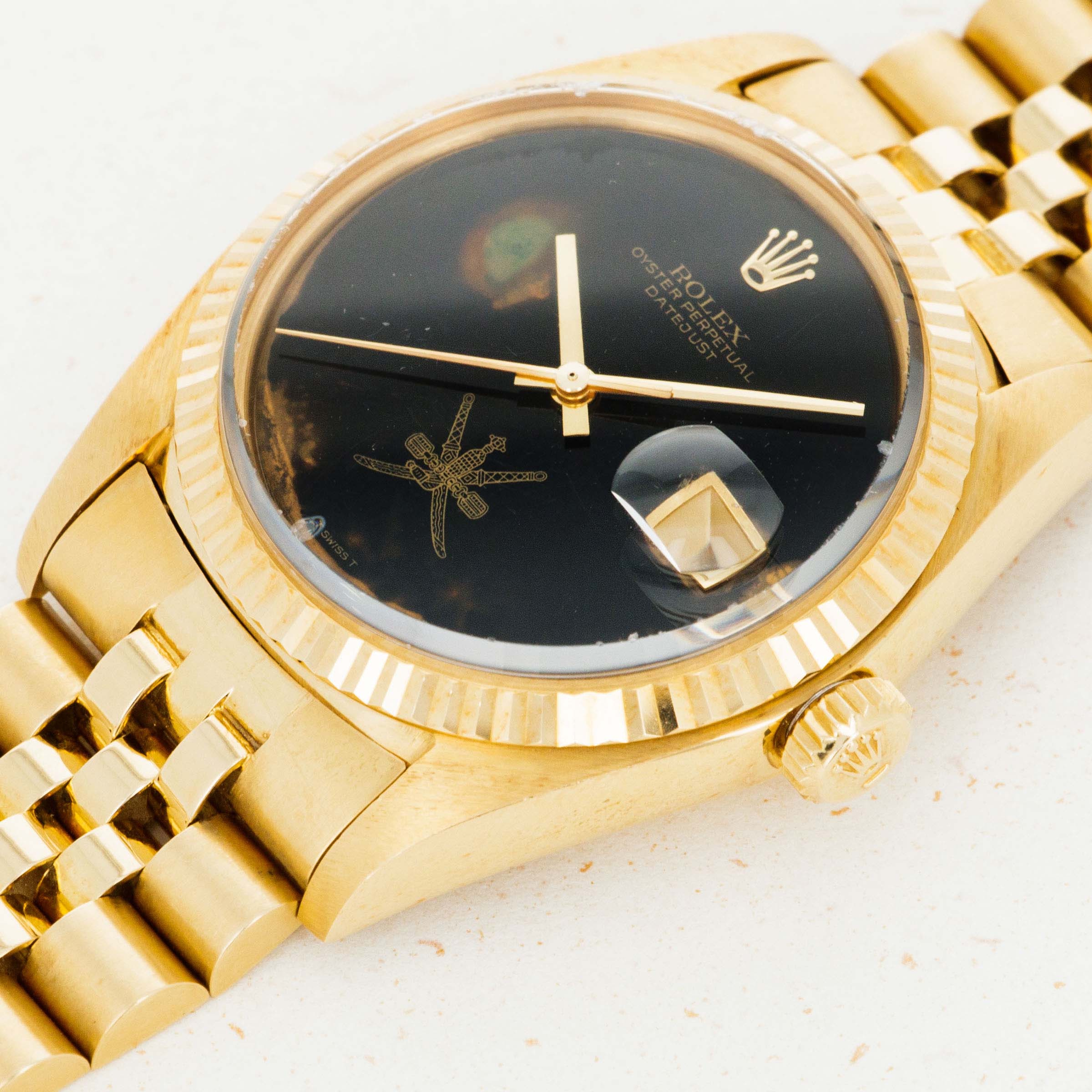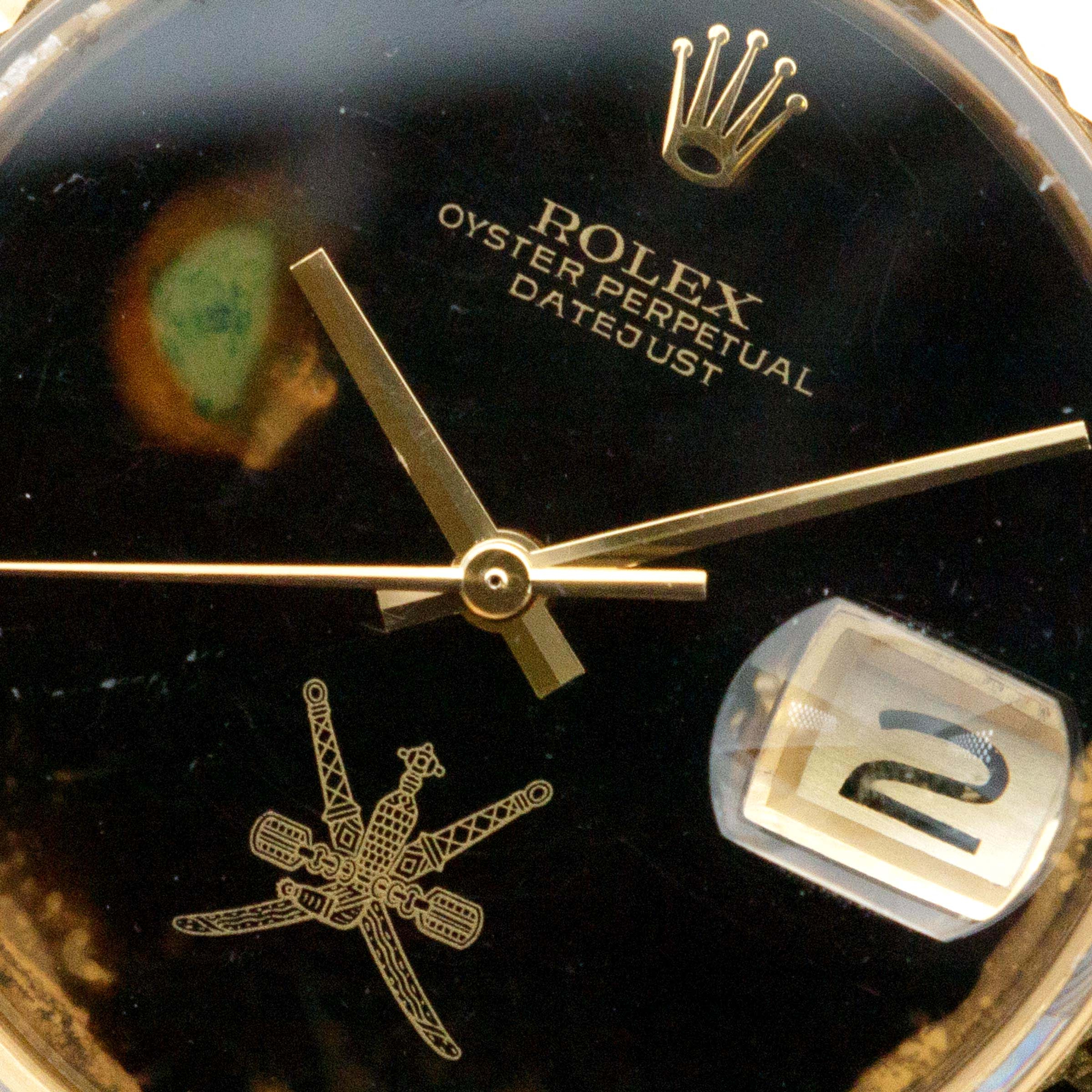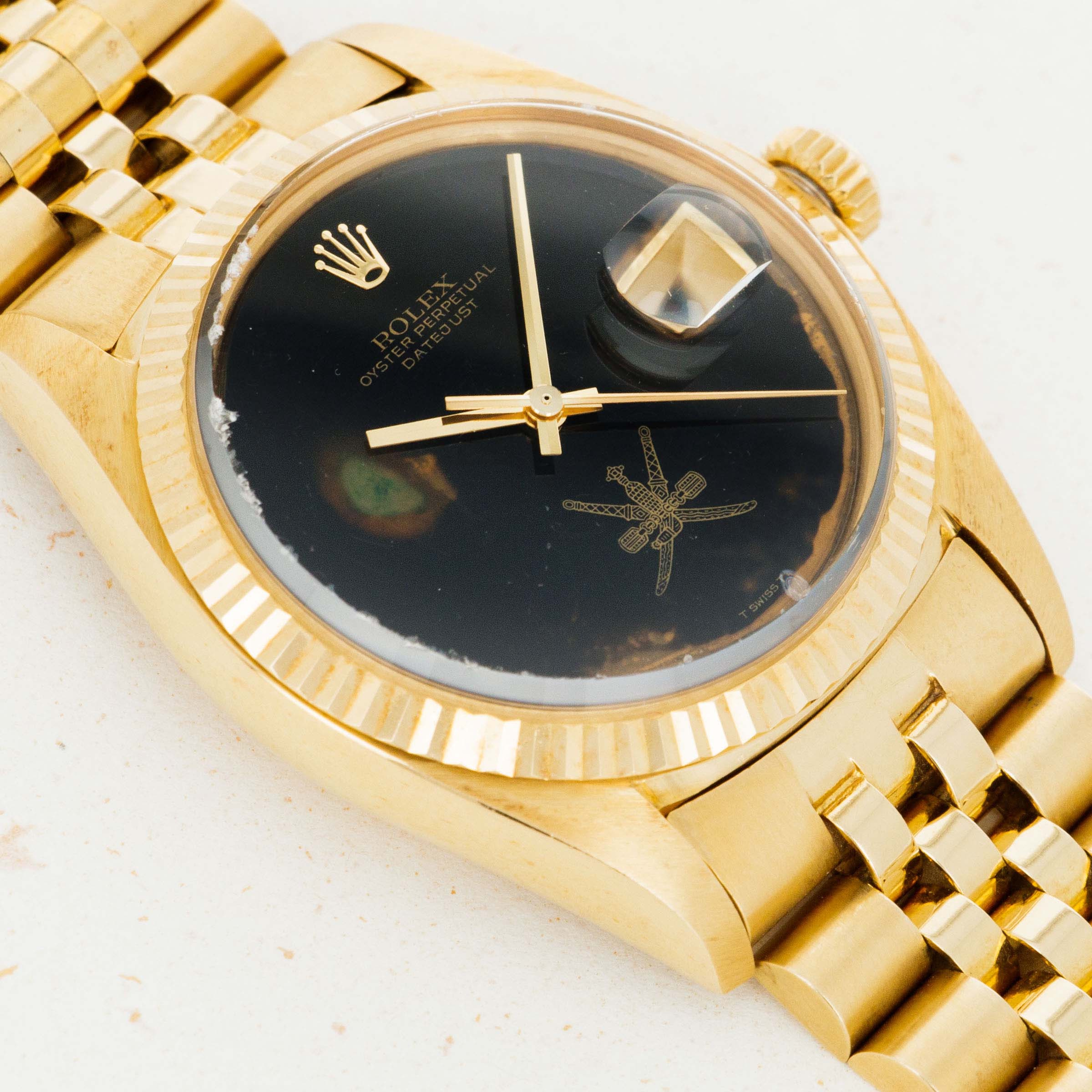 Released to celebrate Rolex's 40th anniversary in 1945, the Rolex Datejust has become one of the Genevan Giant's most iconic watches. The world's first wristwatch to display the date via an aperture on the dial, the Datejust revolutionized wristwatch design for decades to follow. With its emblematic Cyclops lens, jubilee bracelet (designed specifically for the model in 1945), and classy fluted precious metal bezel, the Datejust's aesthetic has always been that of pure elegance and class. Perhaps one of Rolex's most recognizable designs, the Datejust has evolved from its dressier roots into a perfectly capable timepiece rivaling the robustness of most brand's sports watches. Featuring an 18k gold case with a screw-down crown and caseback, the Datejust packs an impressive 100m of water resistance alongside its consistently capable movements and construction that have enabled it to become one of the best-equipped watches for daily wear and tear. Available with several different dial options, in a multitude of materials, and across many styles, the Datejust is an inescapable reflection of its owner, with a model out there to suit pretty much everybody's tastes and preferences. In the same vein, these co-signed special order Royal Family dials are splendid examples of the tastes, preferences and impressive status that those who originally ordered these watches enjoyed. This particular example comes with an interesting set of cufflinks and matching ring, made by the jeweler to royalty, Asprey. The accessories, like the watch come with a fitted Asprey box that also bears the roal Oman Khanjar logo.