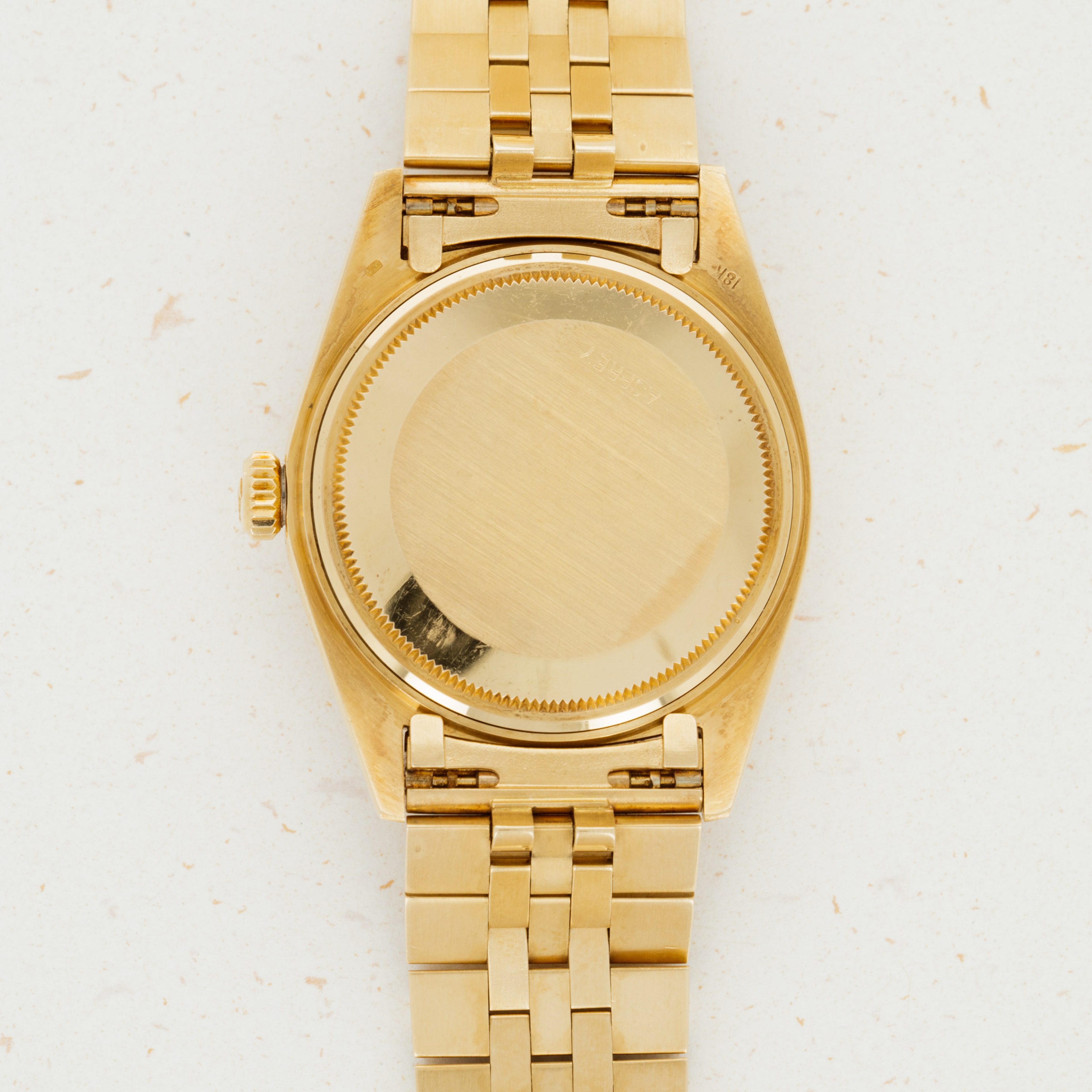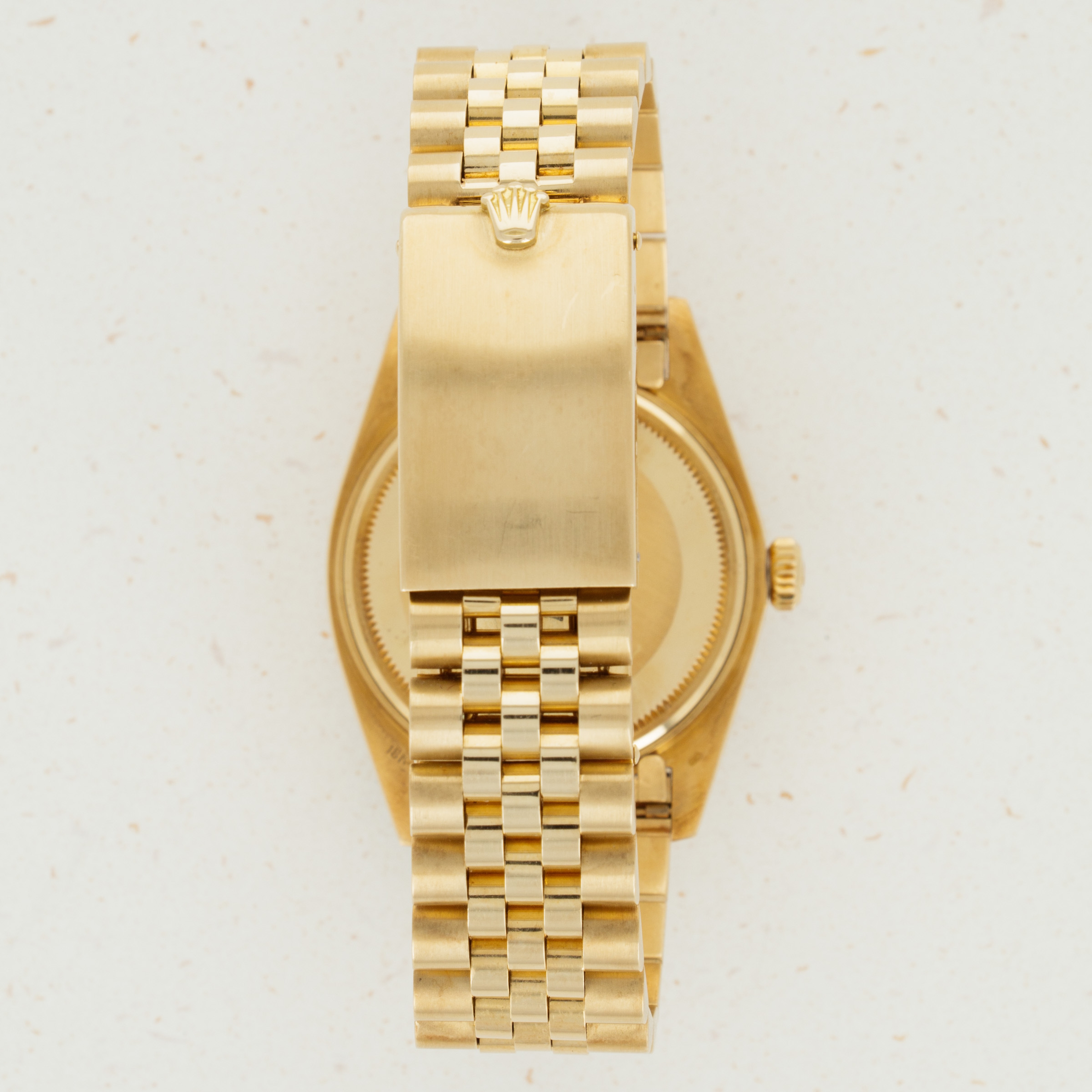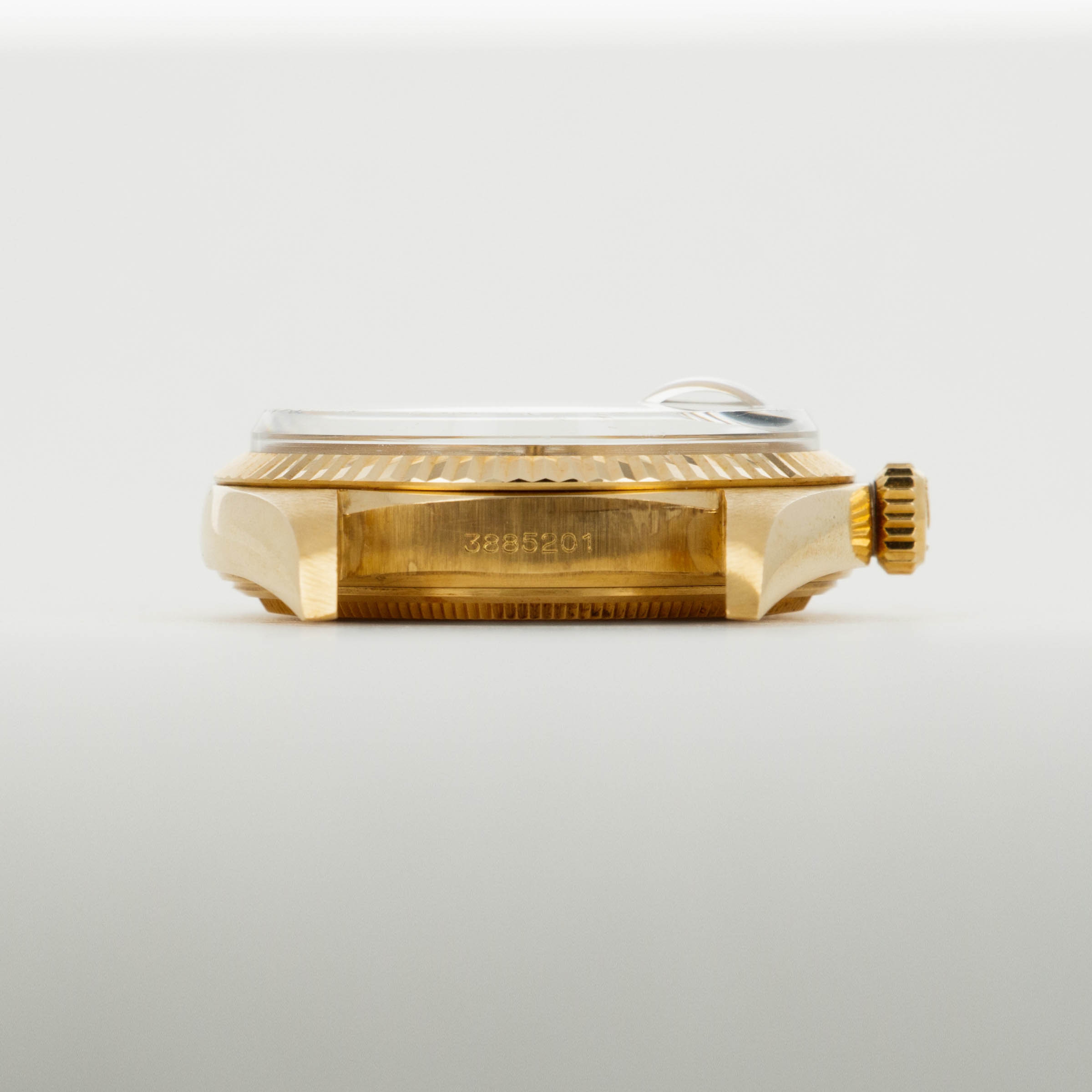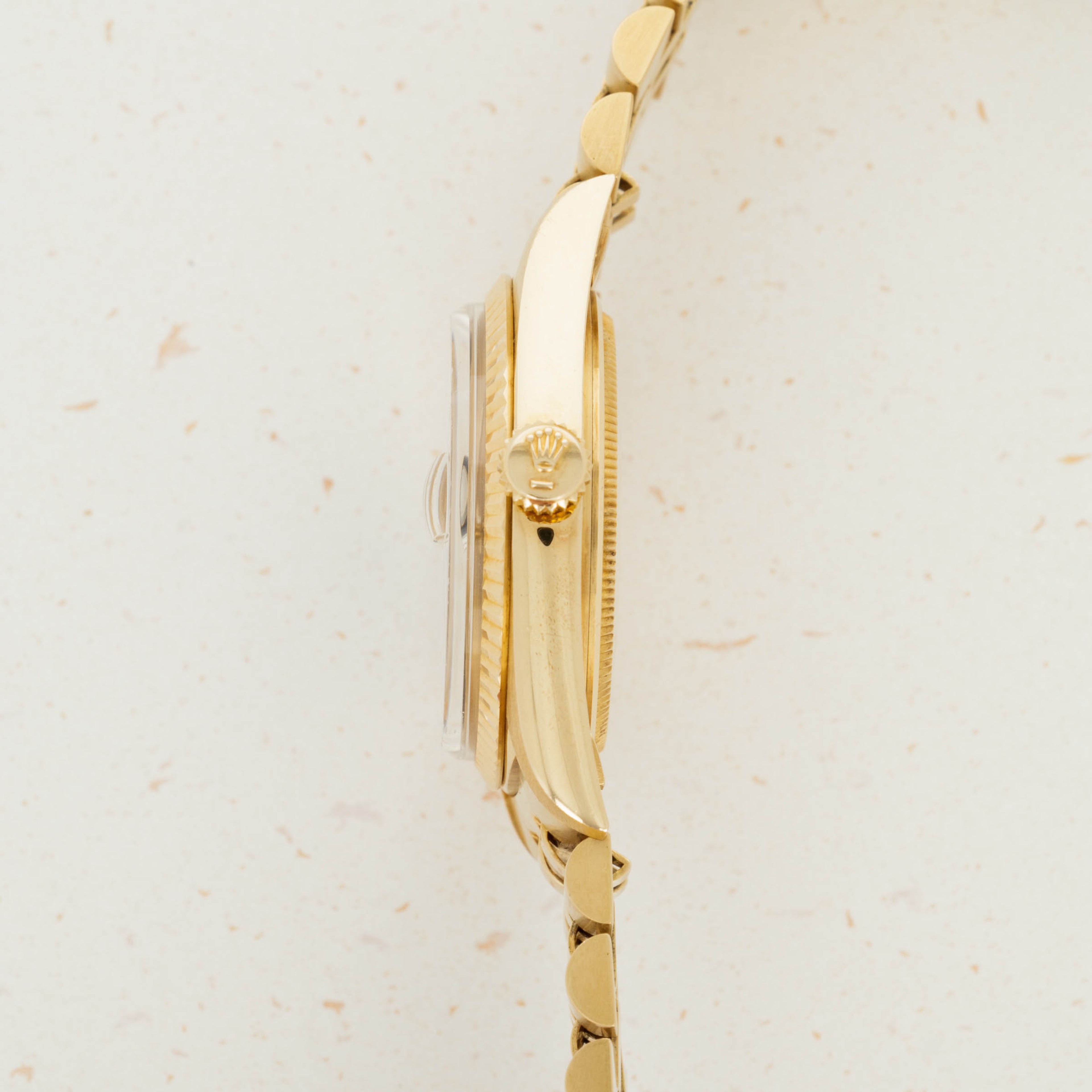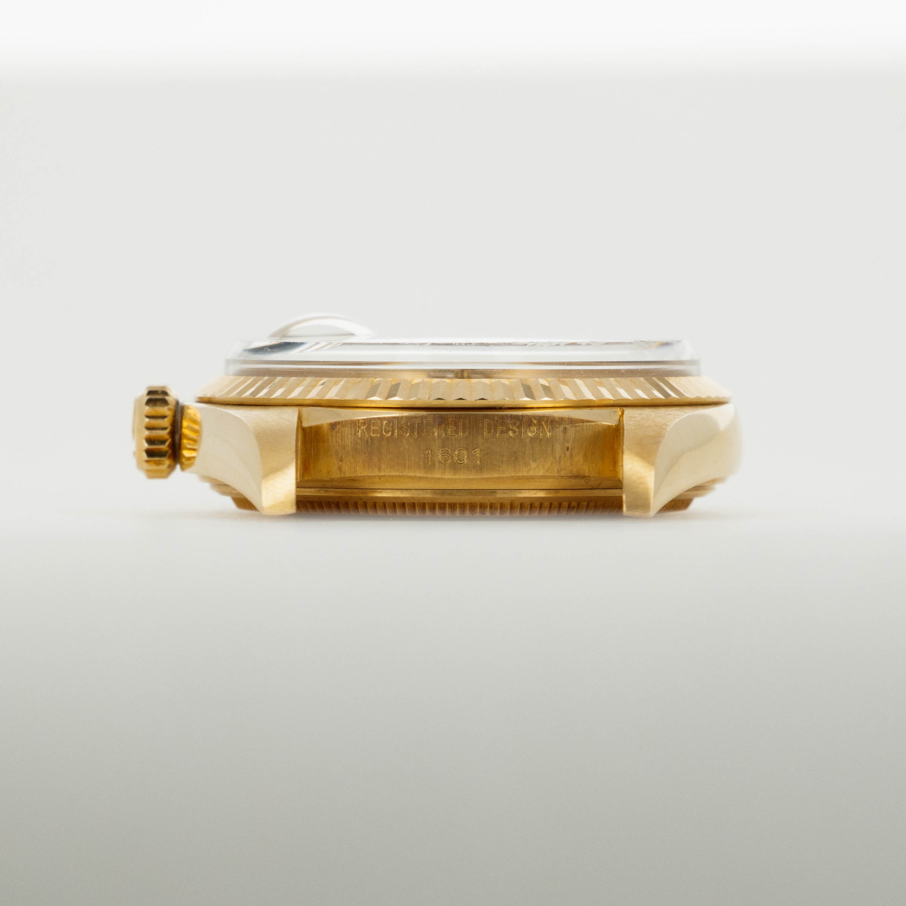 While its dial might feature some rather unique blemishes, this example's 18k yellow gold construction is in impeccable condition, with its fluted bezel, case and bracelet all retaining sharp lines and a warm patina.