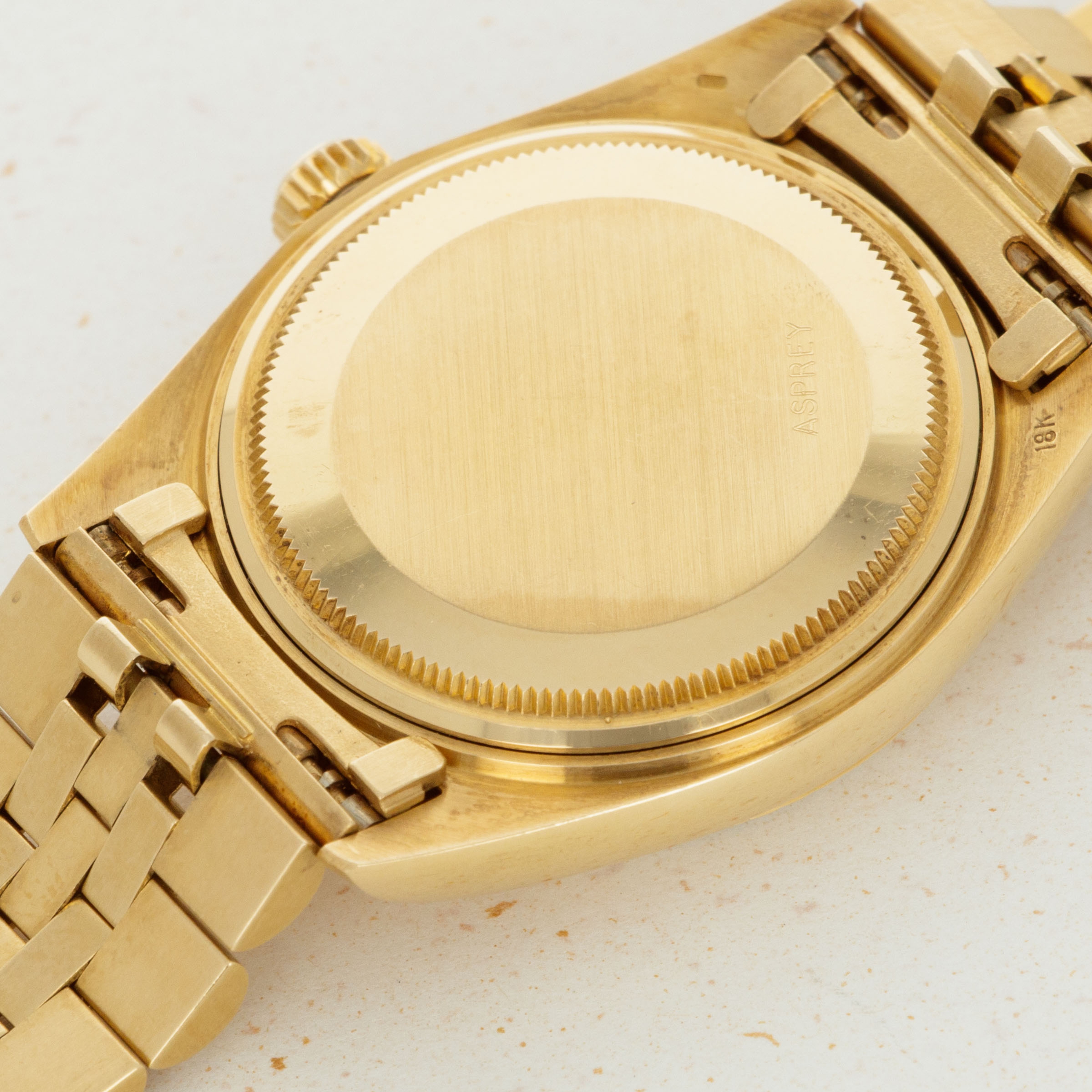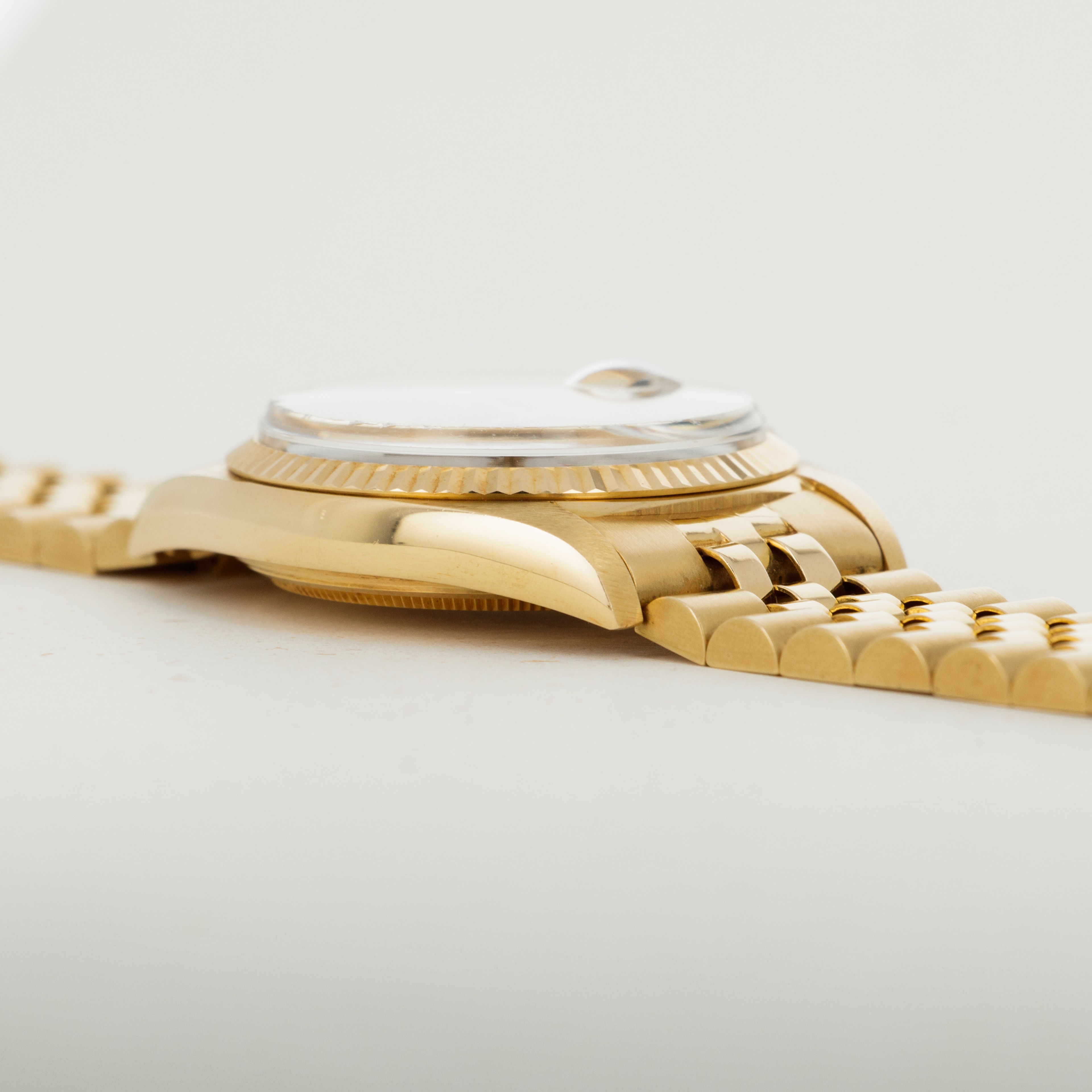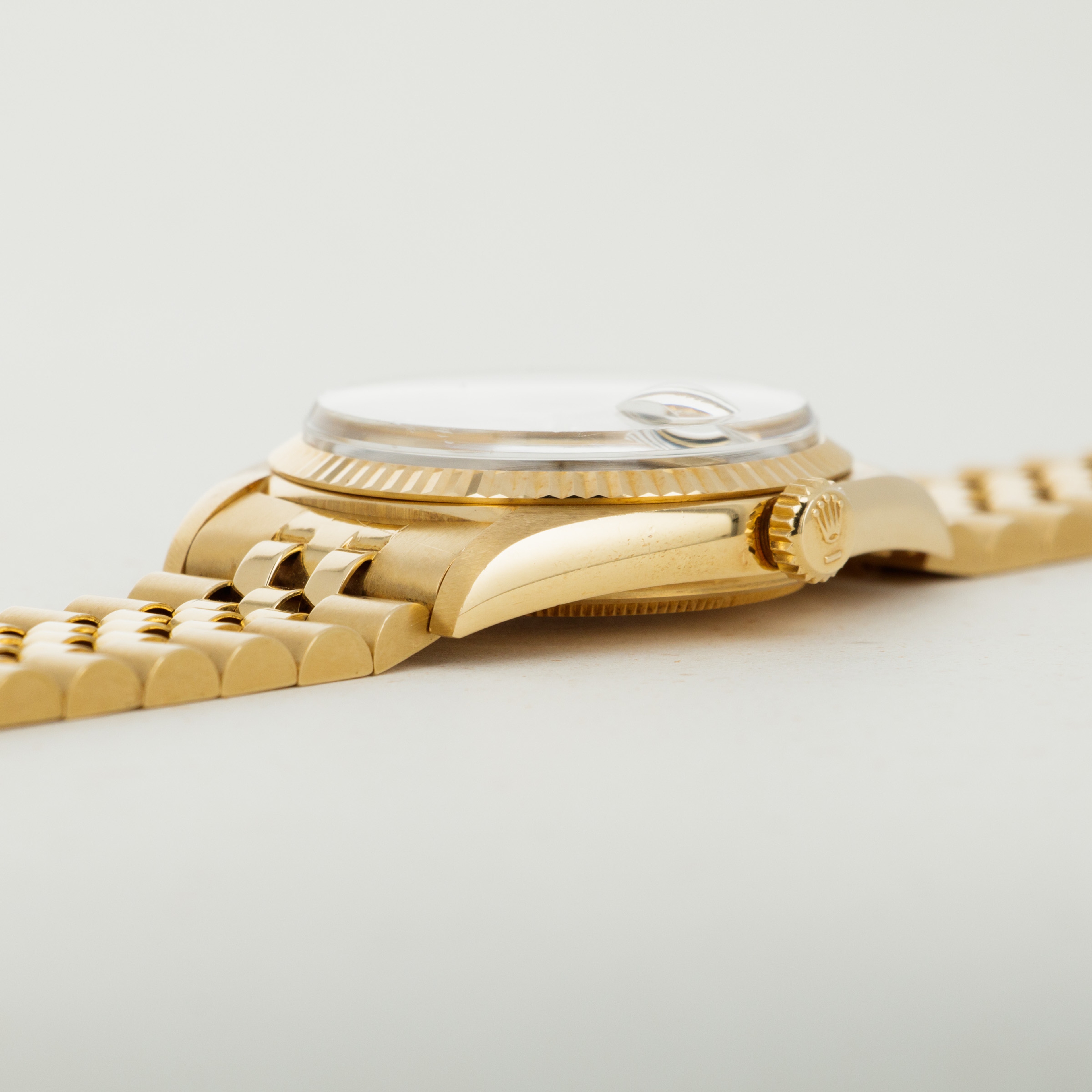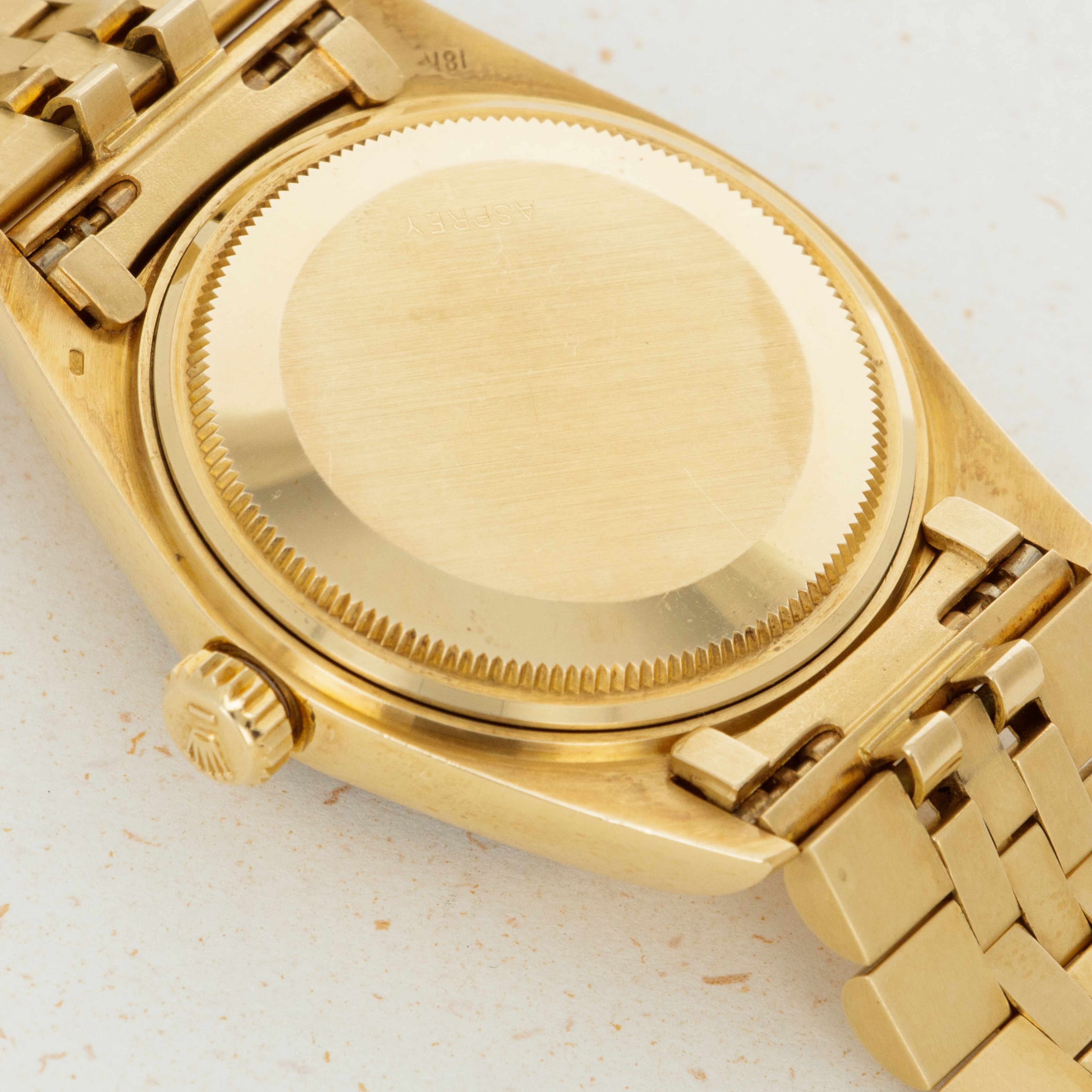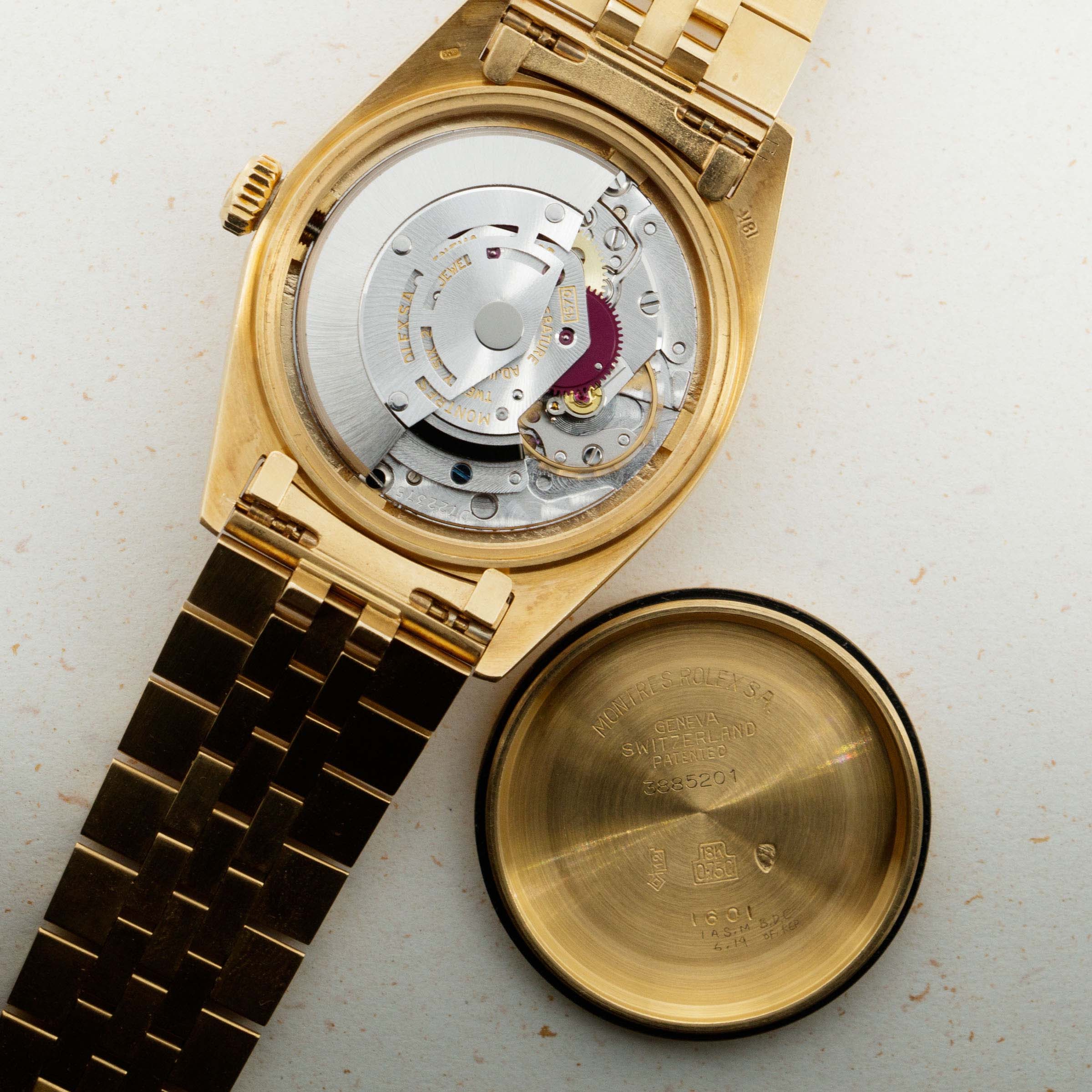 While its dial might feature some rather unique blemishes, this example's 18k yellow gold construction is in impeccable condition, with its fluted bezel, case and bracelet all retaining sharp lines and a warm patina.