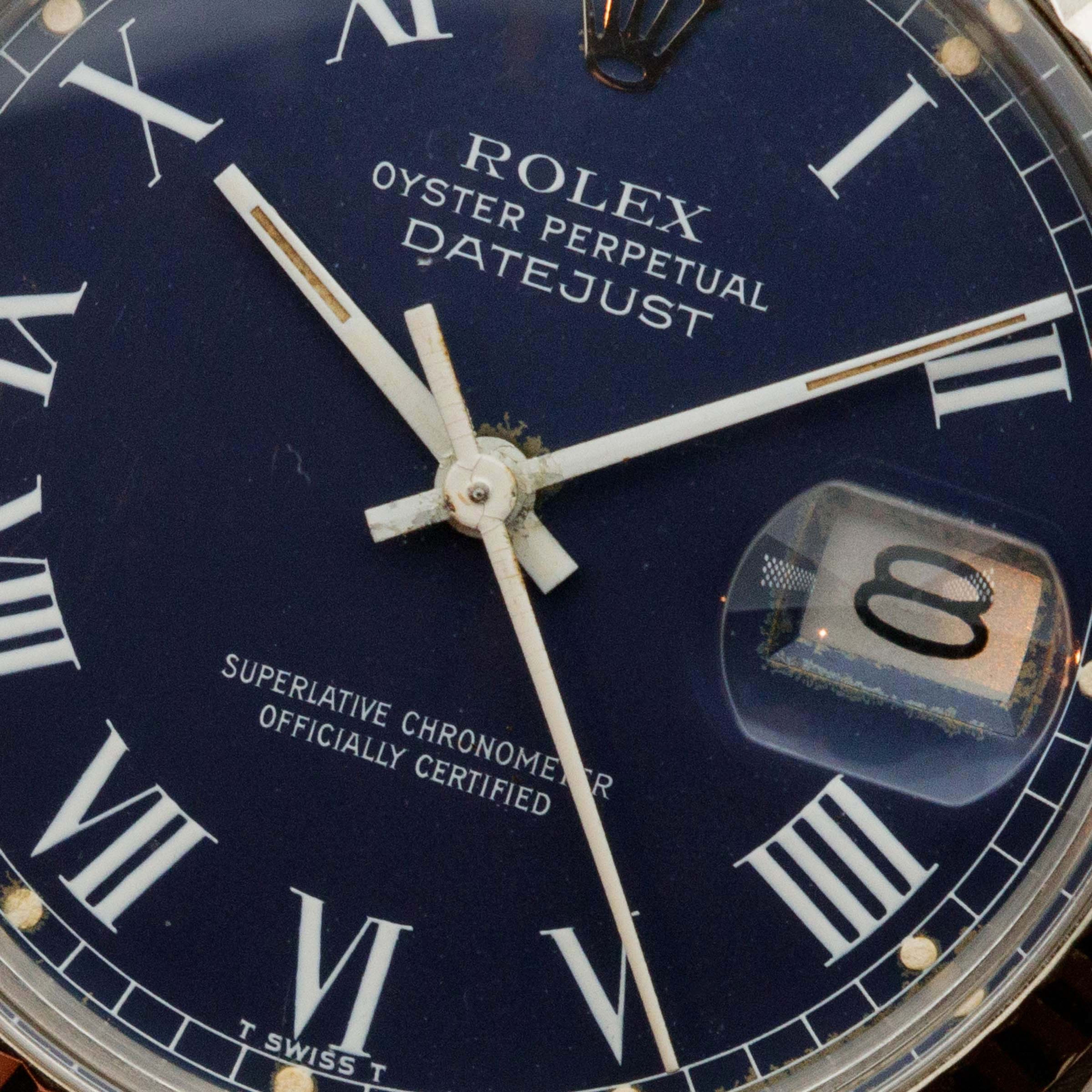 The watch is in overall very good condition. Case is in very good condition, with well porportioned lugs and a sharp 18k gold bezel. There is moderate porosity in the caseback edge as evidenced in the images. Caseback screws on without issue. Blue "Buckley Dial" is in excellent shape with nice lume plots and matching white hands. Light oxidation around date window, center hole and around the lume plots. There are 19 links on the band, with one being removable. There is light stretch.