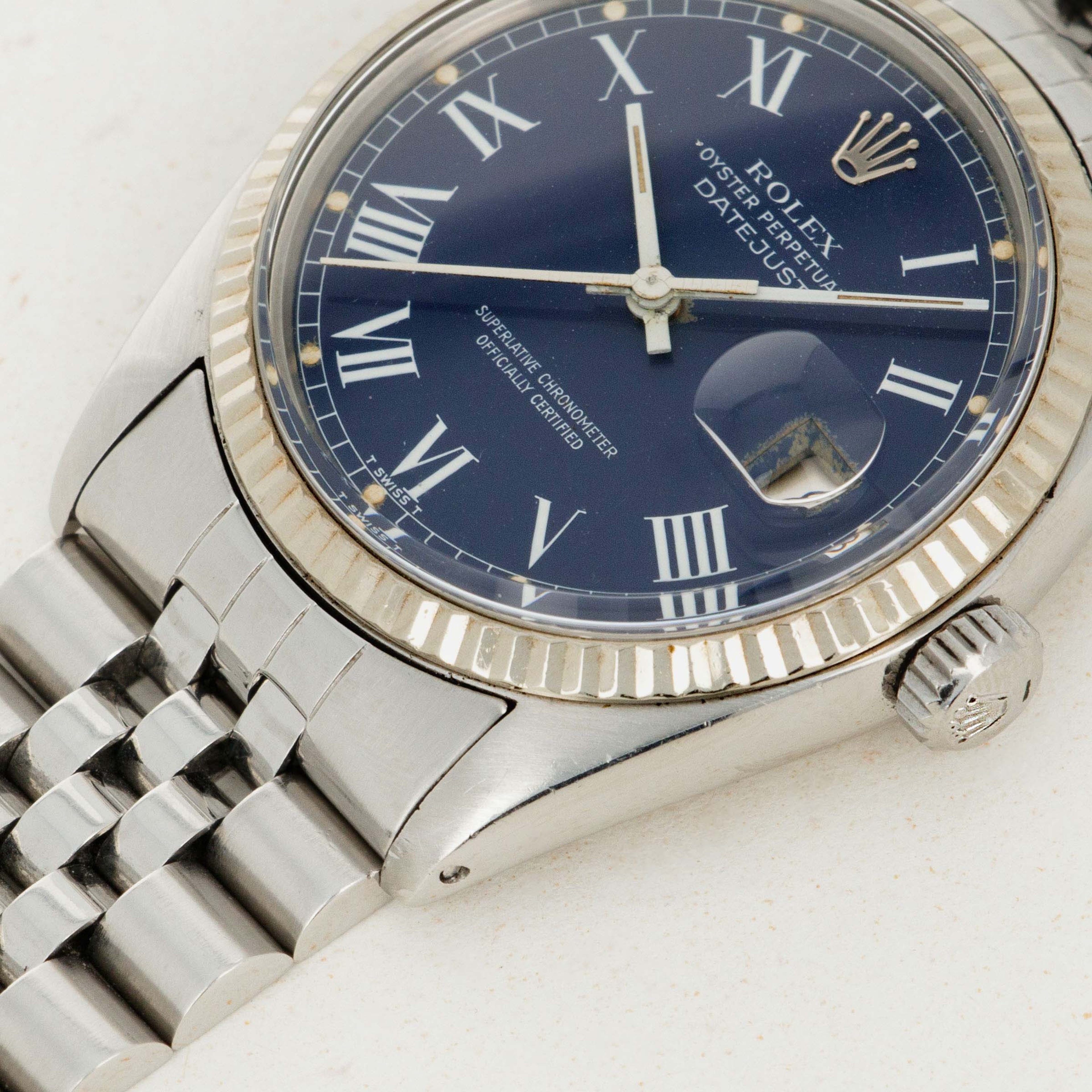Named after famed New York-based vintage watch dealer John Buckley, the Buckley dial is identified by its elegantly-painted Roman numerals. This example is offered with a stunning blue variant of this collector-favorite dial.