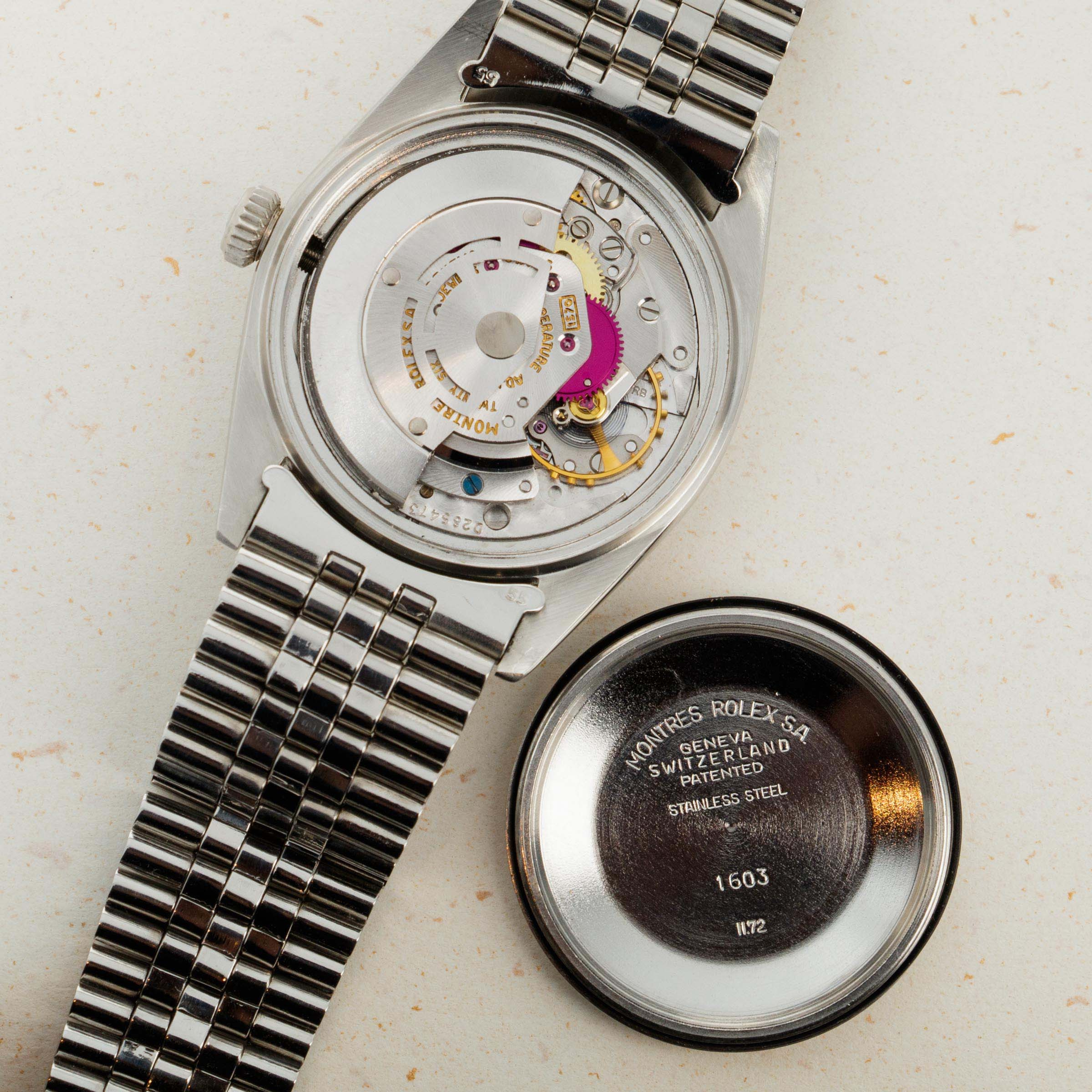 Powered by the cal. 1570, the ref. 1603 Datejust offered here features 48 hours of power reserve and comes with a free-sprung Breguet hairspring and Kif Ultraflex shock absorption system.
