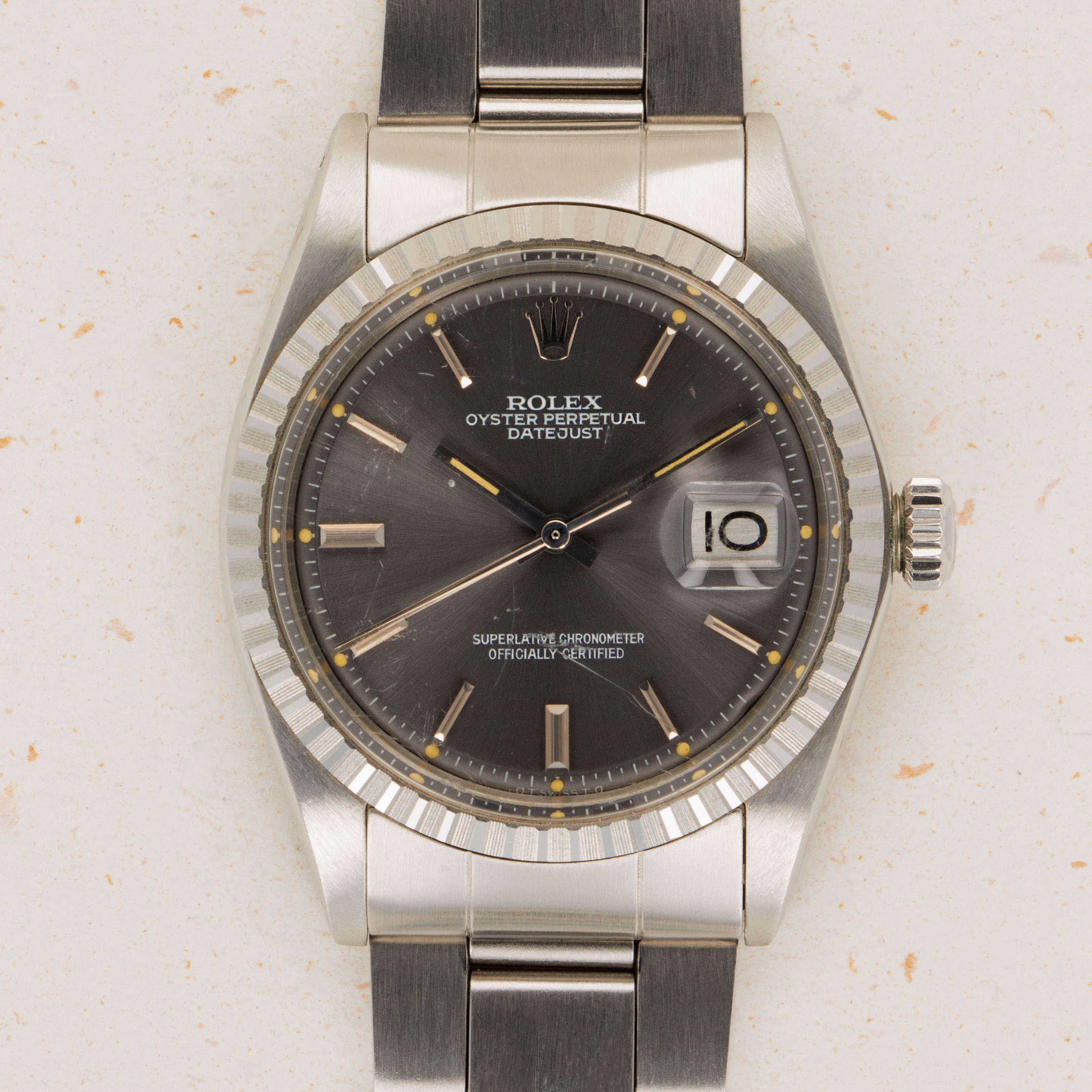 Combining a stainless steel engine-turned bezel with an Oyster bracelet, this example's aesthetic is on the more toolish and understated side than the typical Datejust example with a fluted bezel and Jubilee bracelet combination.