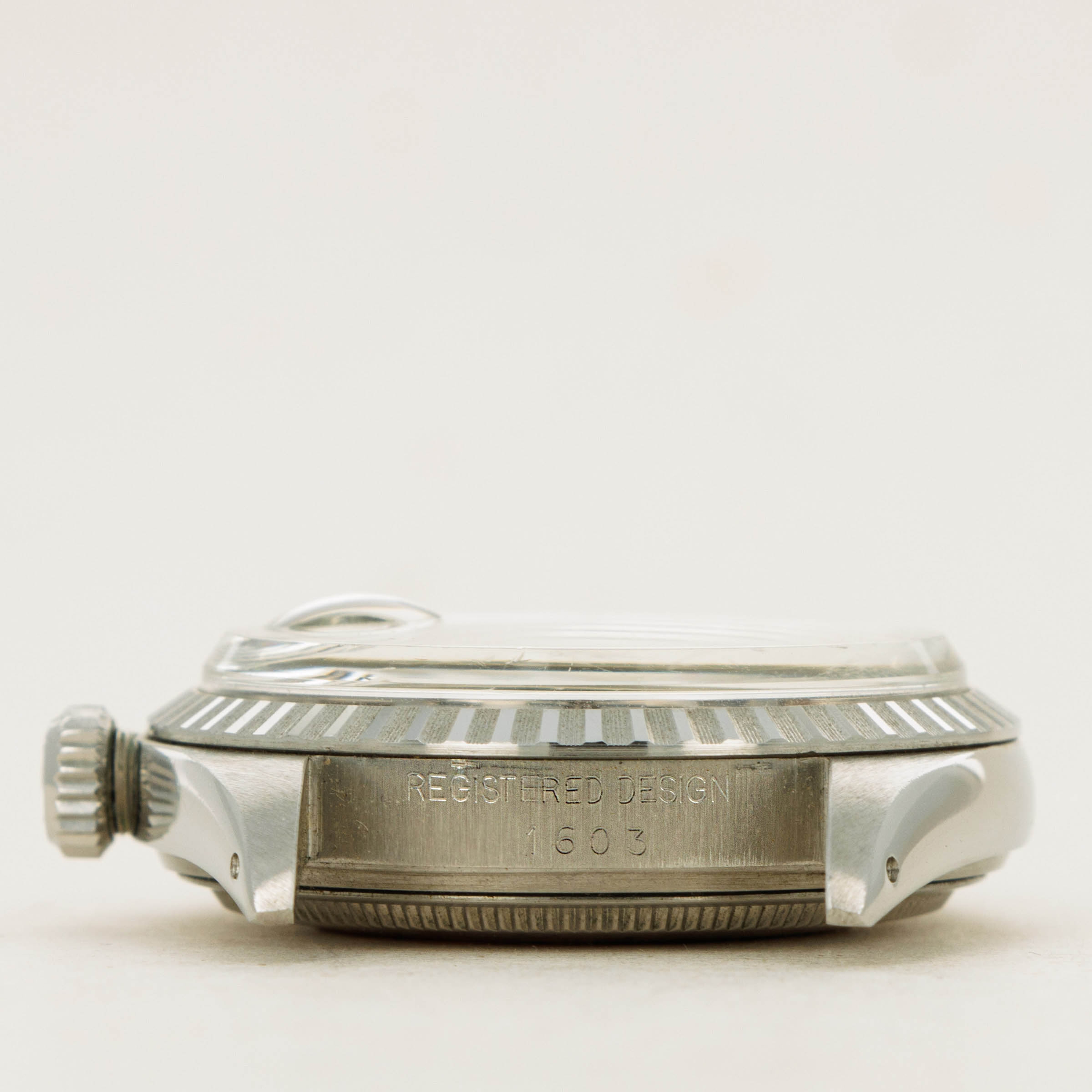 Featuring a stunning grey dial to complement its stainless steel case and engine-turned bezel, this example's aesthetic is understated and appealing with its monochromatic color scheme.