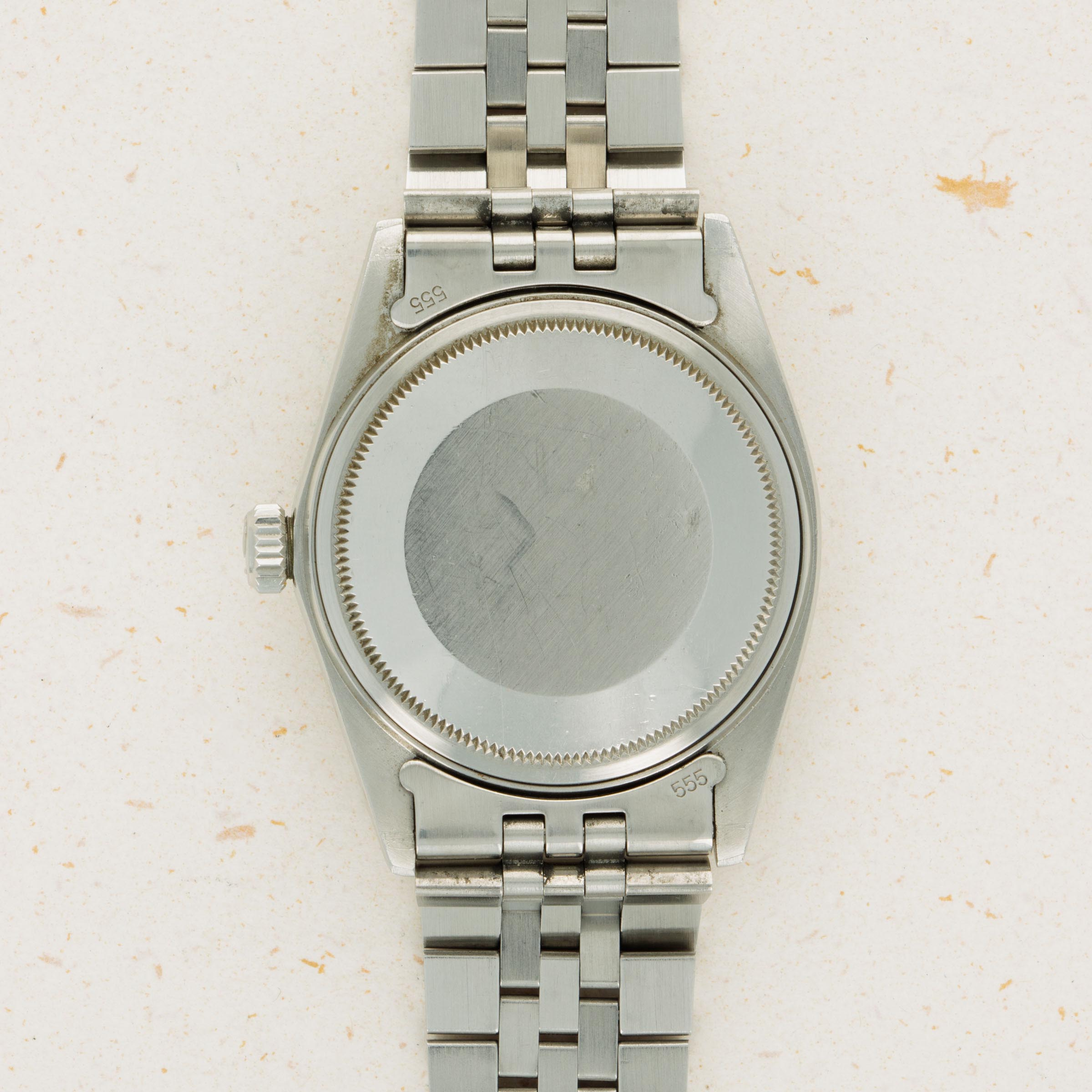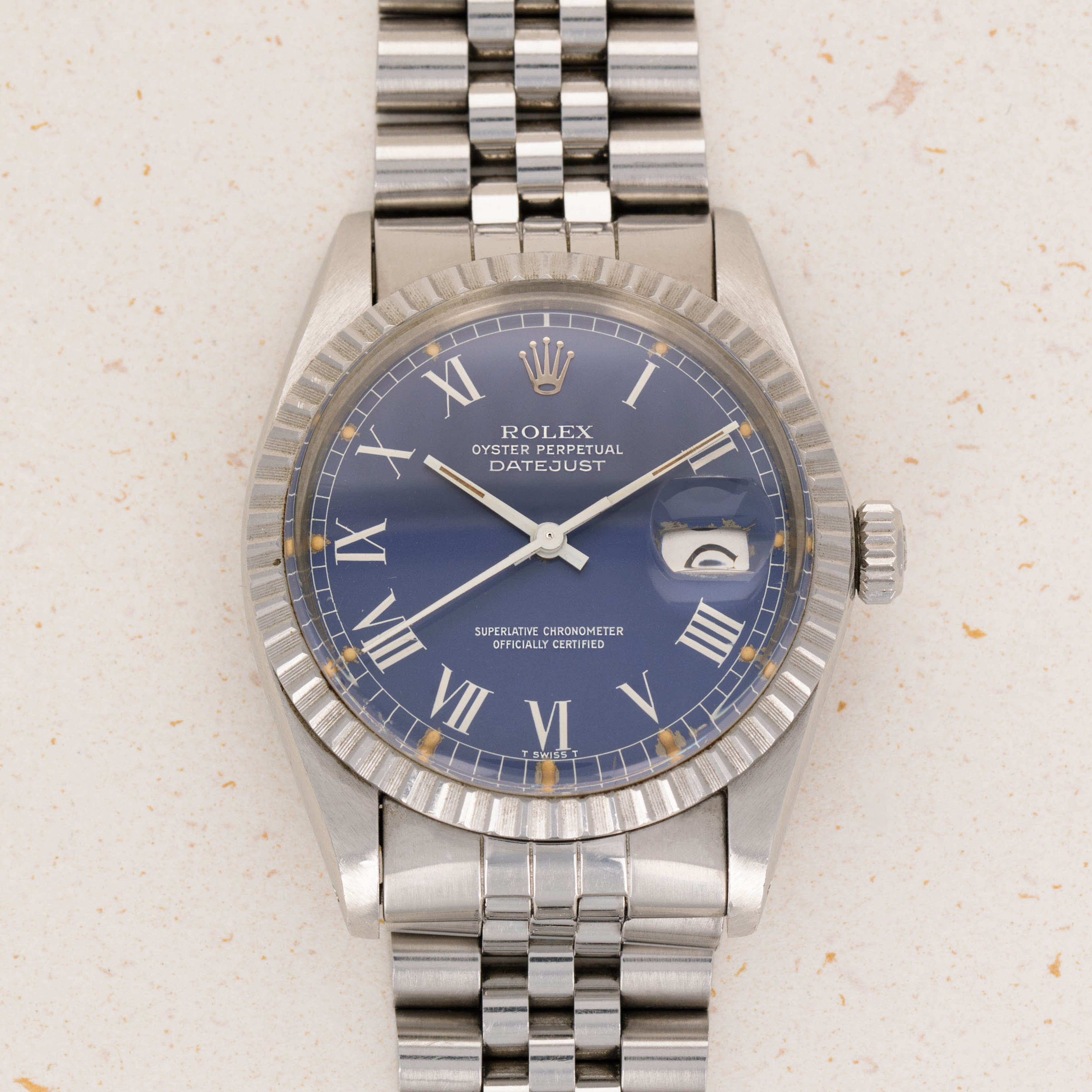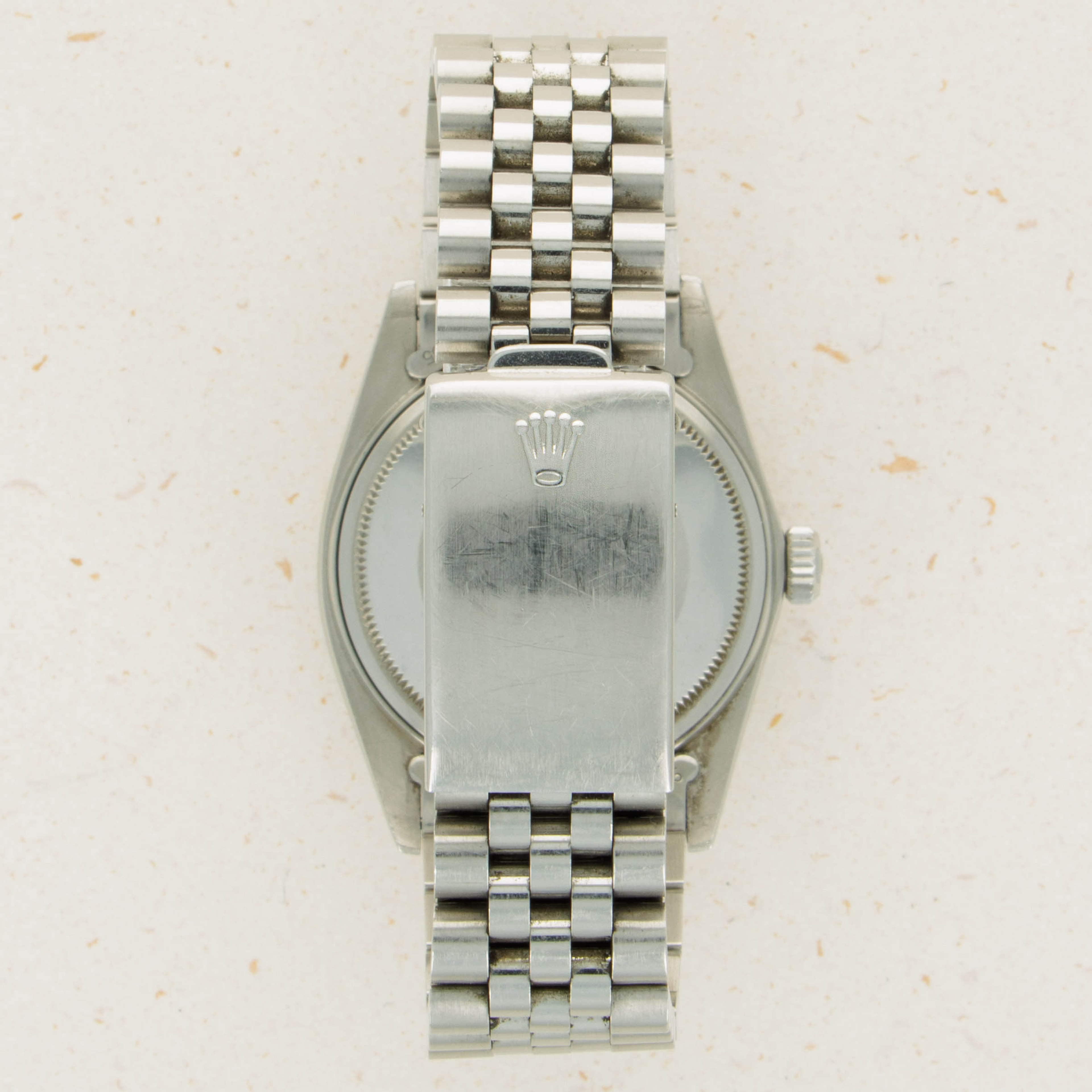 Featuring an entirely stainless steel construction, this example sports the Datejust's iconic Jubilee bracelet and the since-discontinued stainless steel engine-turned bezel.