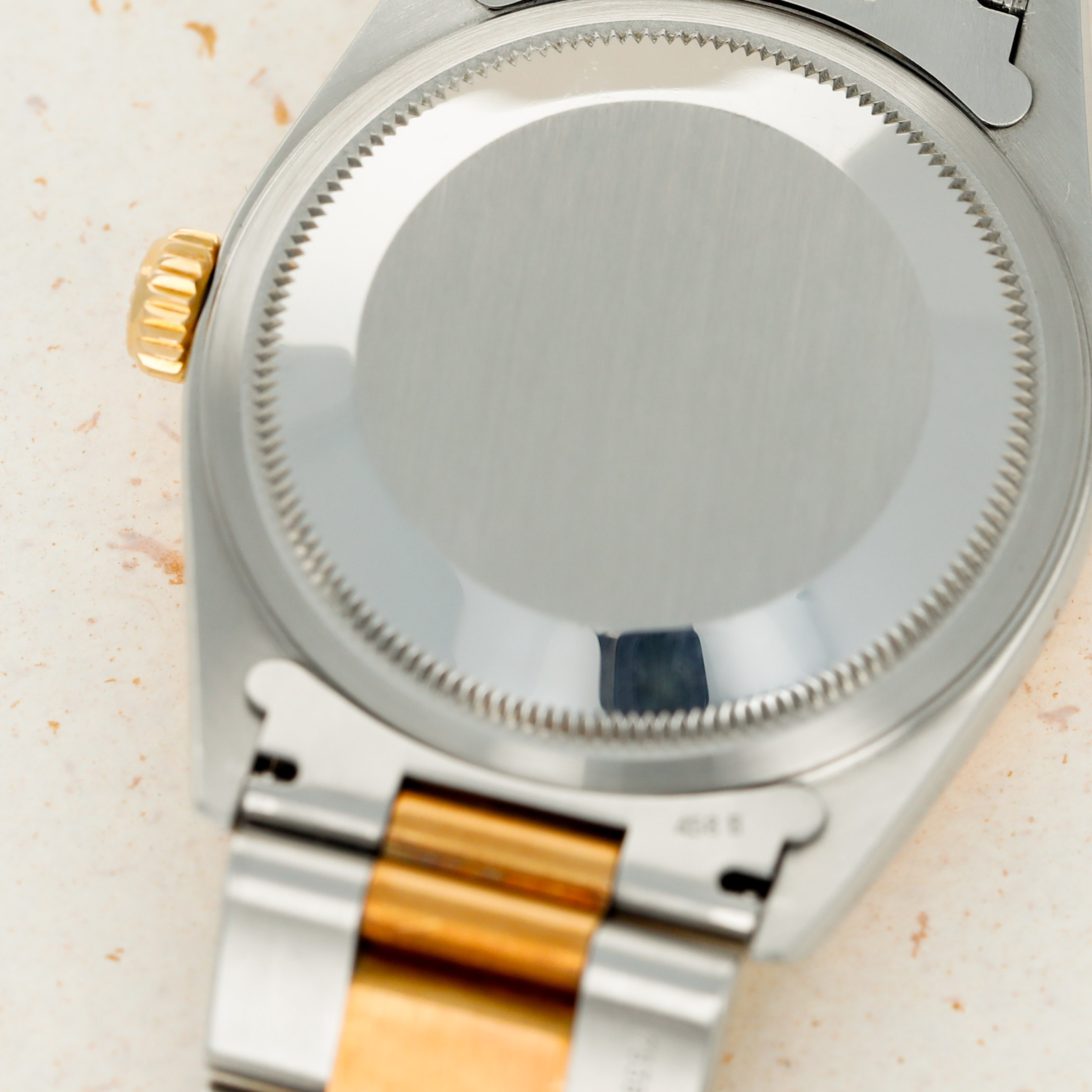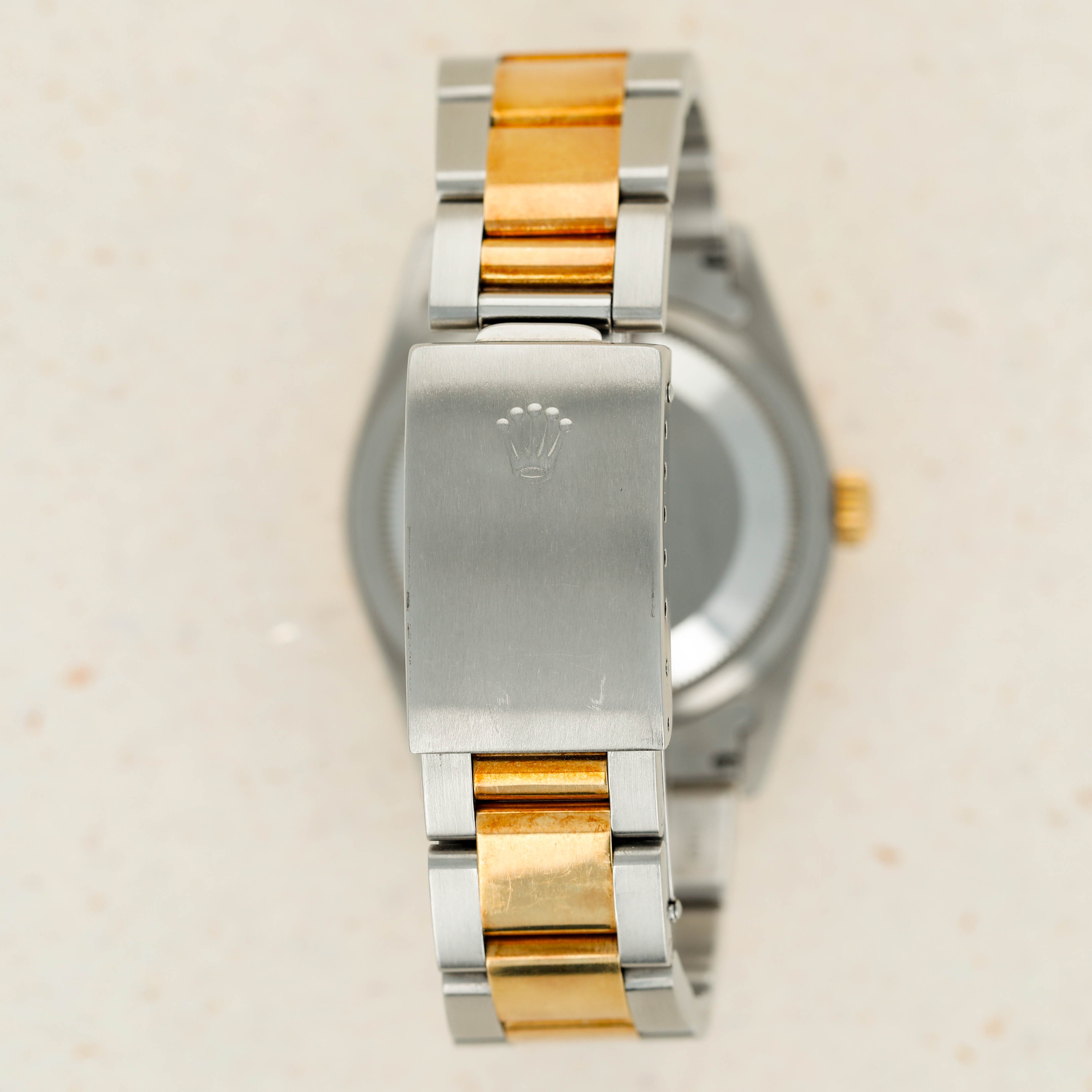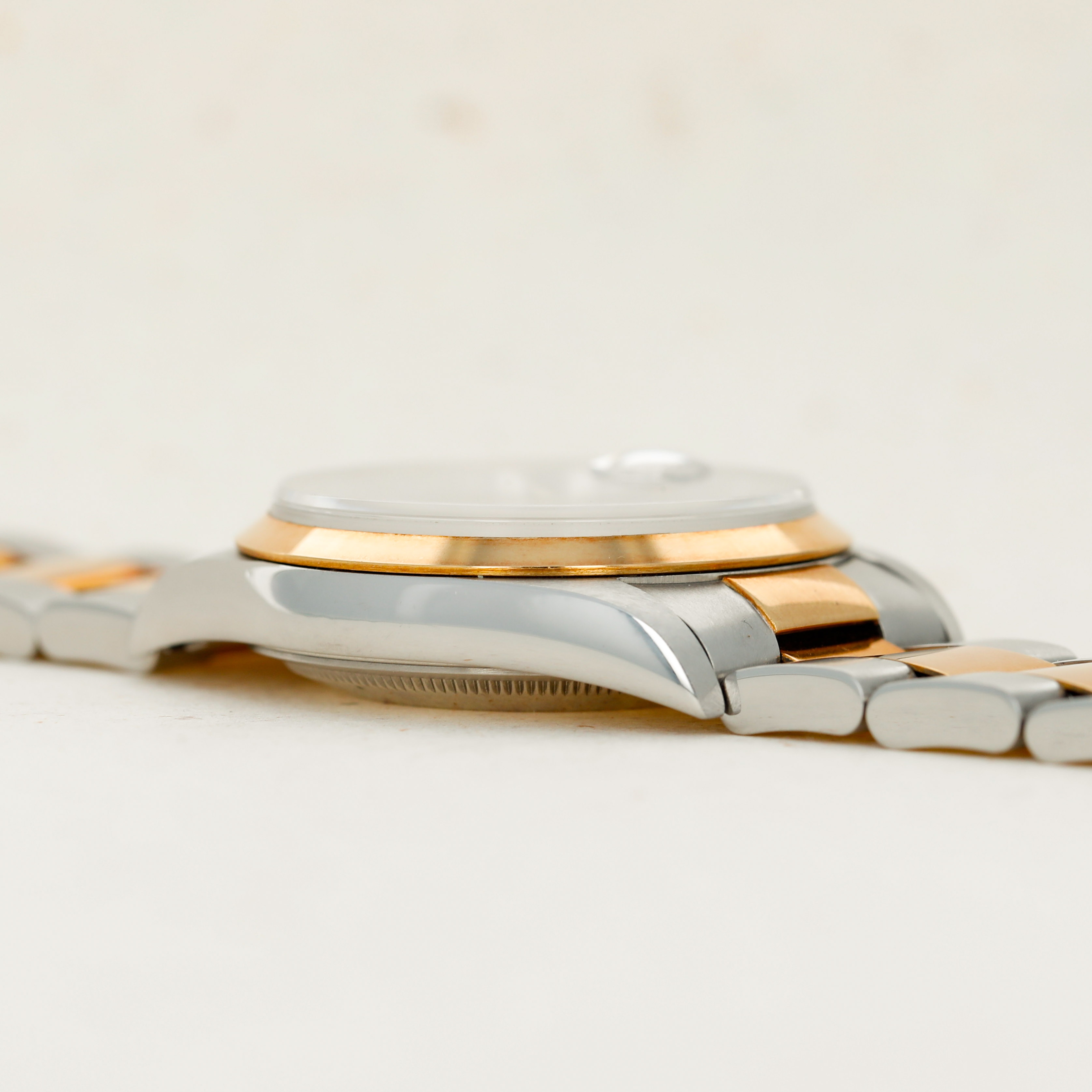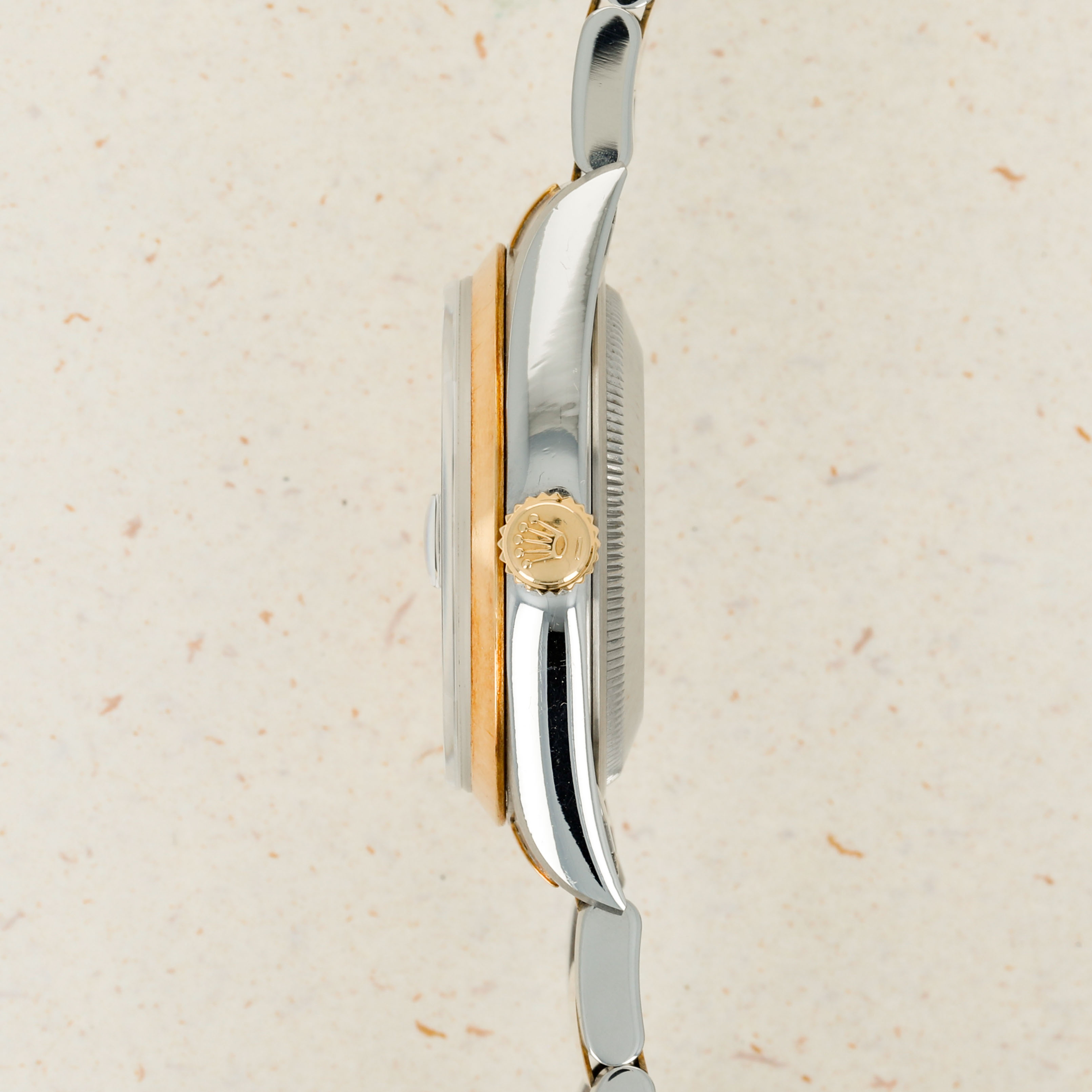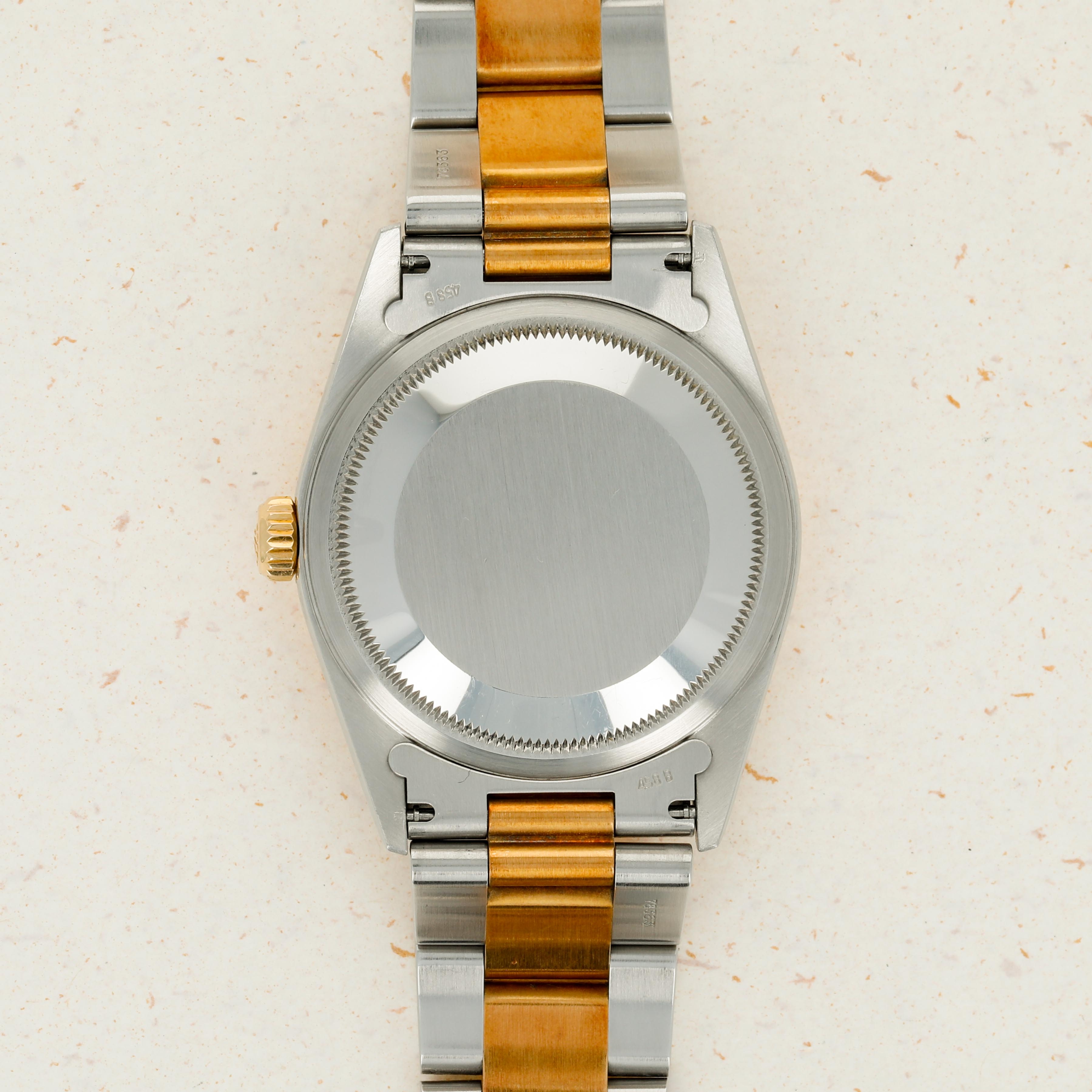 Offered on the harmonious pairing of Rolex's Oyster bracelet and a flat bezel, this example's two-tone construction has ample opportunity to showcase the rich patina that its golden parts have developed.