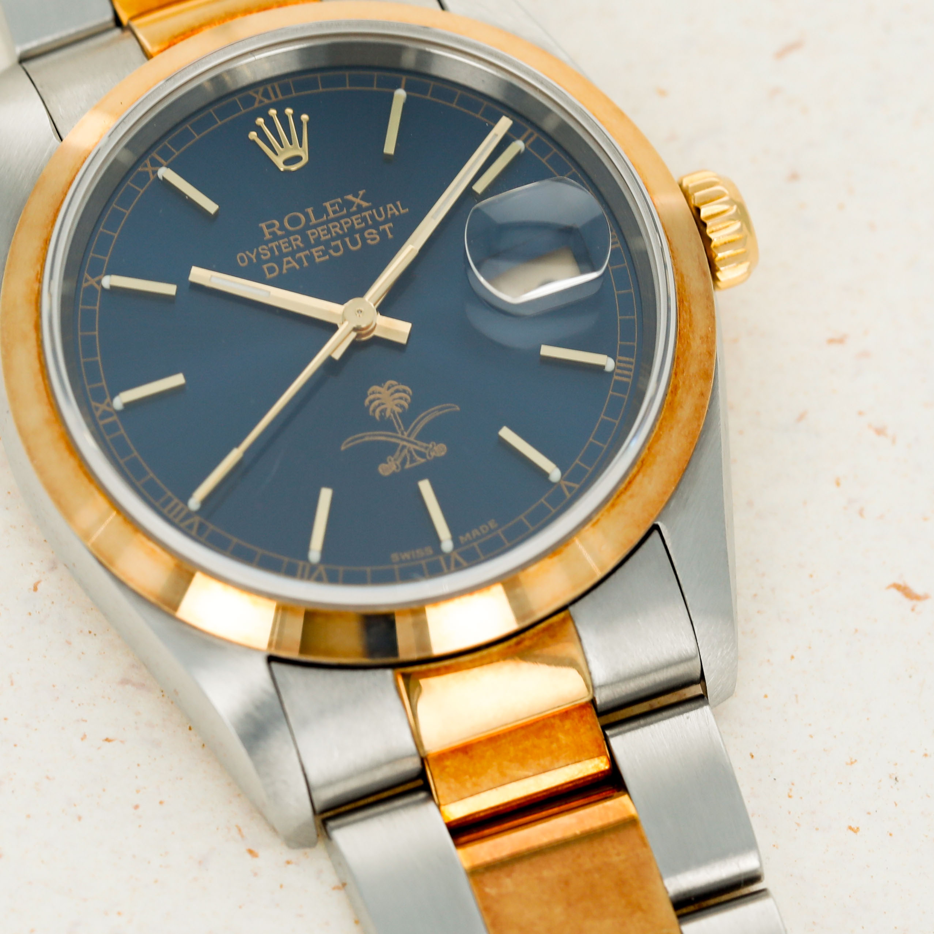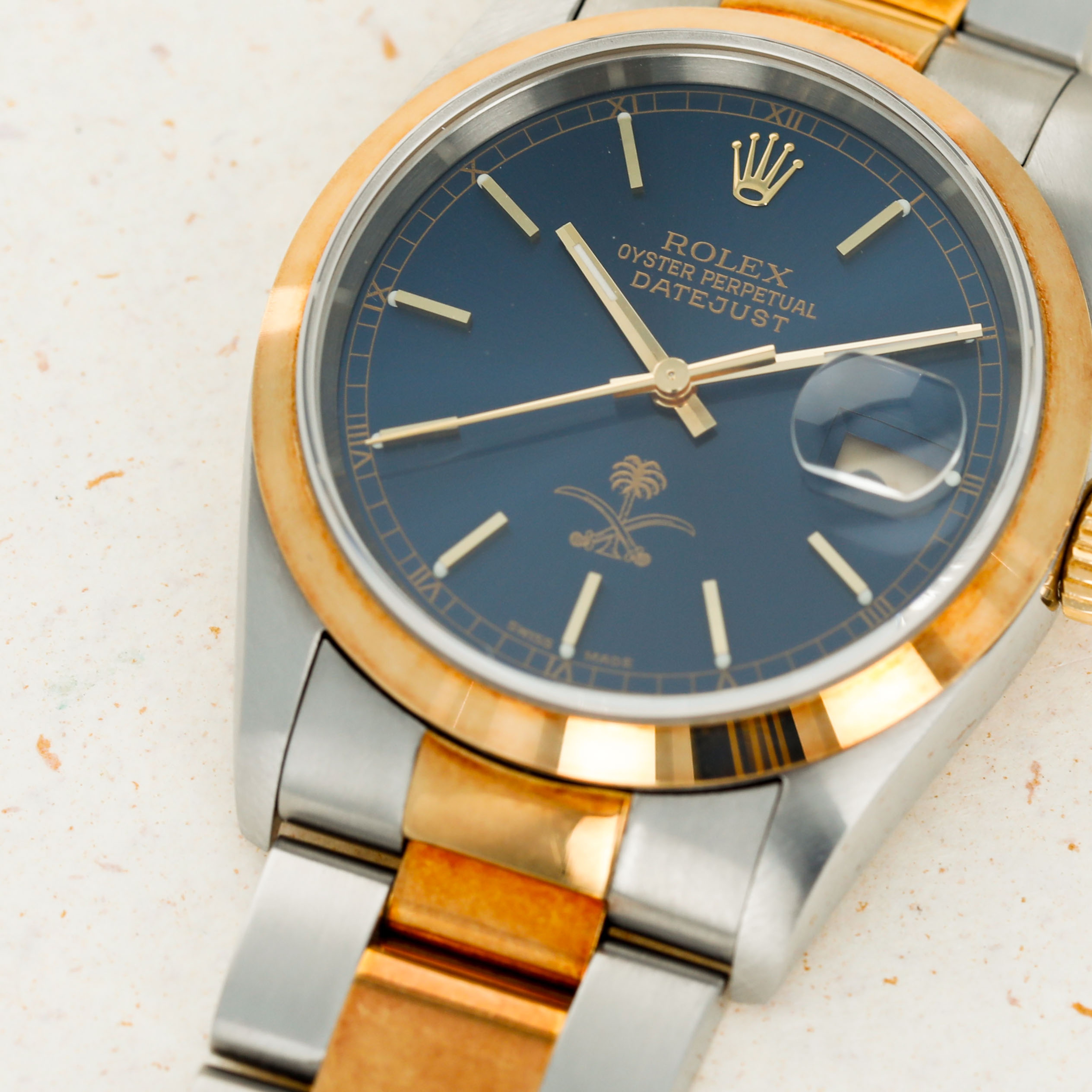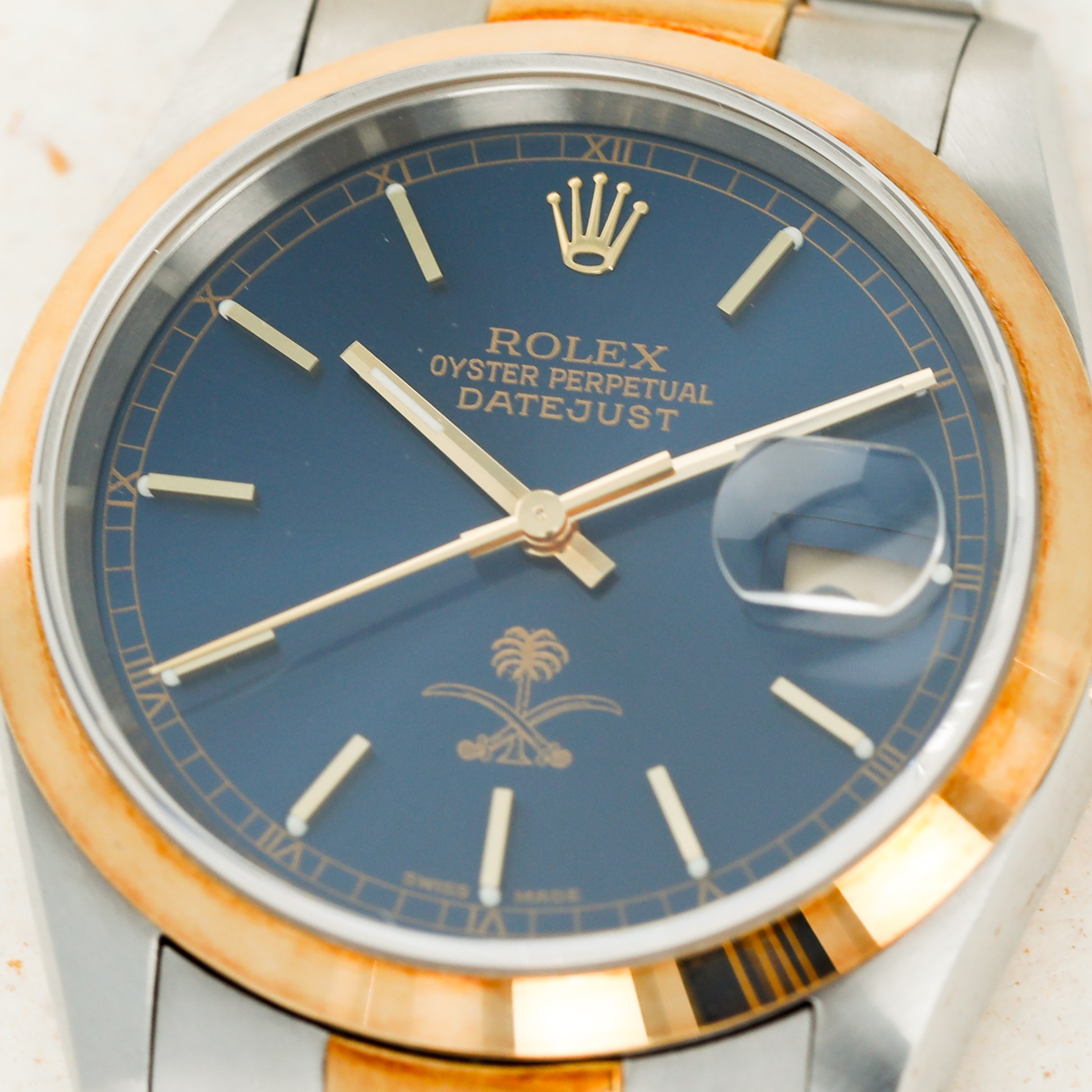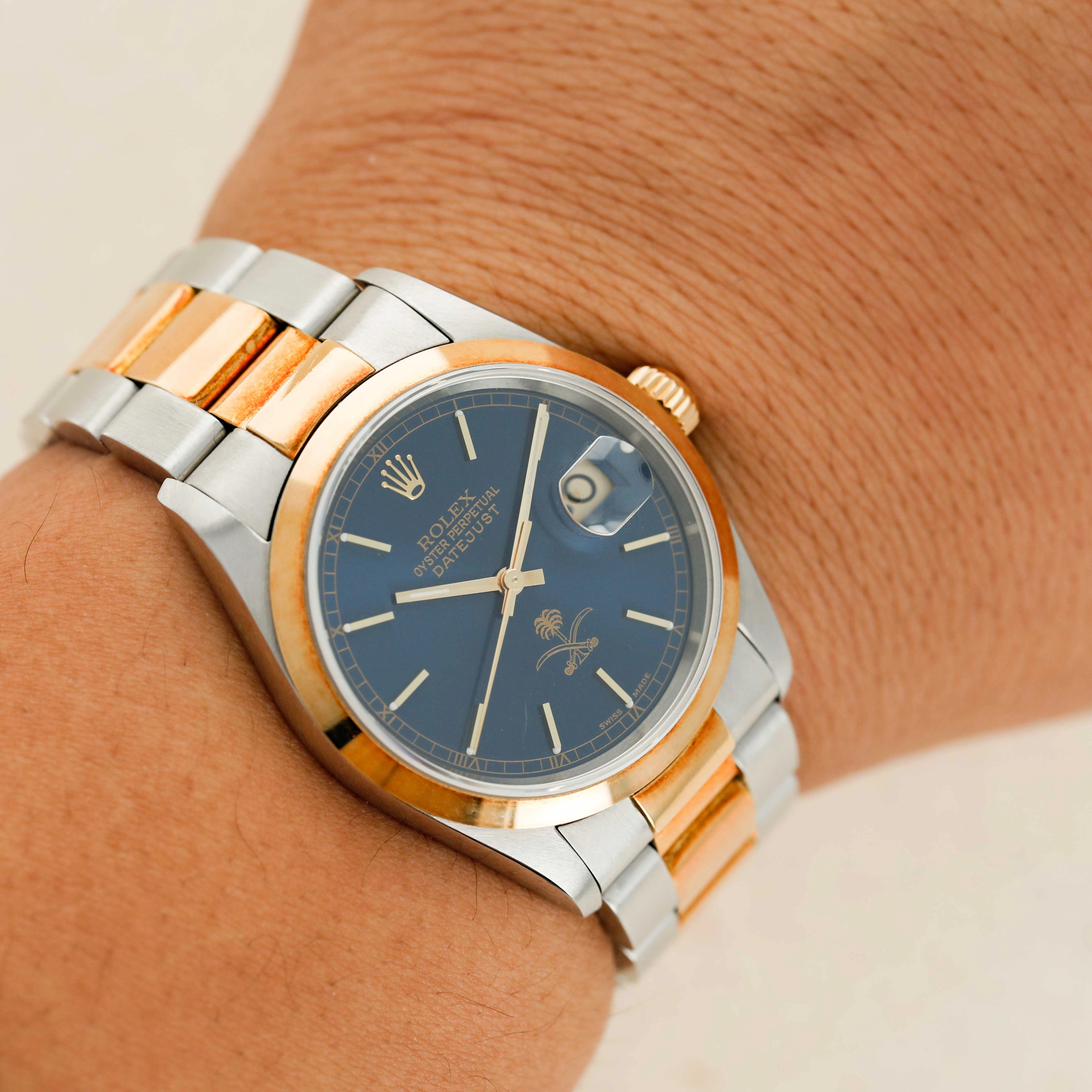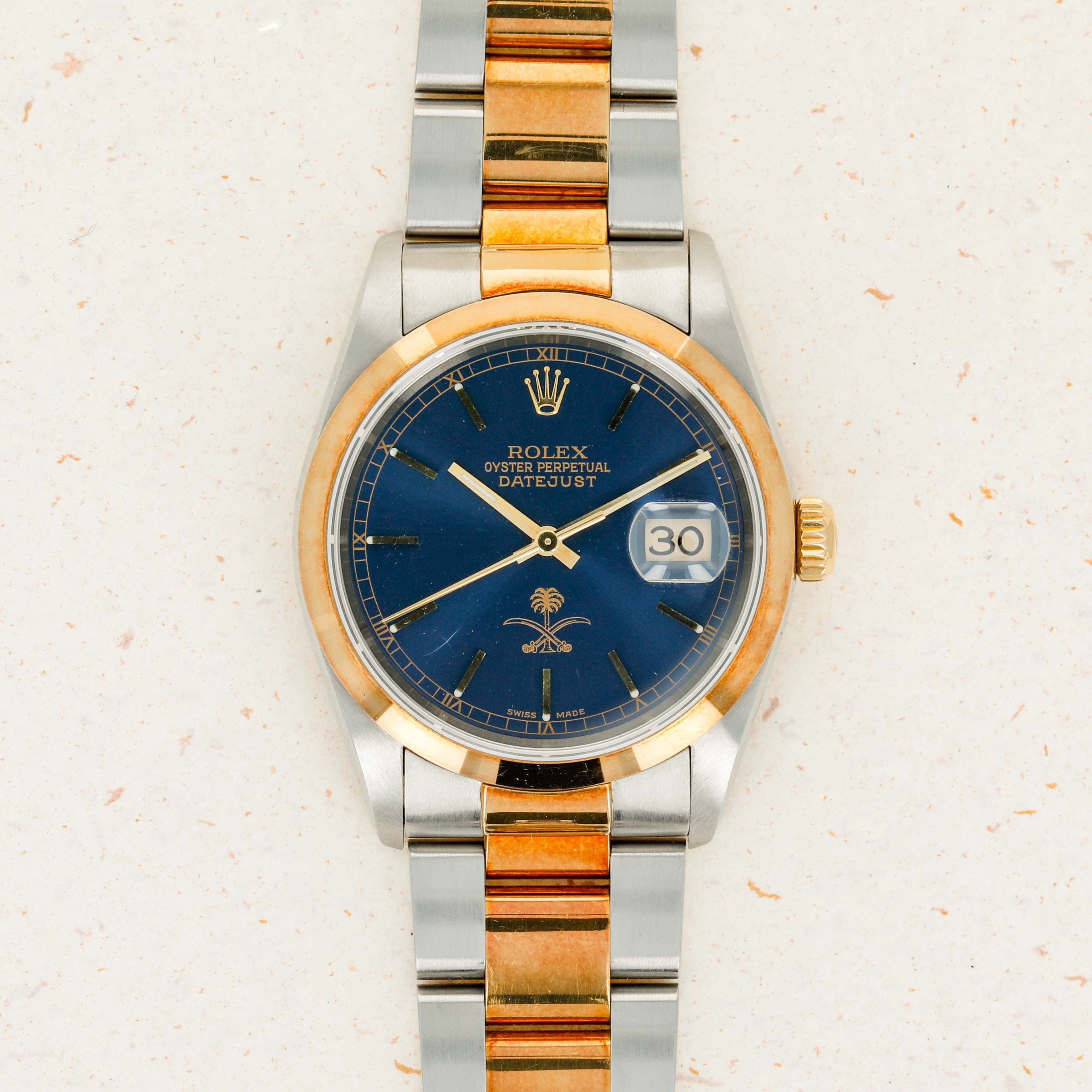 Boasting the ouse of Saud coat of arms at 12 o’clock, this Datejust's blue dial marks its designation as a watch that was ordered by the Saudi Arabian royal family as a special order watch destined to either be worn by members of the royal family or gifted to someone that the royal family saw fit, such as a foreign dignitary.