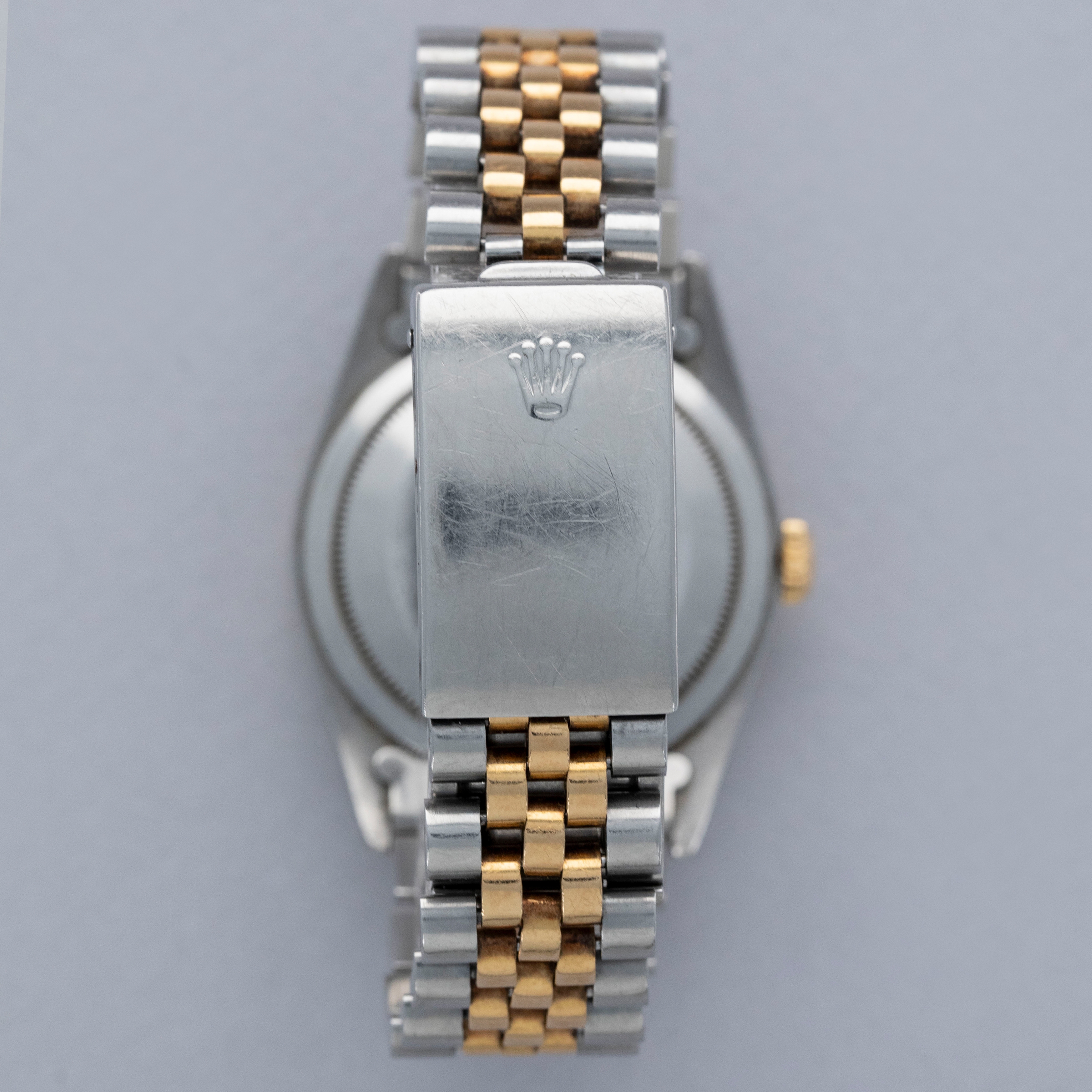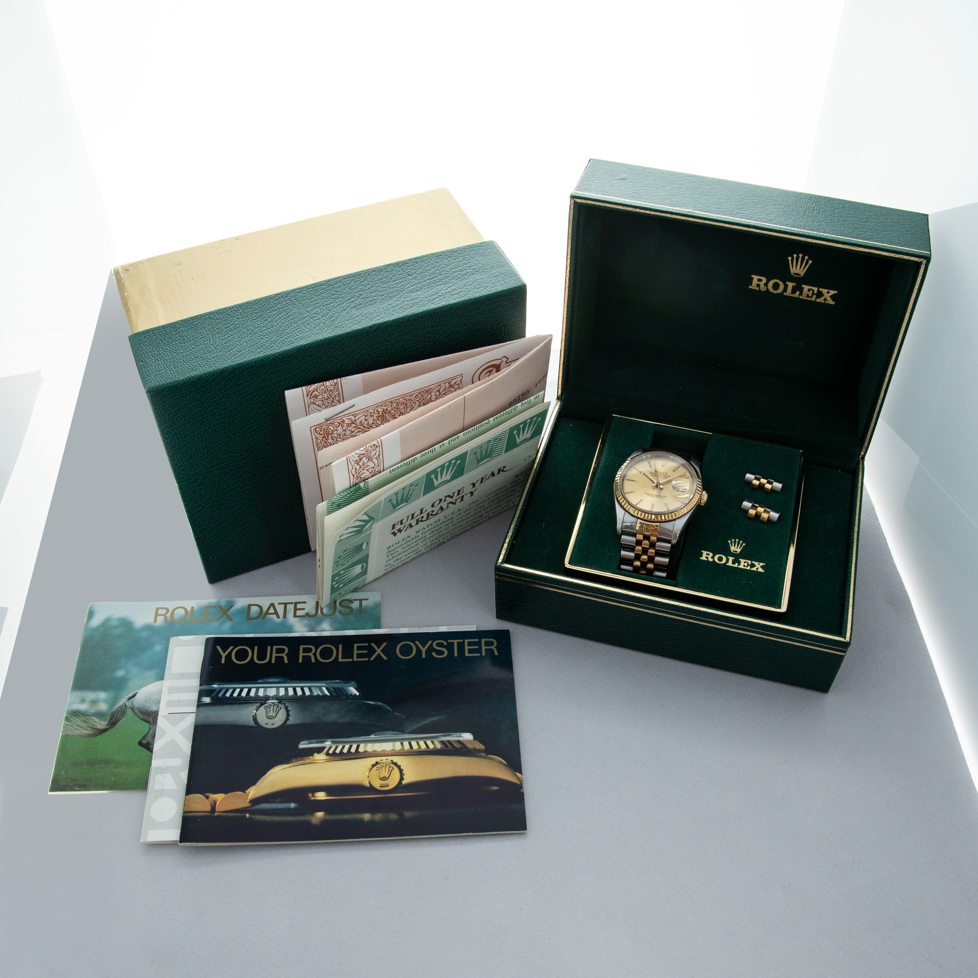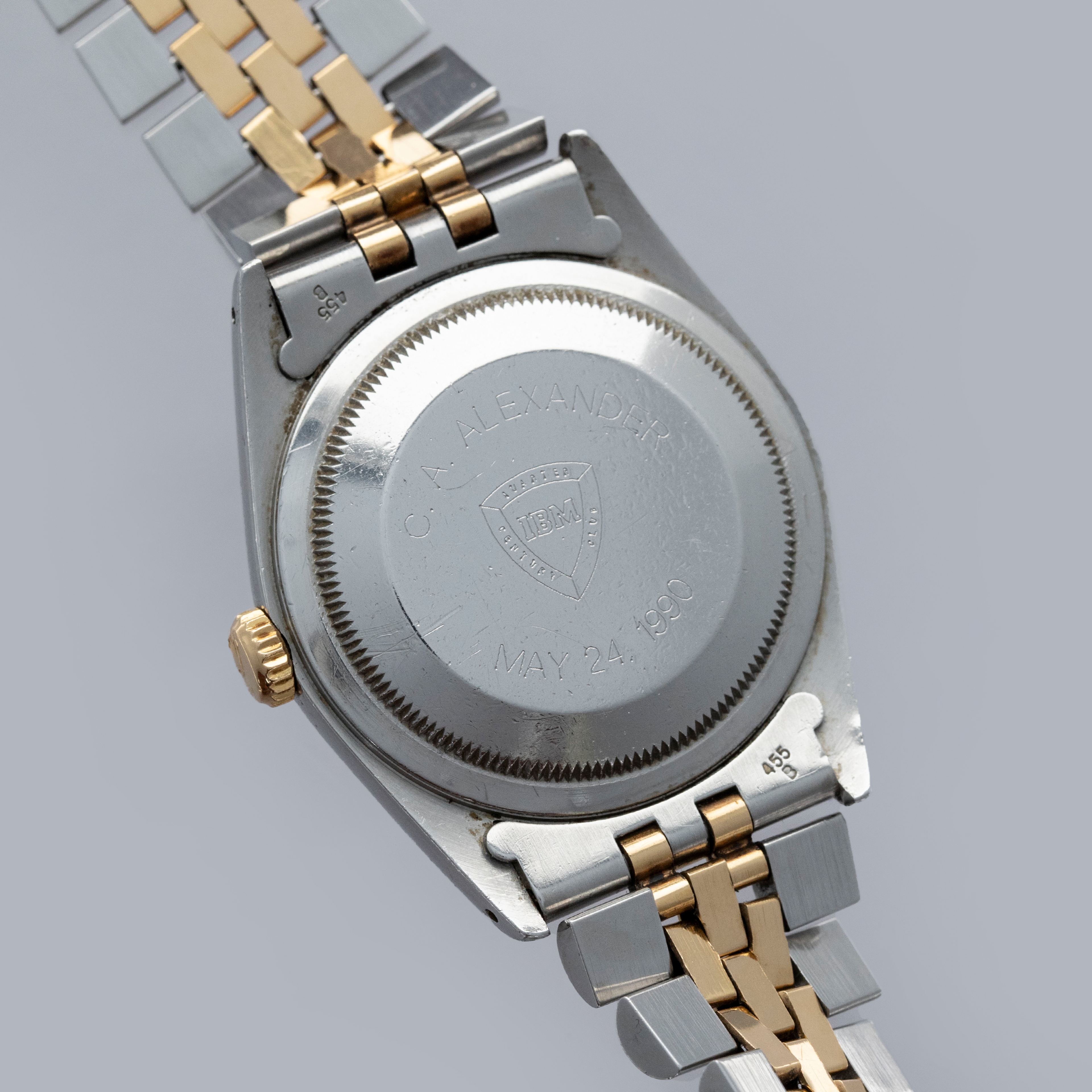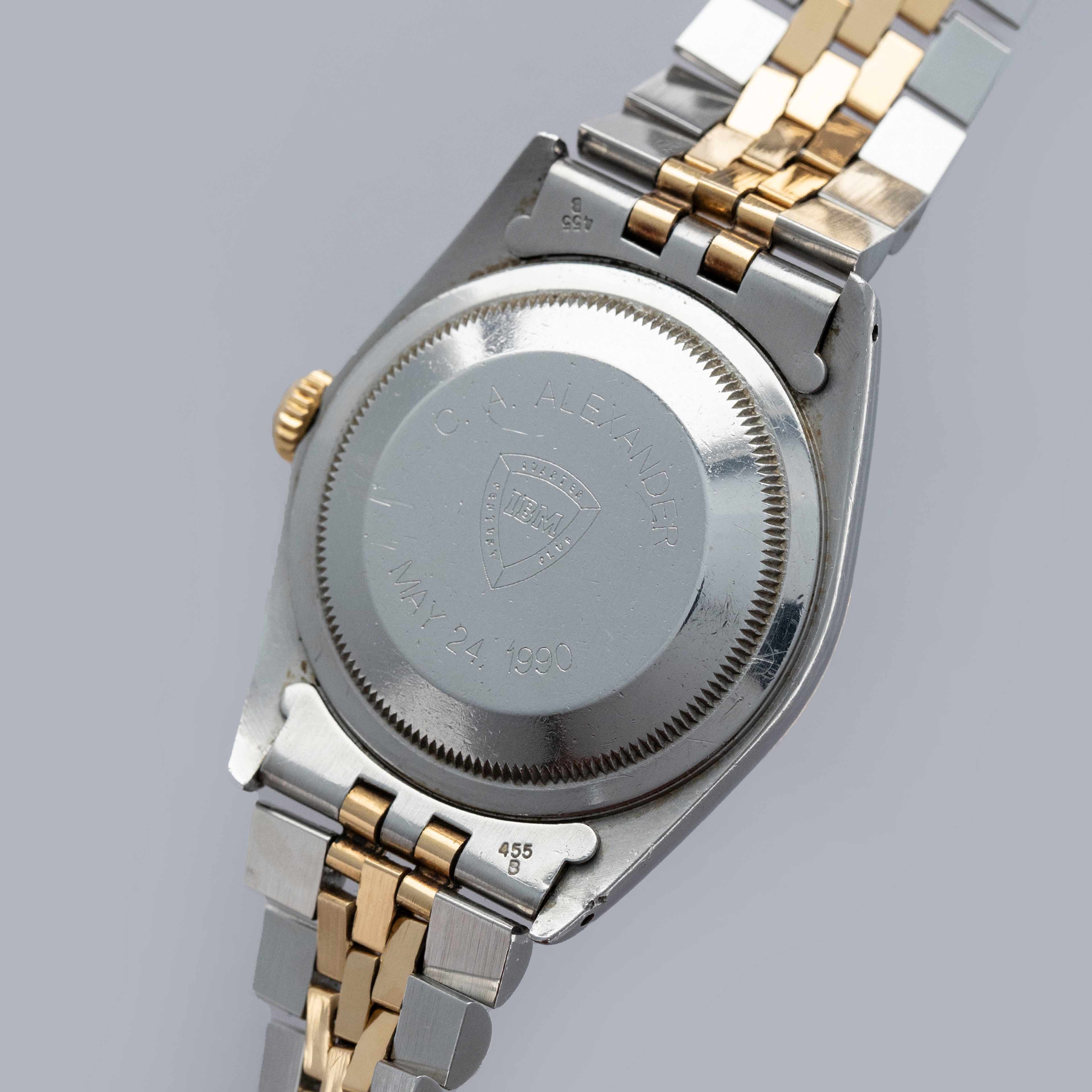 The watch is in overall good condition. The steel case, while well defined and with symmetrical lugs, has numerous noticeable scratches, nicks, and a couple of dings. The case back also shows scratches, but retains a well-defined 25-year special award engraving from IBM to the original owner. The yellow gold fluted bezel has noticeable scratches and wear in places. The dial and hands display visible spotting and aging. The steel and gold Jubilee bracelet shows scratches and significant play between the links. The bracelet currently fits a 7" wrist and has 19 links, 2 of which are removable, with 2 additional links included. Comes complete with boxes, warranty papers, booklets, and an appraisal in the name of the original recipient. Please note that this watch was converted into a two-tone model prior to the watch being given by IBM and the parts used were all genuine Rolex parts and likely done by the authorized dealer. The reference 16220 is a steel bezel steel Datejust.