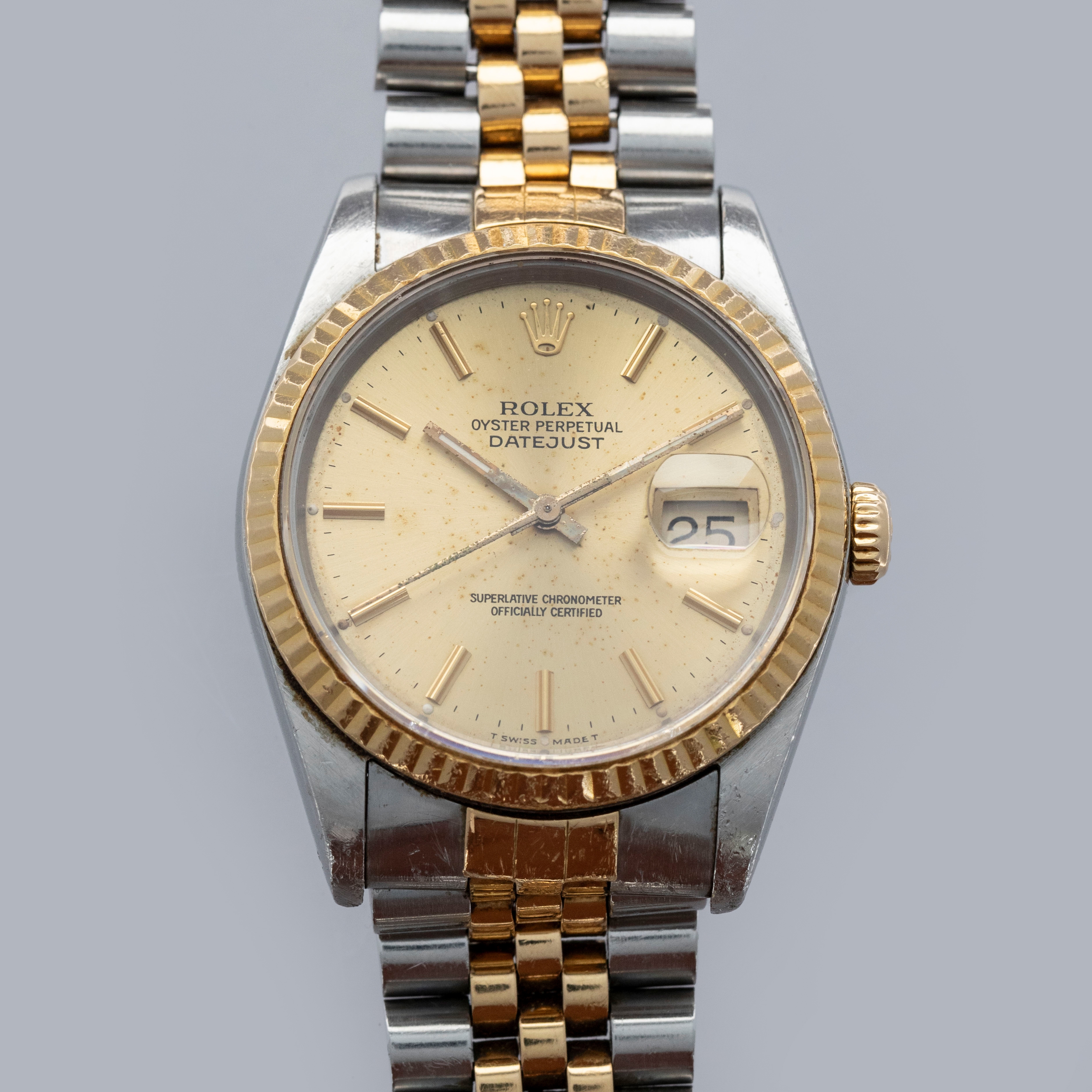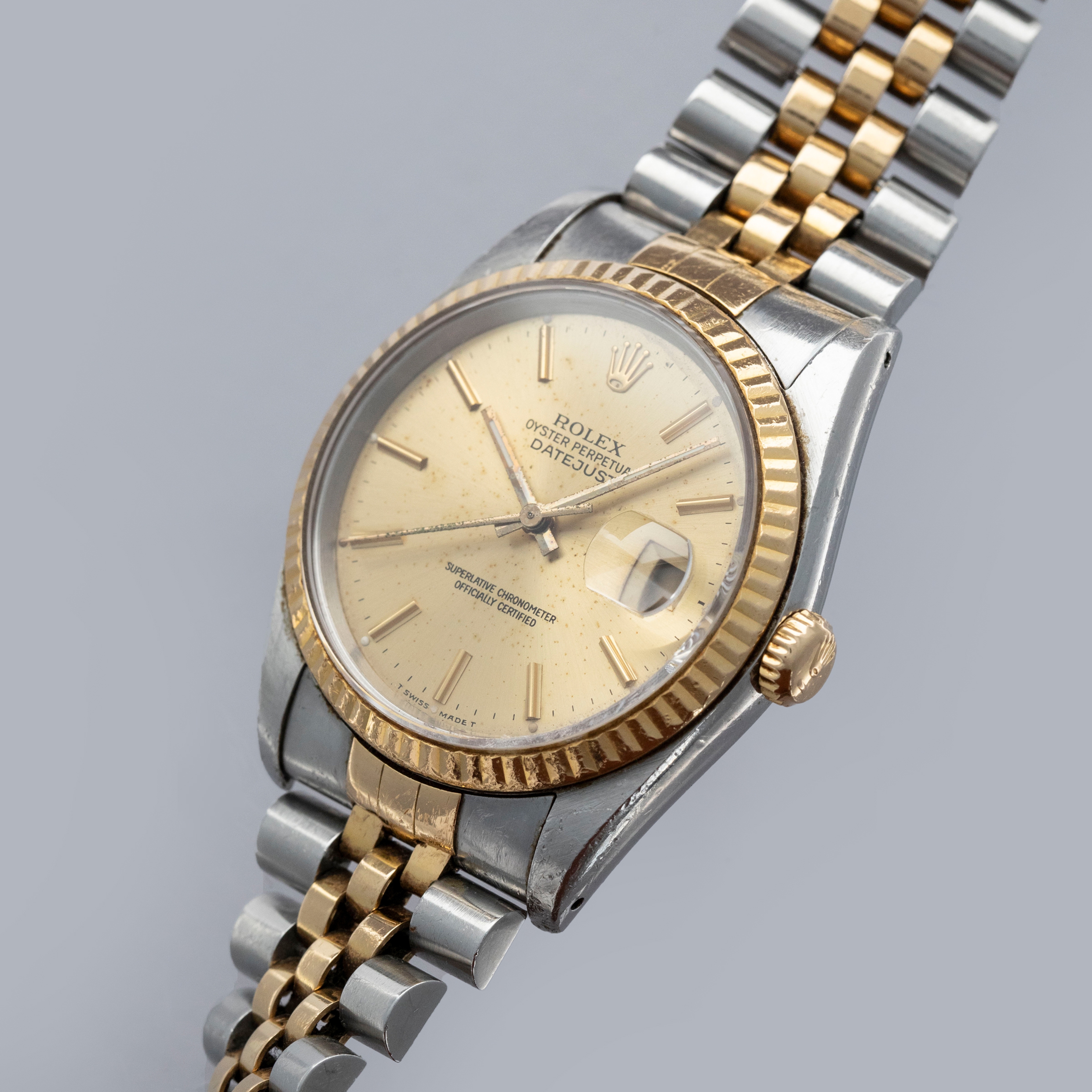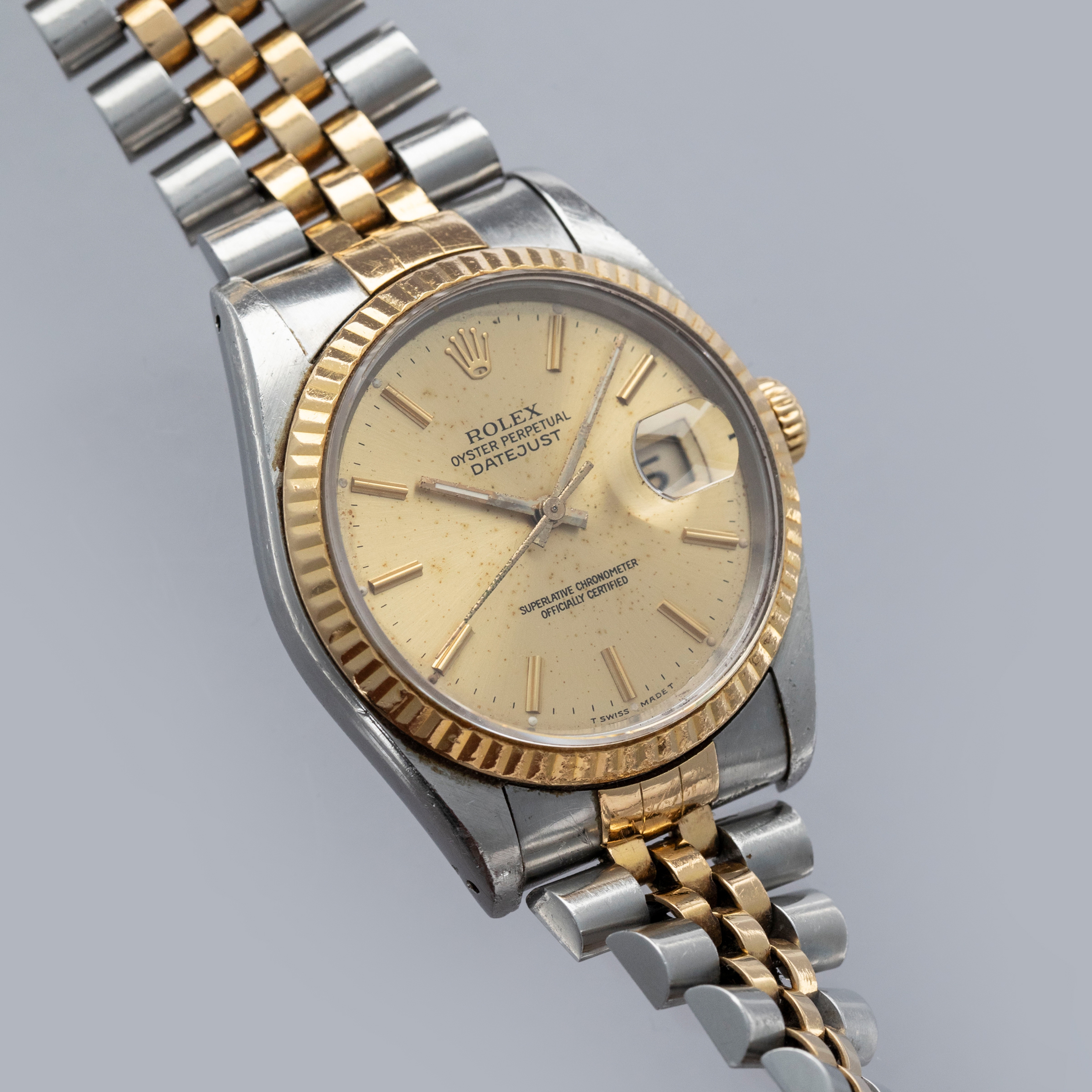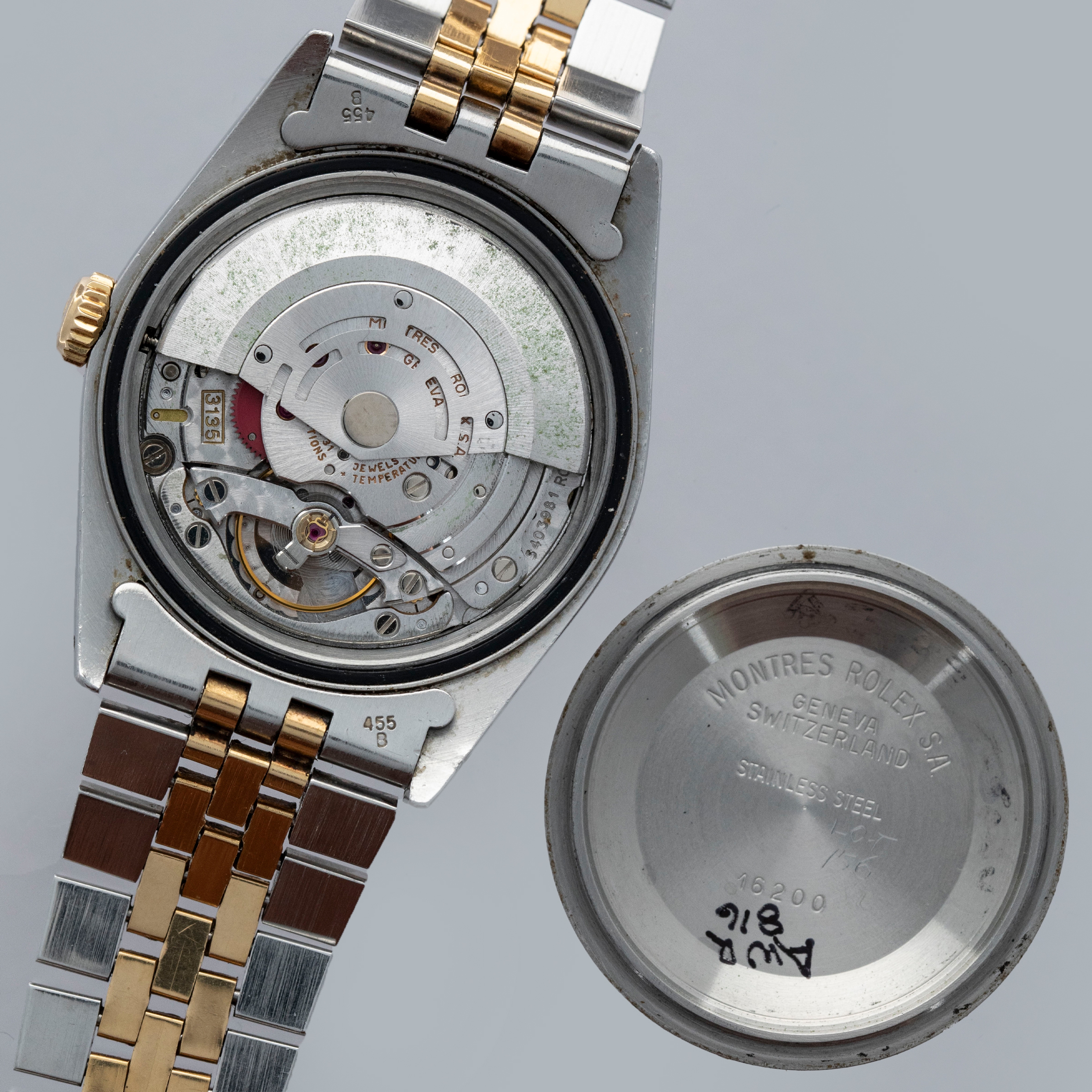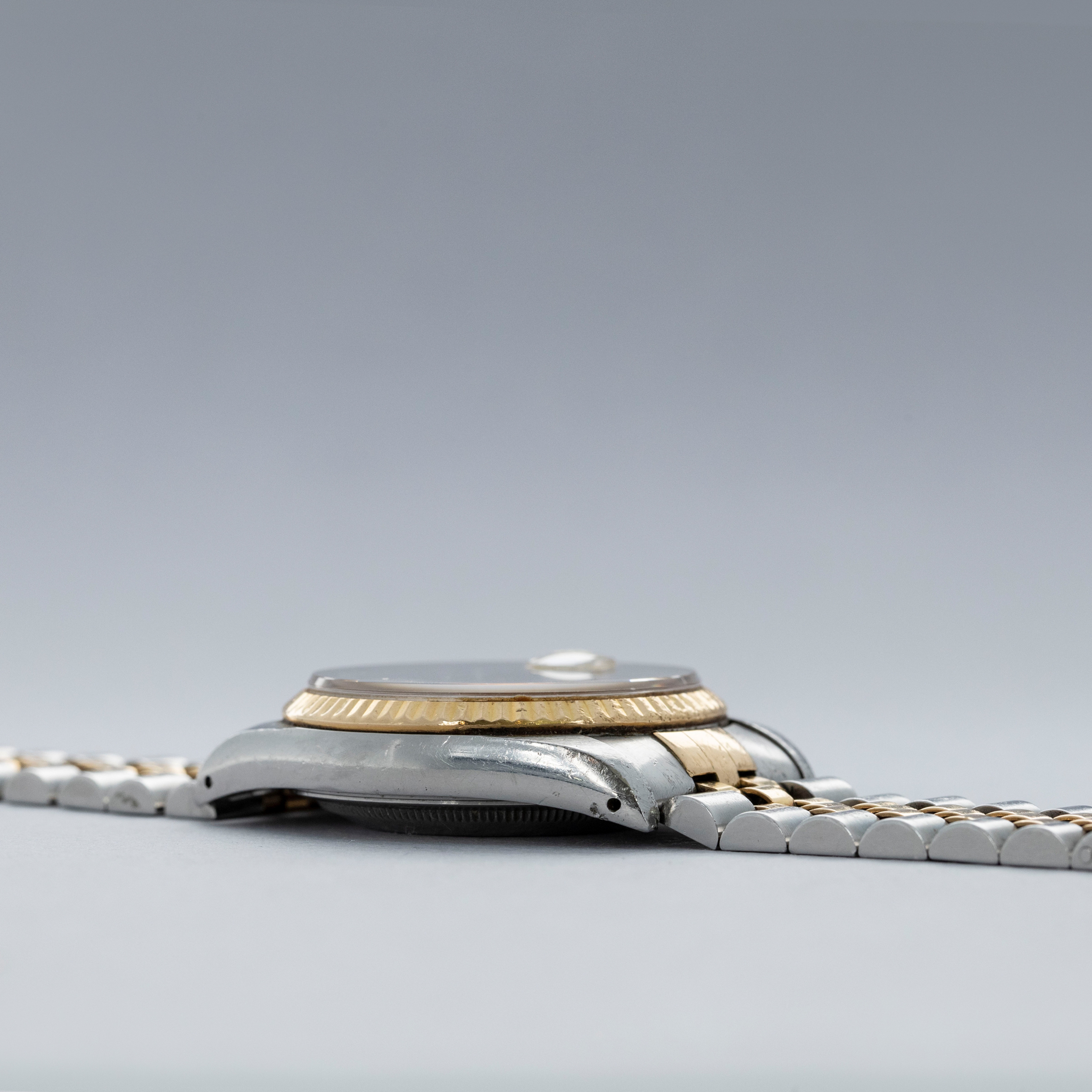 The watch is in overall good condition. The steel case, while well defined and with symmetrical lugs, has numerous noticeable scratches, nicks, and a couple of dings. The case back also shows scratches, but retains a well-defined 25-year special award engraving from IBM to the original owner. The yellow gold fluted bezel has noticeable scratches and wear in places. The dial and hands display visible spotting and aging. The steel and gold Jubilee bracelet shows scratches and significant play between the links. The bracelet currently fits a 7" wrist and has 19 links, 2 of which are removable, with 2 additional links included. Comes complete with boxes, warranty papers, booklets, and an appraisal in the name of the original recipient. Please note that this watch was converted into a two-tone model prior to the watch being given by IBM and the parts used were all genuine Rolex parts and likely done by the authorized dealer. The reference 16220 is a steel bezel steel Datejust.