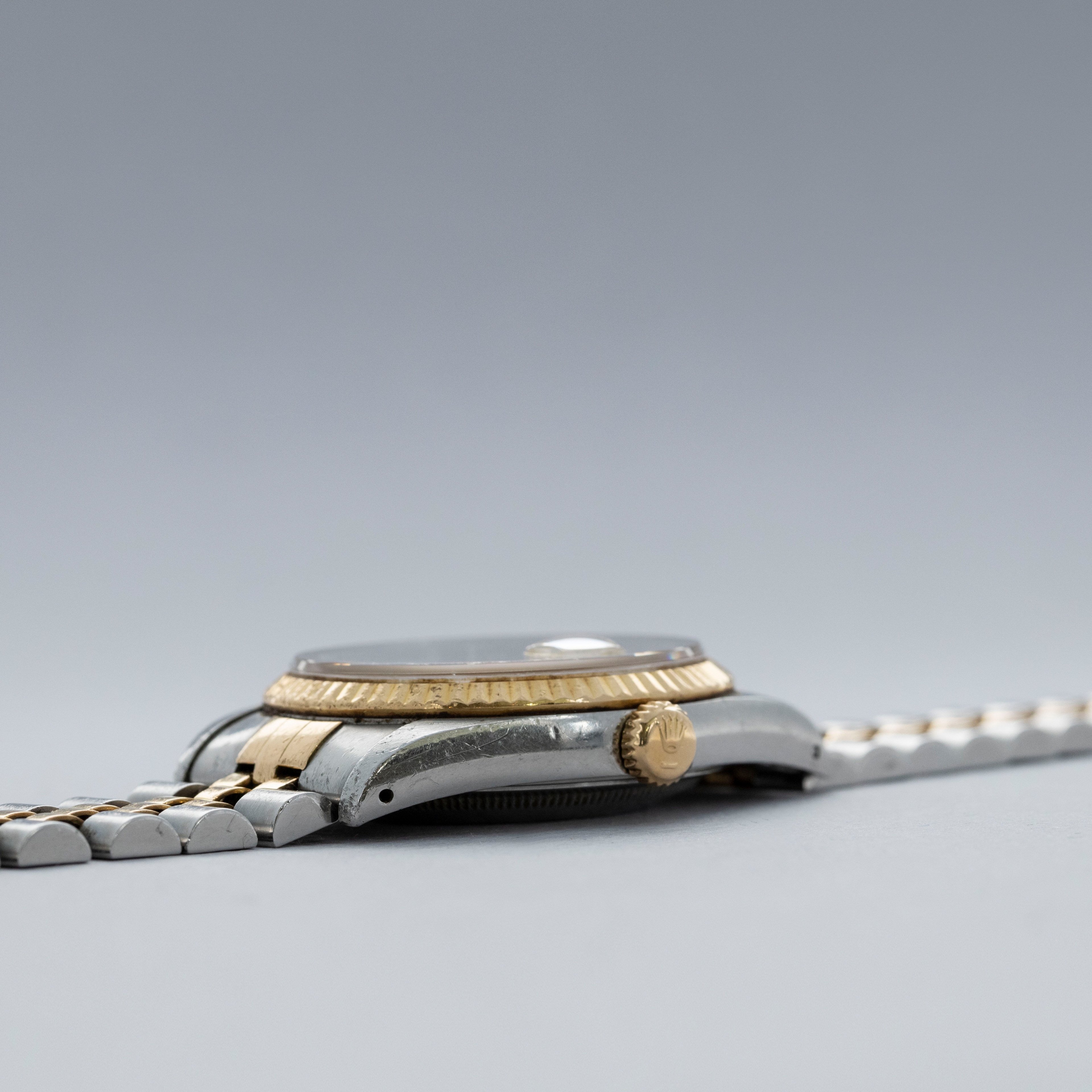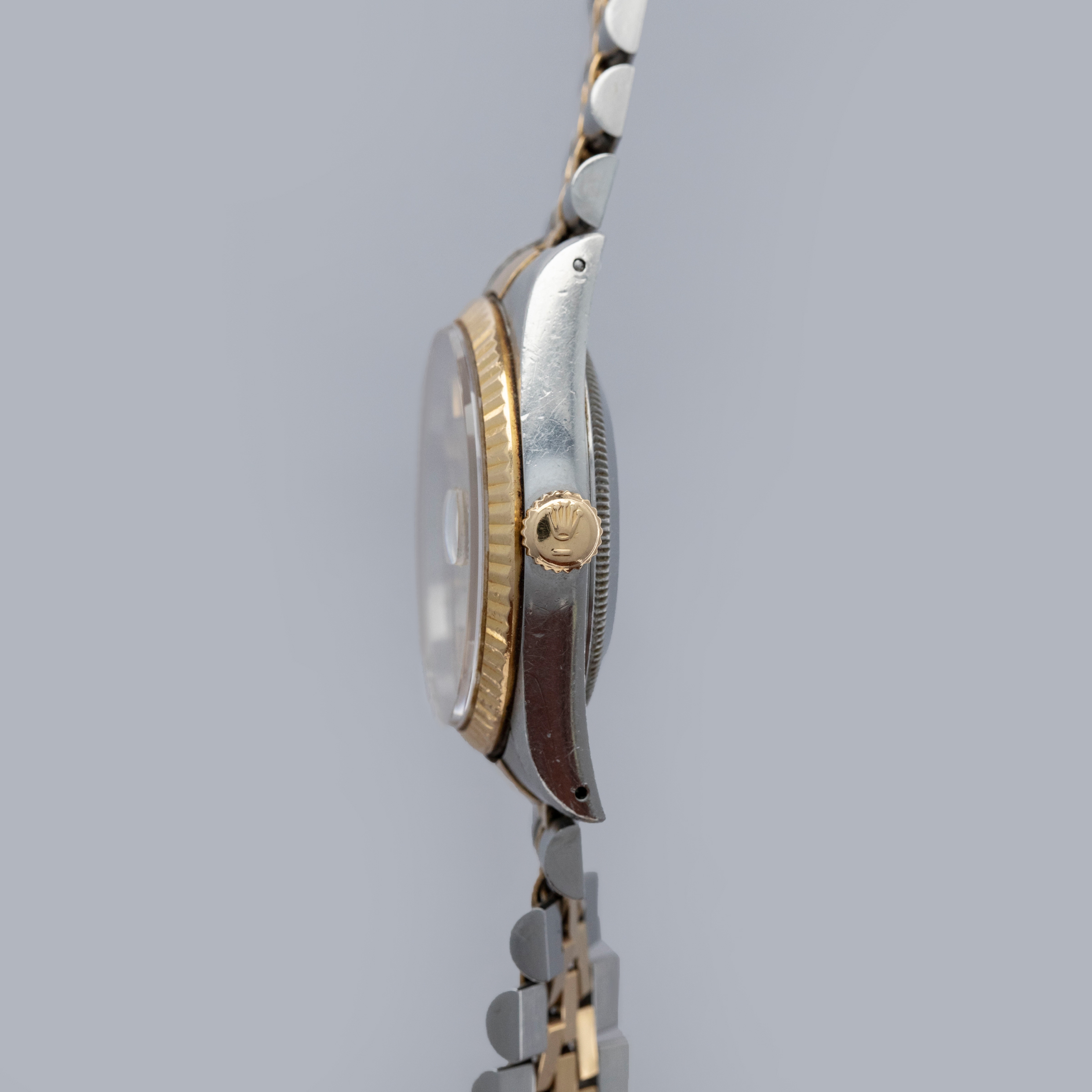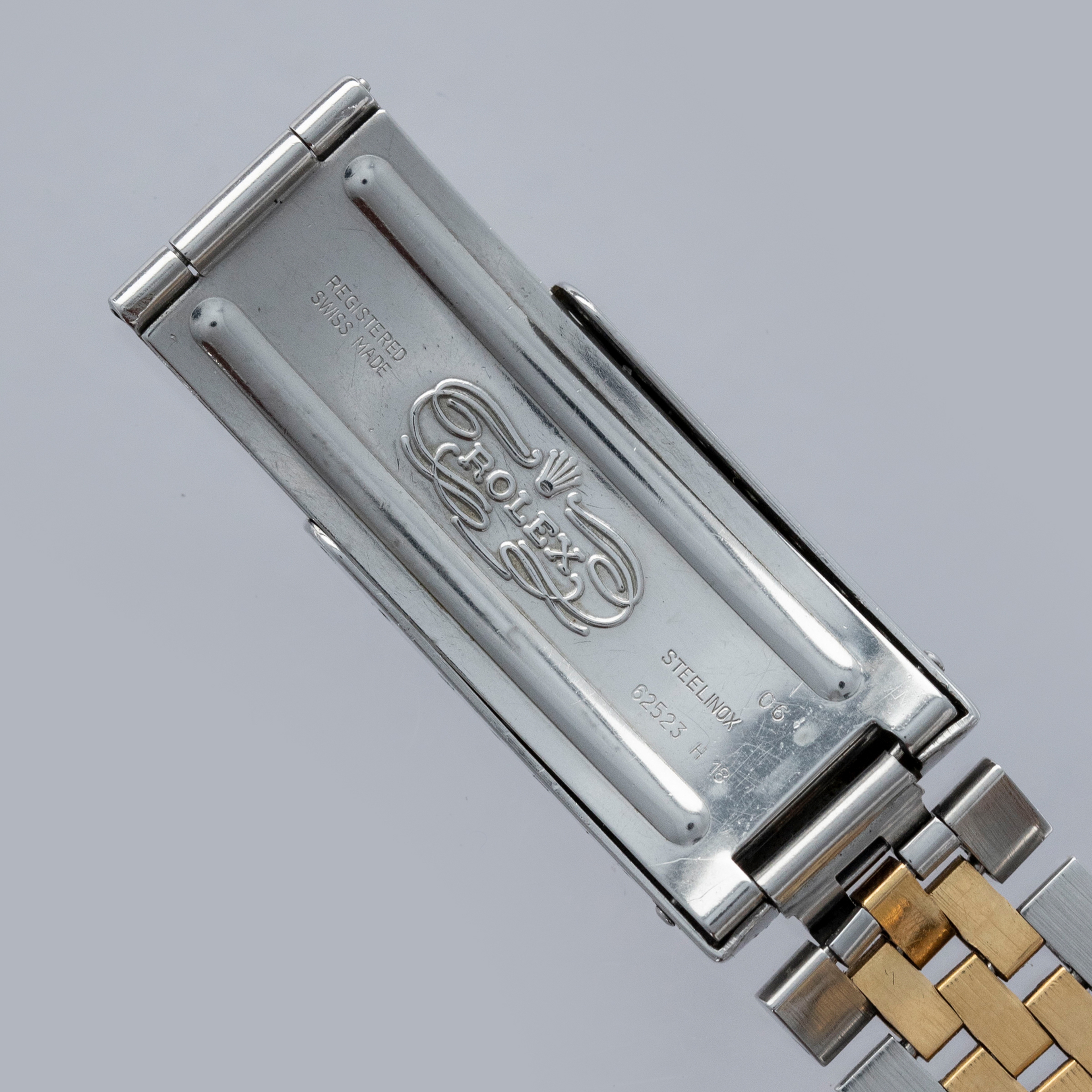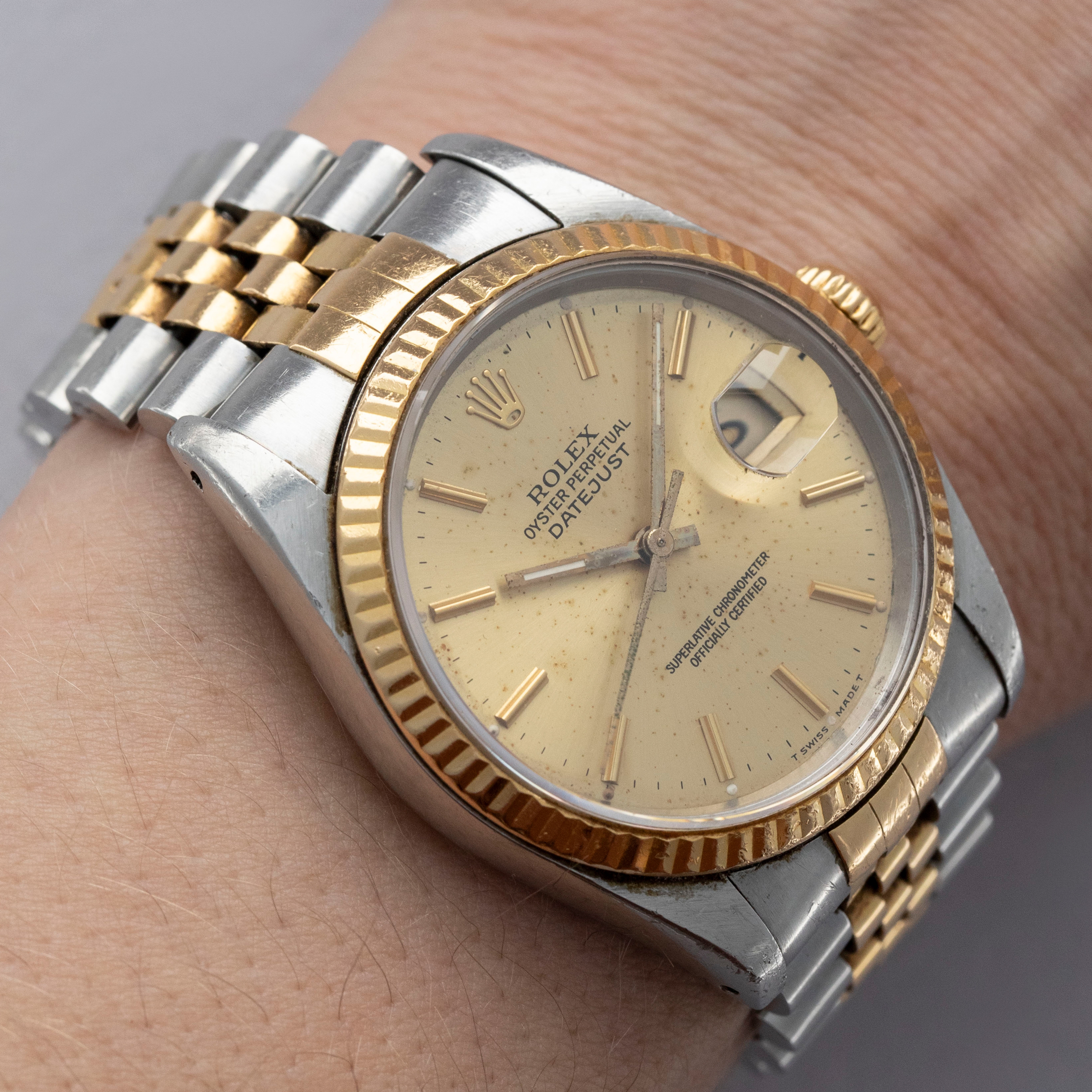 The watch is in overall good condition. The steel case, while well defined and with symmetrical lugs, has numerous noticeable scratches, nicks, and a couple of dings. The case back also shows scratches, but retains a well-defined 25-year special award engraving from IBM to the original owner. The yellow gold fluted bezel has noticeable scratches and wear in places. The dial and hands display visible spotting and aging. The steel and gold Jubilee bracelet shows scratches and significant play between the links. The bracelet currently fits a 7" wrist and has 19 links, 2 of which are removable, with 2 additional links included. Comes complete with boxes, warranty papers, booklets, and an appraisal in the name of the original recipient. Please note that this watch was converted into a two-tone model prior to the watch being given by IBM and the parts used were all genuine Rolex parts and likely done by the authorized dealer. The reference 16220 is a steel bezel steel Datejust.