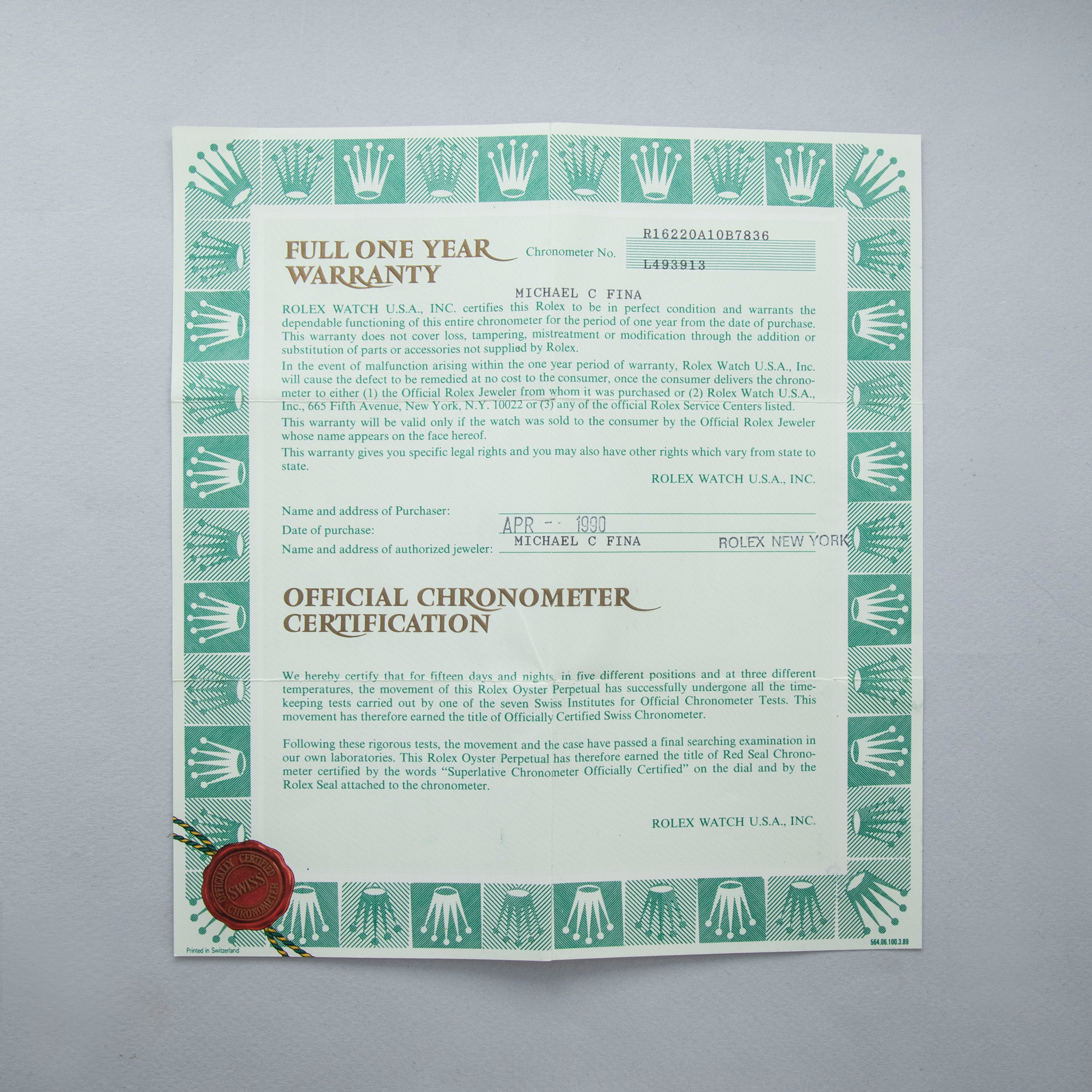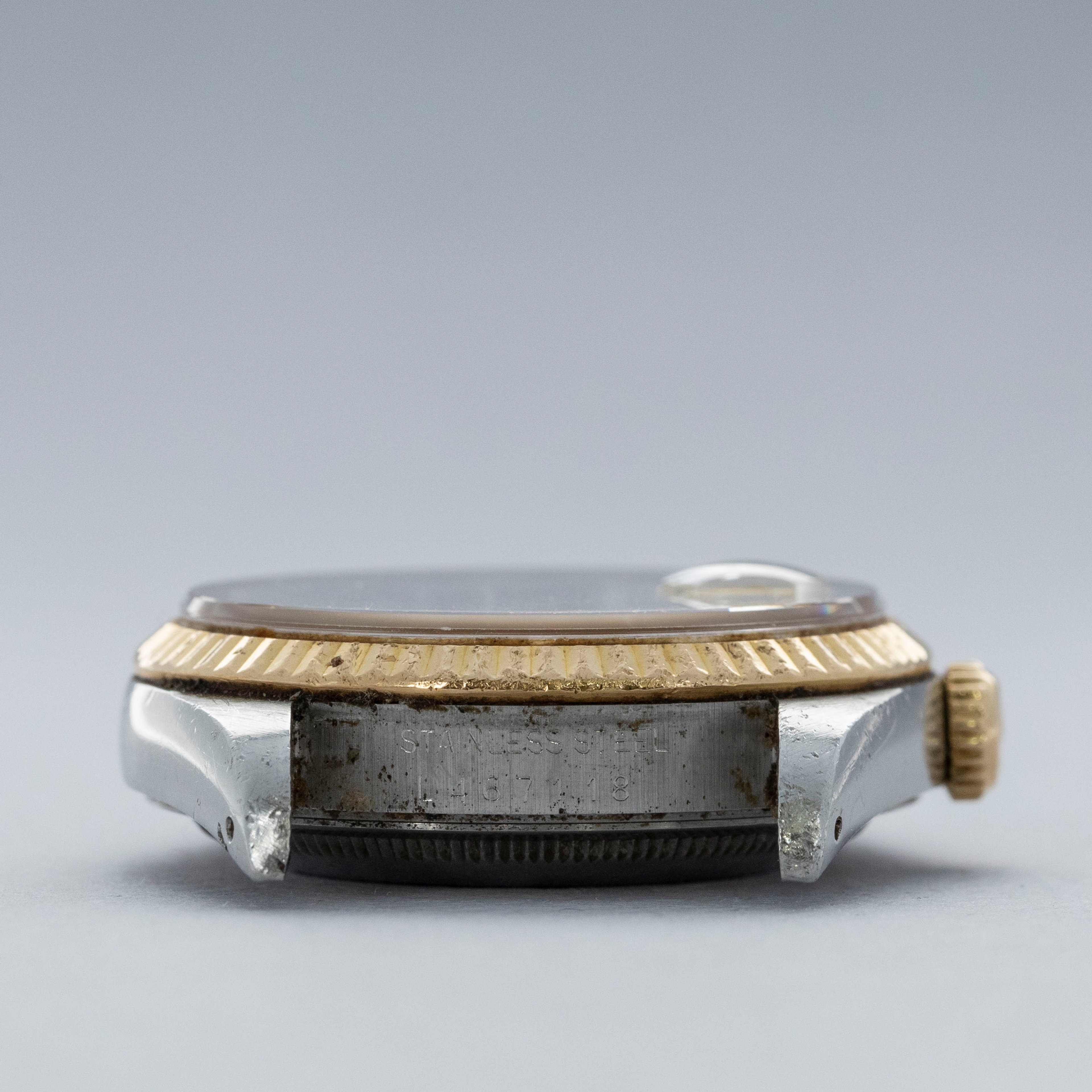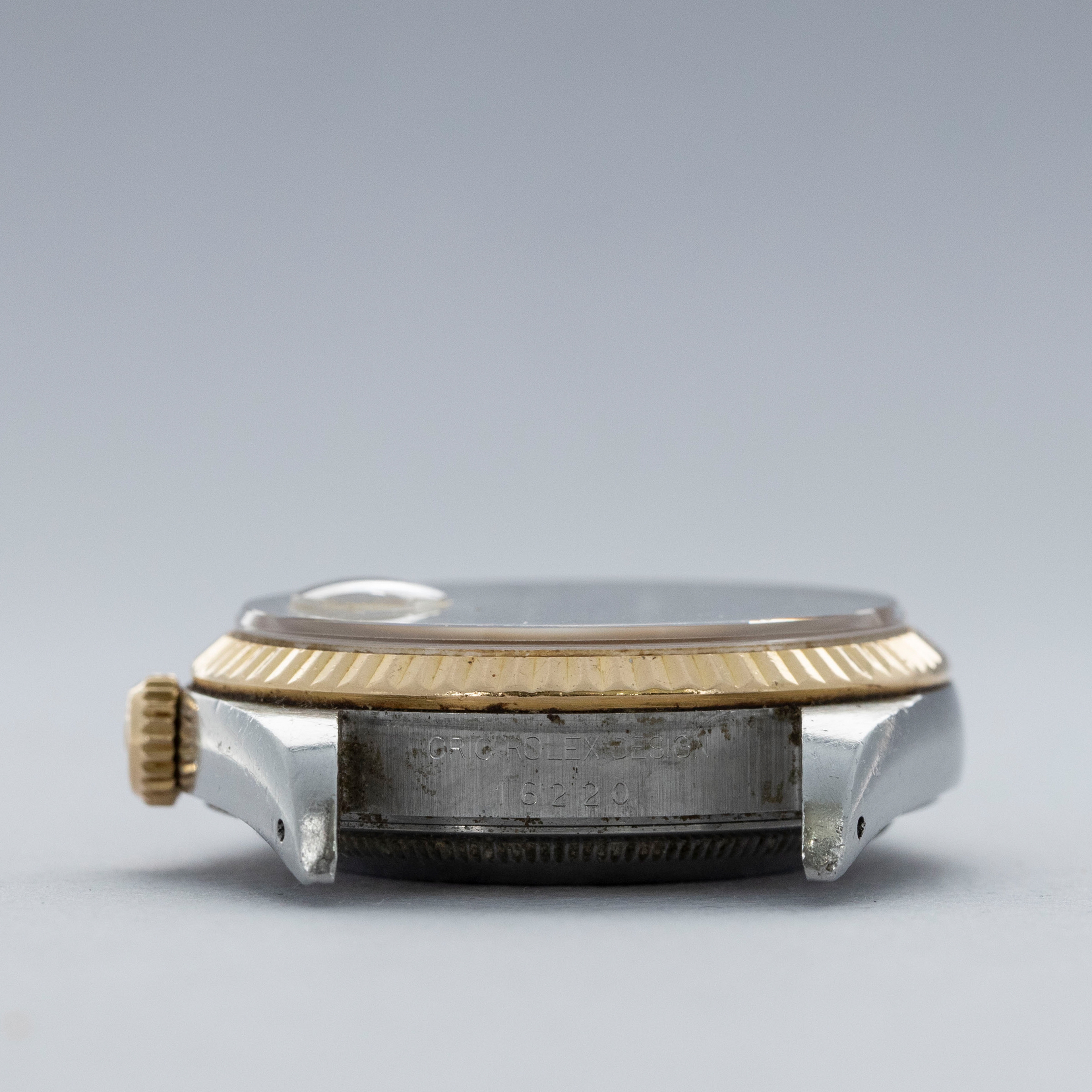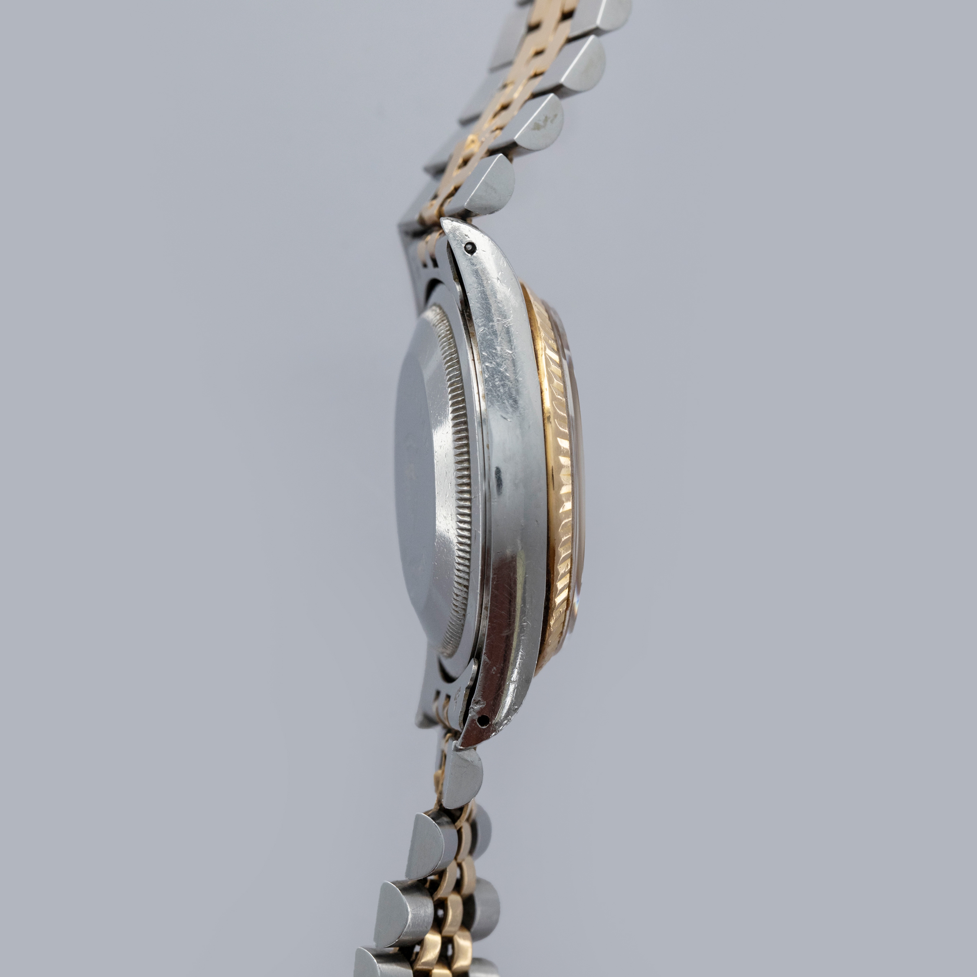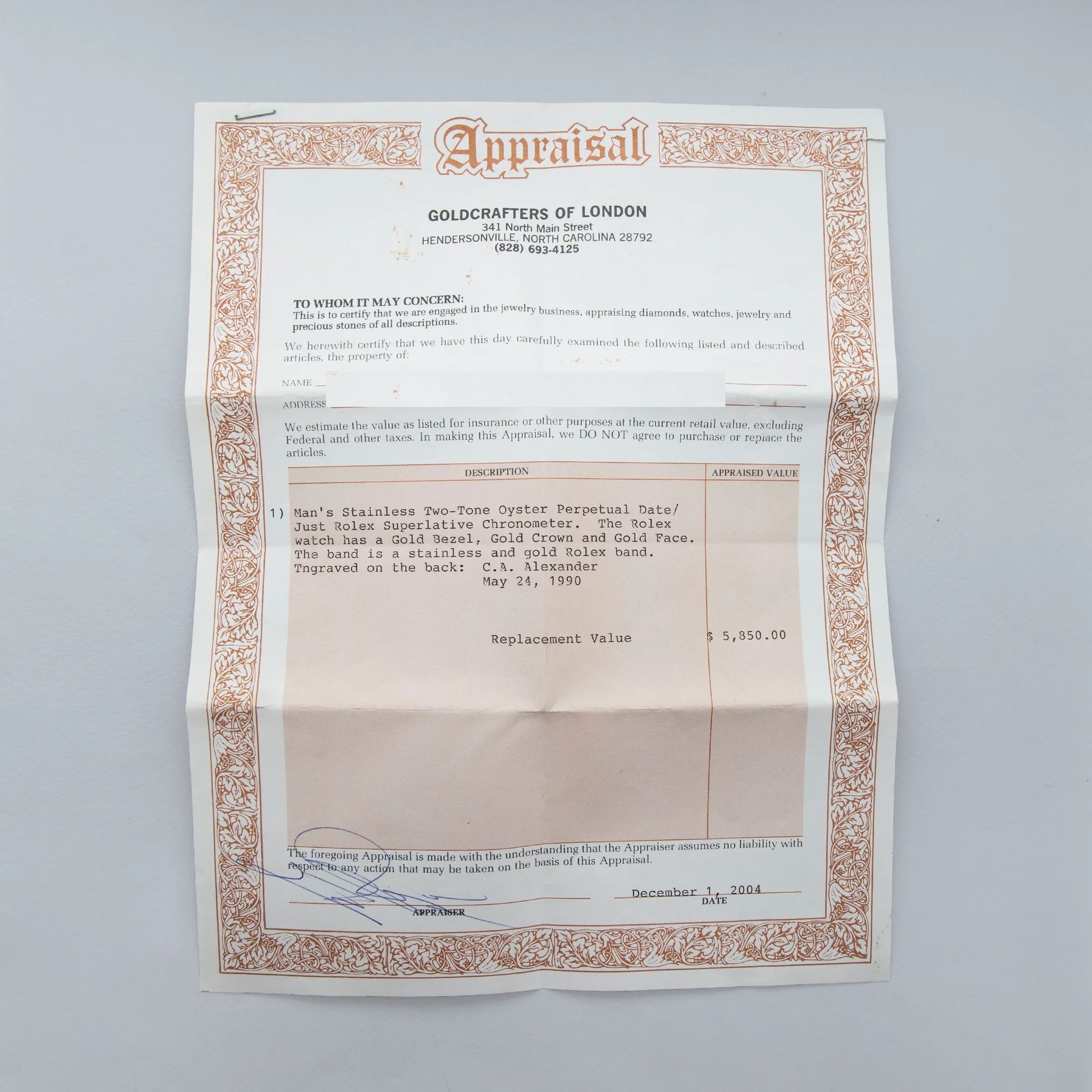 The watch is in overall good condition. The steel case, while well defined and with symmetrical lugs, has numerous noticeable scratches, nicks, and a couple of dings. The case back also shows scratches, but retains a well-defined 25-year special award engraving from IBM to the original owner. The yellow gold fluted bezel has noticeable scratches and wear in places. The dial and hands display visible spotting and aging. The steel and gold Jubilee bracelet shows scratches and significant play between the links. The bracelet currently fits a 7" wrist and has 19 links, 2 of which are removable, with 2 additional links included. Comes complete with boxes, warranty papers, booklets, and an appraisal in the name of the original recipient. Please note that this watch was converted into a two-tone model prior to the watch being given by IBM and the parts used were all genuine Rolex parts and likely done by the authorized dealer. The reference 16220 is a steel bezel steel Datejust.