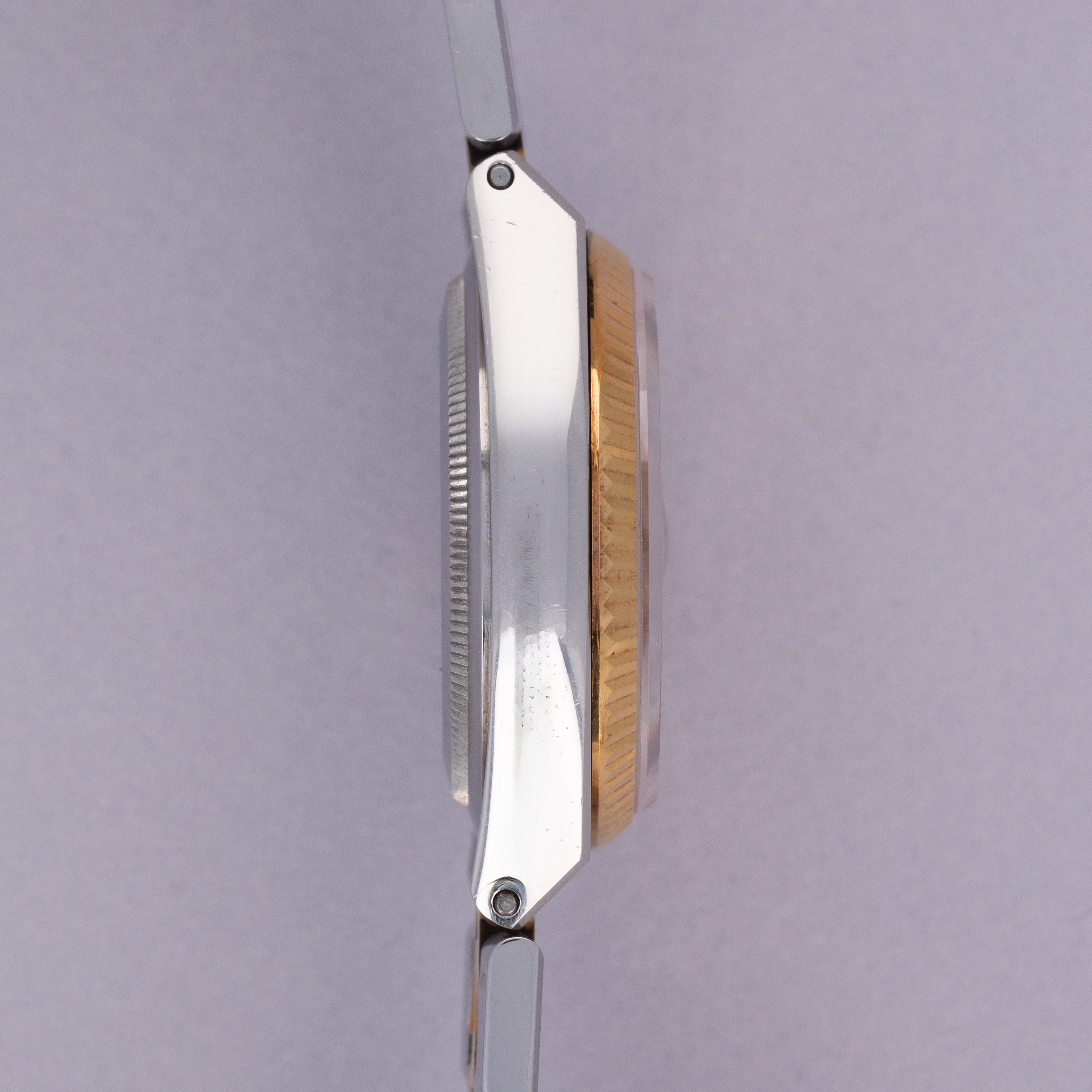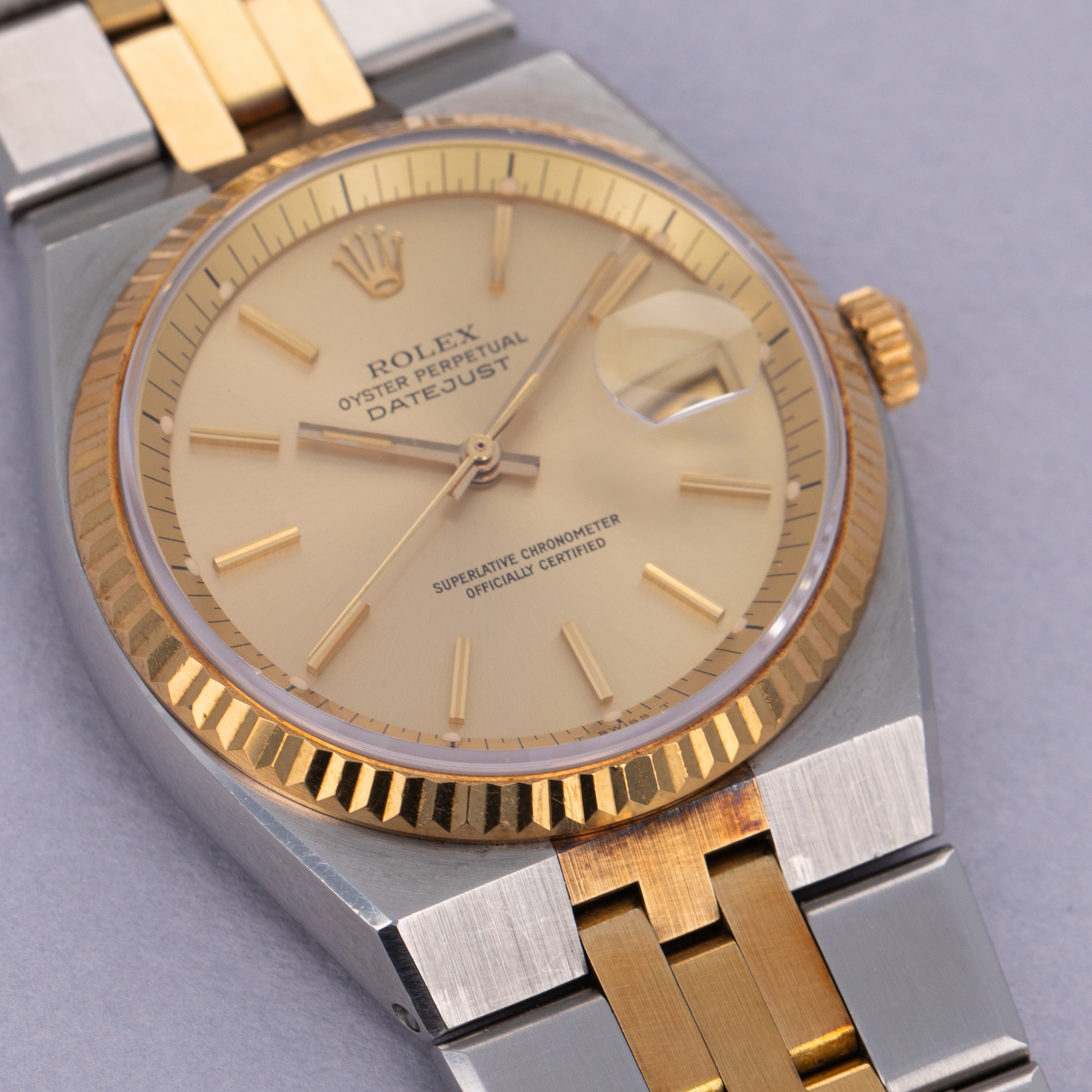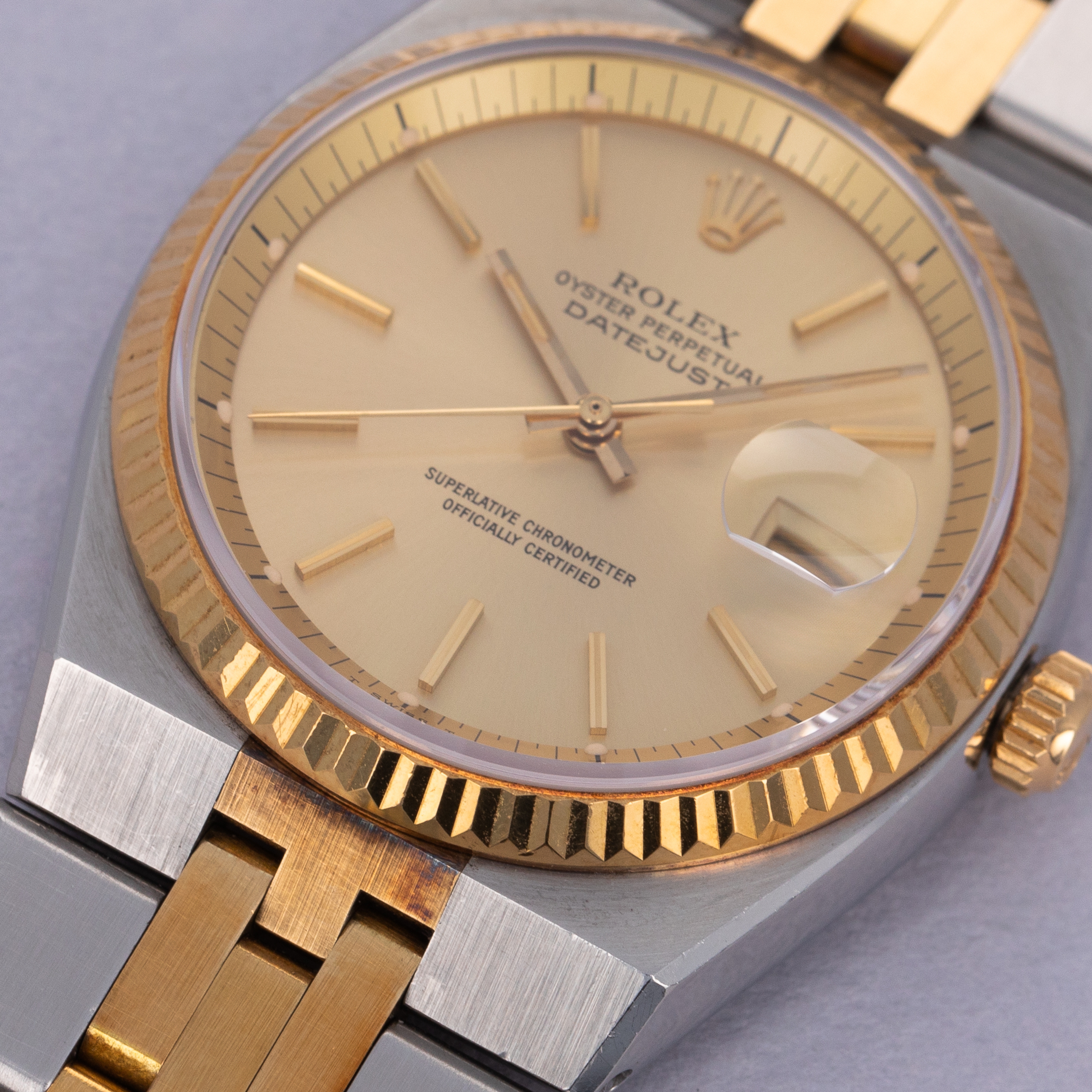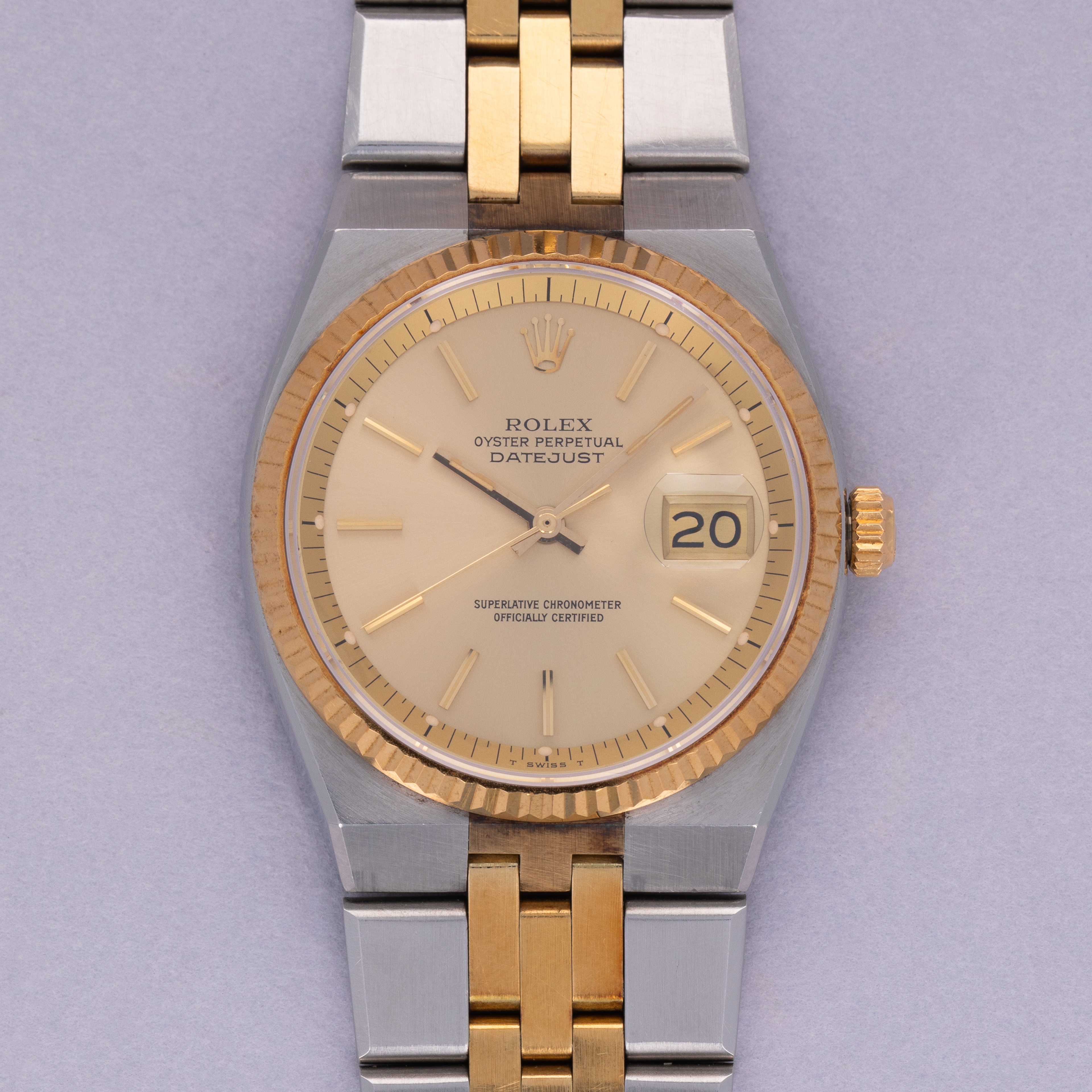 The Rolex Oyster Perpetual Date ref. 1630 stands as a historical timepiece, crafted during Rolex's transition to quartz watches in 1975. Produced alongside its stainless steel sibling, the ref. 1530, the ref. 1630 was discontinued in 1977 just before the the Oysterquartz began production. Boasting the Oysterquartz collection’s angular case, which it was originally designed for, Rolex decided to launch the ref. 1530 and ref. 1630 while they were perfecting their own quartz movement. Besides its angular 36mm two-tone stainless steel and 18kt yellow gold construction, the ref. 1630 houses a sunburst champagne dial with applied index markers and a steep rehaut that includes a minute-scale – a reflection of the construction’s adaptability for the thicker quartz calibre that would soon replace the automatic cal. 1570 movement in the ref. 1530 and ref. 1630. As a part of Rolex's enduring legacy, the Oyster Perpetual Date ref. 1630 symbolizes precision and durability, during a time of genuine uncertainty in the watchmaking industry. A timeless testament to horological excellence, this model remains a distinctive marker in Rolex's unparalleled reputation for precision and durability.