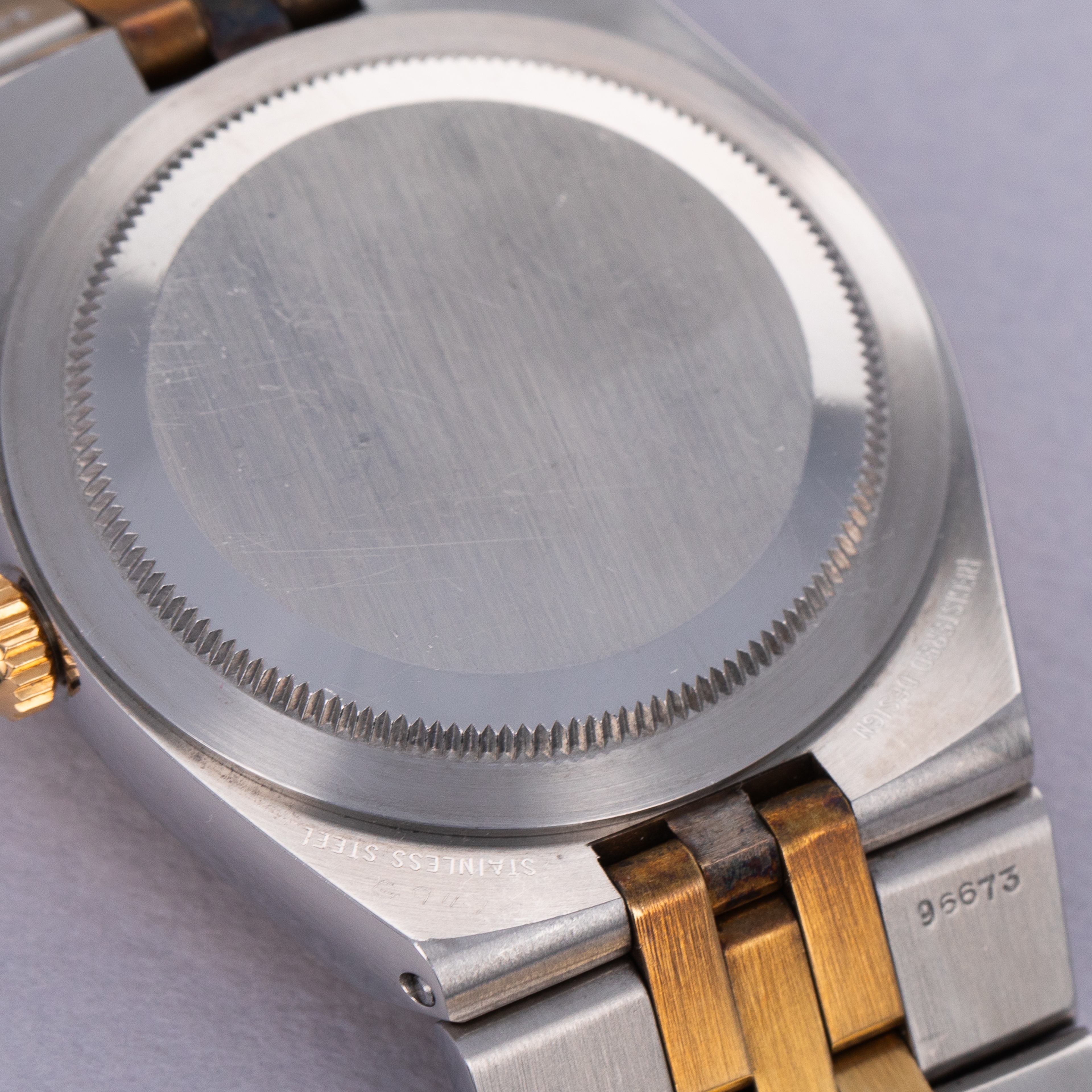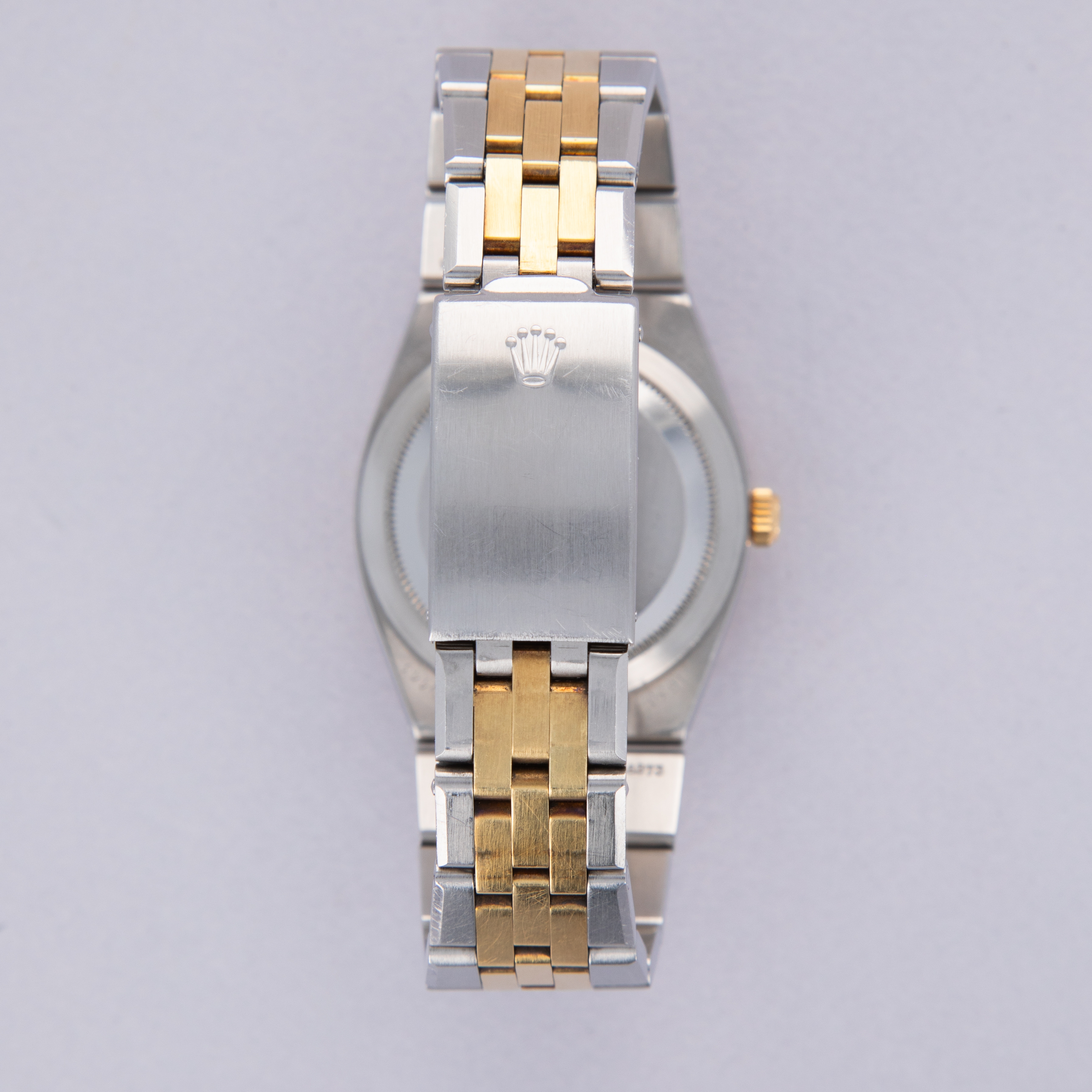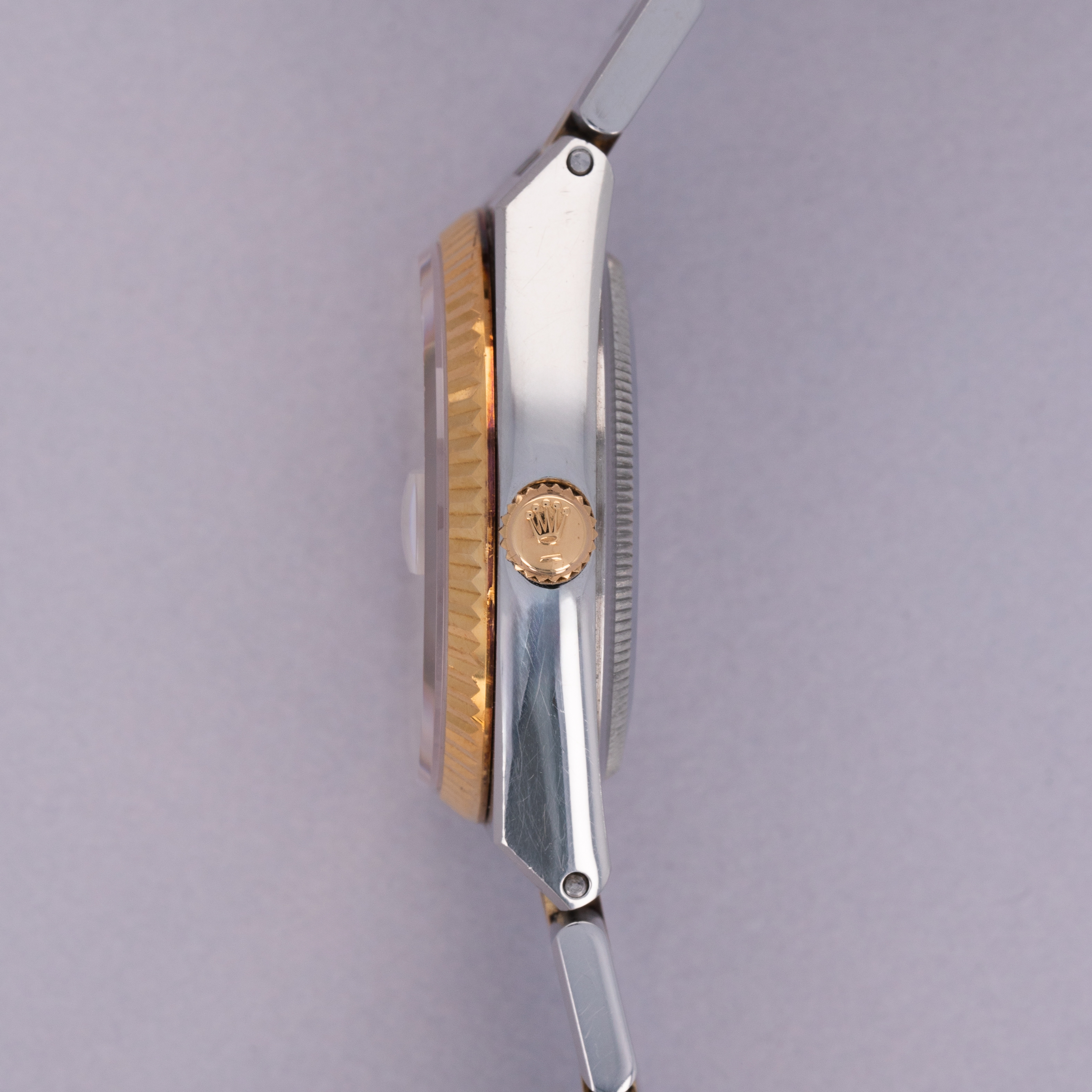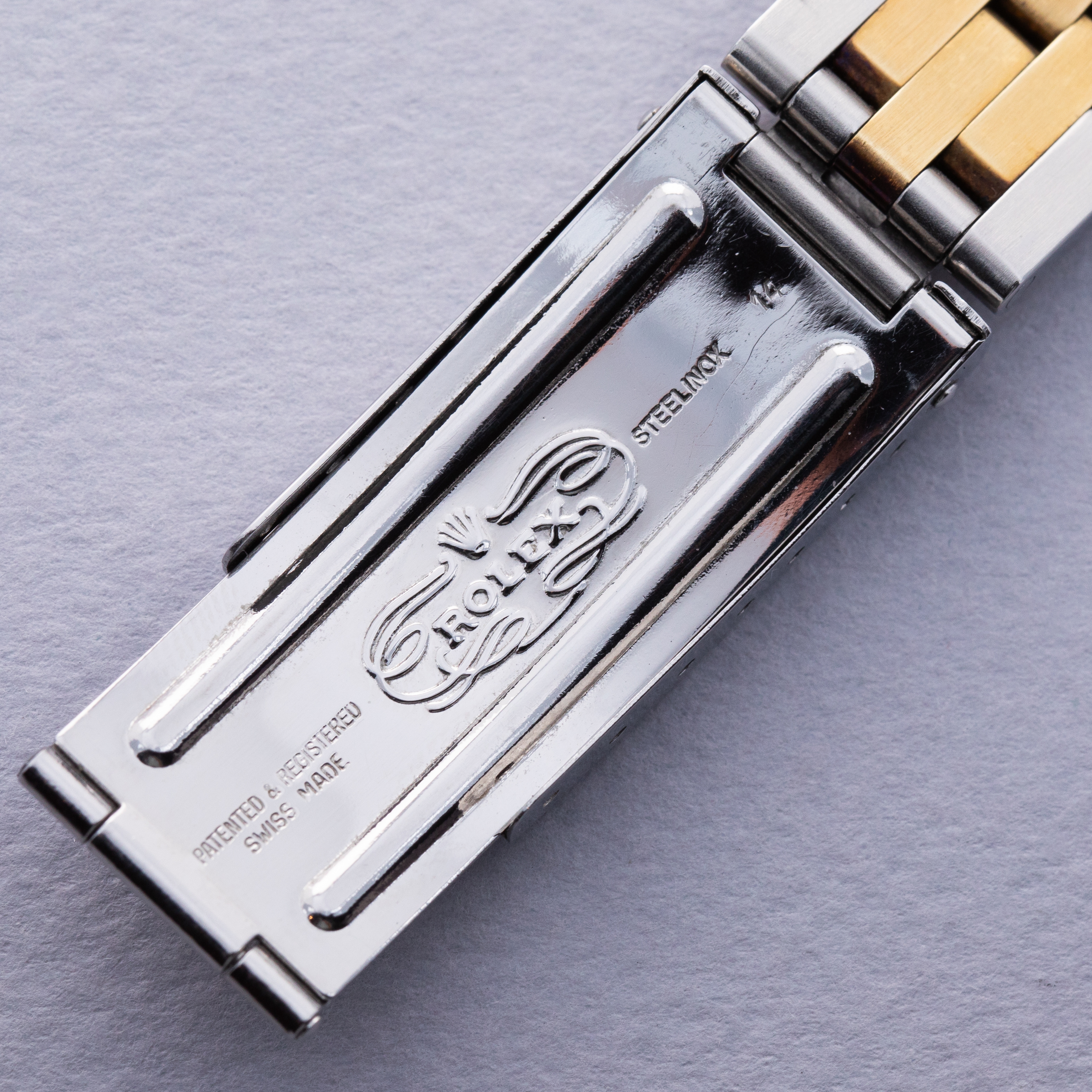 The Rolex Oyster Perpetual Date ref. 1630 stands as a historical timepiece, crafted during Rolex's transition to quartz watches in 1975. Produced alongside its stainless steel sibling, the ref. 1530, the ref. 1630 was discontinued in 1977 just before the the Oysterquartz began production. Boasting the Oysterquartz collection’s angular case, which it was originally designed for, Rolex decided to launch the ref. 1530 and ref. 1630 while they were perfecting their own quartz movement. Besides its angular 36mm two-tone stainless steel and 18kt yellow gold construction, the ref. 1630 houses a sunburst champagne dial with applied index markers and a steep rehaut that includes a minute-scale – a reflection of the construction’s adaptability for the thicker quartz calibre that would soon replace the automatic cal. 1570 movement in the ref. 1530 and ref. 1630. As a part of Rolex's enduring legacy, the Oyster Perpetual Date ref. 1630 symbolizes precision and durability, during a time of genuine uncertainty in the watchmaking industry. A timeless testament to horological excellence, this model remains a distinctive marker in Rolex's unparalleled reputation for precision and durability.