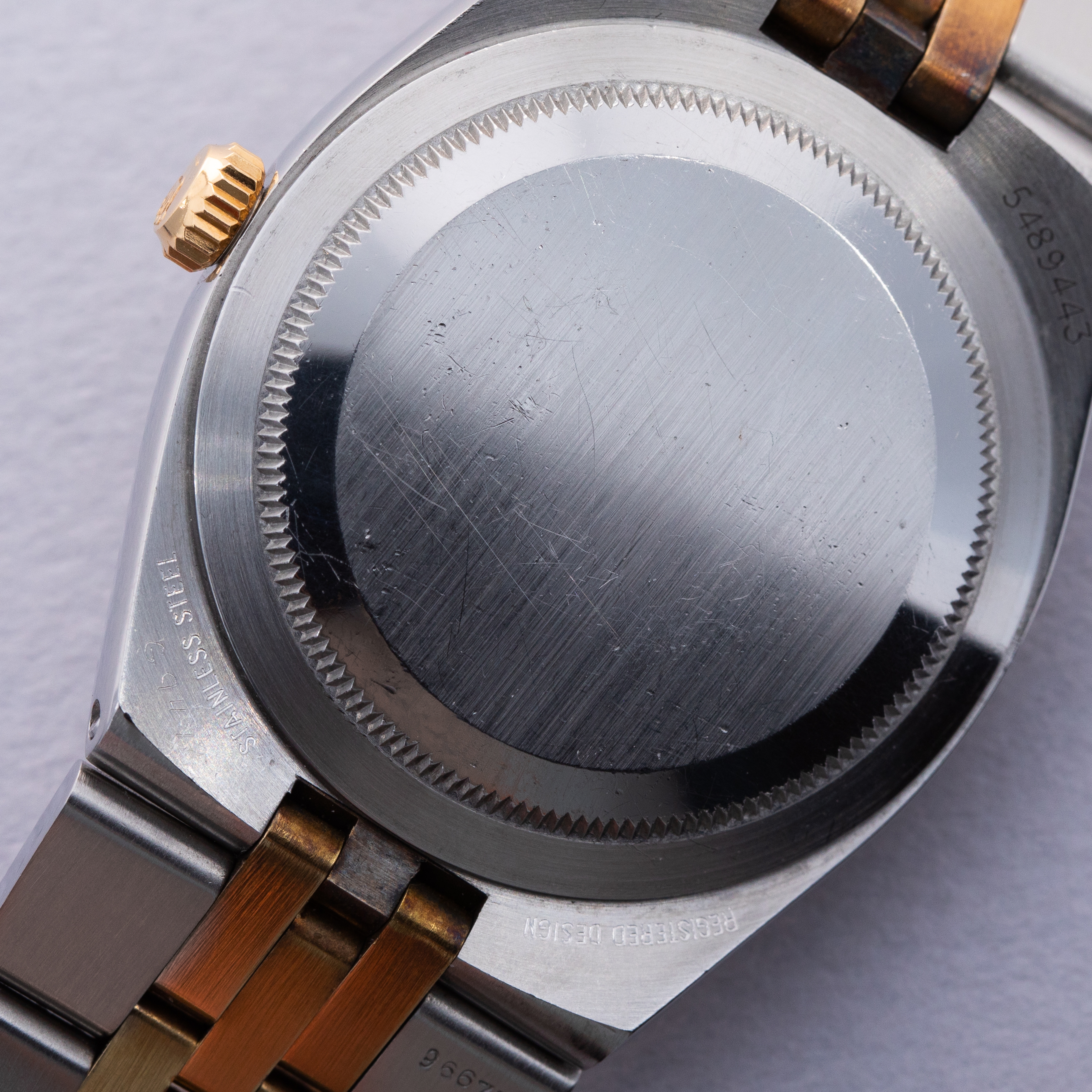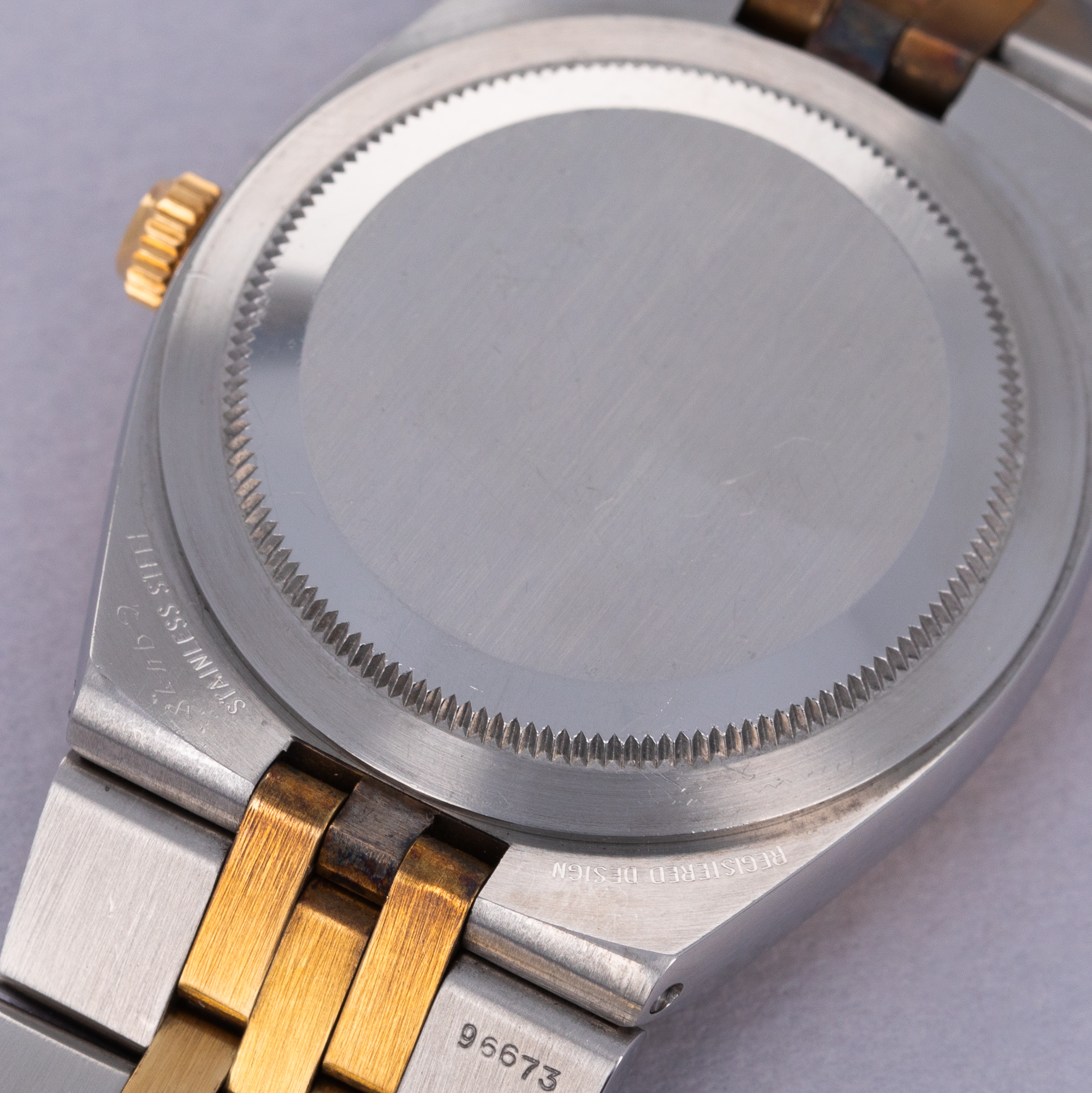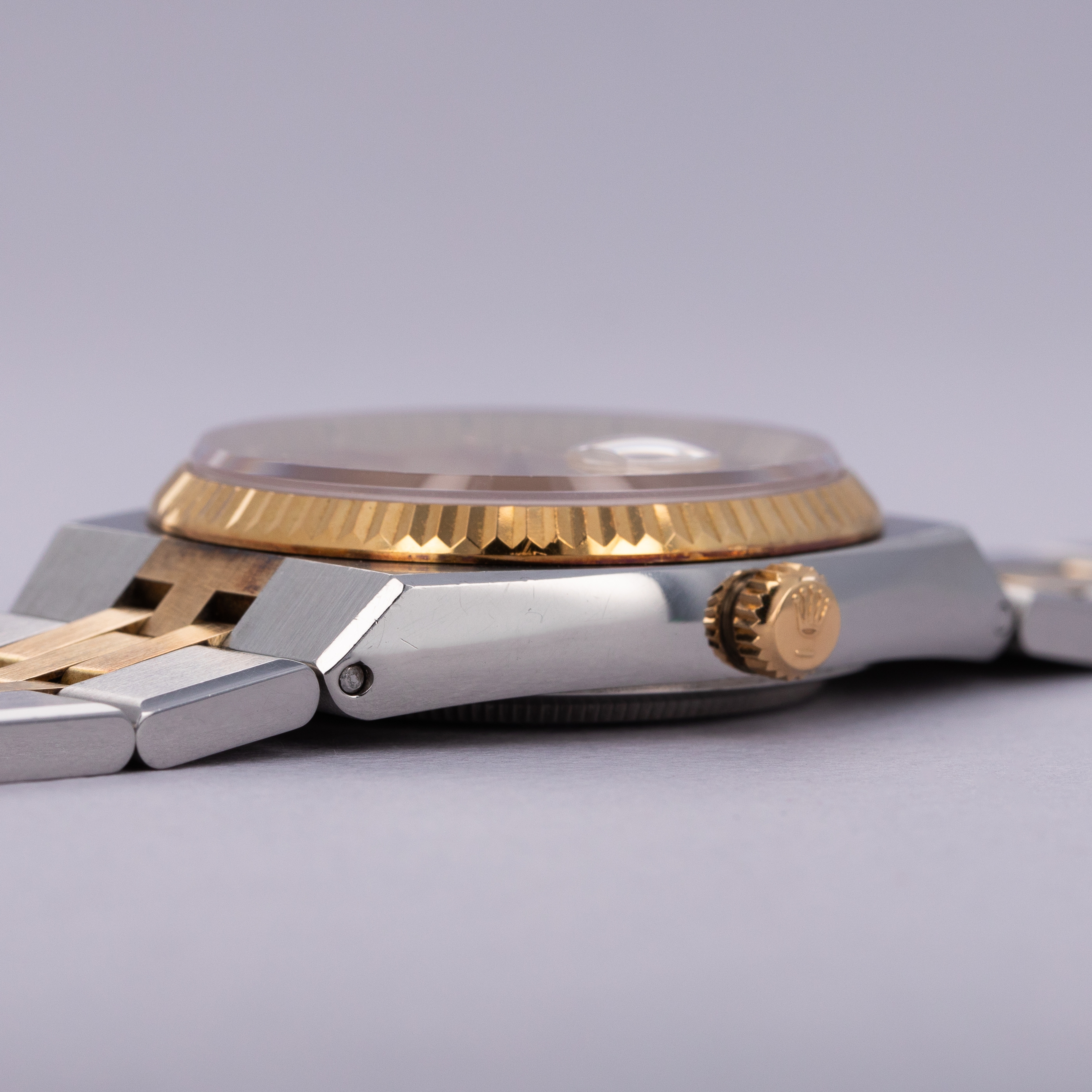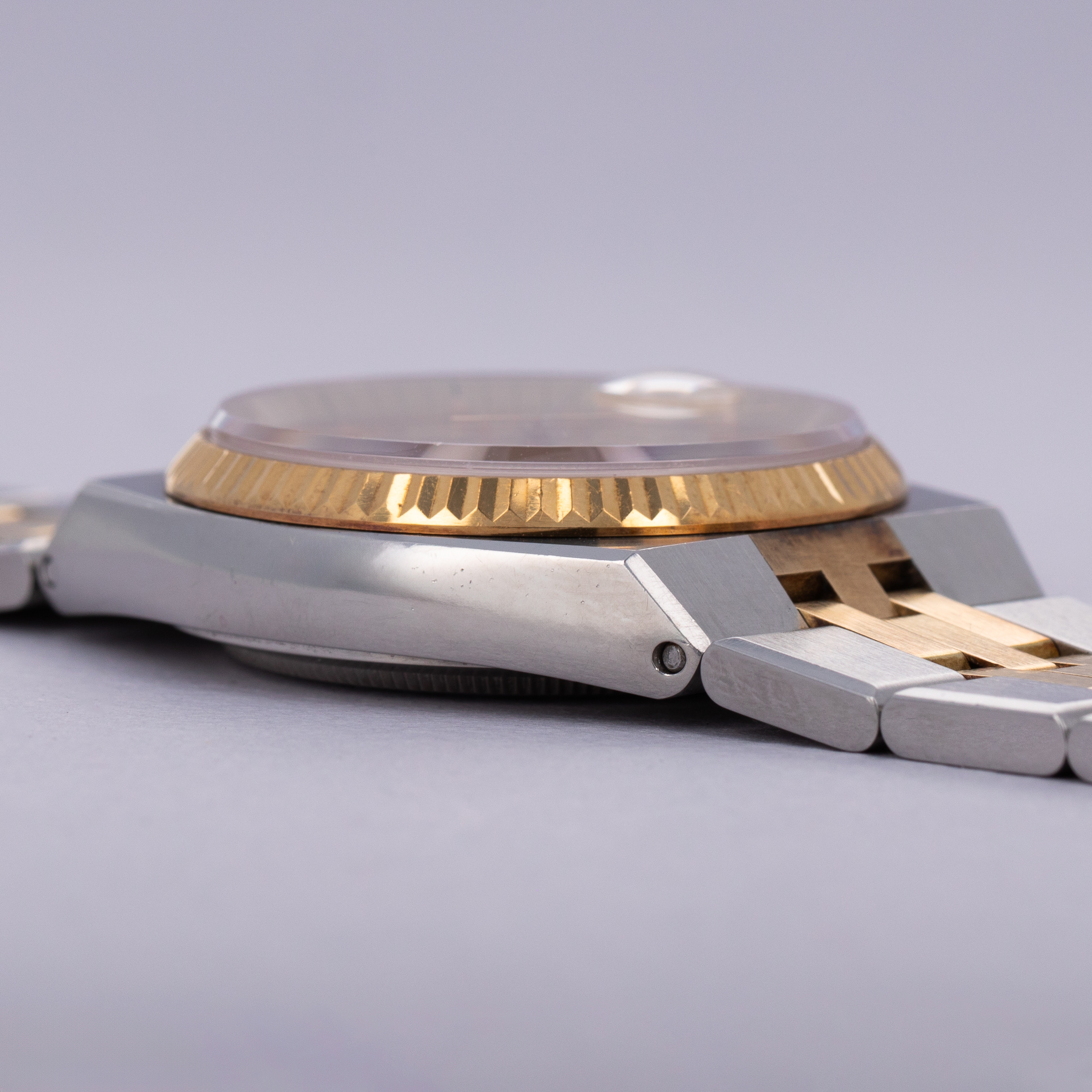 The Rolex Oyster Perpetual Date ref. 1630 stands as a historical timepiece, crafted during Rolex's transition to quartz watches in 1975. Produced alongside its stainless steel sibling, the ref. 1530, the ref. 1630 was discontinued in 1977 just before the the Oysterquartz began production. Boasting the Oysterquartz collection’s angular case, which it was originally designed for, Rolex decided to launch the ref. 1530 and ref. 1630 while they were perfecting their own quartz movement. Besides its angular 36mm two-tone stainless steel and 18kt yellow gold construction, the ref. 1630 houses a sunburst champagne dial with applied index markers and a steep rehaut that includes a minute-scale – a reflection of the construction’s adaptability for the thicker quartz calibre that would soon replace the automatic cal. 1570 movement in the ref. 1530 and ref. 1630. As a part of Rolex's enduring legacy, the Oyster Perpetual Date ref. 1630 symbolizes precision and durability, during a time of genuine uncertainty in the watchmaking industry. A timeless testament to horological excellence, this model remains a distinctive marker in Rolex's unparalleled reputation for precision and durability.