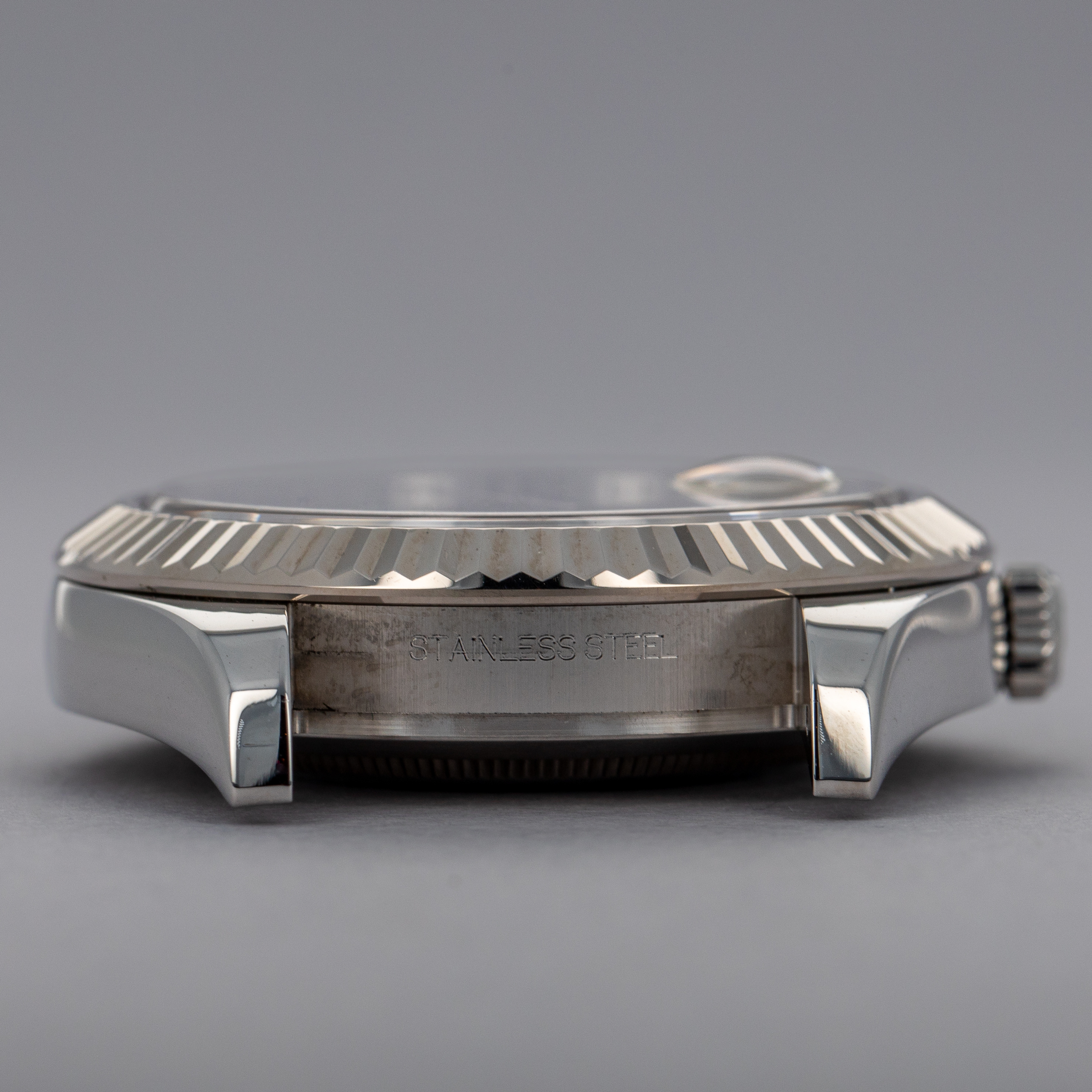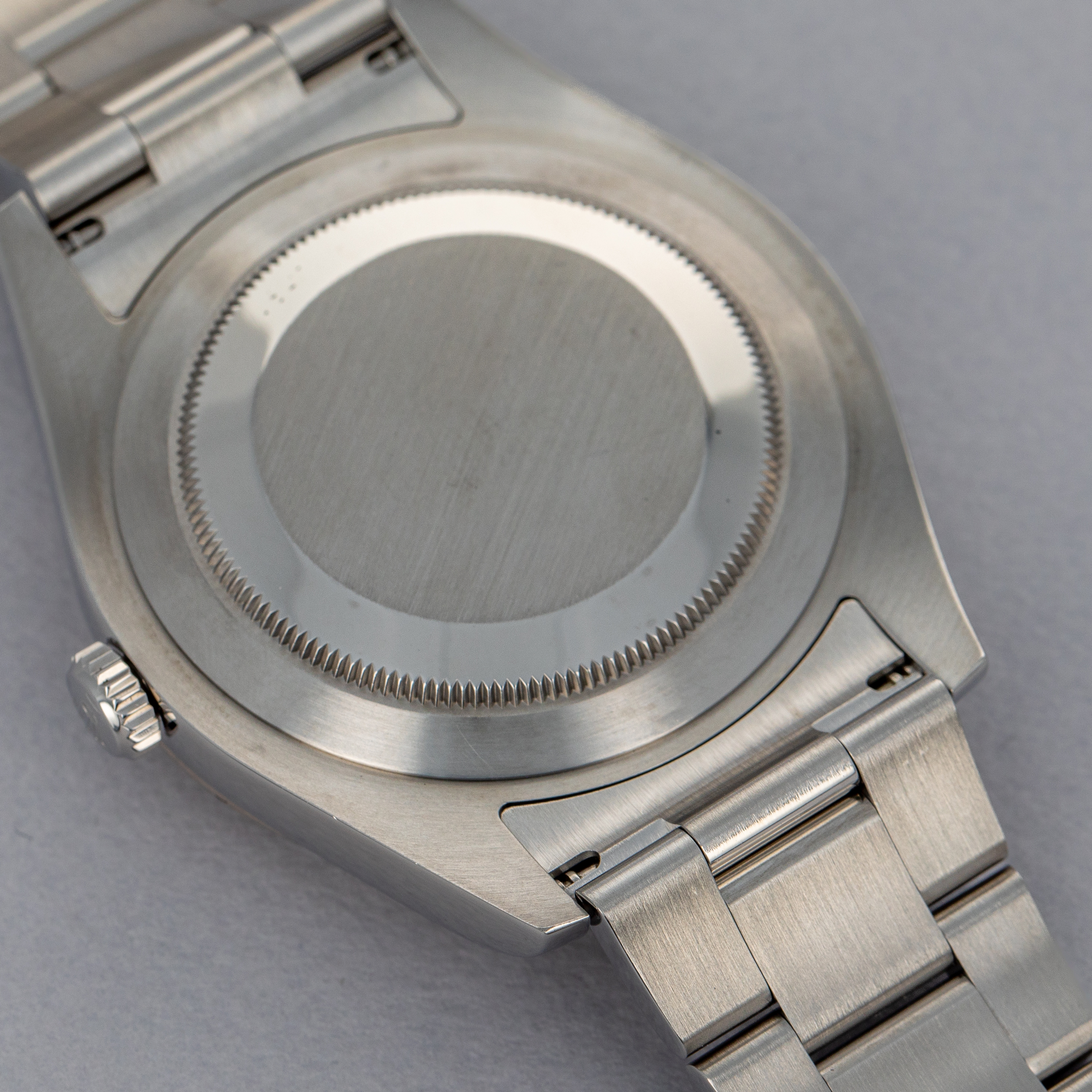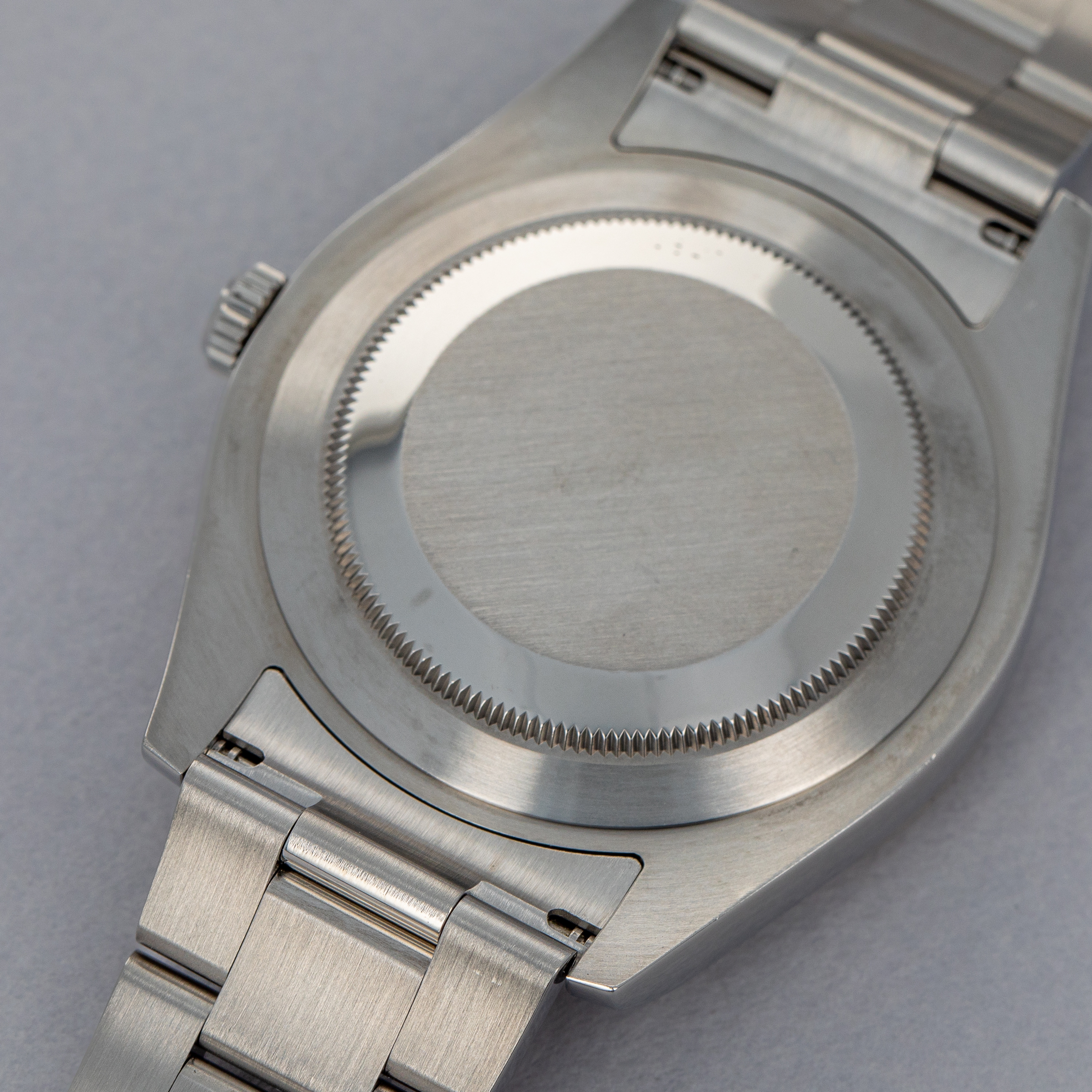 Watch is in near-mint condition. There are minor signs of use, with small scratches visible along the case surface. The back of lugs have minor signs of wear from bracelet removal, and there is a tiny ding visible on the backside edge of one lug, as seen in the images. Bracelet has 12 links currently fitted, with 6 being removable. There is one additional link included on the side.