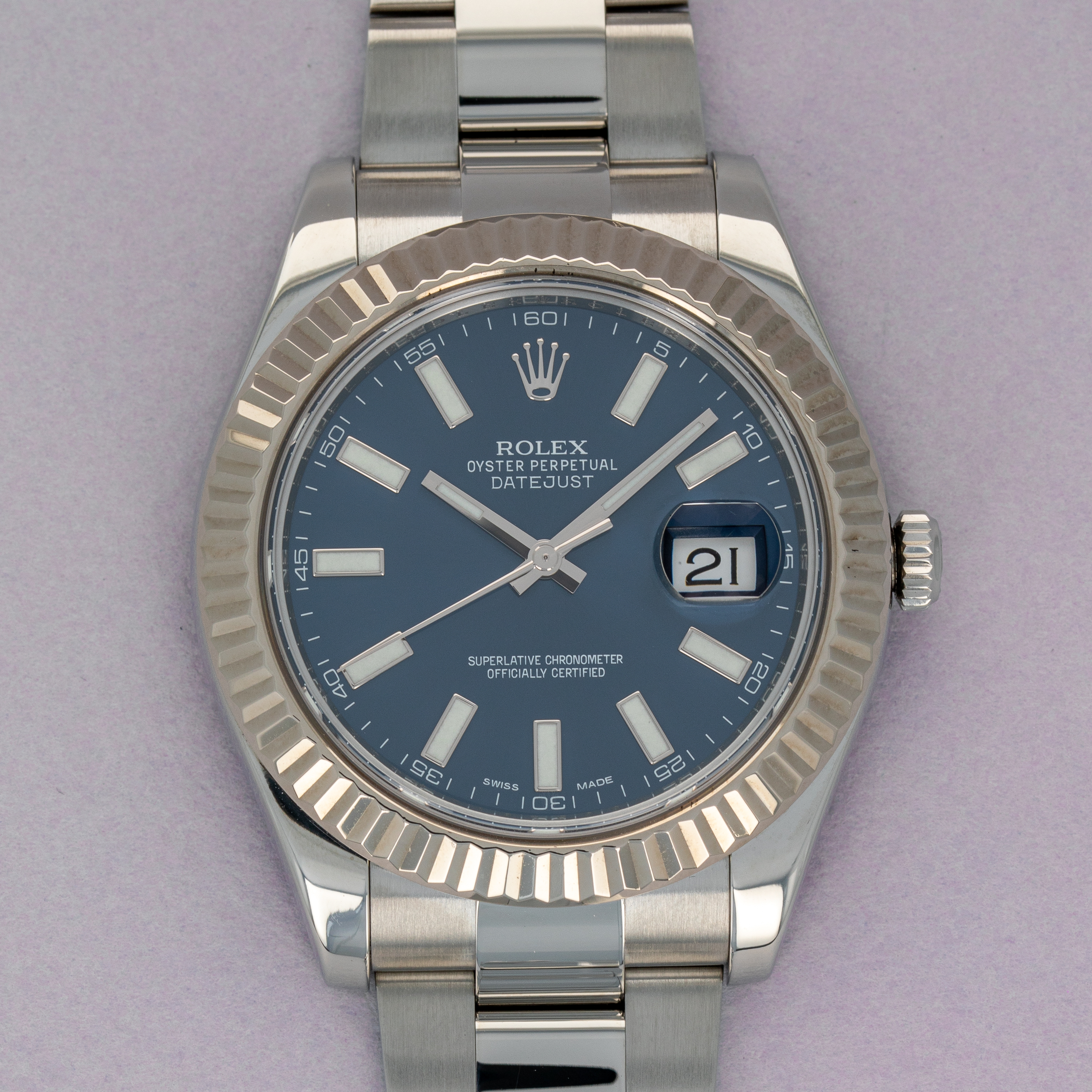 Boasting a stunning blue dial that features a beautiful sunburst pattern, this example's dial displays a variety of blue hues as it sparkles in the light alongside its 18kt white gold fluted bezel and Oyster bracelet.