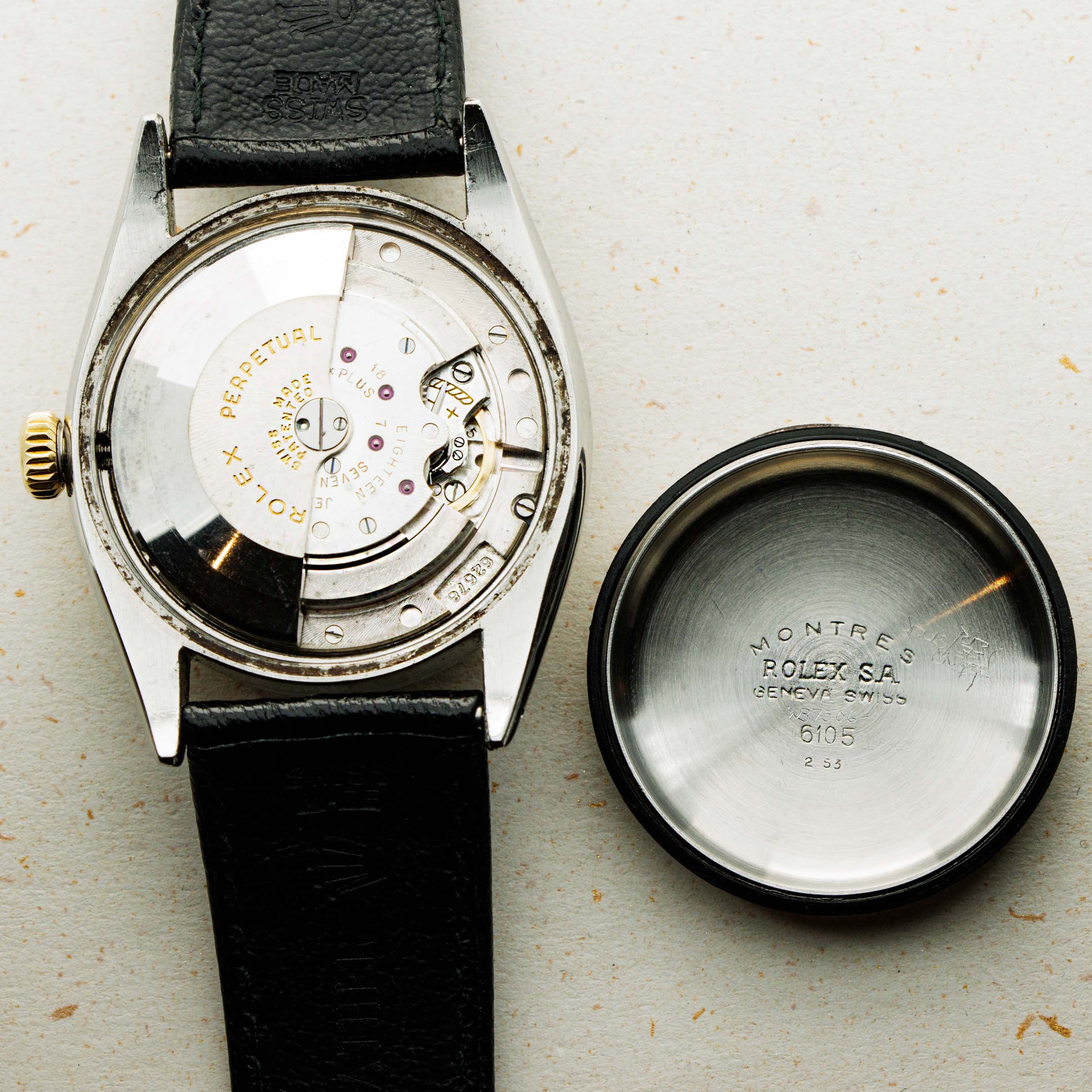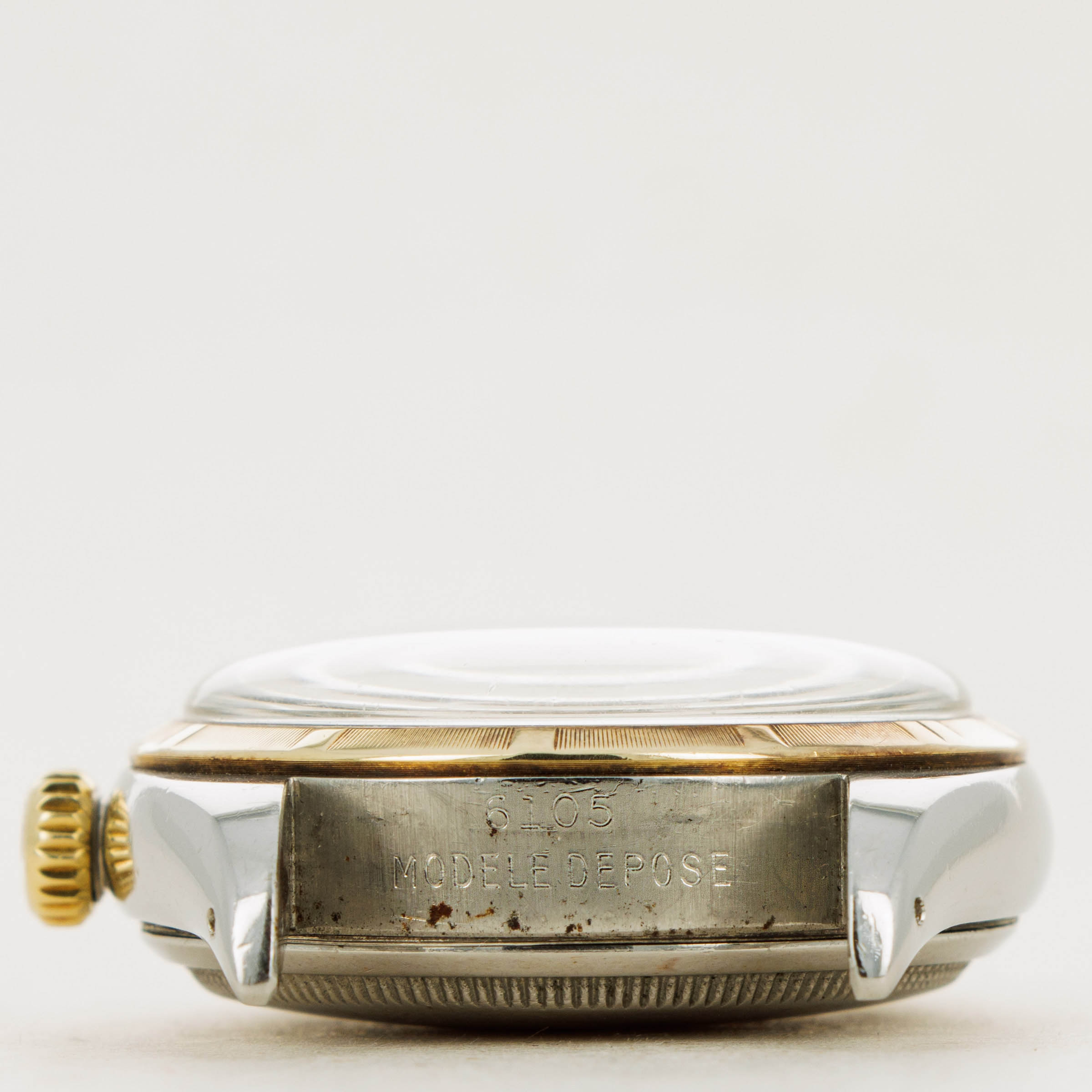 Released to celebrate Rolex's 40th anniversary in 1945, the Rolex Datejust has become one of the Genevan Giant's most iconic watches. The world's first wristwatch to display the date via an aperture on the dial, the Datejust revolutionized wristwatch design for decades to follow. With its emblematic Cyclops lens, jubilee bracelet (designed specifically for the model in 1945), and classy fluted precious metal bezel, the Datejust's aesthetic has always been that of pure elegance and class. Perhaps one of Rolex's most recognizable designs, the Datejust has evolved from its dressier roots into a perfectly capable timepiece rivaling the robustness of most brand's sports watches. However, before the “Datejust” name became as ubiquitous with Rolex as it is now, the ref. 6105 was launched in the mid-1940s as an extension of the Oyster Perpetual collection, but with the addition of a date function at 3 o’clock, like a precursor to the Datejust. A large watch for its time, the ref. 6105 sports a 36mm diameter case, but thanks to its bubbleback, the ref. 6105 earned the nickname “Ovettone” meaning “big egg” in Italian. This enlarged case made room for the ref. 6105’s newly introduced date wheel module on the movement and thereby allowed it to precede one of watchmaking’s most iconic models.