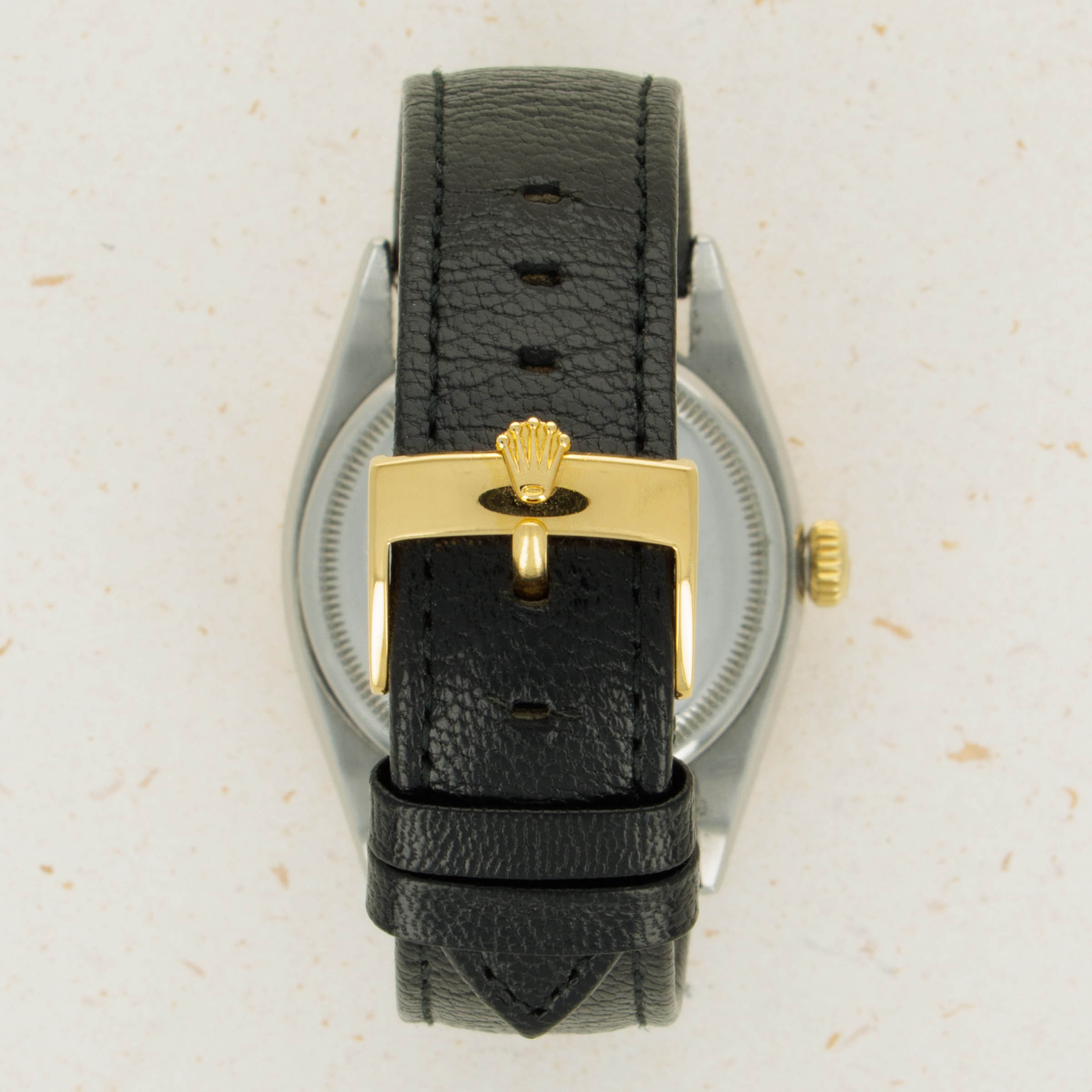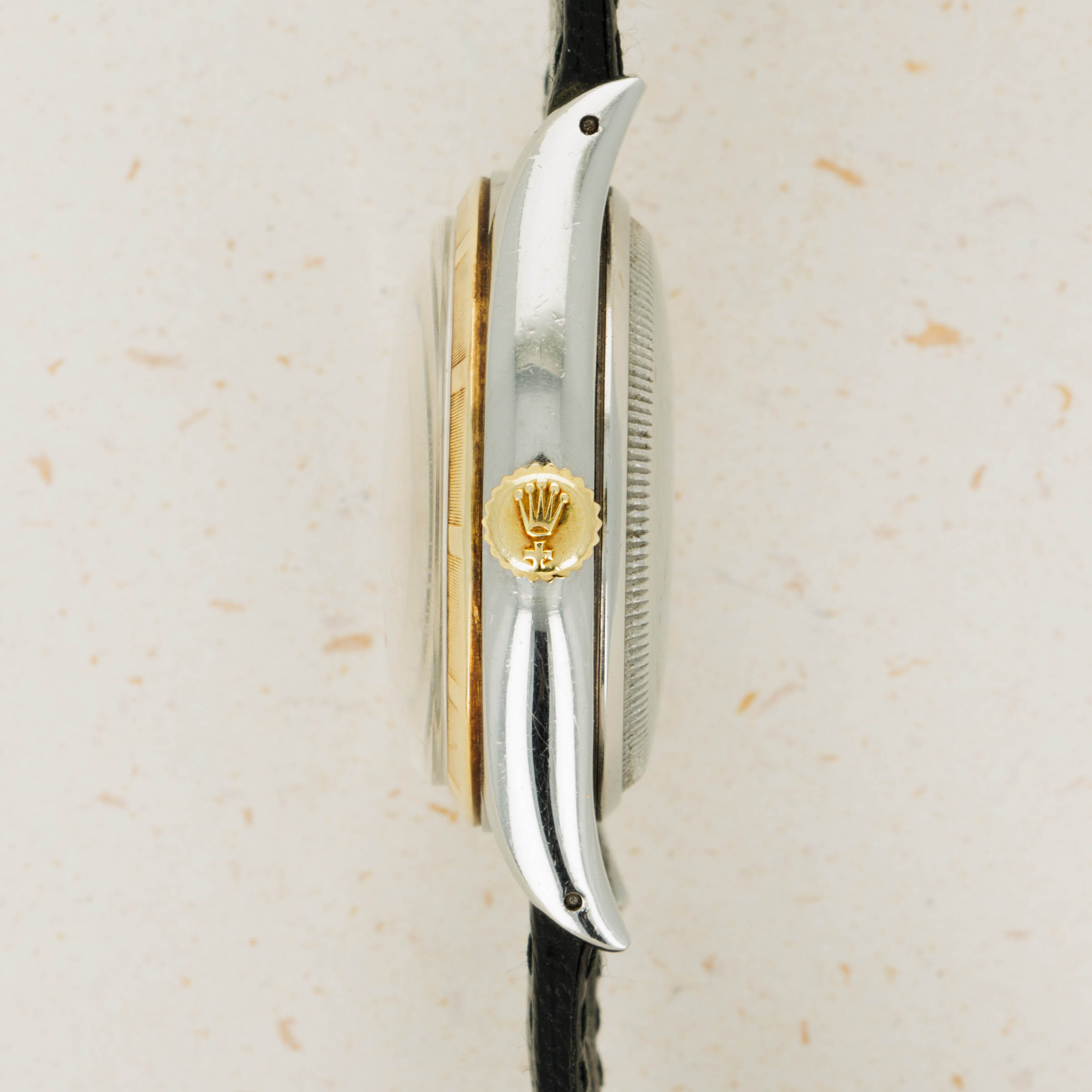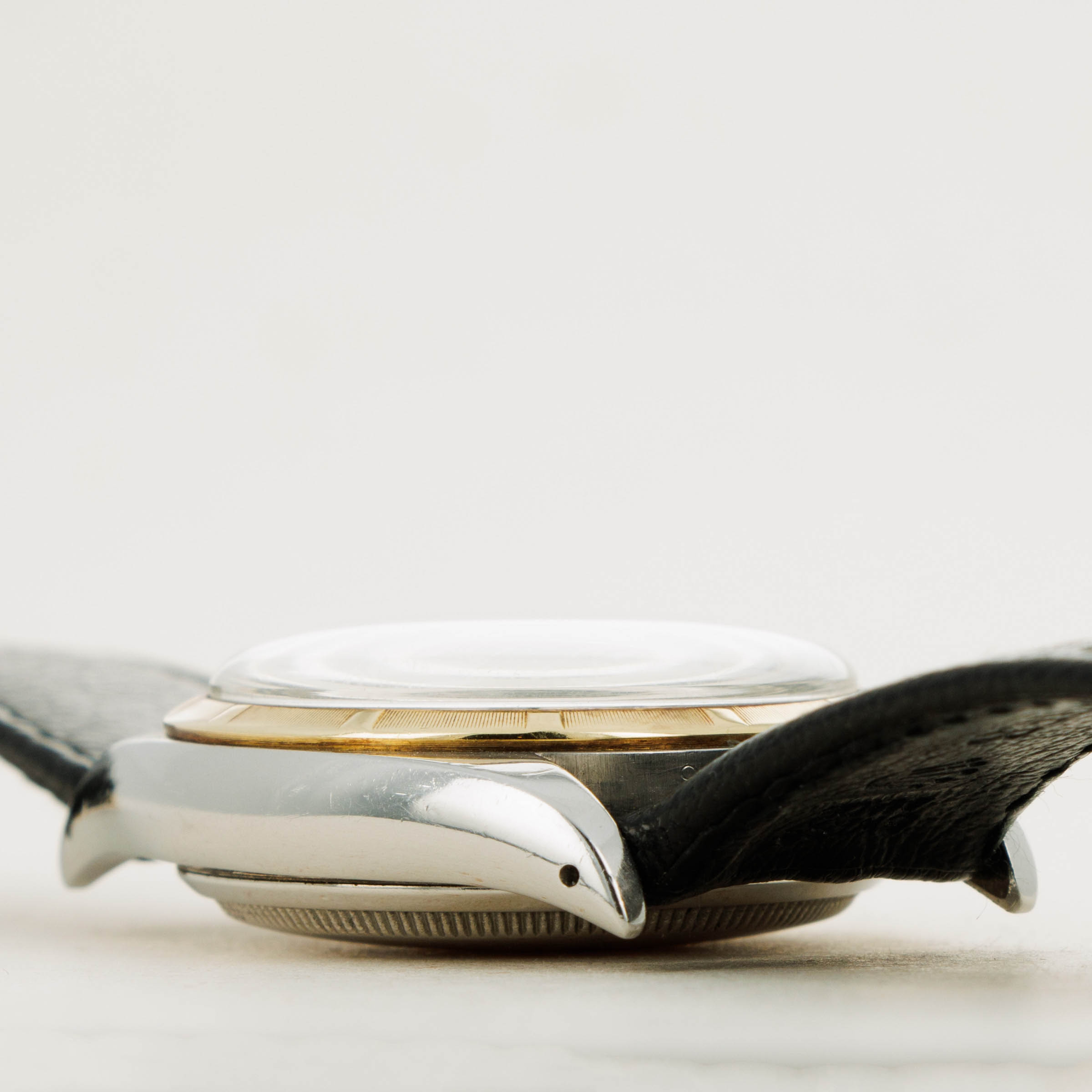 Featuring a beautiful black dial with gold dauphine hands and gold dagger-shaped applied hour markers, this ref. 6105's gilt inscriptions pair perfectly with the aesthetic of the rest of its dial and its two-tone construction.