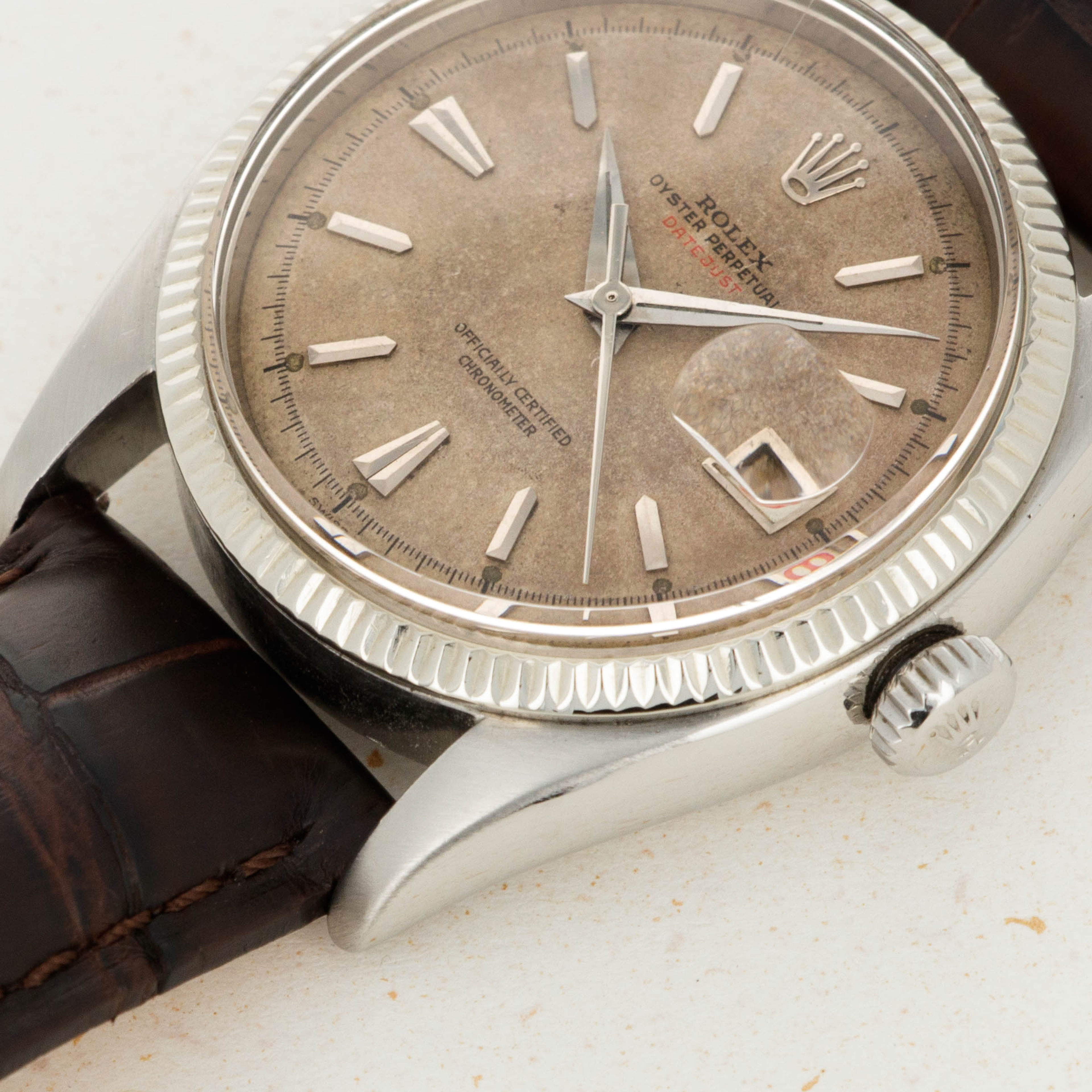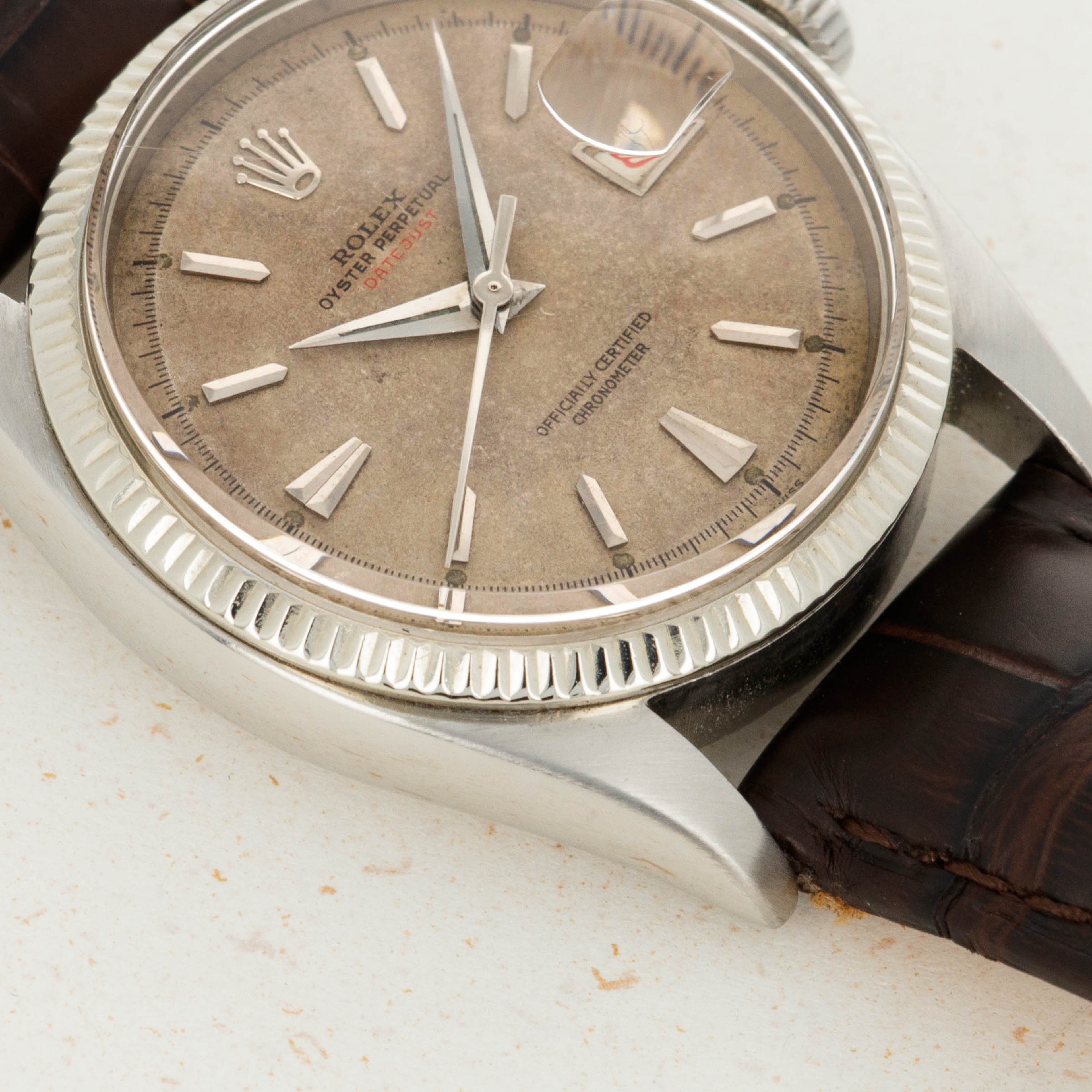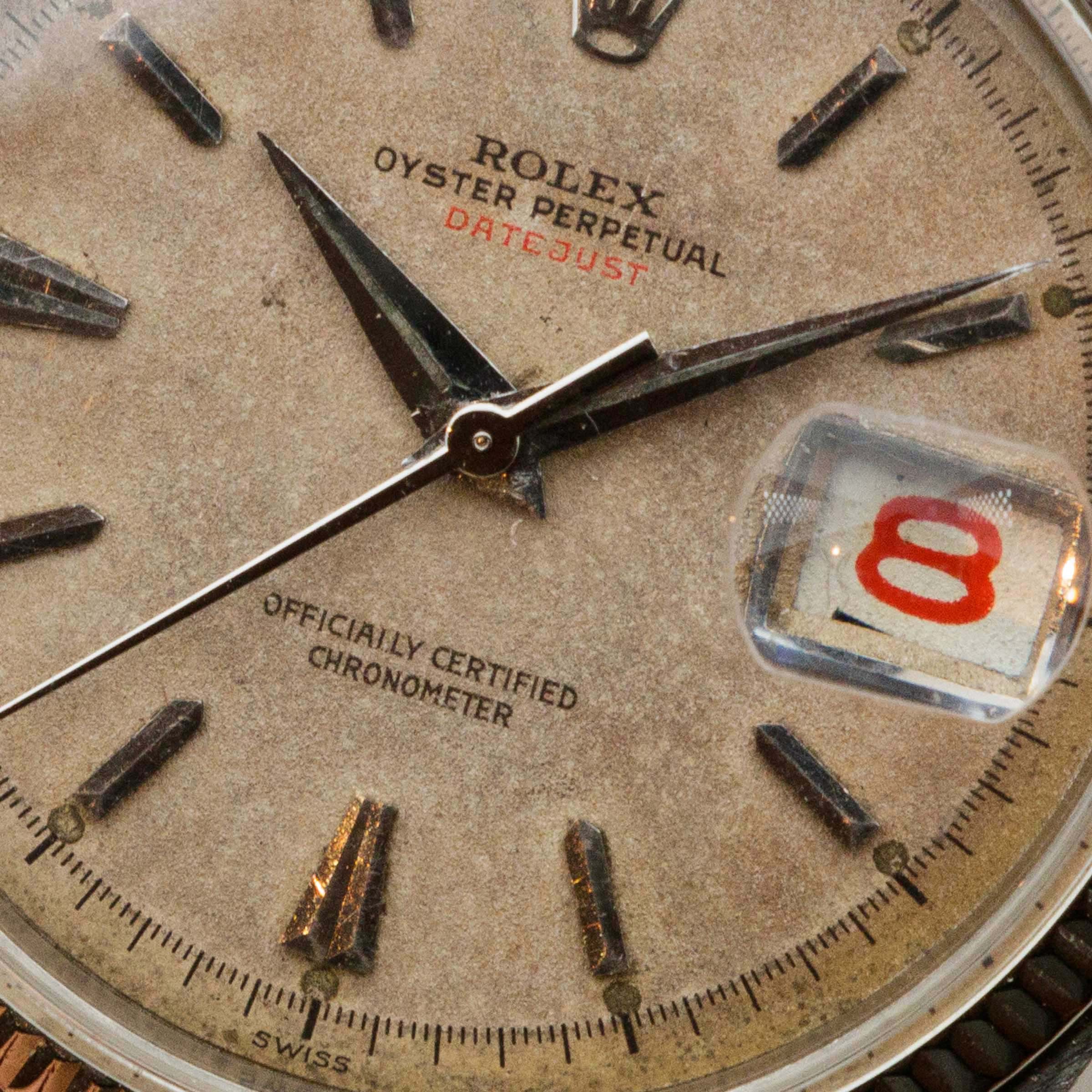 Featuring a beautifully colored dial and the word Datejust in red, this example has aged to include a deep beige color with sharp applied indices and hands.