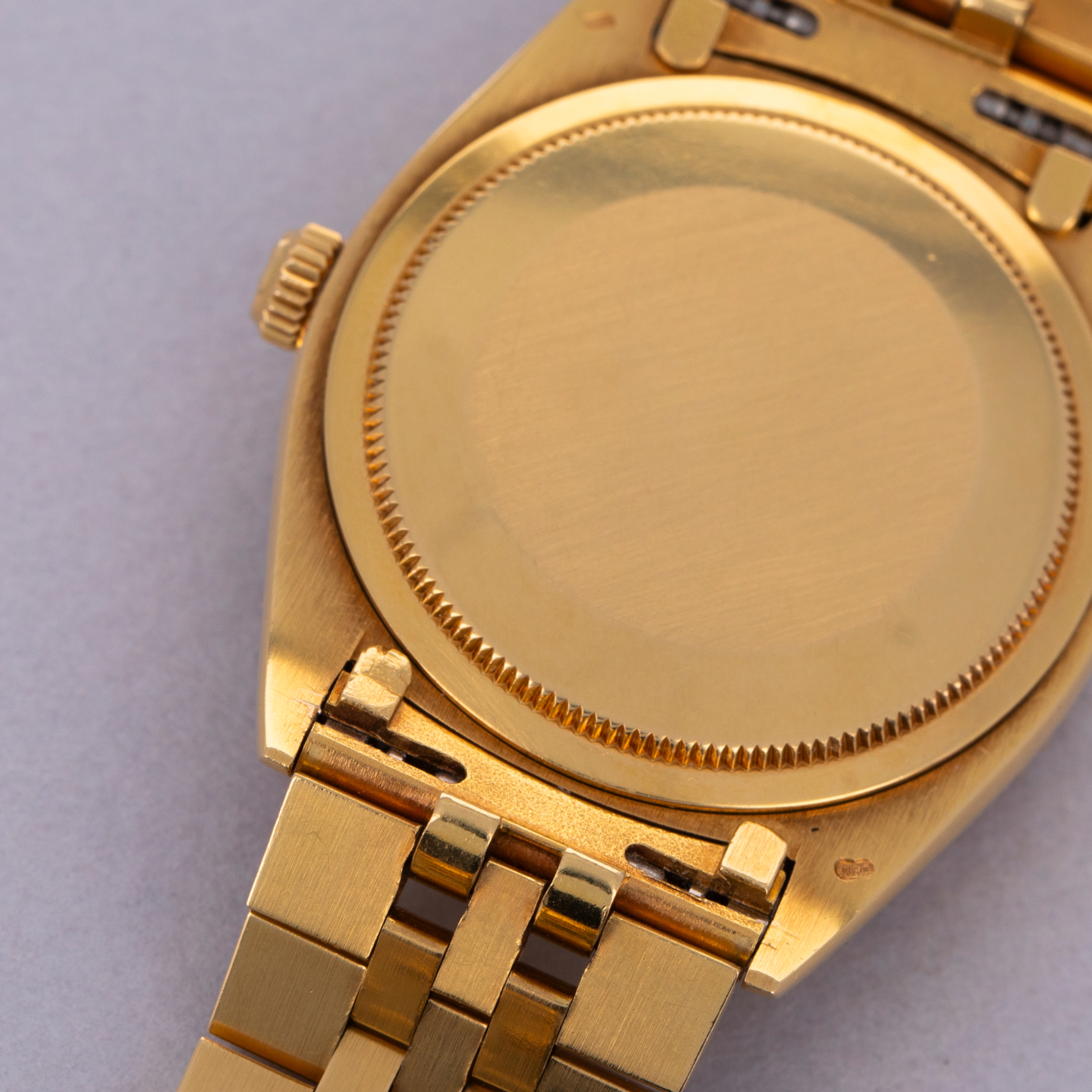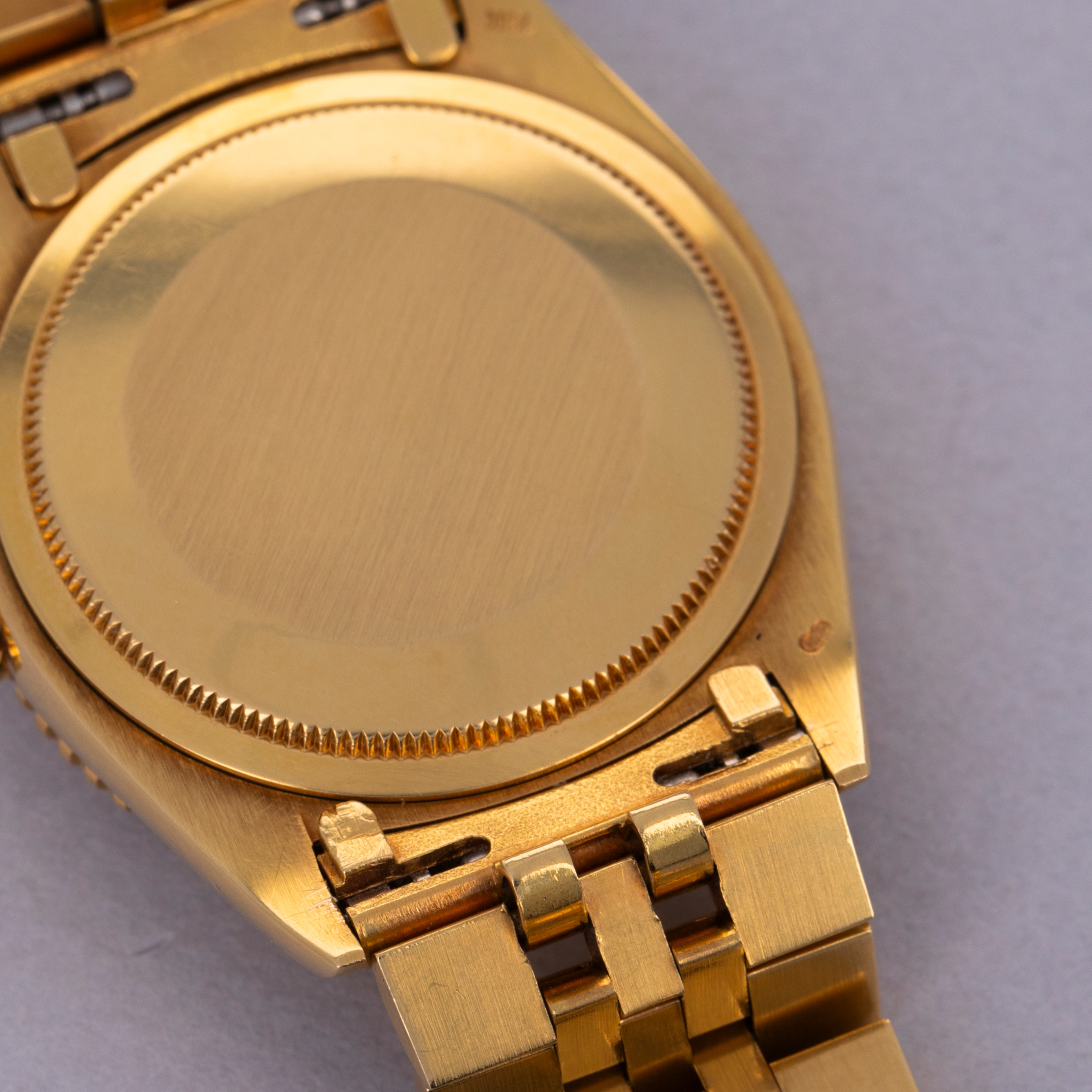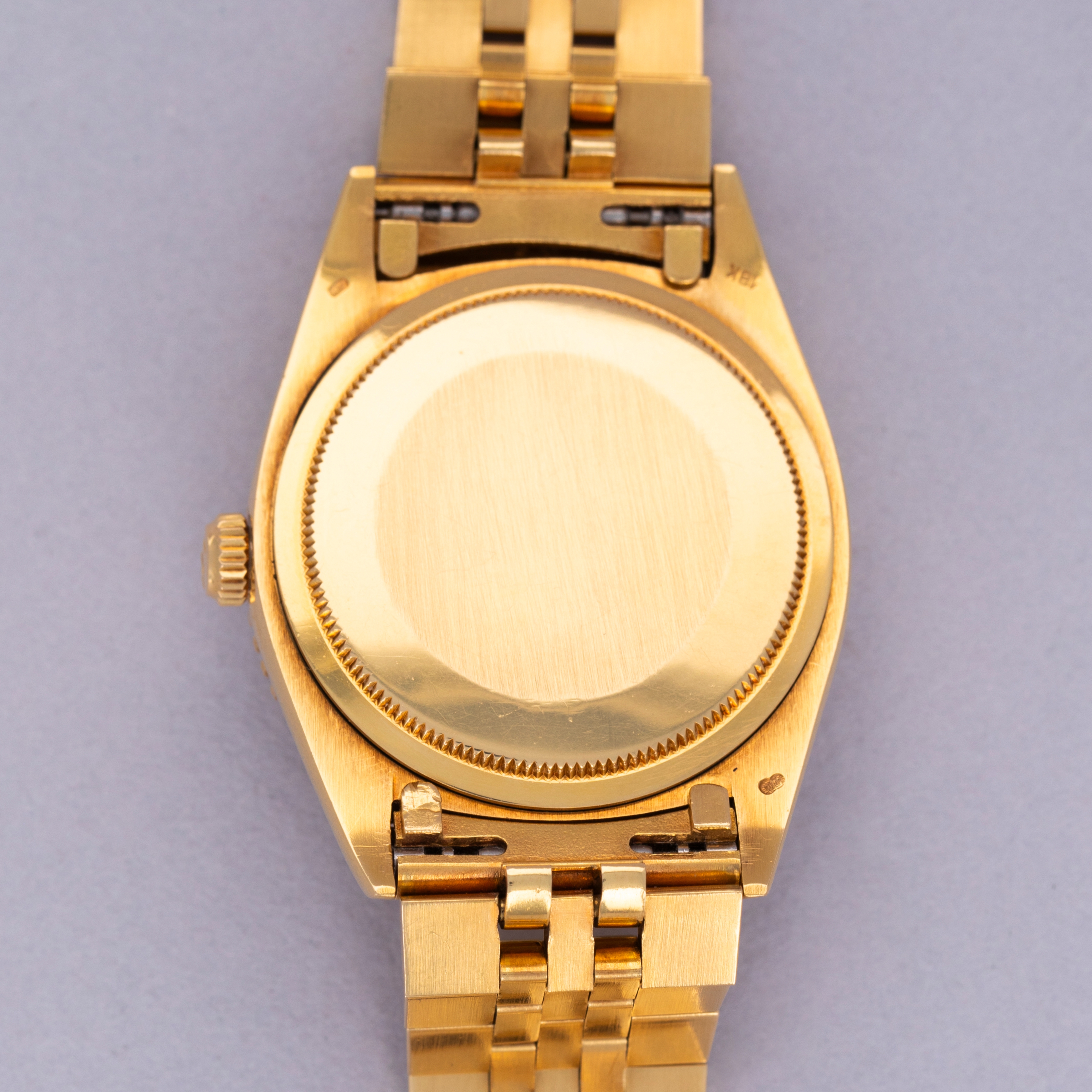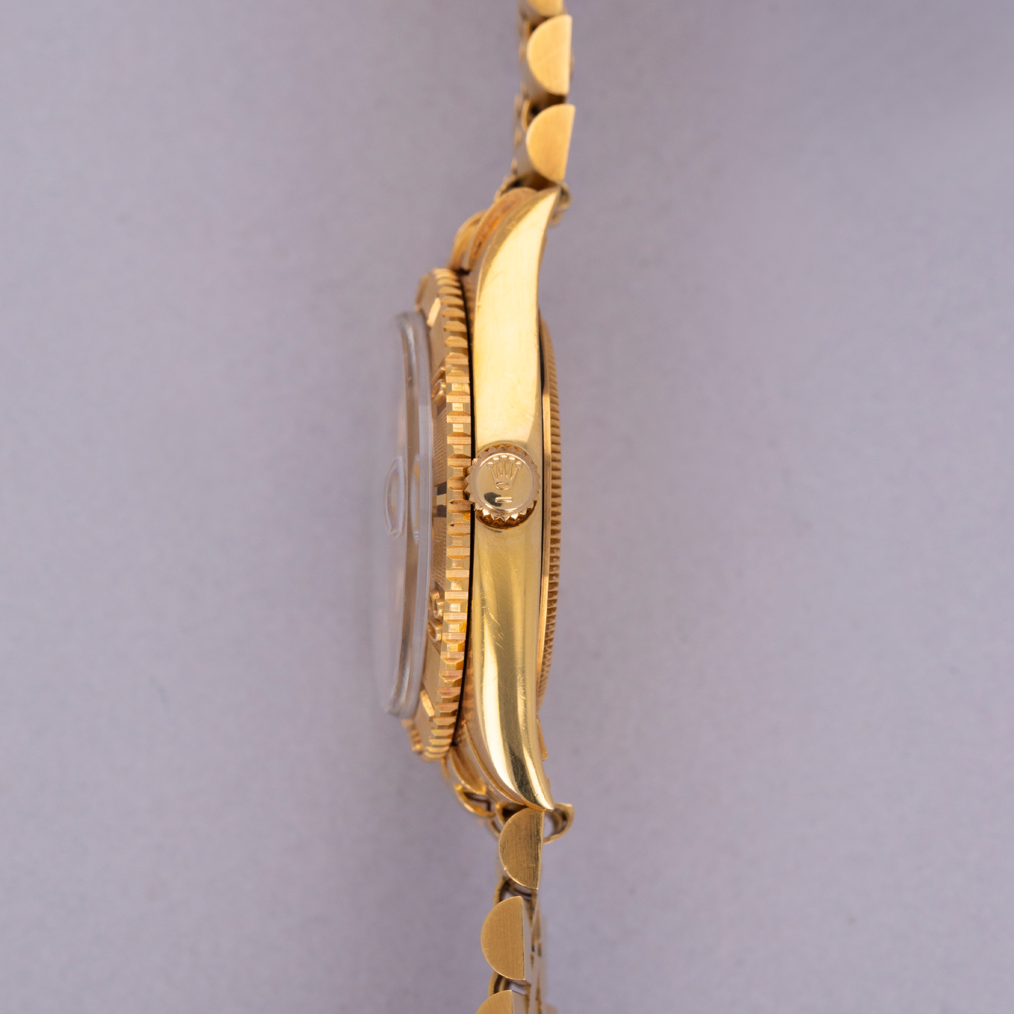 Watch is in excellent overall condition. Case shows minor wear, but edges are crisp and the bezel and insert are well defined with minimal wear. Caseback had an engraving on that has been removed. There is a small dent in the central flat part of the caseback but it is not visible from the interior surface. Original champagne dial in excellent condition with little to no signs of aging. The watch comes on a hidden clasp jubilee bracelet in 18k YG with 21 links total. It fits an approximately 7 1/4" wrist and shows minor stretch.