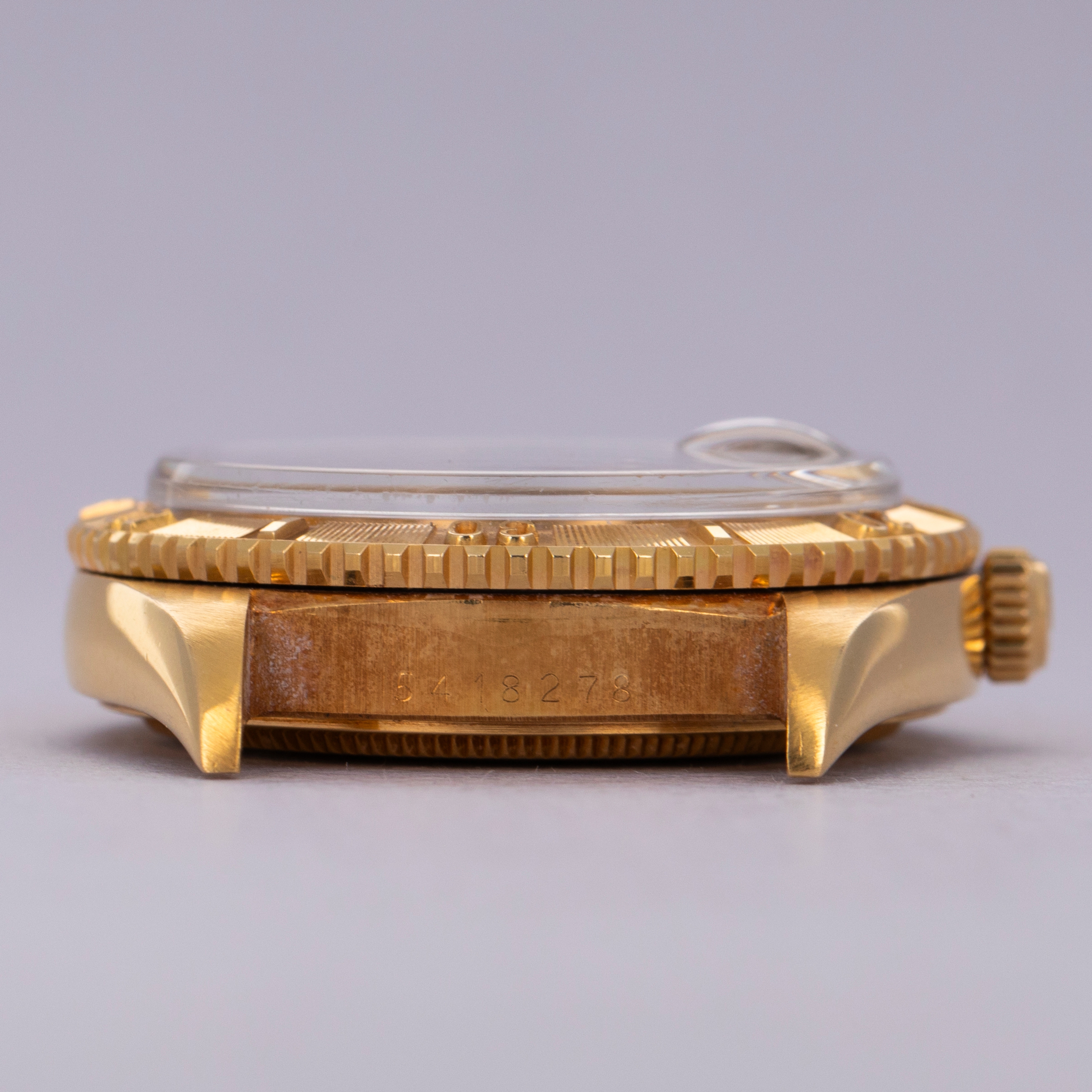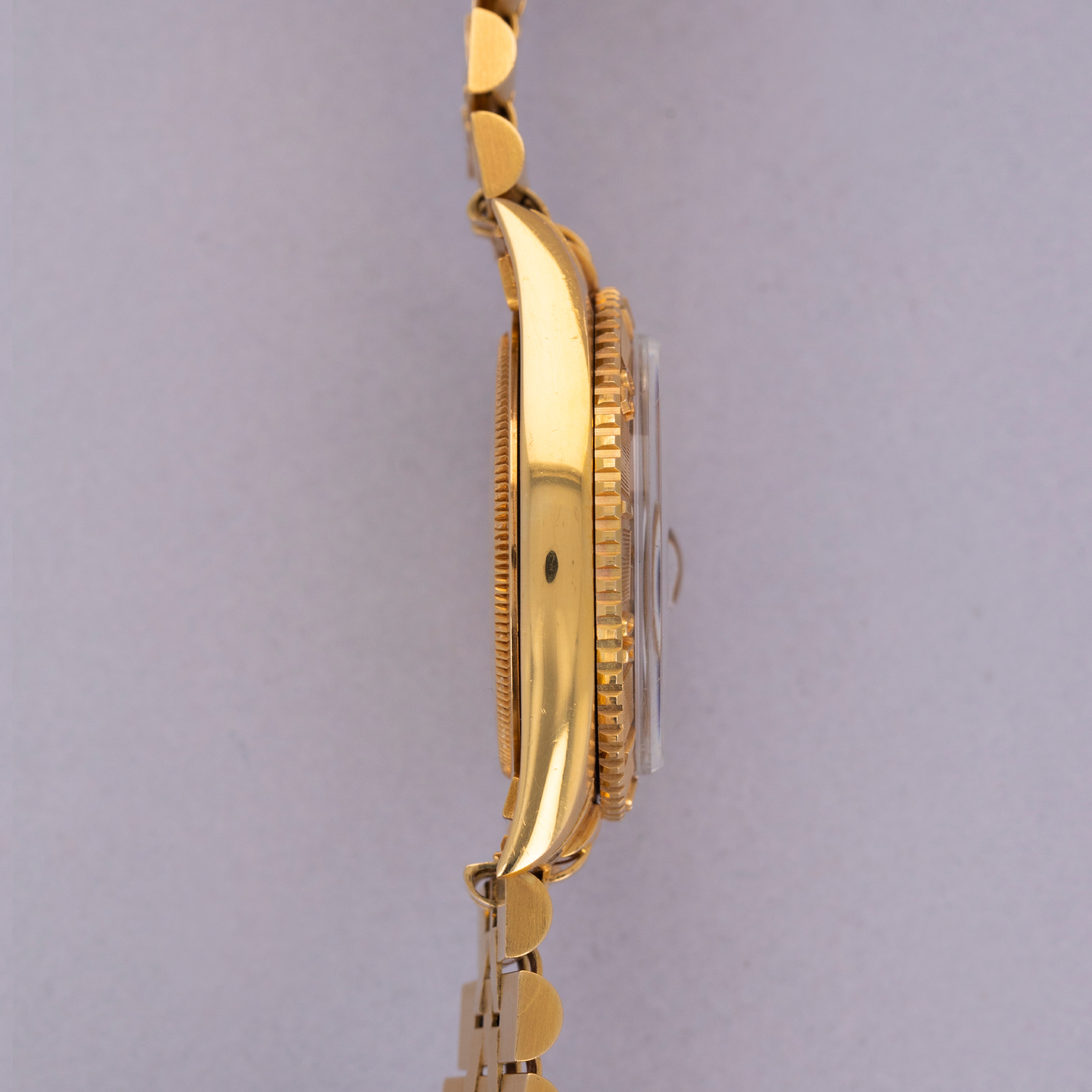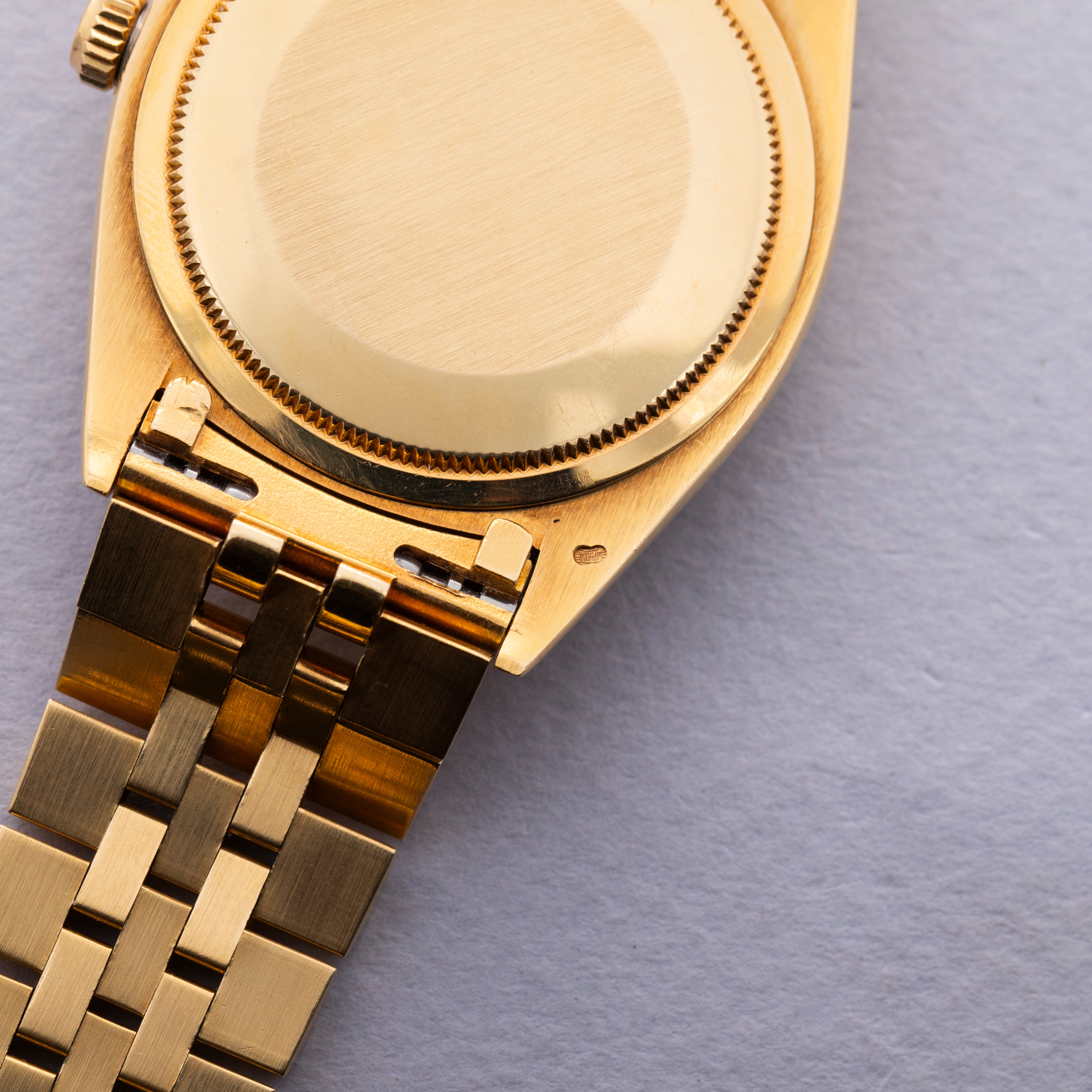 Watch is in excellent overall condition. Case shows minor wear, but edges are crisp and the bezel and insert are well defined with minimal wear. Caseback had an engraving on that has been removed. There is a small dent in the central flat part of the caseback but it is not visible from the interior surface. Original champagne dial in excellent condition with little to no signs of aging. The watch comes on a hidden clasp jubilee bracelet in 18k YG with 21 links total. It fits an approximately 7 1/4" wrist and shows minor stretch.