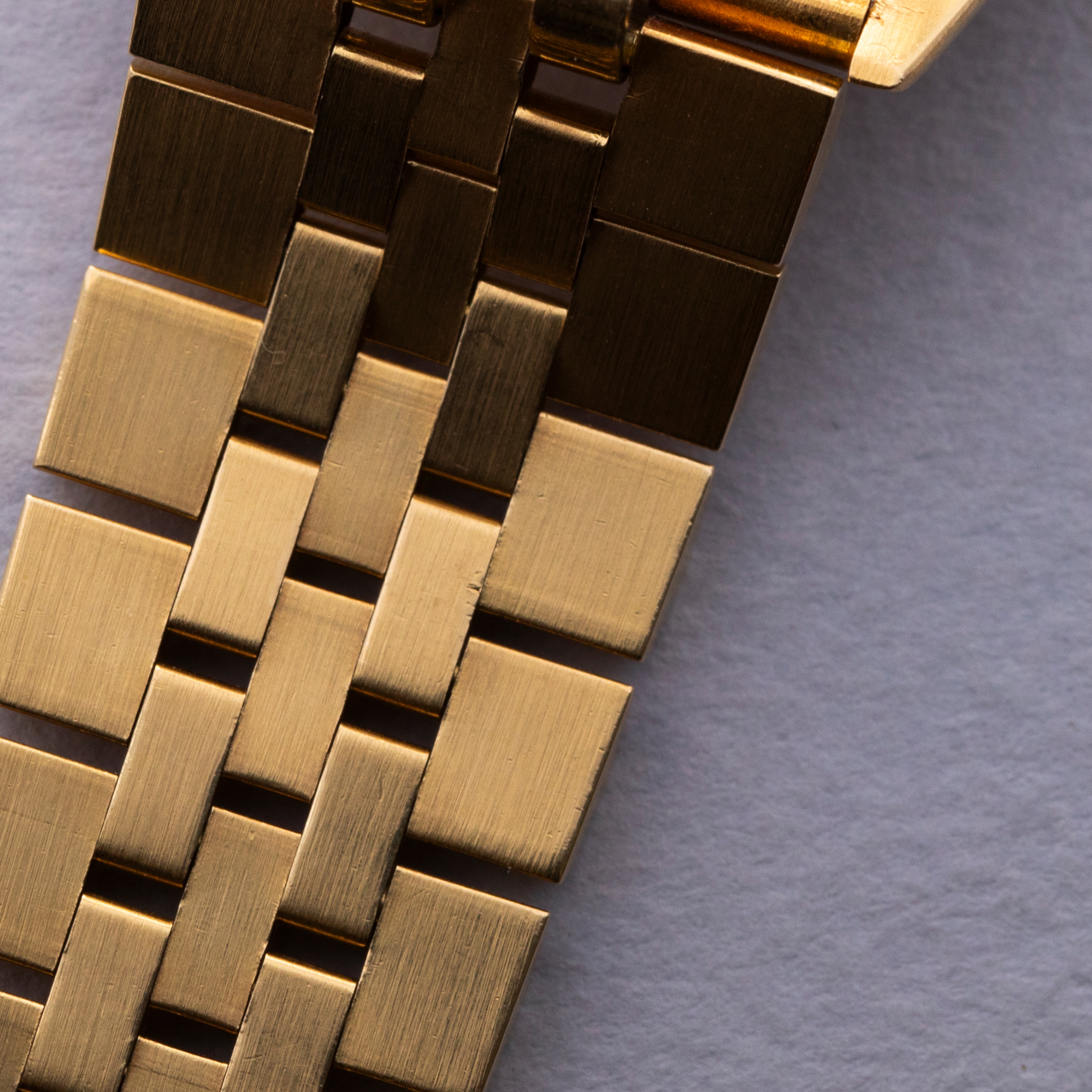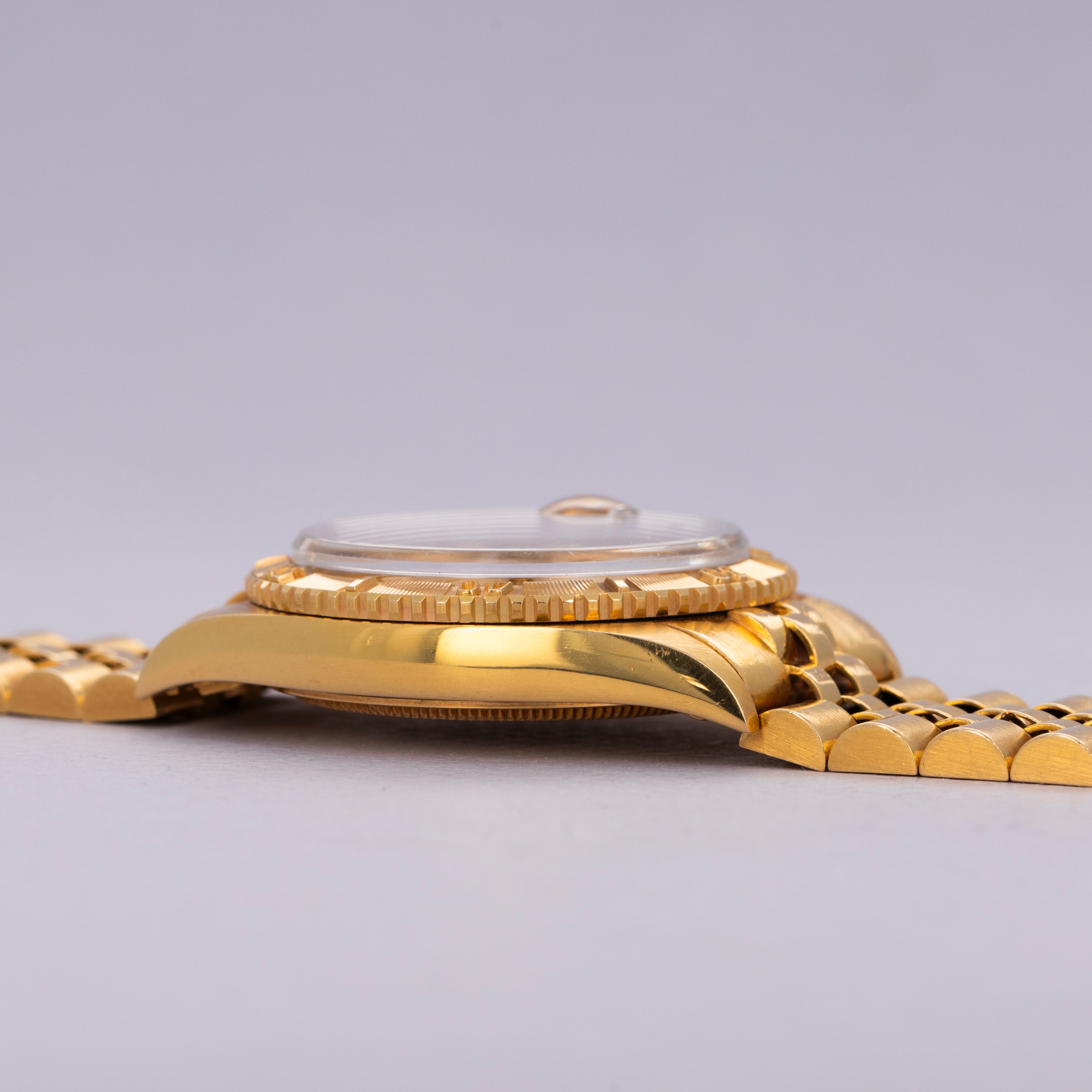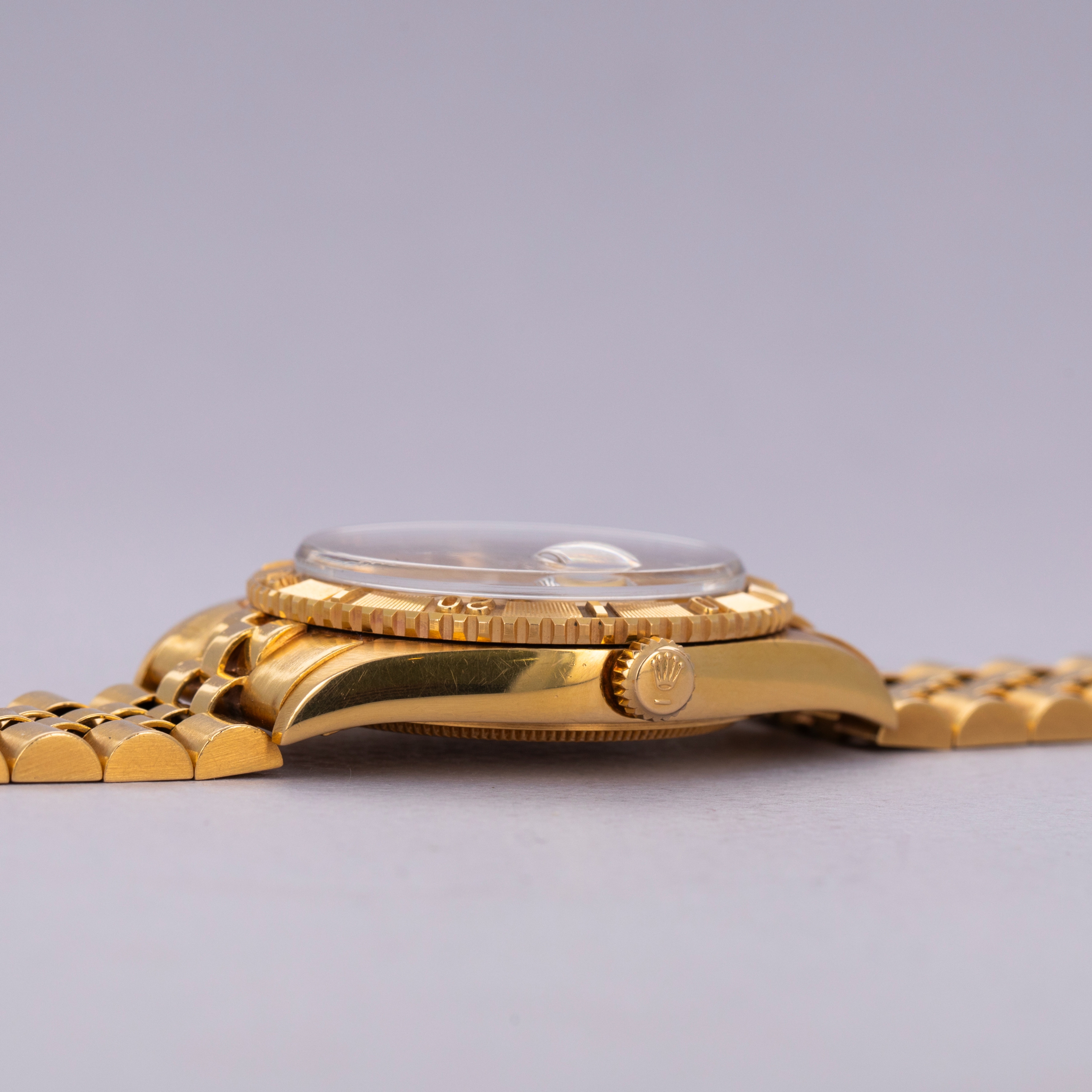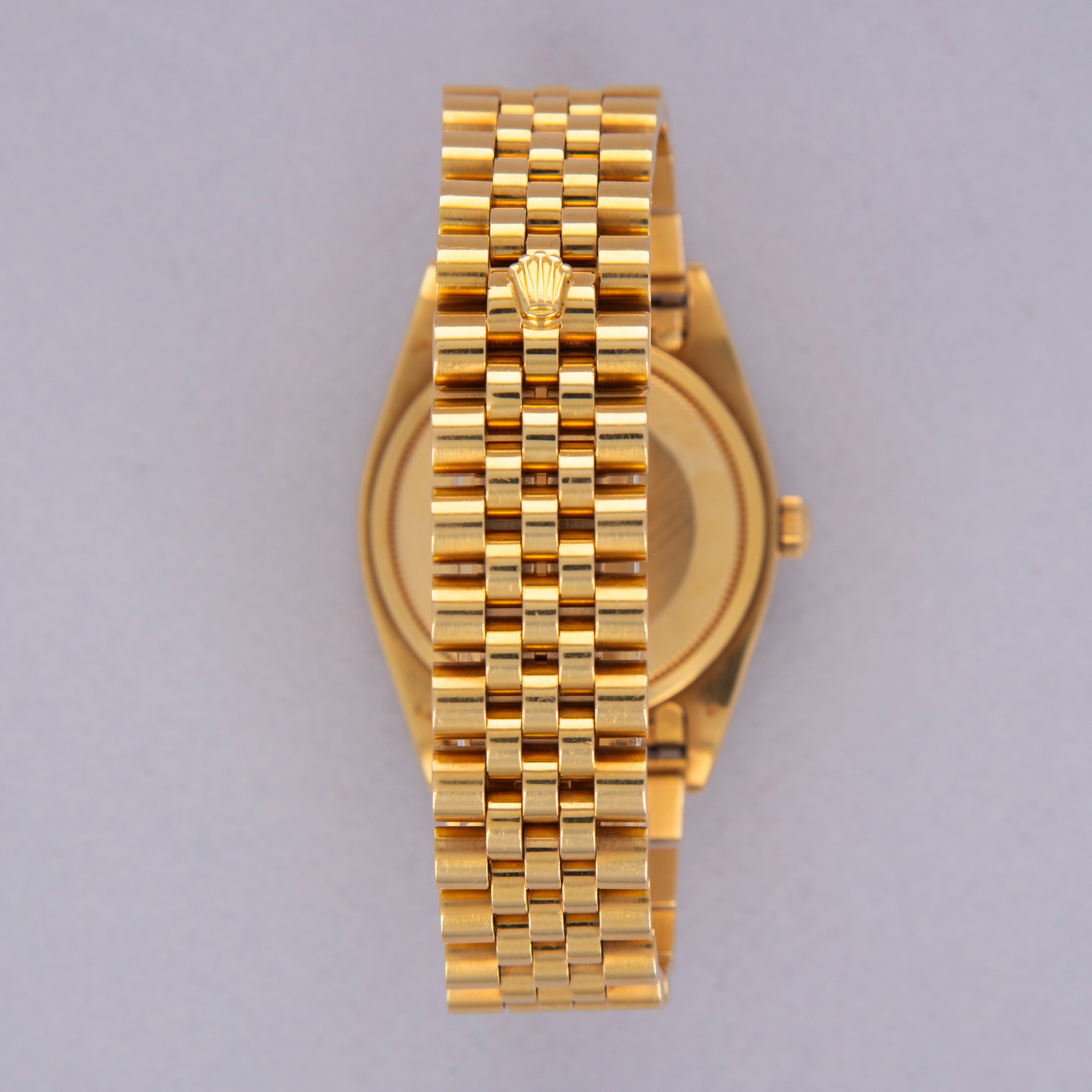 Watch is in excellent overall condition. Case shows minor wear, but edges are crisp and the bezel and insert are well defined with minimal wear. Caseback had an engraving on that has been removed. There is a small dent in the central flat part of the caseback but it is not visible from the interior surface. Original champagne dial in excellent condition with little to no signs of aging. The watch comes on a hidden clasp jubilee bracelet in 18k YG with 21 links total. It fits an approximately 7 1/4" wrist and shows minor stretch.
