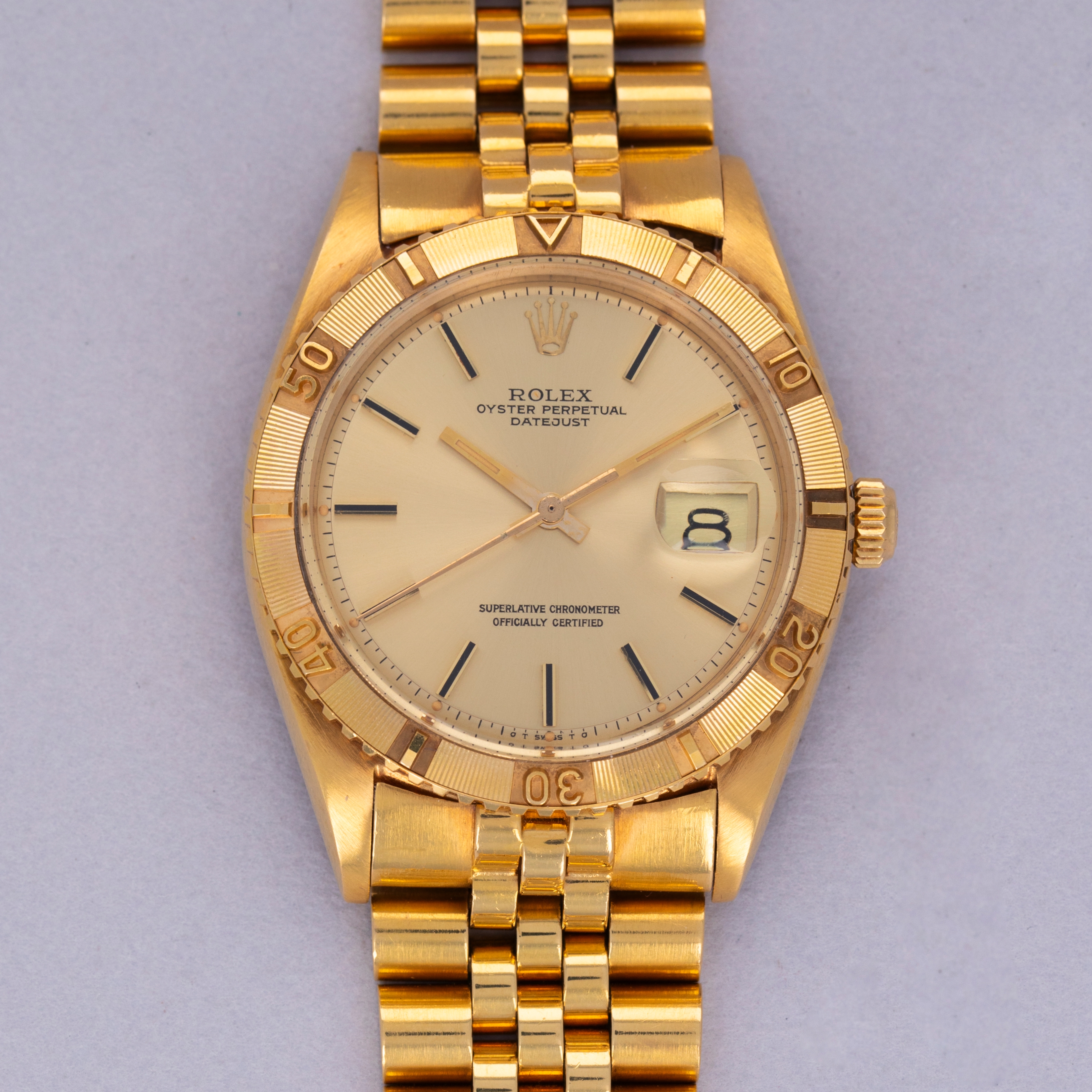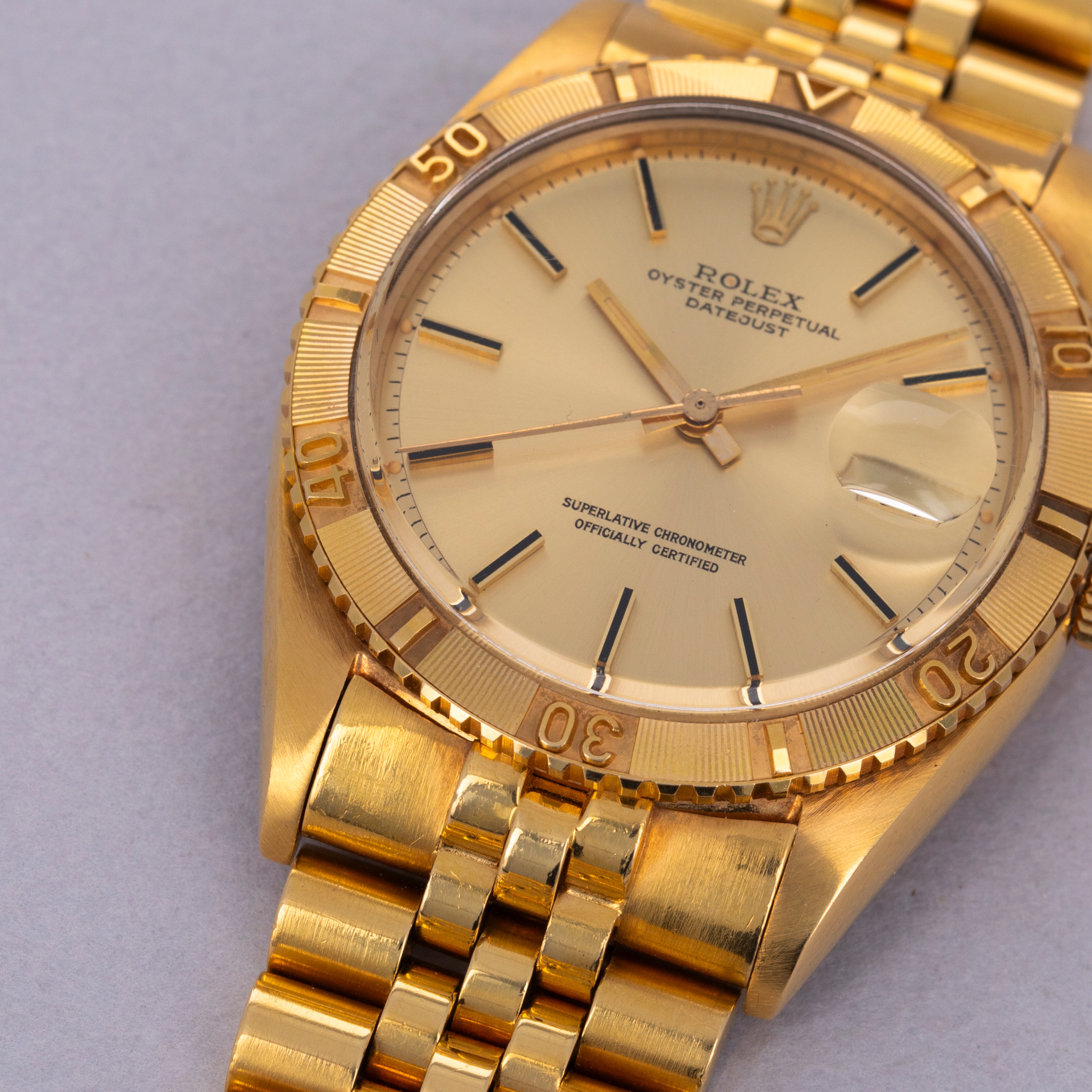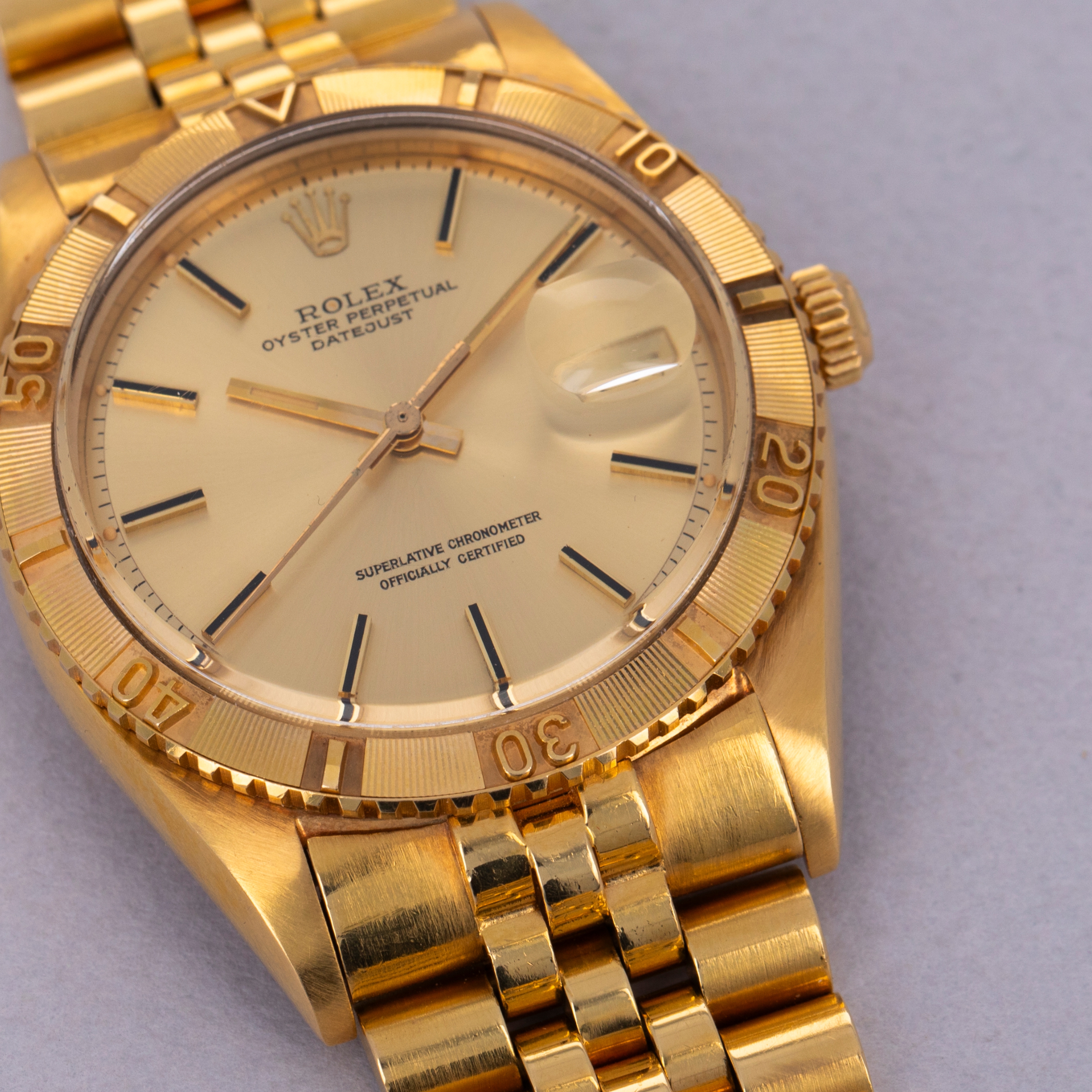 Initially launched in 1953, the Rolex Turn-O-Graph's release sparked an exciting turning point in the brand’s rich horological history. Considered Rolex's first serially produced tool watch, the Turn-O-Graph was iconic for its eponymous feature; its bidirectional rotatable bezel. Armed with such a useful function, the Turn-O-Graph was designed to measure and record time much like a chronograph. Marketed to international business travellers, the Turn-O-Graph was presented as a tool to perform quick calculations due to its bezel. As such, the Turn-O-Graph was chosen by the United States Air Force’s aerobic squadron, the Thunderbirds, to aid in their pilots' navigational calculations. Recognizing the opportunity, Rolex marketed the Turn-O-Graph as the "Thunderbird" in the North American market. As sales for the Turn-O-Graph began to decline following the Submariner and GMT-Master’s launches due to their similar design and heightened utility, the Turn-O-Graph name only remained in use until the early 1960s before it was discontinued. As such, original Turn-O-Graph references have become increasingly sought-after thanks to their brief yet meaningful impact on Rolex’s evolution as a watchmaker. Offered here we have the Thunderbird ref. 1625, the last original Turn-O-Graph model to be given Thunderbird moniker by Rolex. Produced from 1959 until 1977, the ref. 1625 marked the bulk of Turn-O-Graph’s history as we know it thanks to its long production run. Offered in a selection of metals from stainless steel with just an 18kt white gold bezel, stainless steel, two-tone and even full 18kt yellow like we have it here, the ref. 1625’s engine-turned rotating bezel and Jubilee bracelet combine to create an alluring timepiece that we can’t help but fawn over.