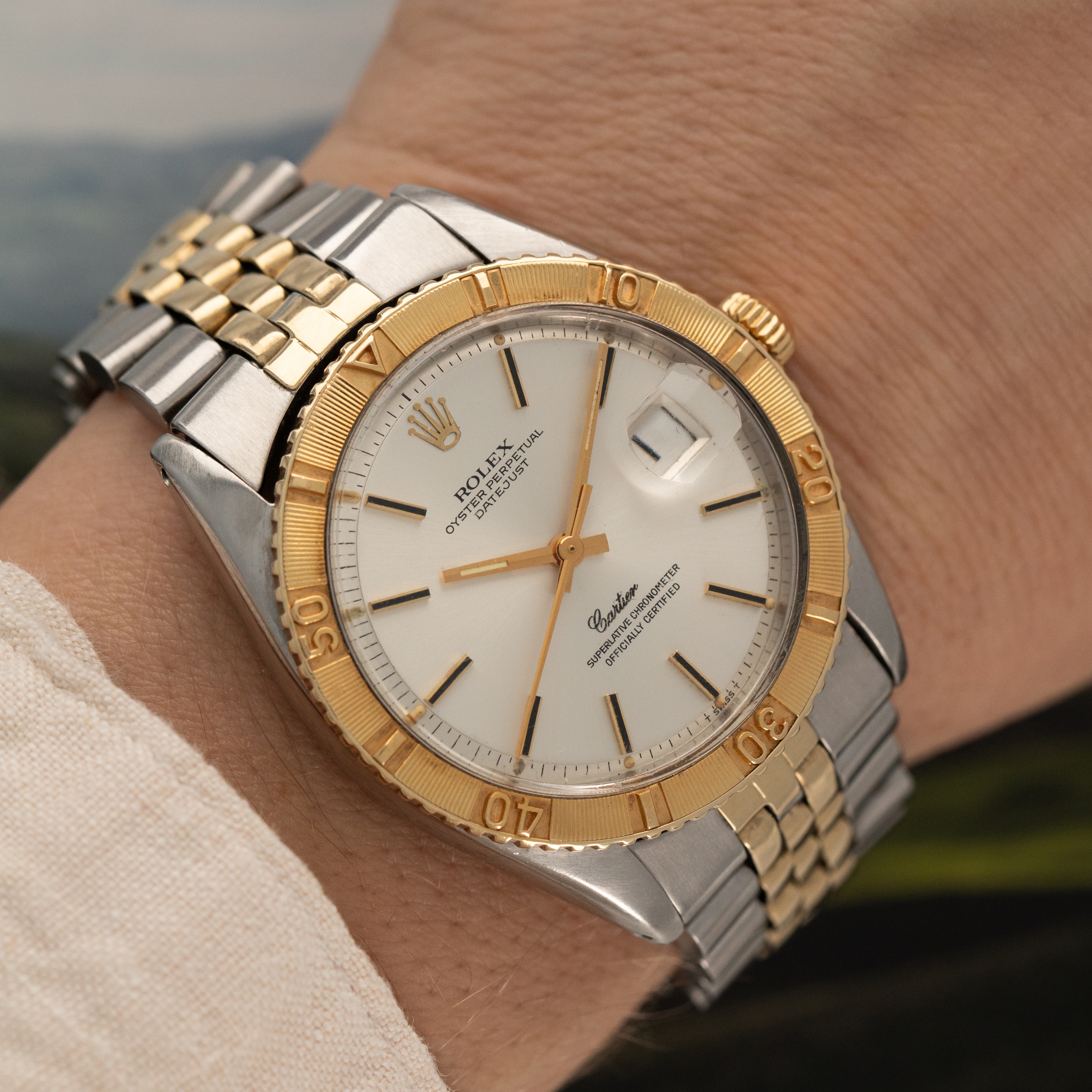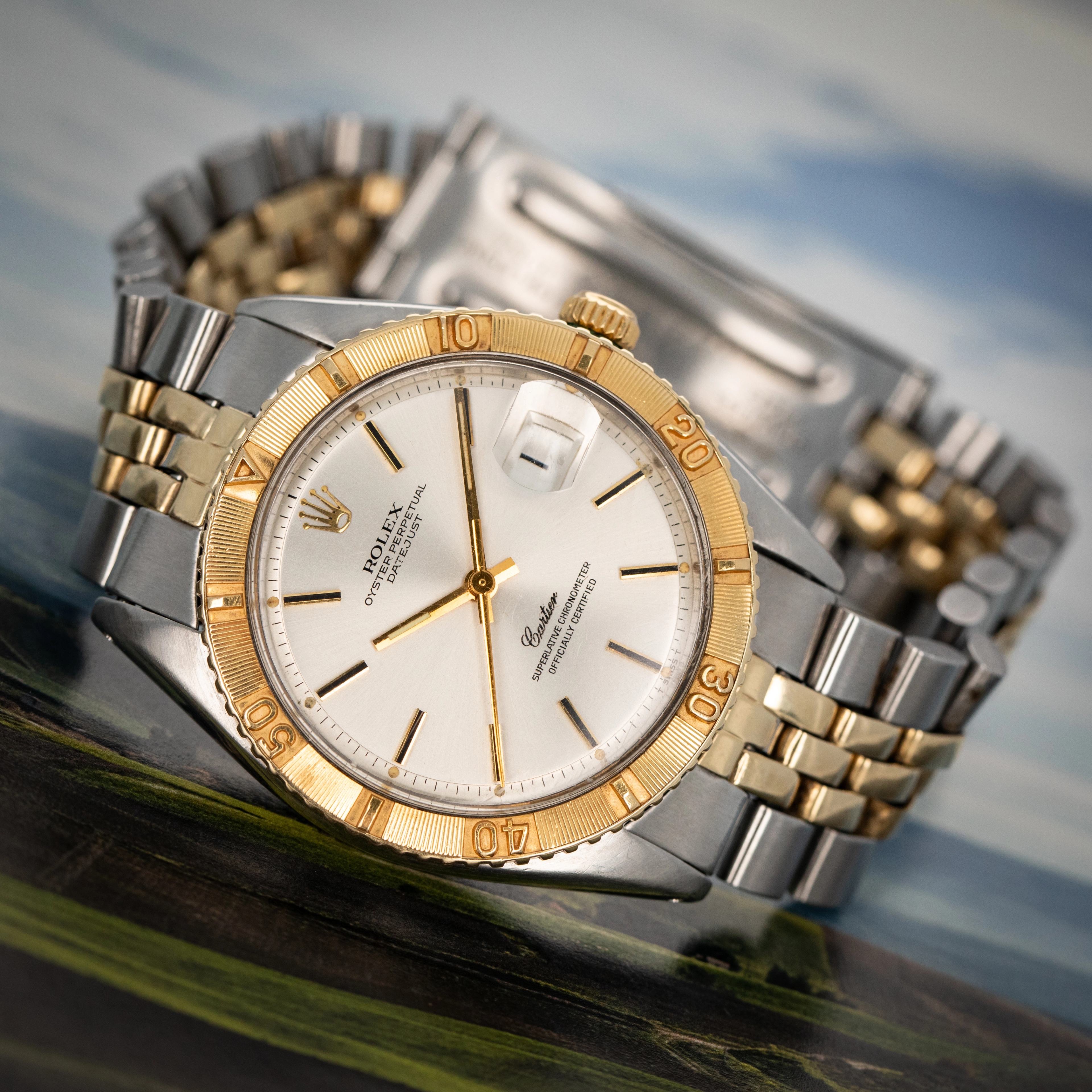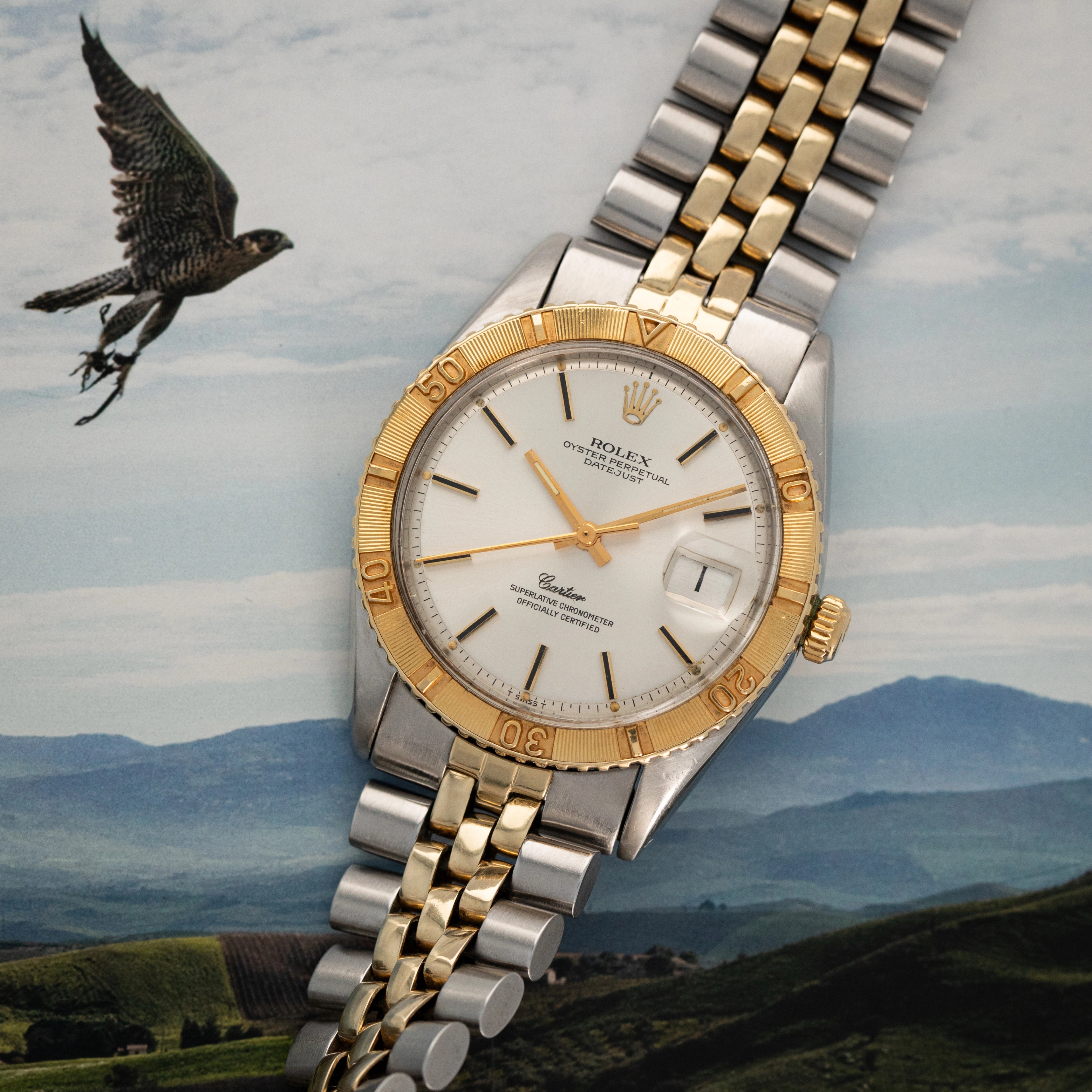 Initially launched in 1953, the Rolex Turn-O-Graph's release sparked an exciting turning point in the brand’s rich horological history. Considered Rolex's first serially produced tool watch, the Turn-O-Graph was iconic for its eponymous feature; its bidirectional rotatable bezel. Armed with such a useful function, the Turn-O-Graph was designed to measure and record time much like a chronograph. Marketed to international business travellers, the Turn-O-Graph was presented as a tool to perform quick calculations due to its bezel. As such, the Turn-O-Graph was chosen by the United States Air Force’s aerobic squadron, the Thunderbirds, to aid in their pilots' navigational calculations. Recognizing the opportunity, Rolex marketed the Turn-O-Graph as the "Thunderbird" in the North American market. As sales for the Turn-O-Graph began to decline following the Submariner and GMT-Master’s launches due to their similar design and heightened utility, the Turn-O-Graph name only remained in use until the early 1960s before it was discontinued. As such, original Turn-O-Graph references have become increasingly sought-after thanks to their brief yet meaningful impact on Rolex’s evolution as a watchmaker. Offered here we have the Thunderbird ref. 1625, the last original Turn-O-Graph model to be given Thunderbird moniker by Rolex. Produced from 1959 until 1977, the ref. 1625 marked the bulk of Turn-O-Graph’s history as we know it thanks to its long production run. Offered in a selection of metals from stainless steel with just an 18kt white gold bezel, stainless steel, 18kt yellow goldand even two-tone like we have it here, the ref. 1625’s engine-turned rotating bezel and Jubilee bracelet combine to create an alluring timepiece that we can’t help but fawn over.