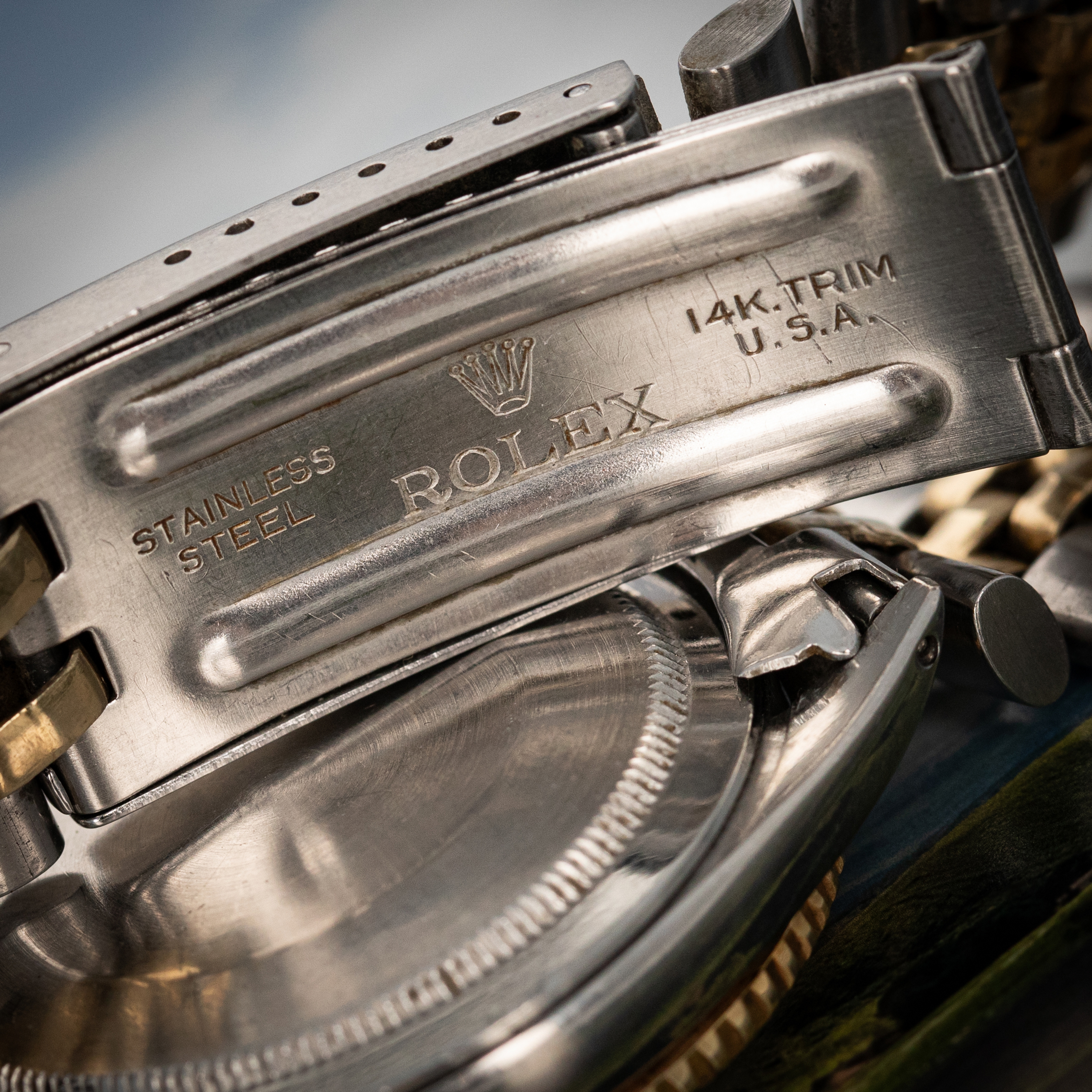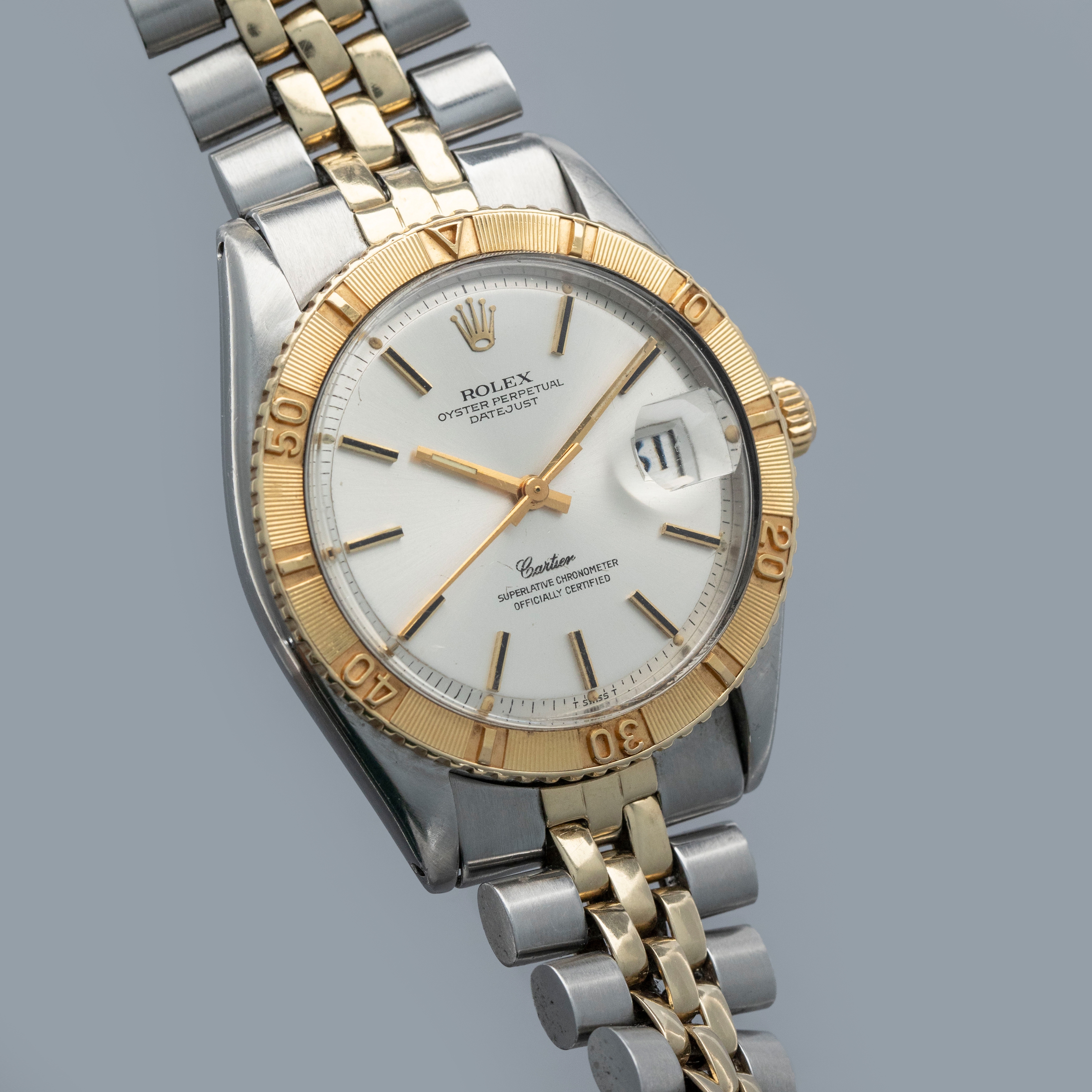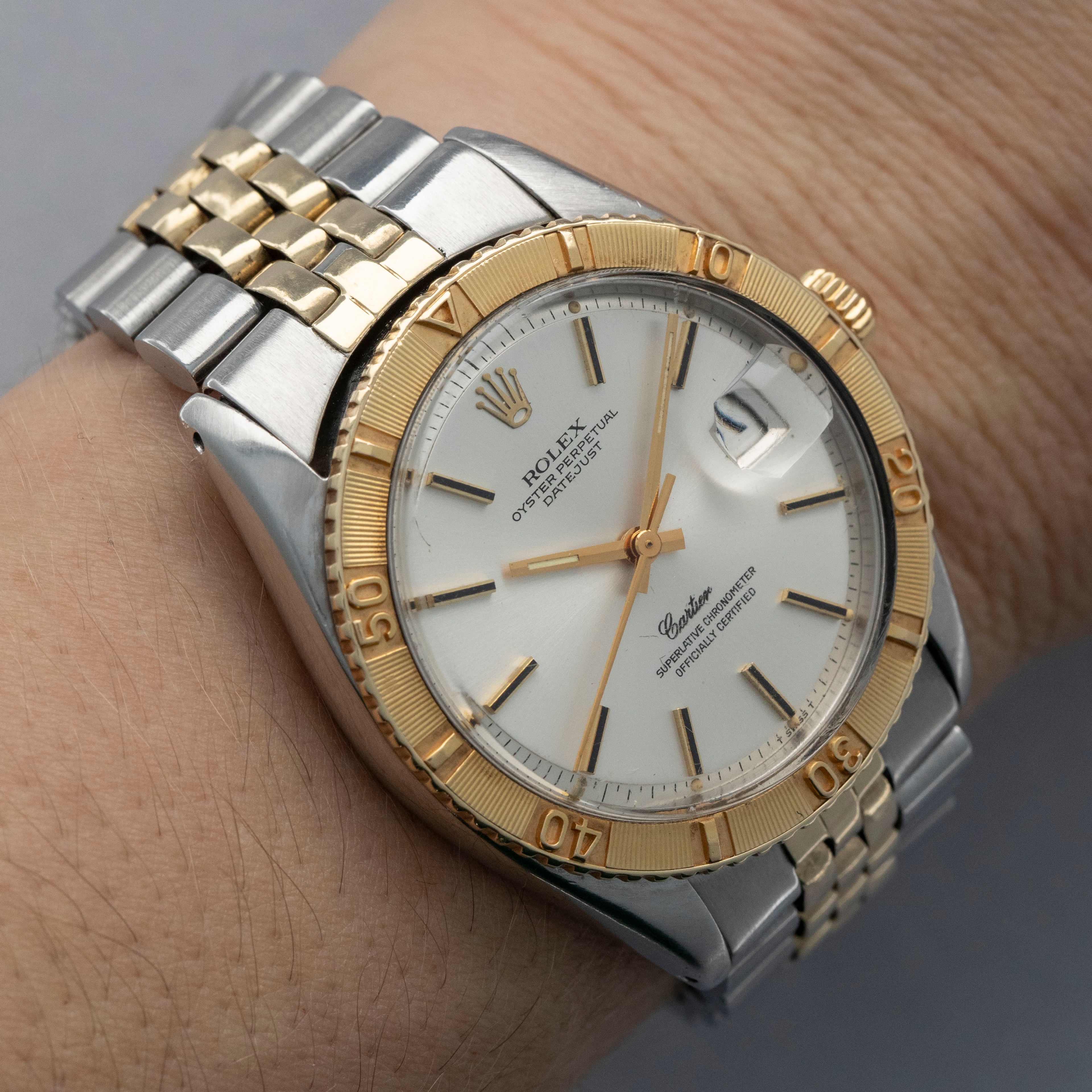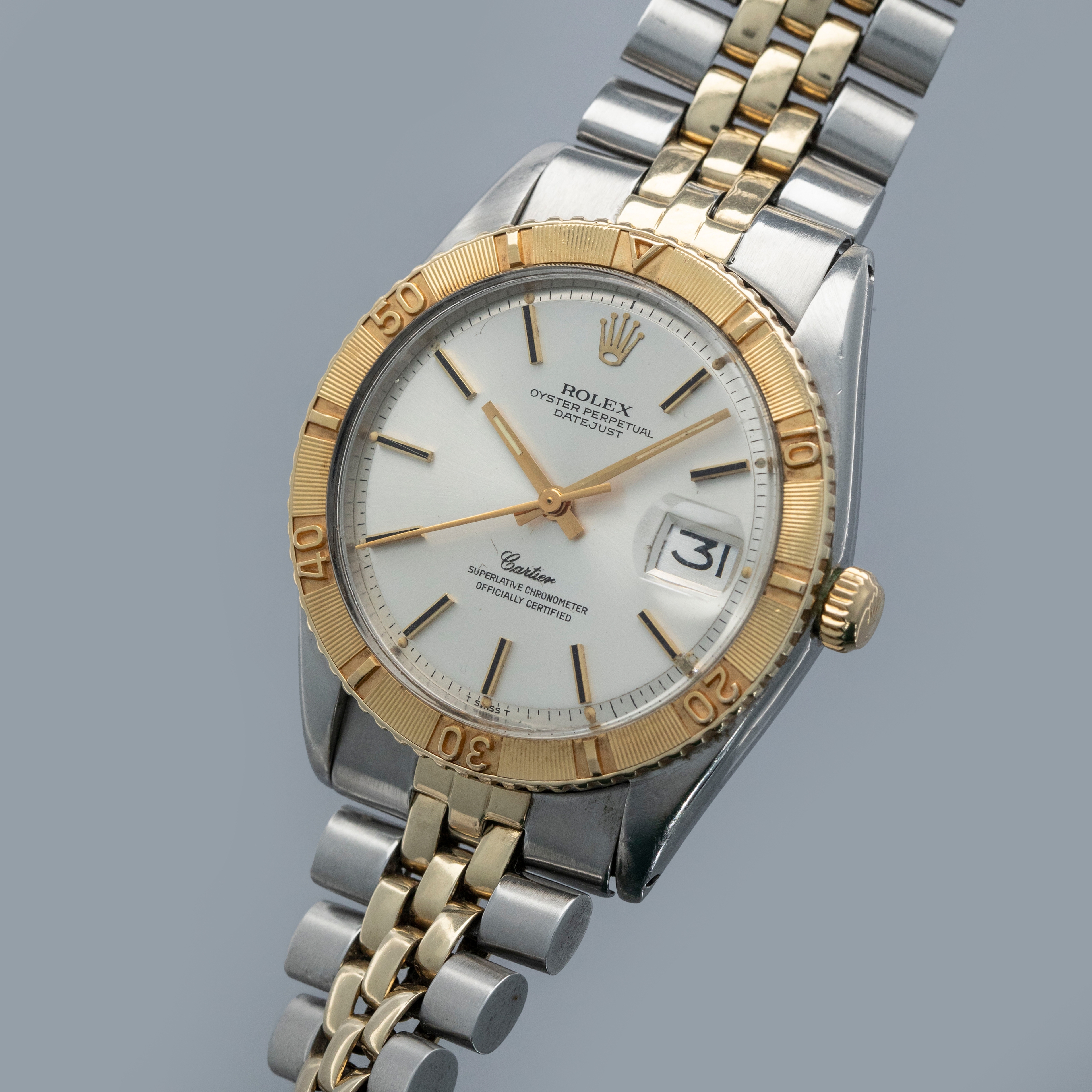 Initially launched in 1953, the Rolex Turn-O-Graph's release sparked an exciting turning point in the brand’s rich horological history. Considered Rolex's first serially produced tool watch, the Turn-O-Graph was iconic for its eponymous feature; its bidirectional rotatable bezel. Armed with such a useful function, the Turn-O-Graph was designed to measure and record time much like a chronograph. Marketed to international business travellers, the Turn-O-Graph was presented as a tool to perform quick calculations due to its bezel. As such, the Turn-O-Graph was chosen by the United States Air Force’s aerobic squadron, the Thunderbirds, to aid in their pilots' navigational calculations. Recognizing the opportunity, Rolex marketed the Turn-O-Graph as the "Thunderbird" in the North American market. As sales for the Turn-O-Graph began to decline following the Submariner and GMT-Master’s launches due to their similar design and heightened utility, the Turn-O-Graph name only remained in use until the early 1960s before it was discontinued. As such, original Turn-O-Graph references have become increasingly sought-after thanks to their brief yet meaningful impact on Rolex’s evolution as a watchmaker. Offered here we have the Thunderbird ref. 1625, the last original Turn-O-Graph model to be given Thunderbird moniker by Rolex. Produced from 1959 until 1977, the ref. 1625 marked the bulk of Turn-O-Graph’s history as we know it thanks to its long production run. Offered in a selection of metals from stainless steel with just an 18kt white gold bezel, stainless steel, 18kt yellow goldand even two-tone like we have it here, the ref. 1625’s engine-turned rotating bezel and Jubilee bracelet combine to create an alluring timepiece that we can’t help but fawn over.