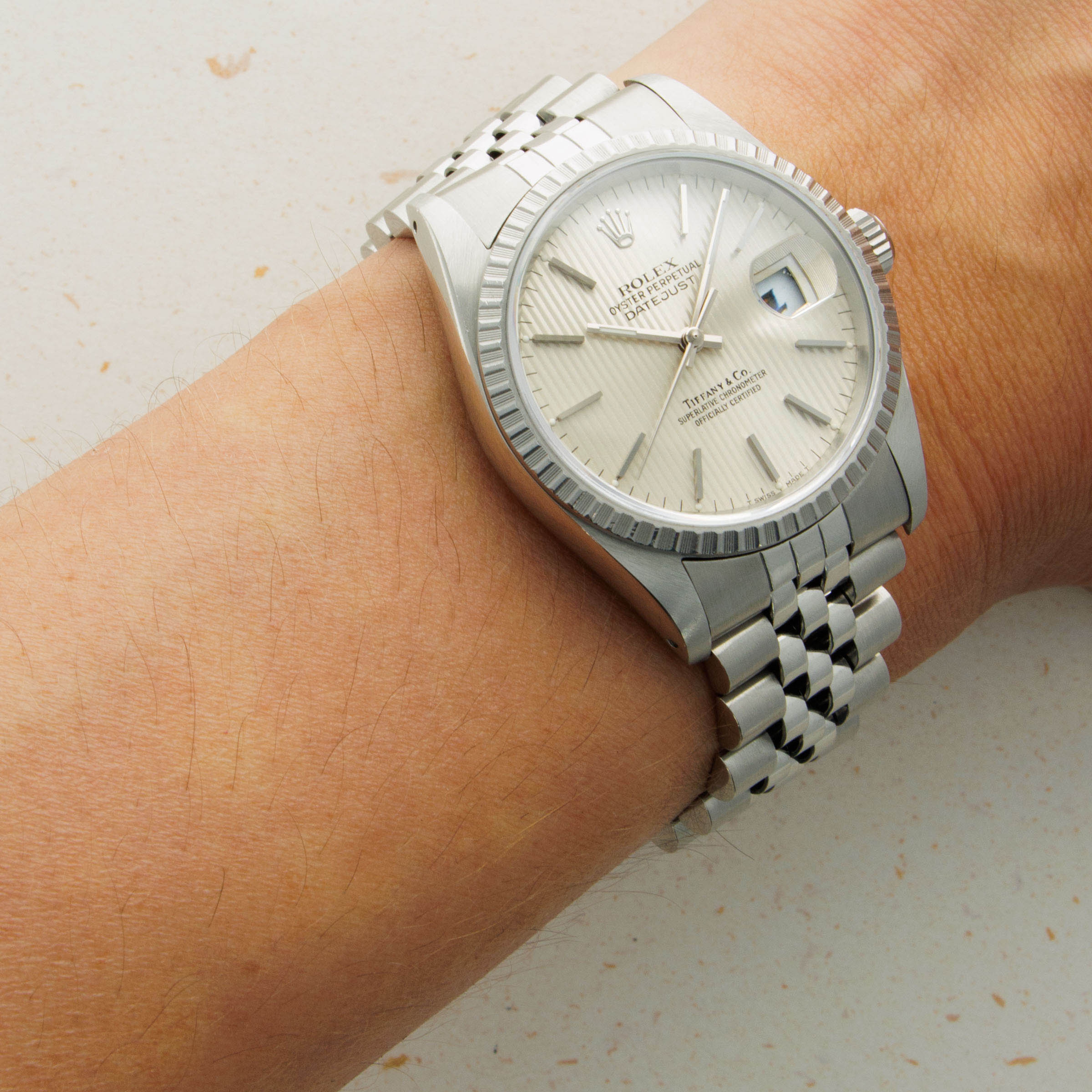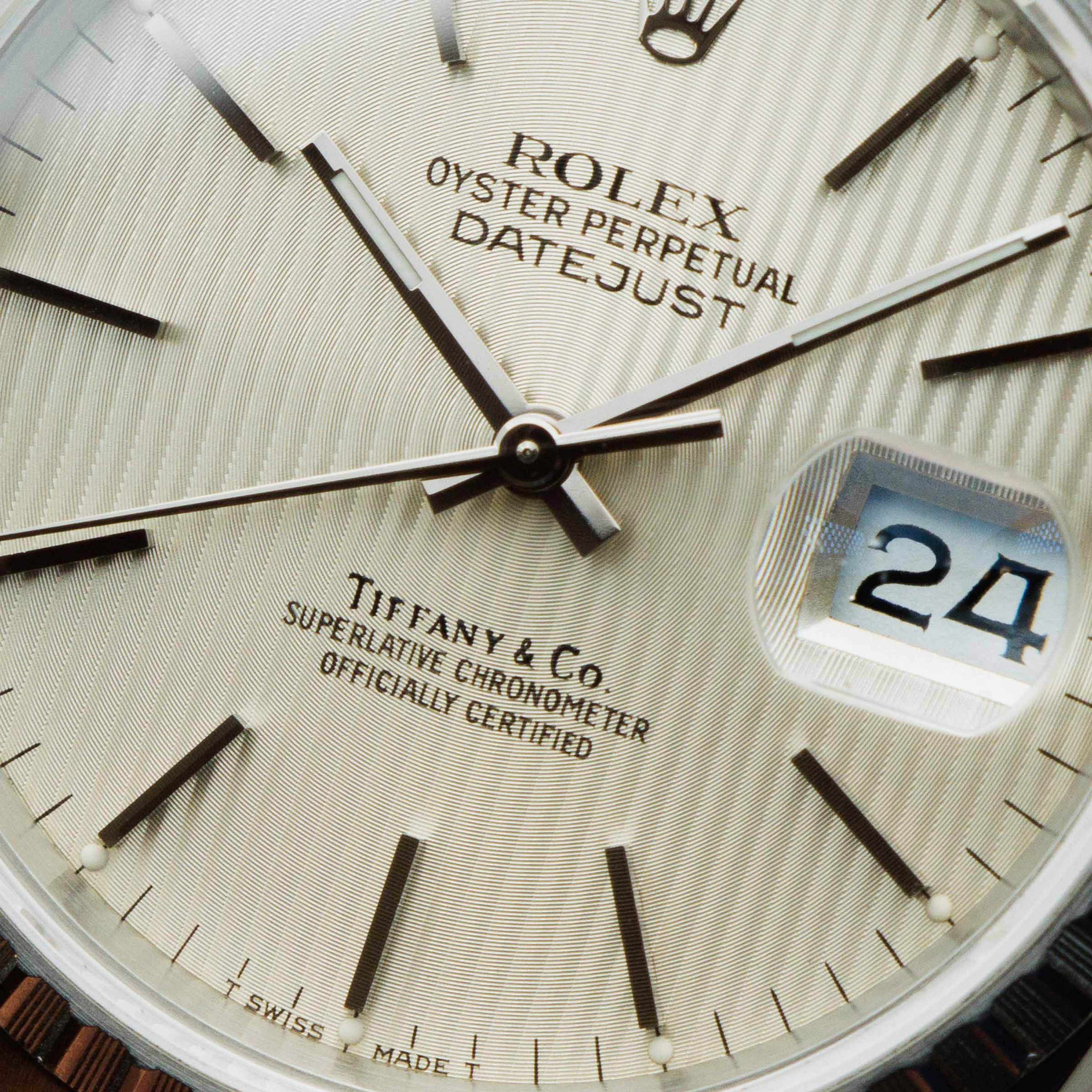 Fitted with one of the Datejust's most classical dial options, this example sports a silver tapestry dial with applied stick indices that matches its understated engine-turned bezel. However, not all is as it seems, as this example also features the incredibly rare 'Tiffany & Co.' stamp that marked some of the watches that the famed American jeweler retailed from their premises.