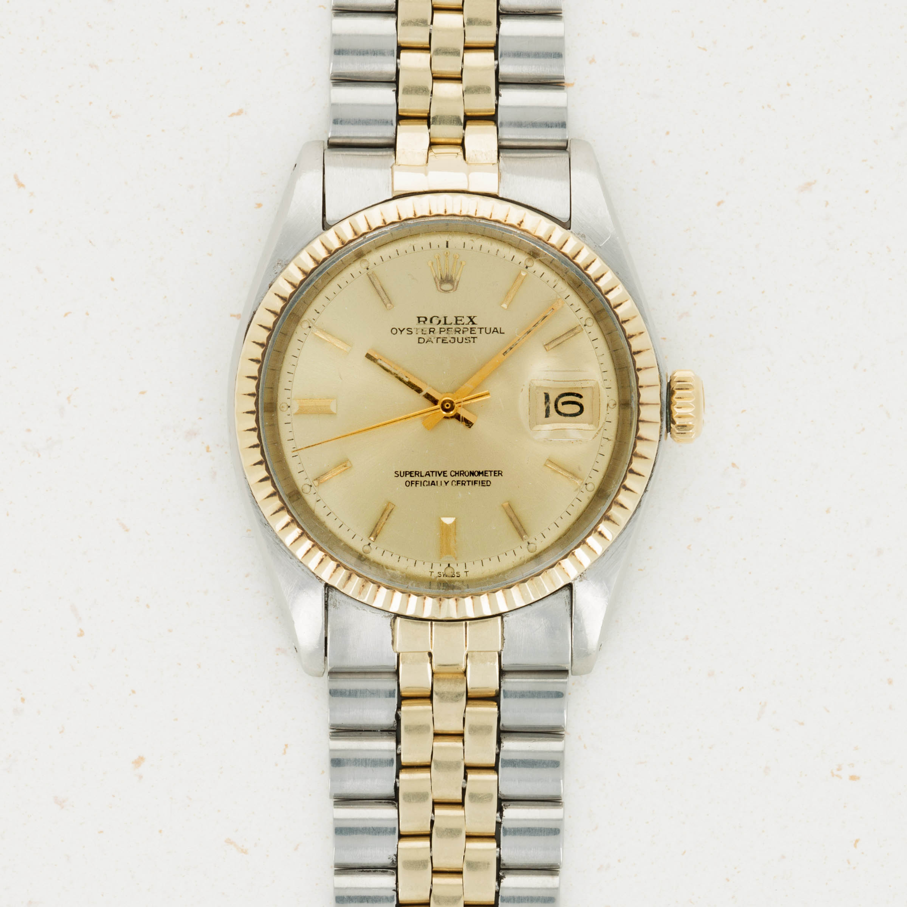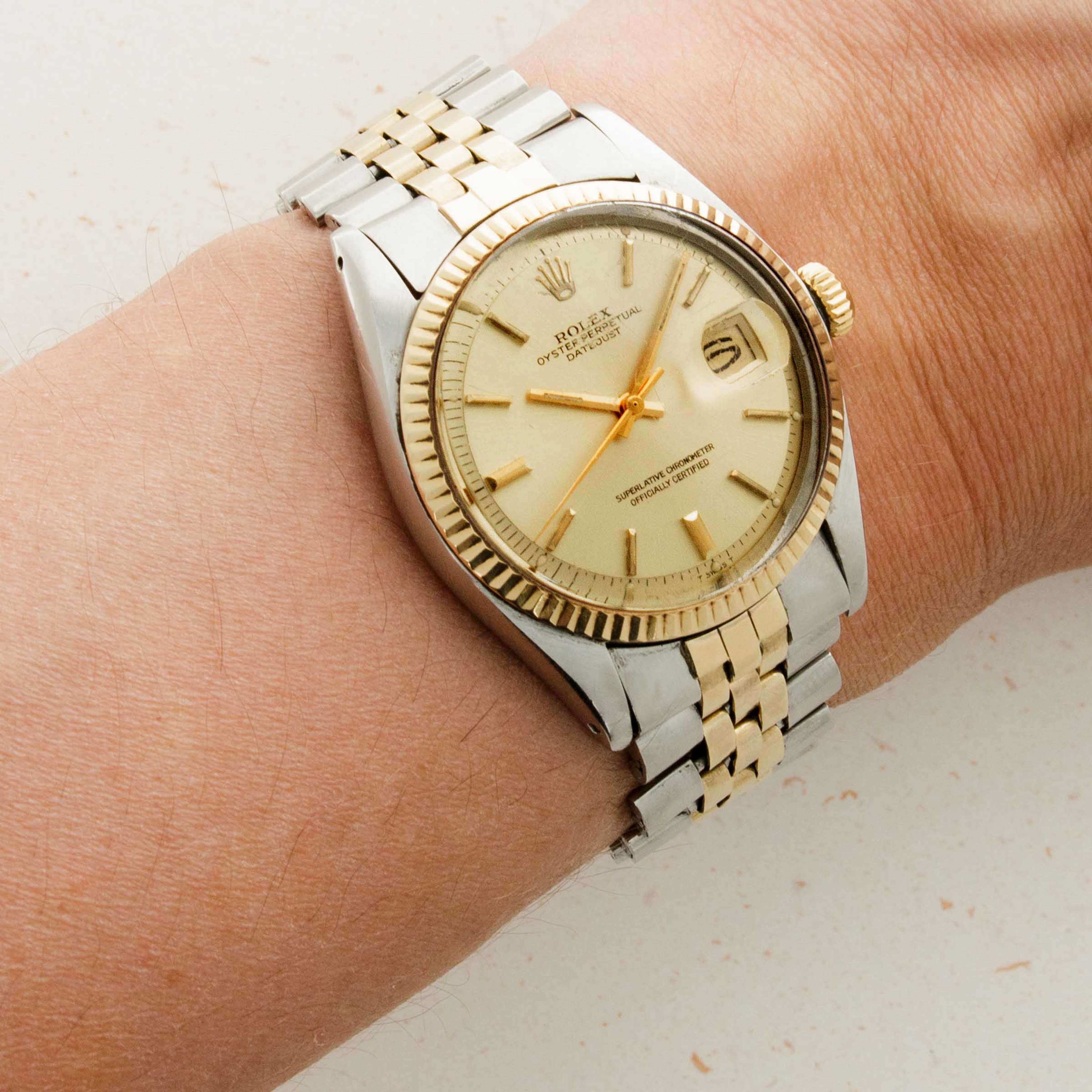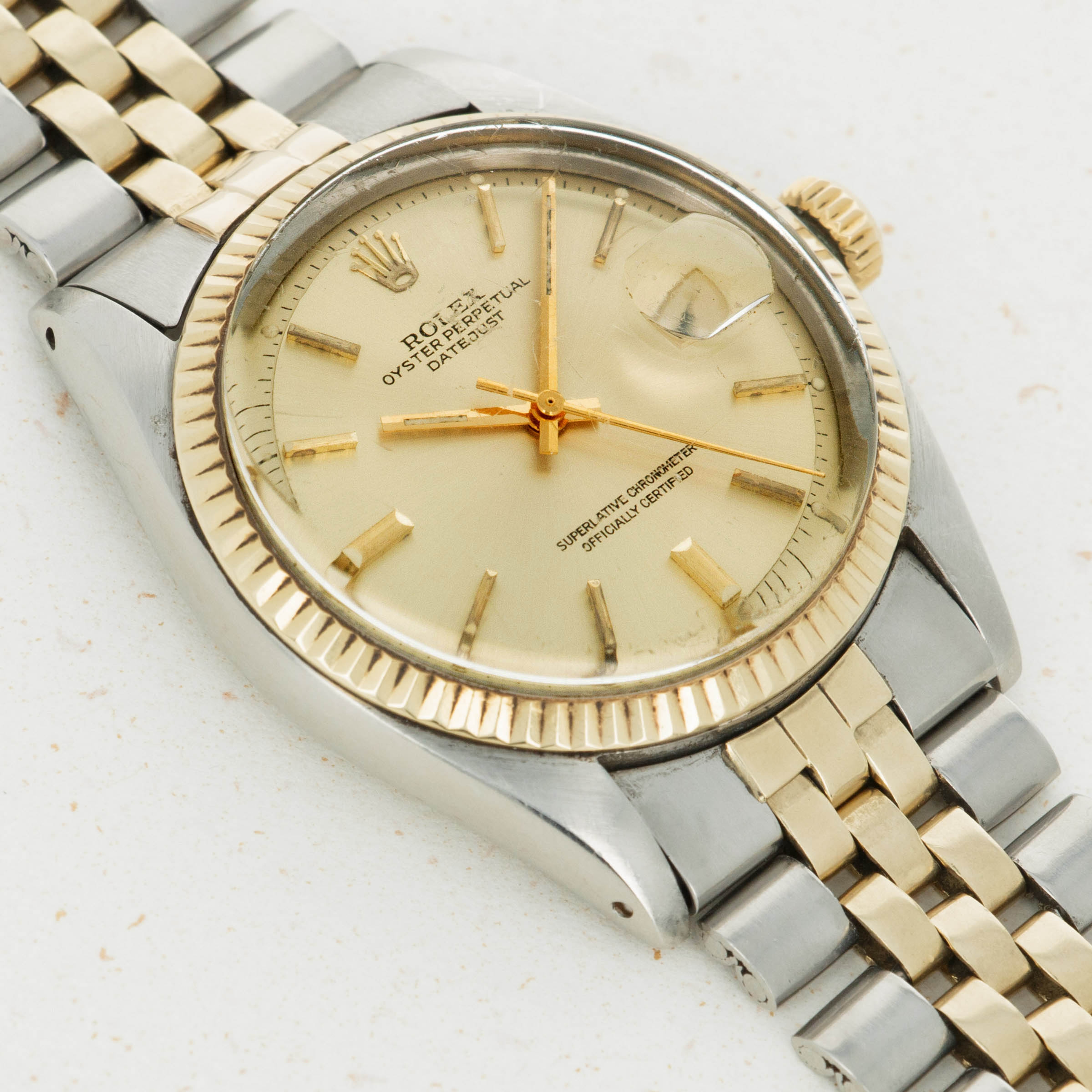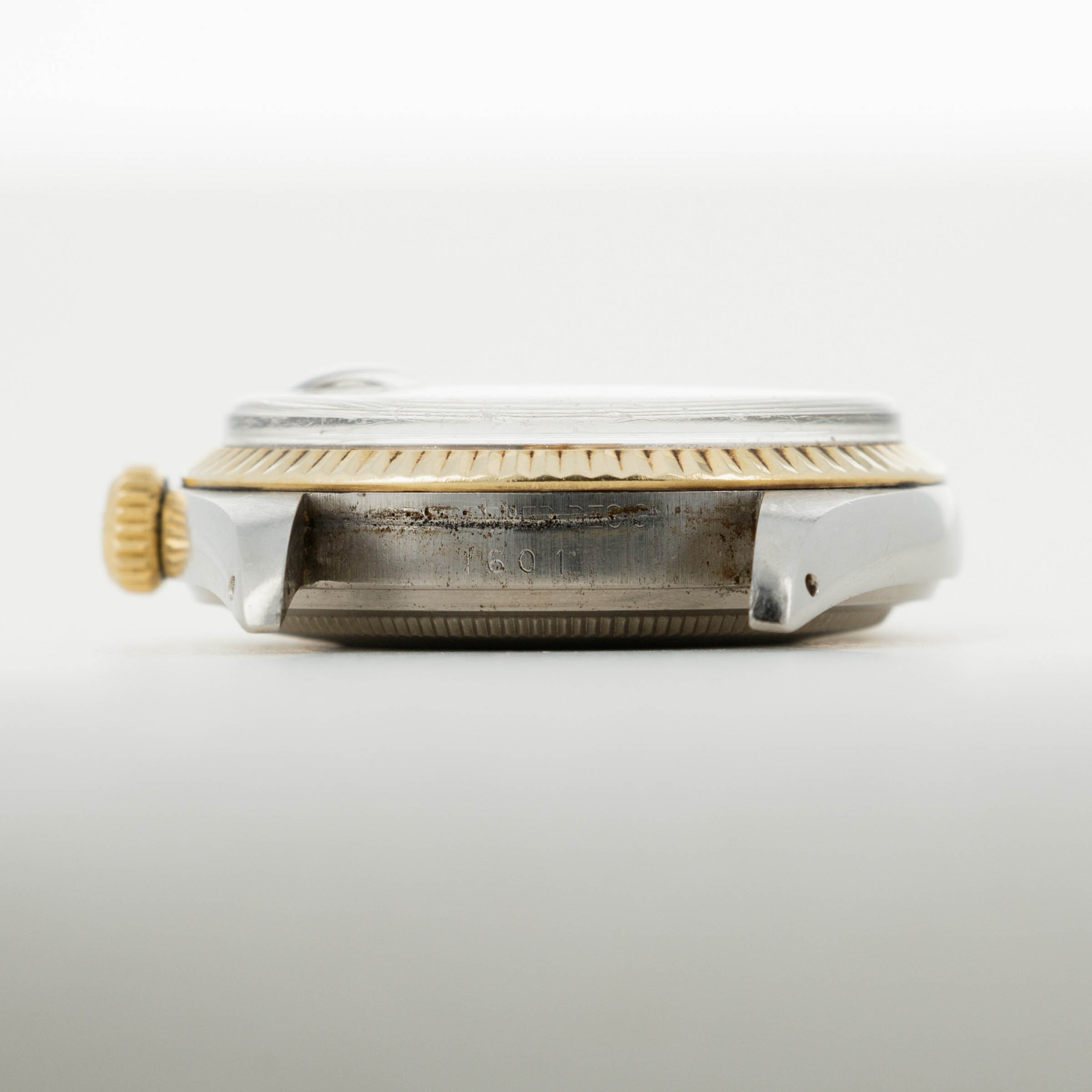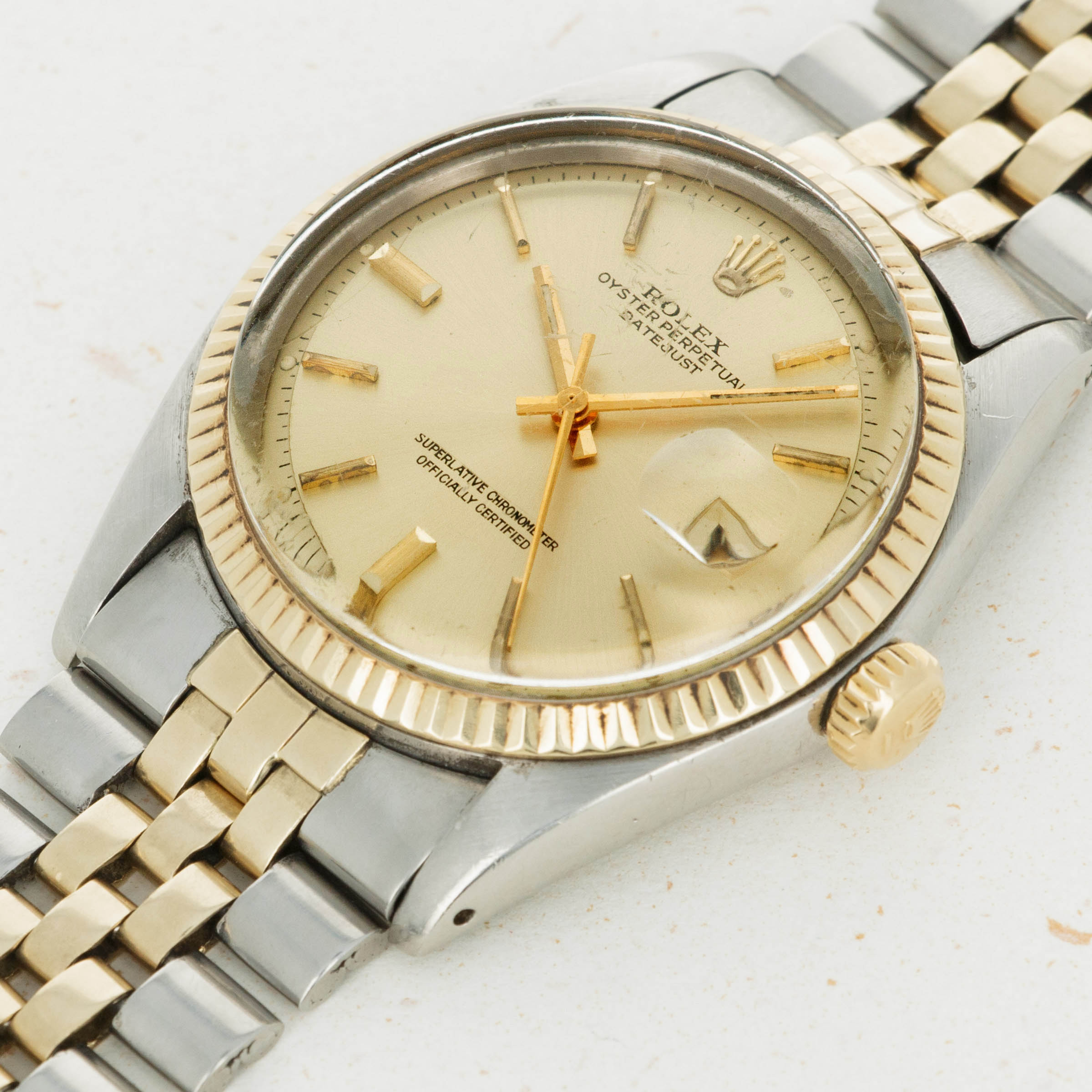 With its soft champagne-colored dial and date window, this ref. 1601's display works wonderfully with its bi-metal construction.