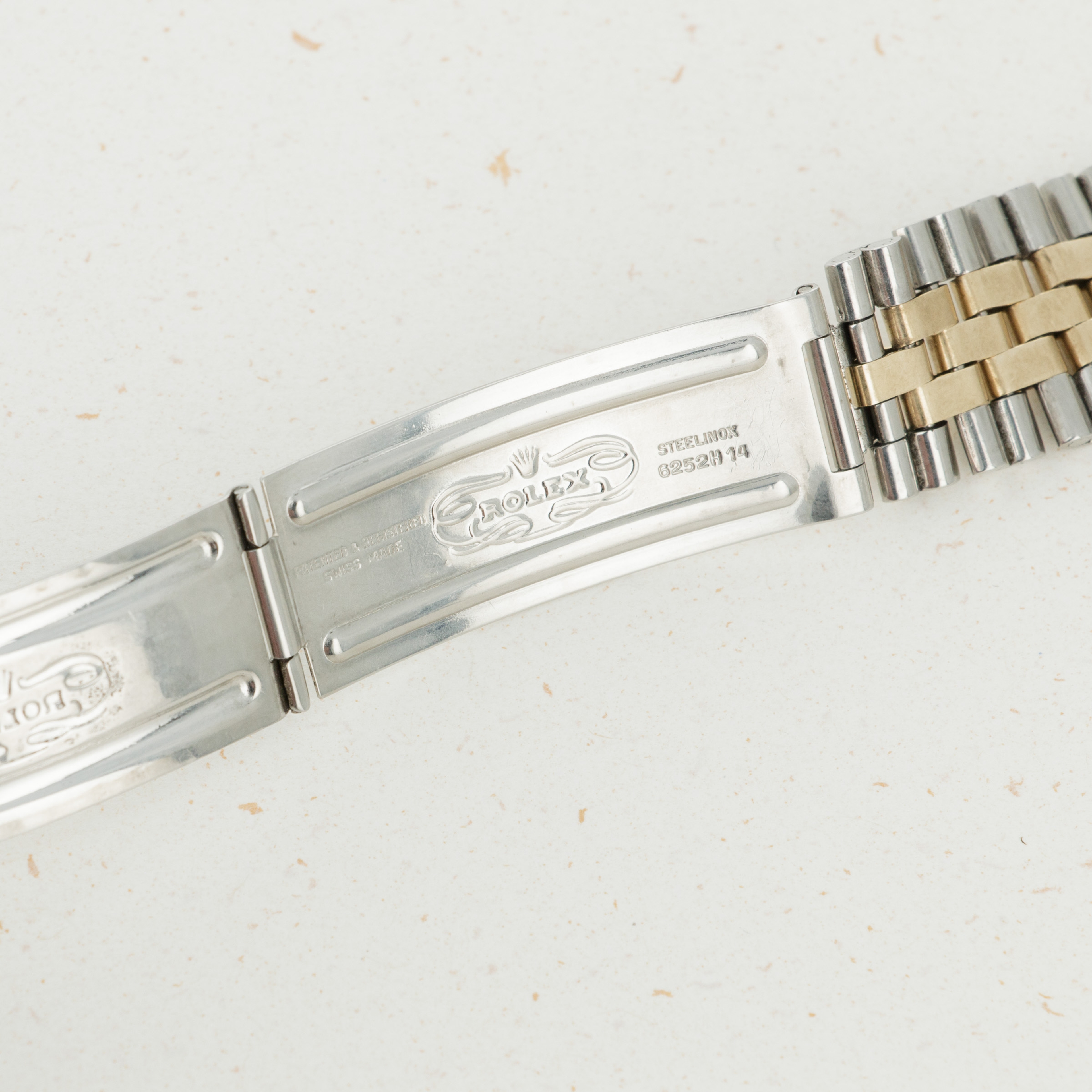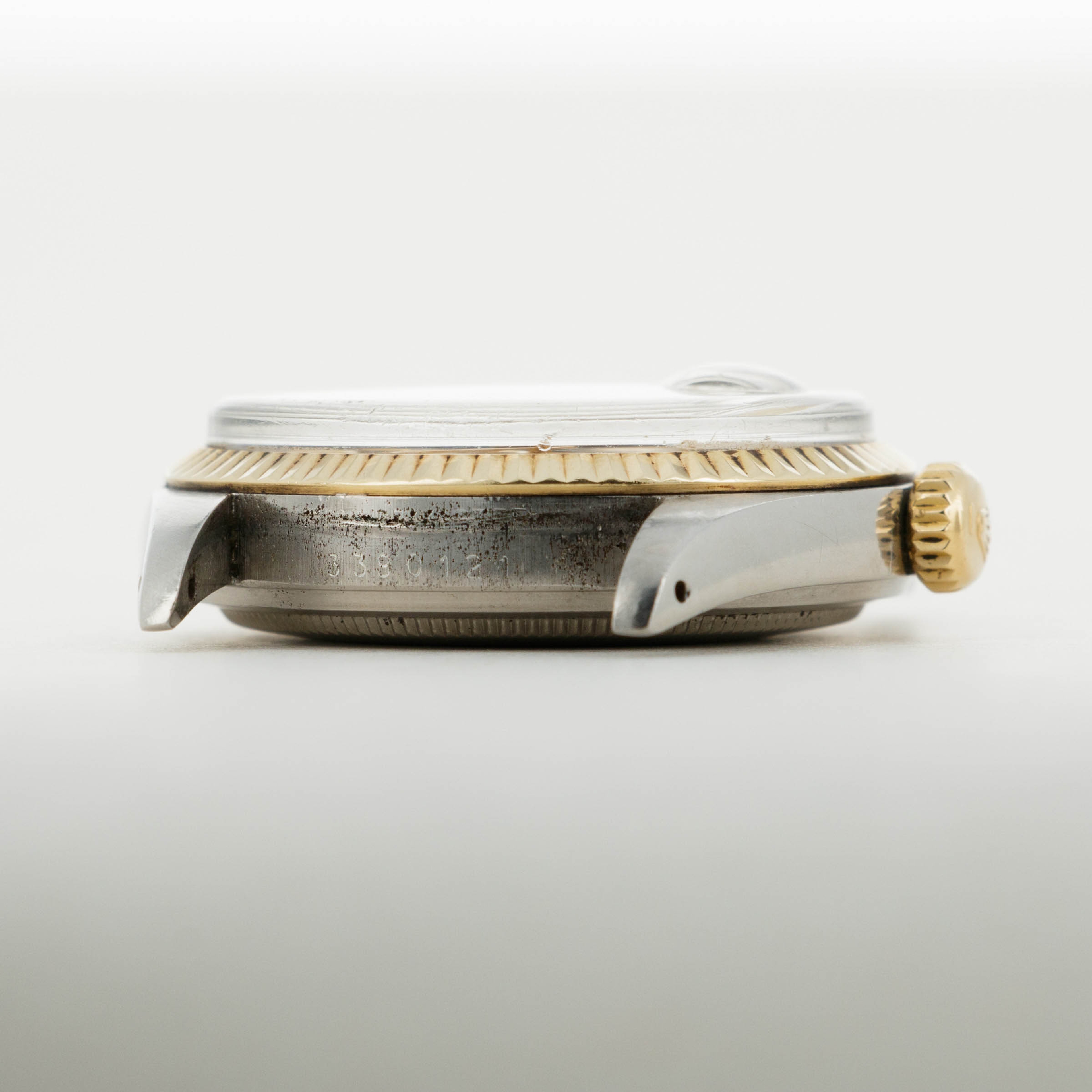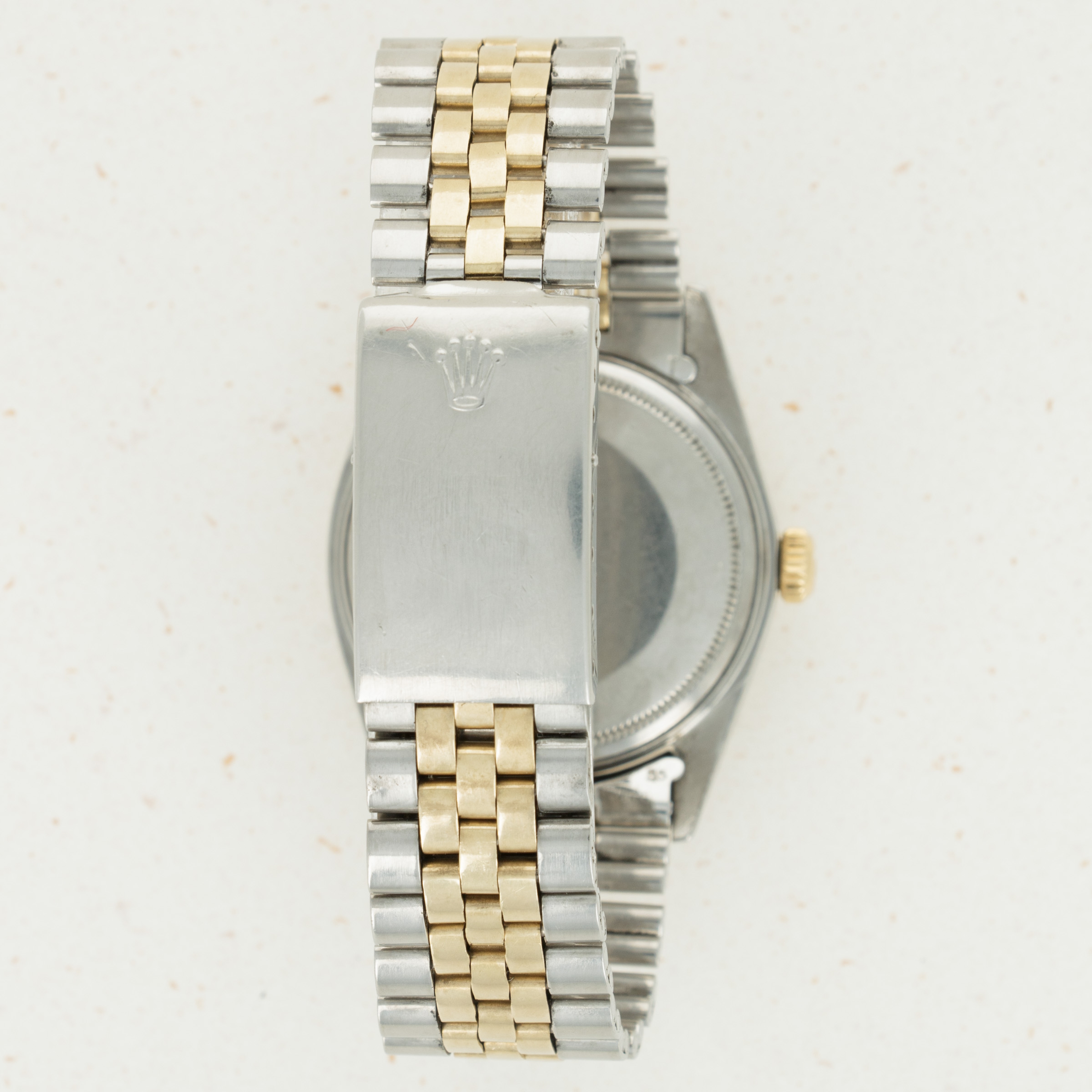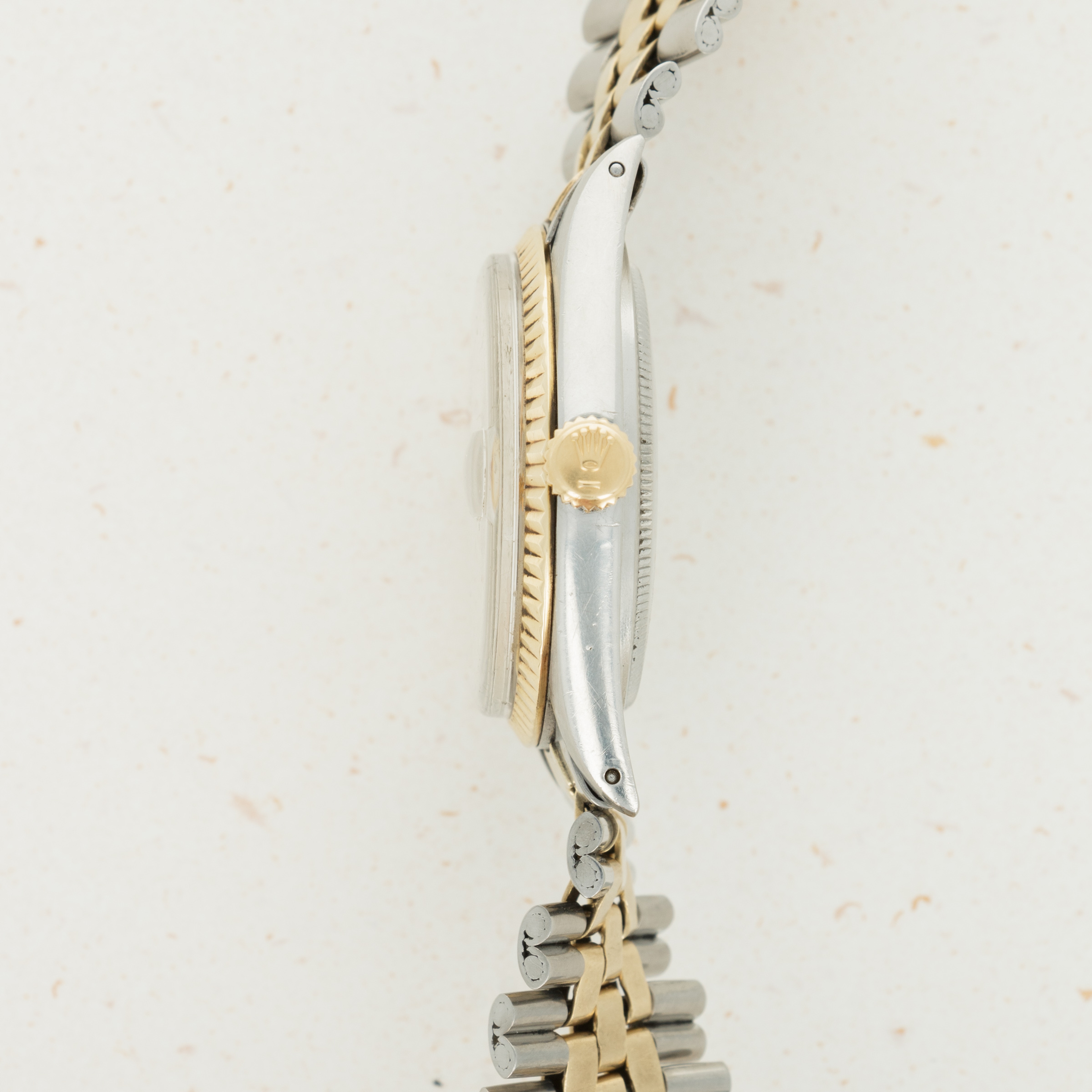 With its soft champagne-colored dial and date window, this ref. 1601's display works wonderfully with its bi-metal construction.