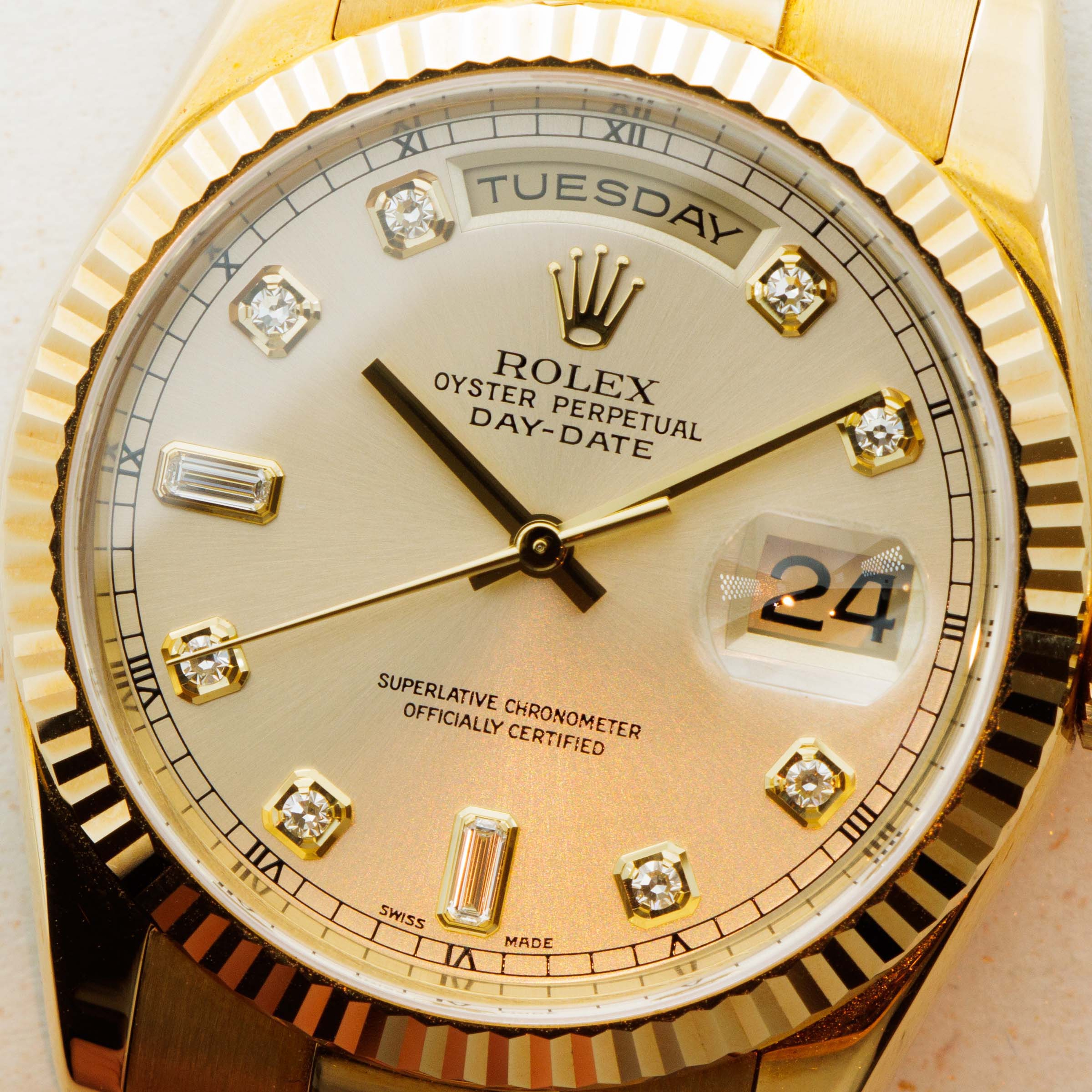 A legendary timepiece with an unrivaled history, the Rolex Day-Date has earned its place as "The Ultimate Watch of Prestige" from its decades on the wrists of the world's most influential people. Released in 1956, the Day-Date quickly became synonymous with luxury, prestige, and exclusivity thanks to being the watch of choice for the world's athletes, visionaries, and world leaders alike. Only ever constructed of precious metals, the Day-Date's aesthetic is that of sheer elegance and grace. Aside from the beautiful array of dial options that have been available over the decades, the Day-Date's most iconic piece of design is its three-piece "Presidential" or "President" bracelet. Forming the bedrock of its design, the Presidential bracelet has become synonymous with Rolex's flagship collection and their desire to create the very best and most iconic watches that the world has ever seen. With its timeless design and inescapable impact on horology, the Day-Date stands as a vivid reminder of just how successful they have been in realizing that very mission.