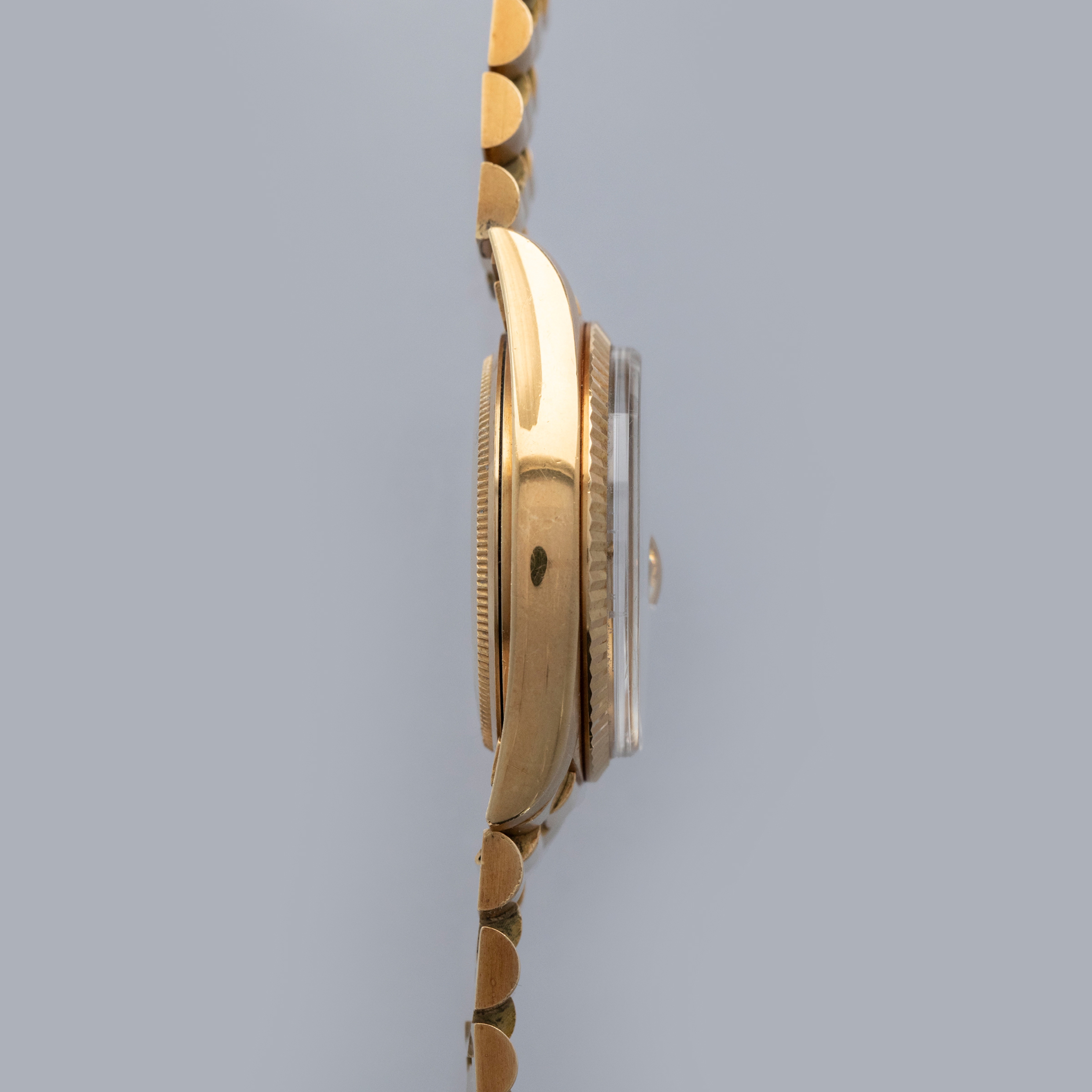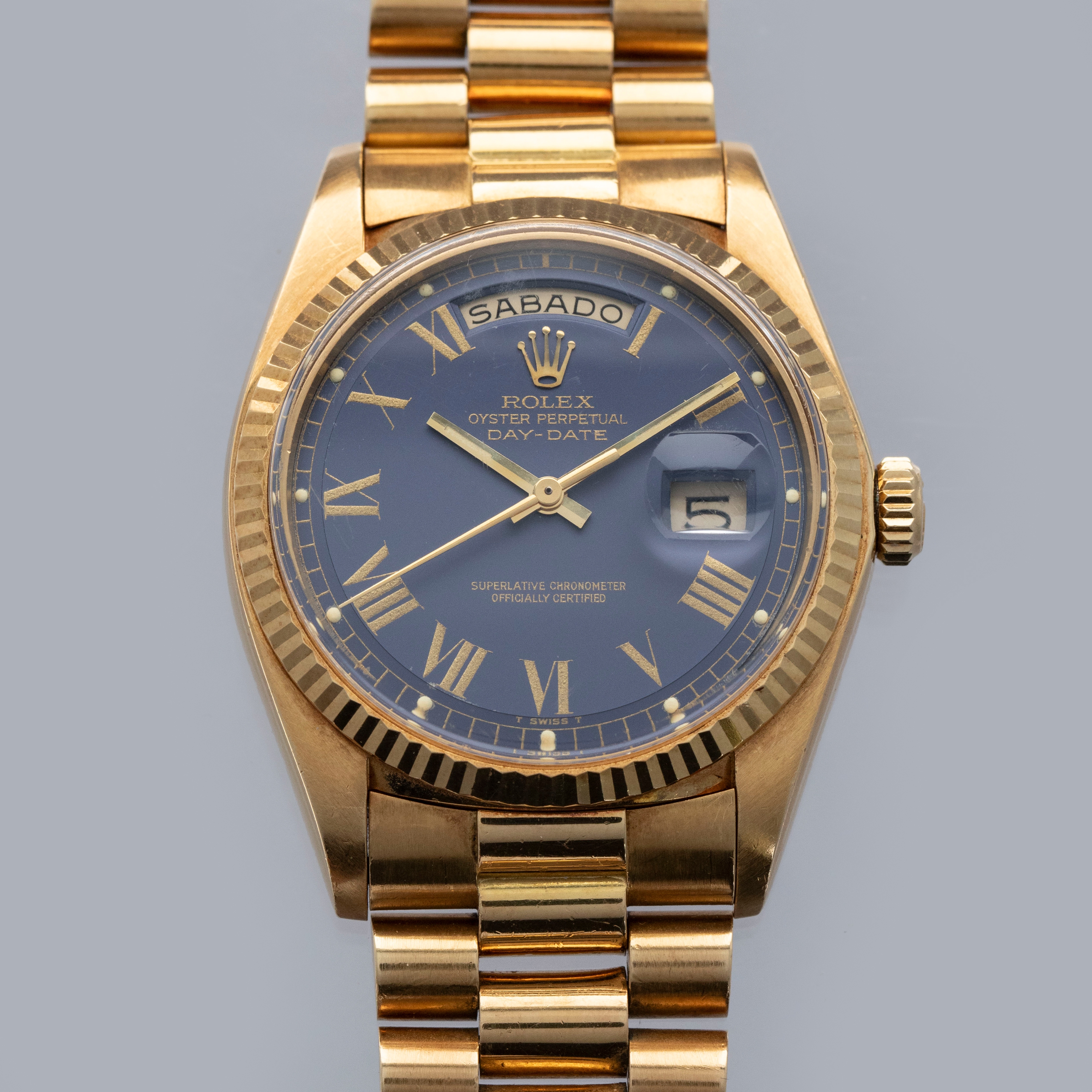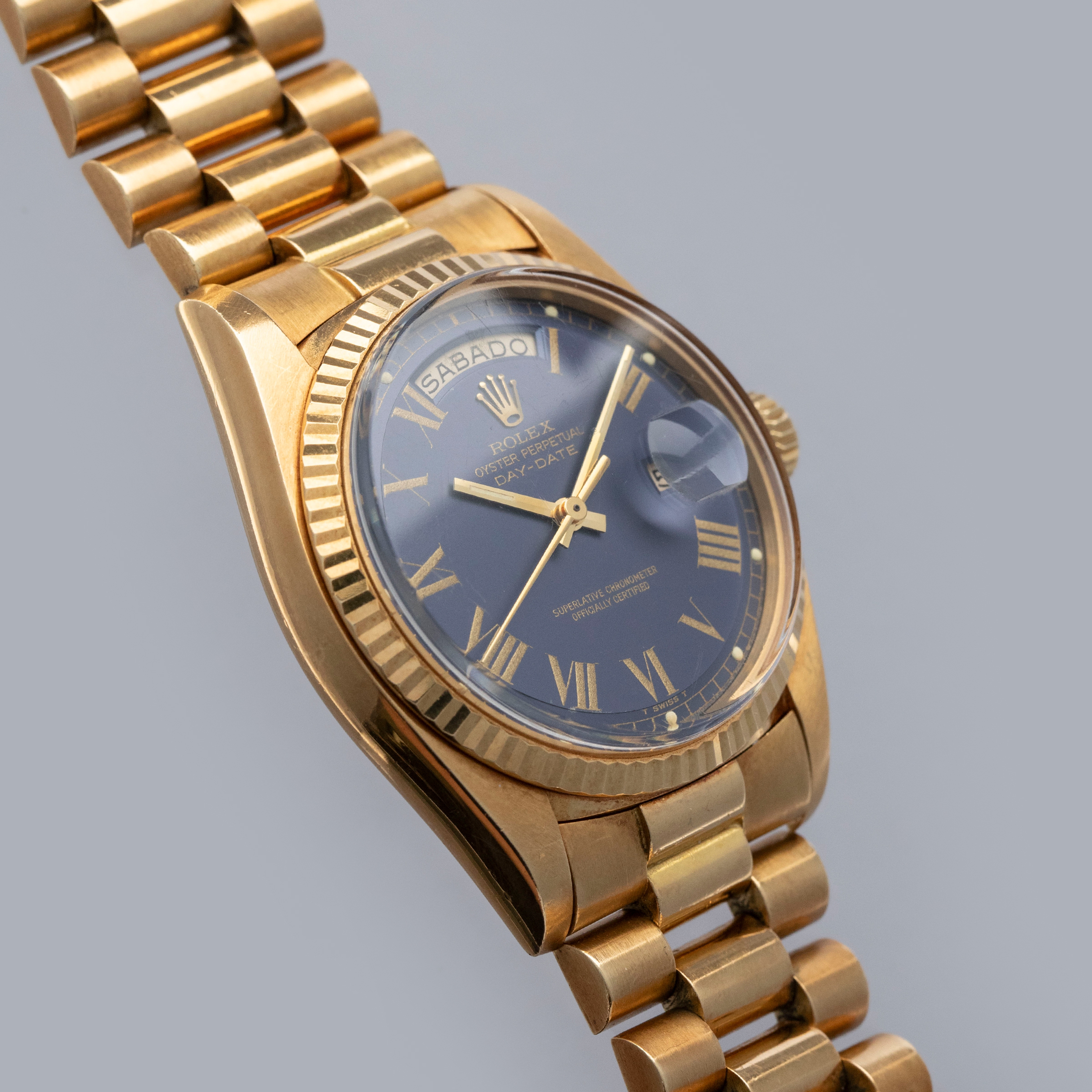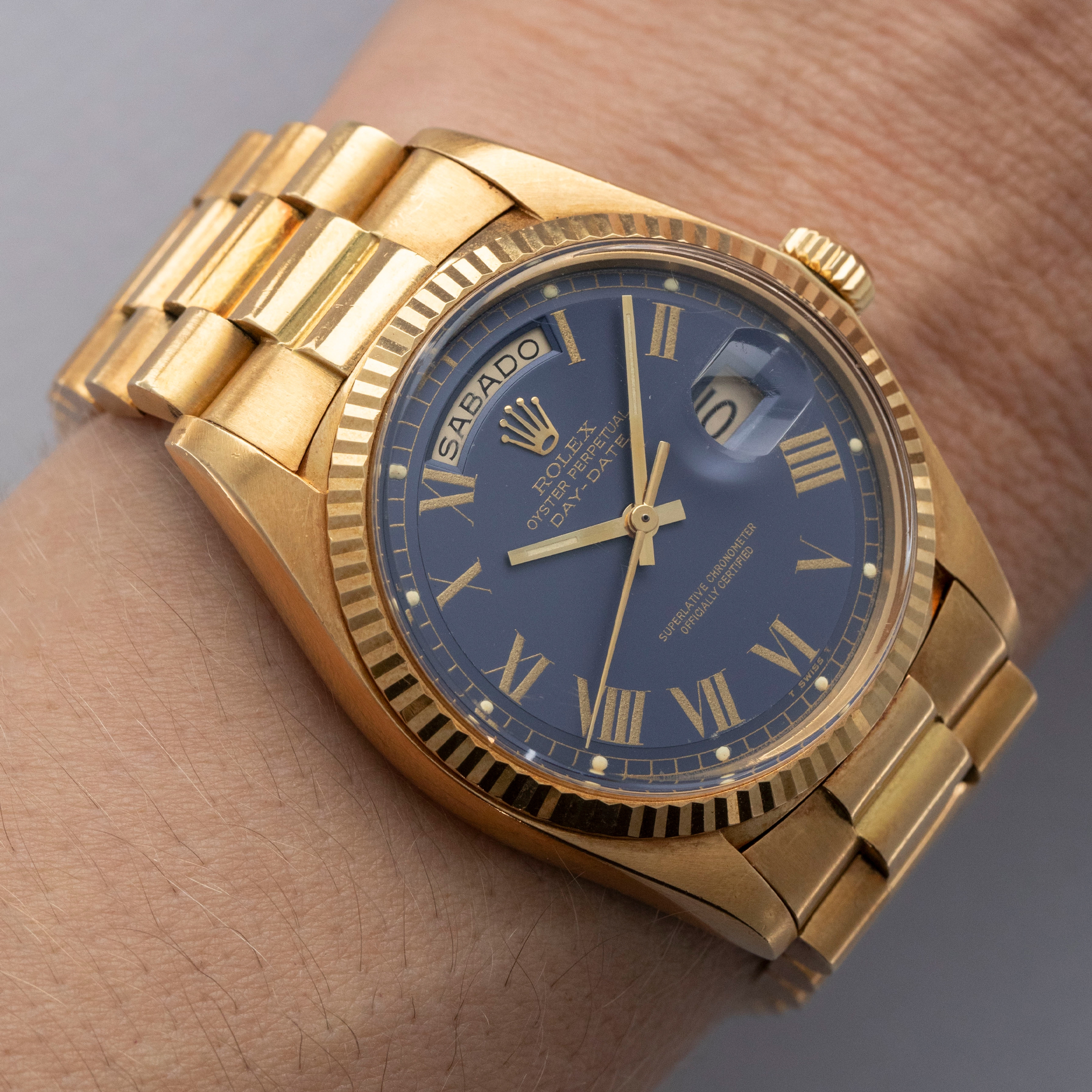 The watch is in overall excellent condition. The yellow gold case is excellent, with well-defined symmetrical lugs and some surface scratches, commensurate with a watch of this vintage. The hallmarks are all fully legible. The bezel is well defined. The blue so-called Buckley dial is in excellent condition, with a small amount of crazing around the lume plots and some light degradation around the dial edge. The yellow gold hands have some light patina but remain very clean. The yellow gold President bracelet has a concealed clasp, with some surface marks and moderate play between the links. The bracelet currently fits a 7 1/4” wrist and has 21 links, 4 of which are removable.