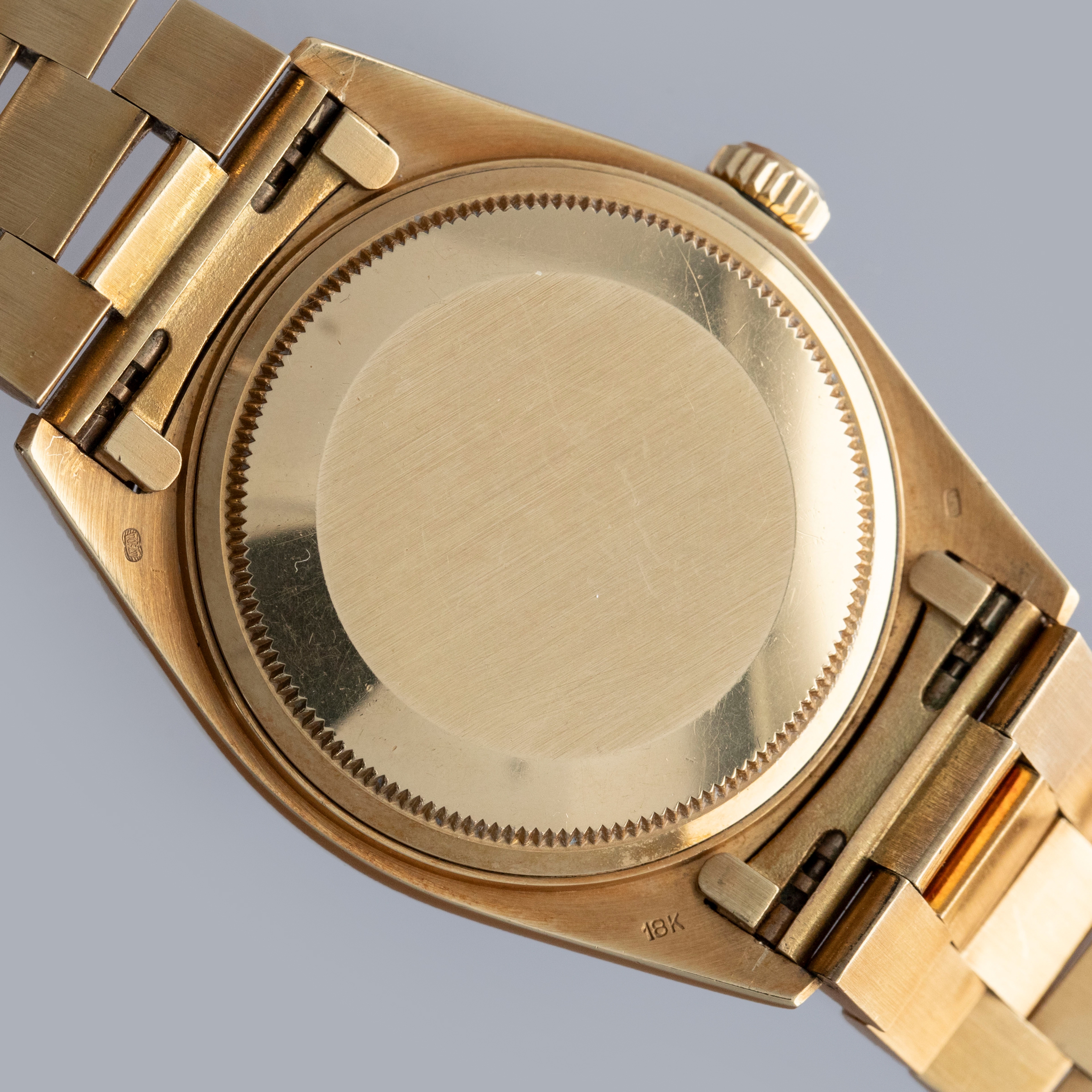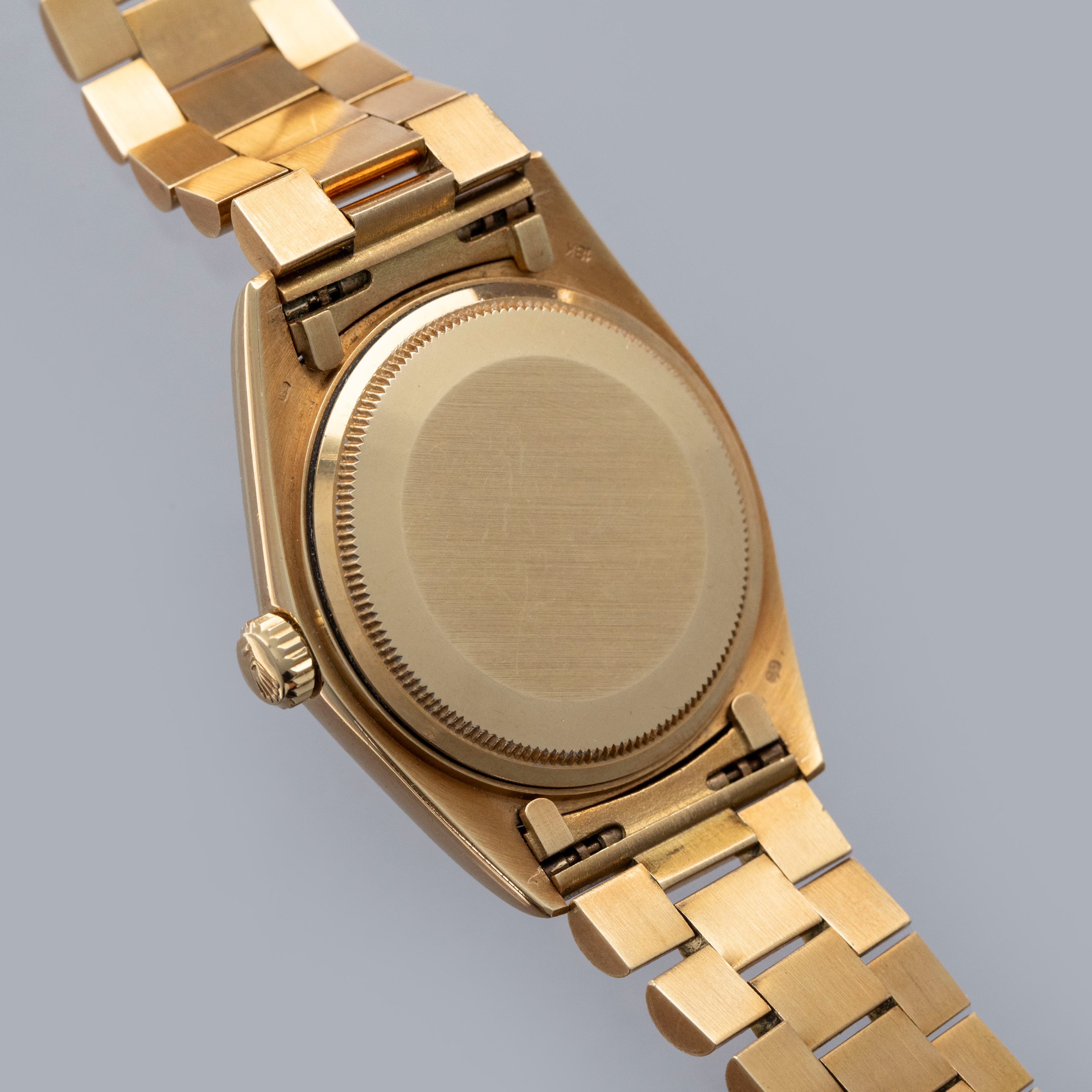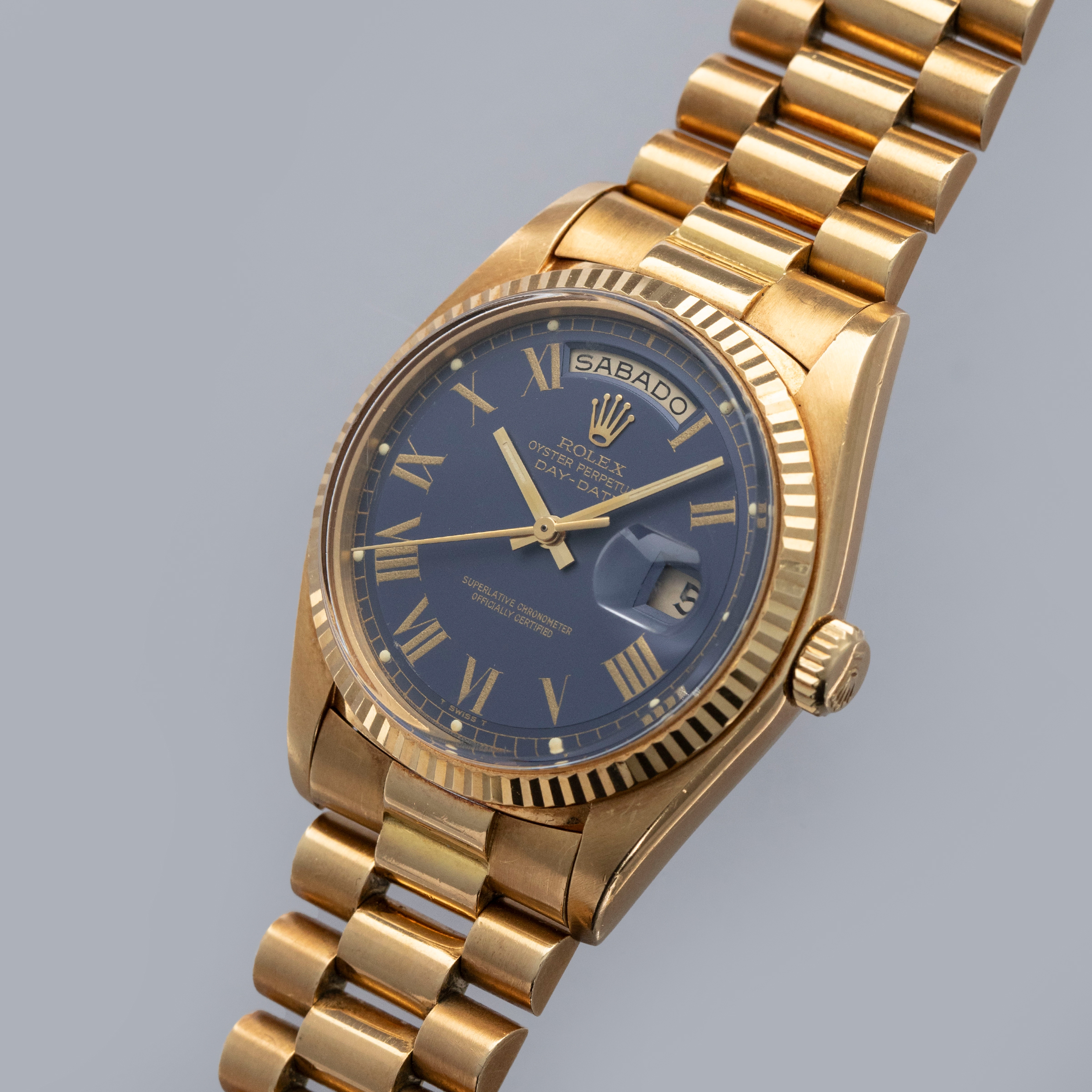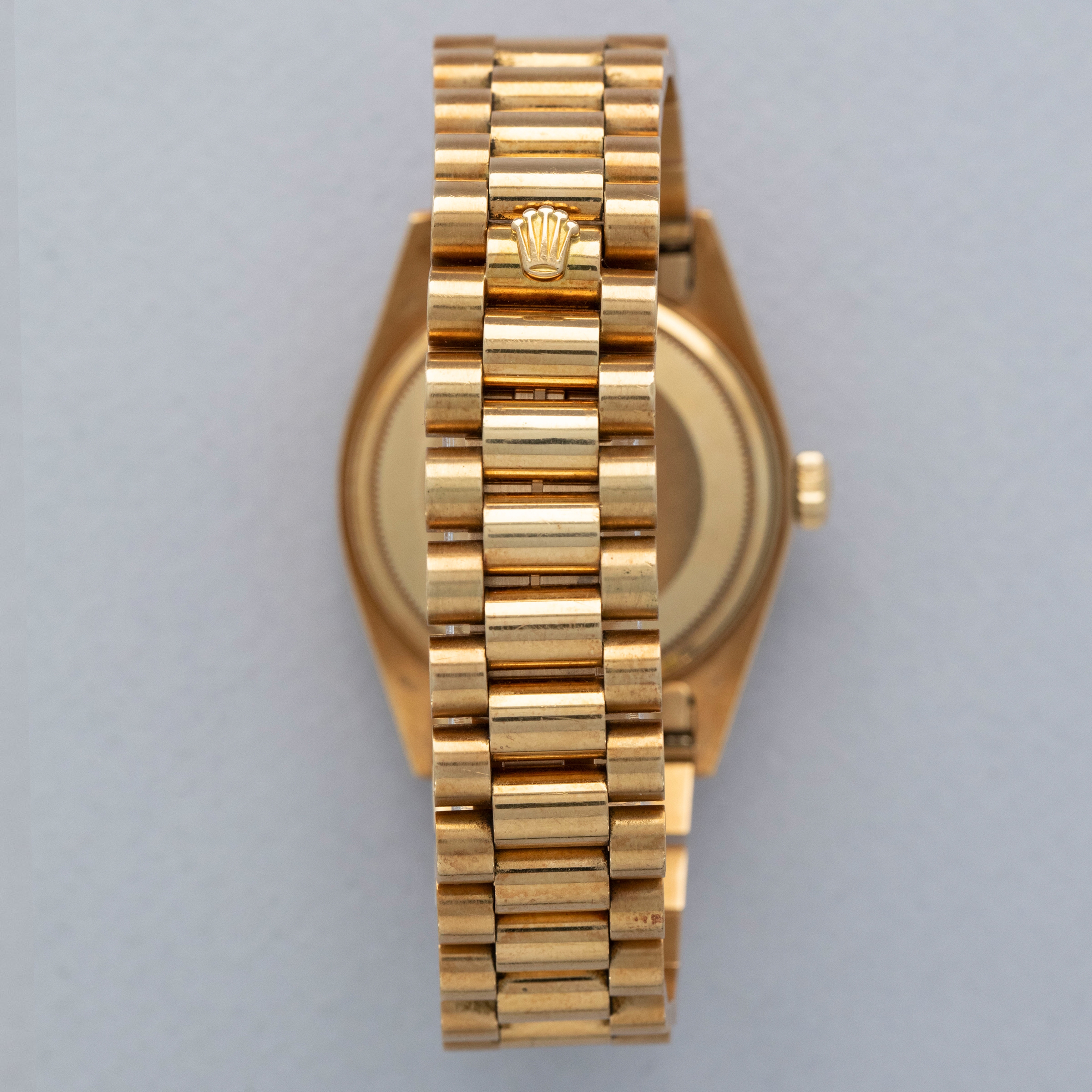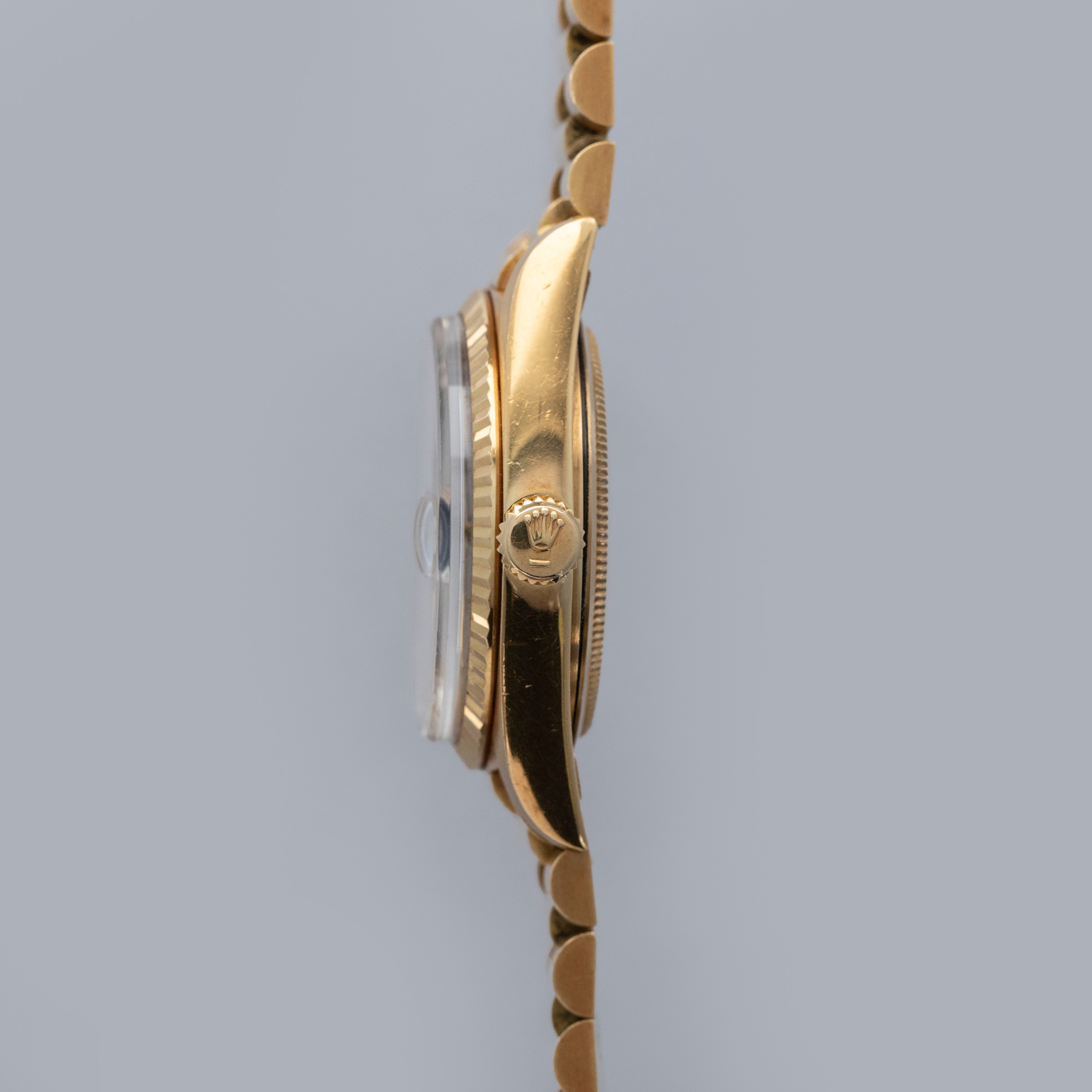 The watch is in overall excellent condition. The yellow gold case is excellent, with well-defined symmetrical lugs and some surface scratches, commensurate with a watch of this vintage. The hallmarks are all fully legible. The bezel is well defined. The blue so-called Buckley dial is in excellent condition, with a small amount of crazing around the lume plots and some light degradation around the dial edge. The yellow gold hands have some light patina but remain very clean. The yellow gold President bracelet has a concealed clasp, with some surface marks and moderate play between the links. The bracelet currently fits a 7 1/4” wrist and has 21 links, 4 of which are removable.